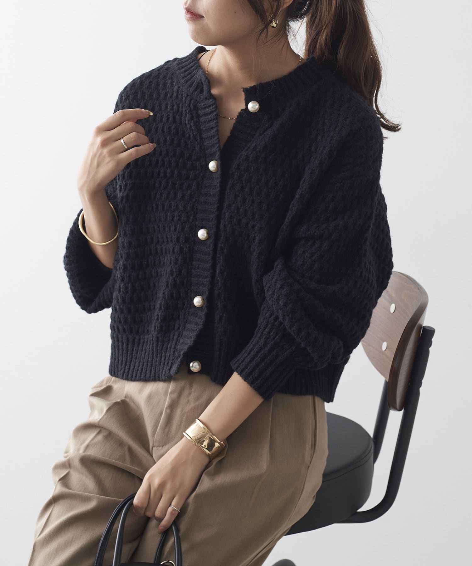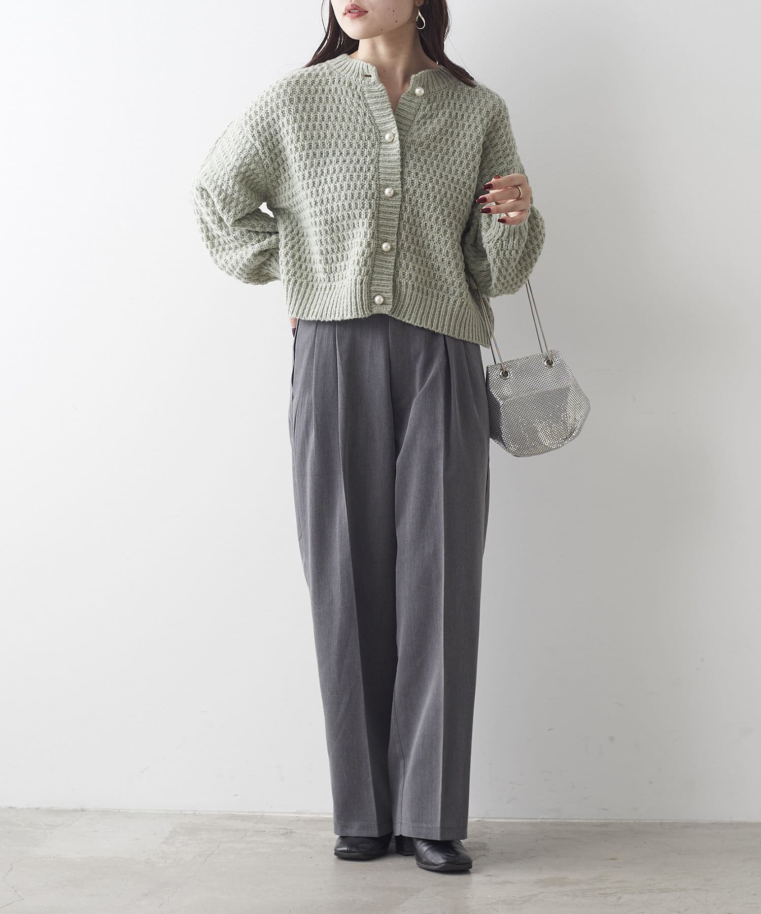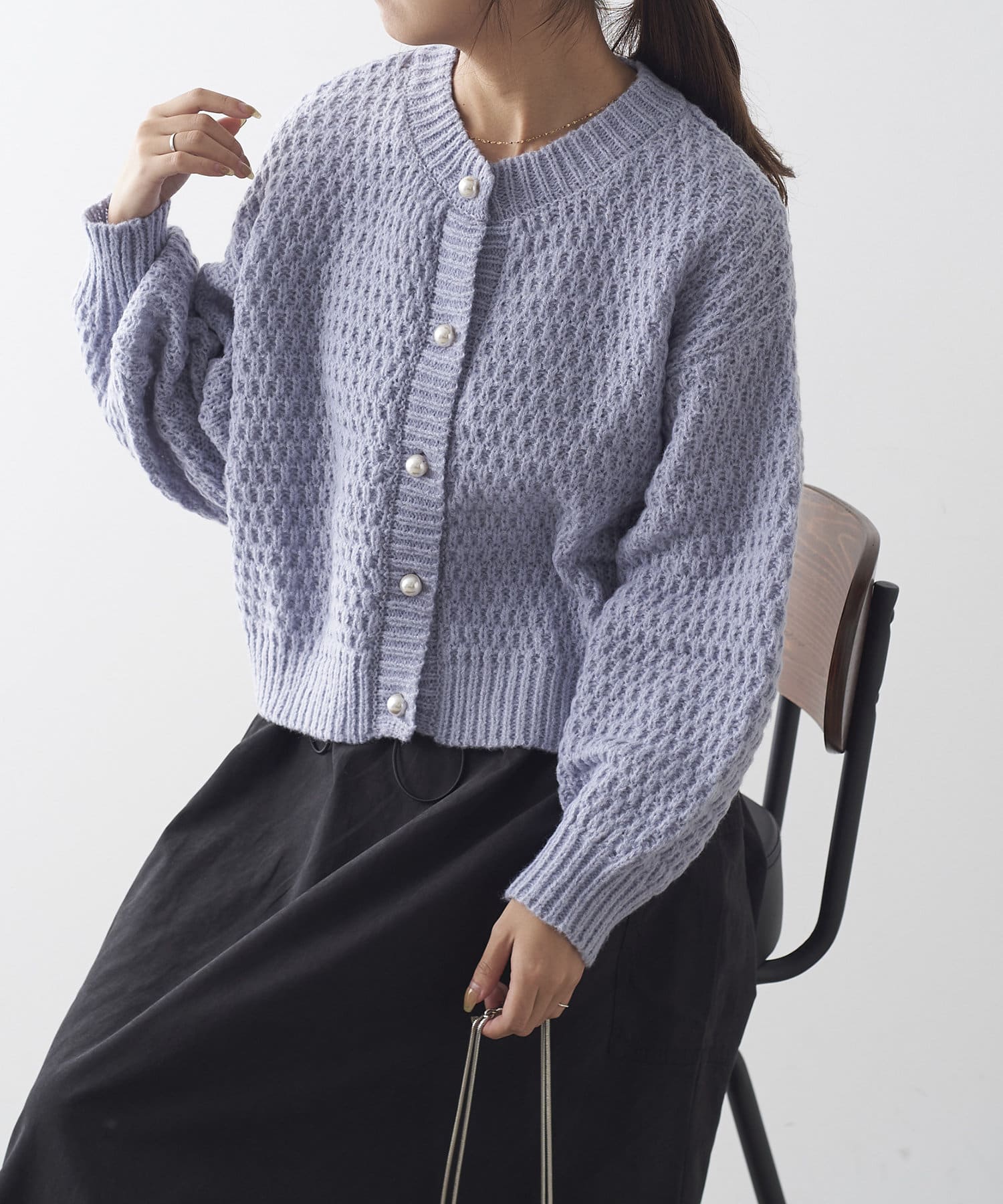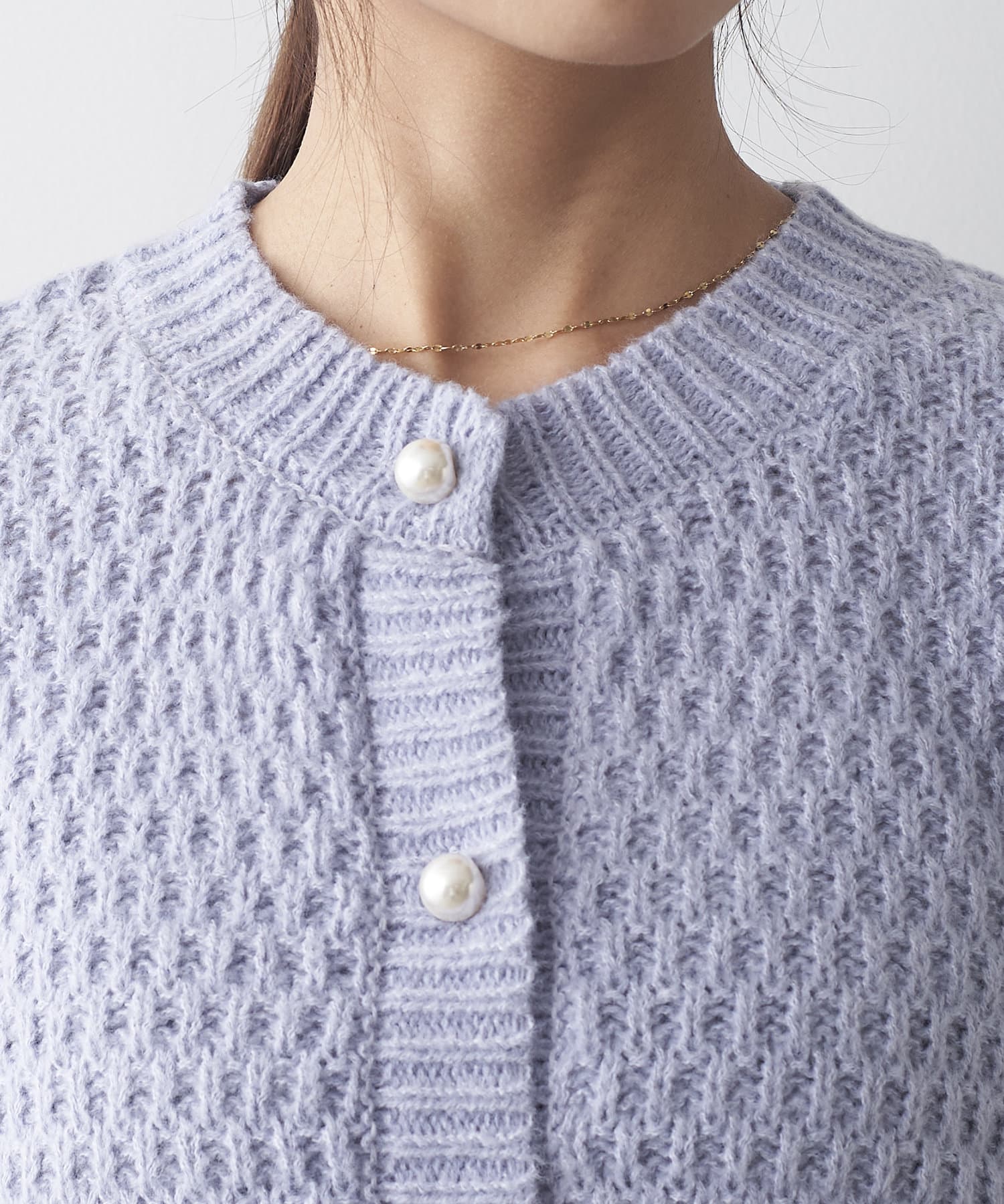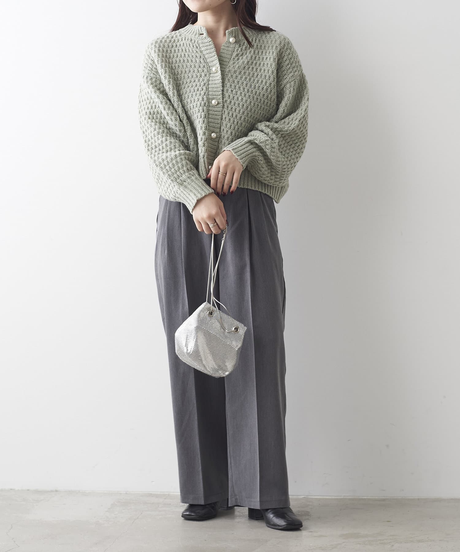 鹿の子編みパール釦カーデ