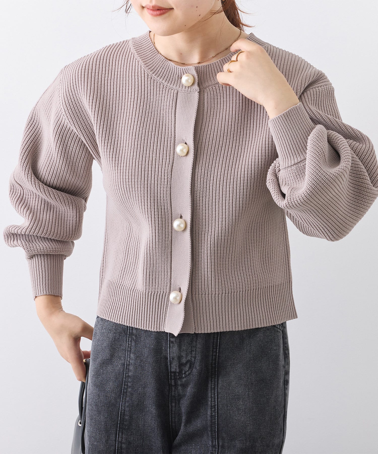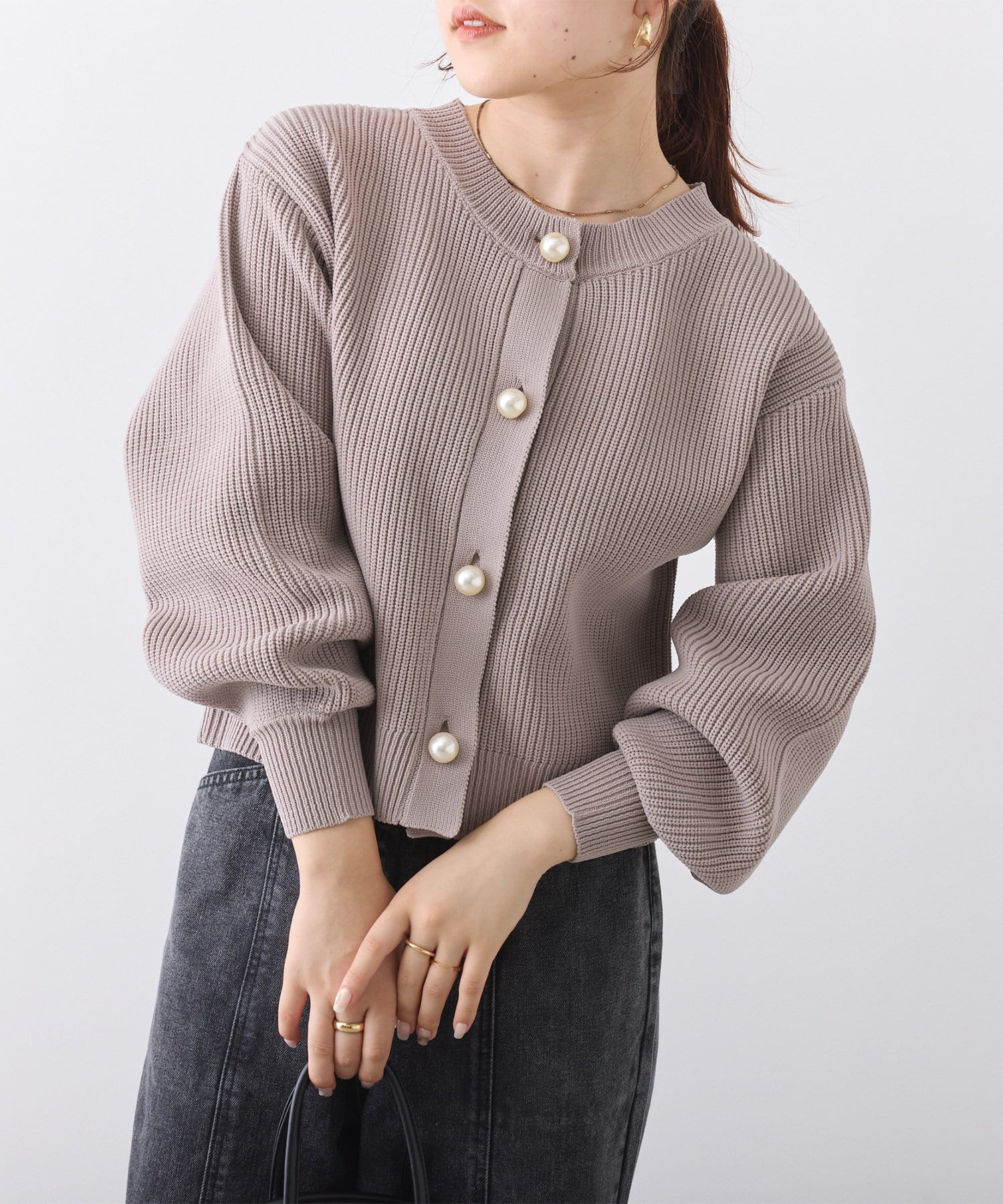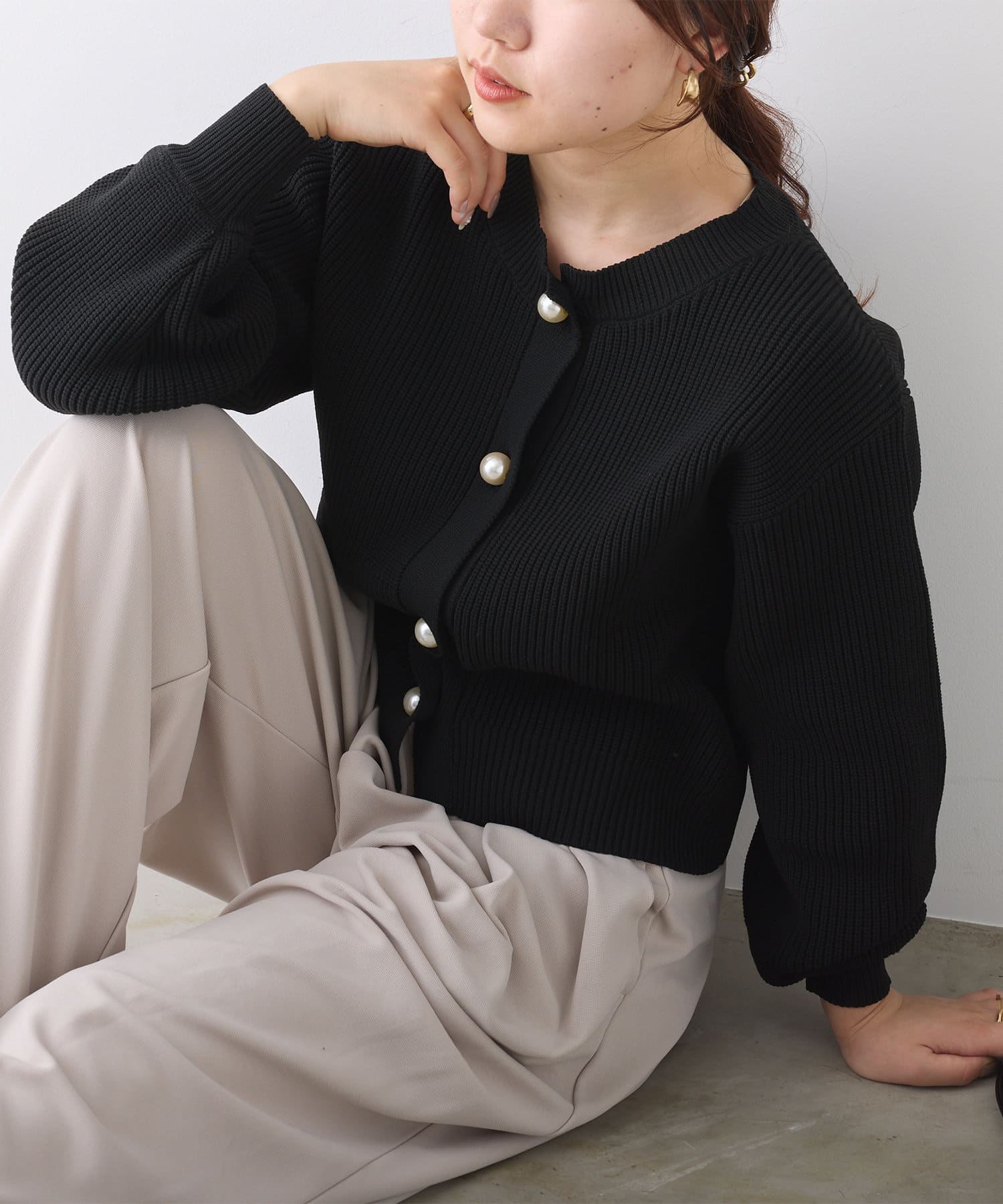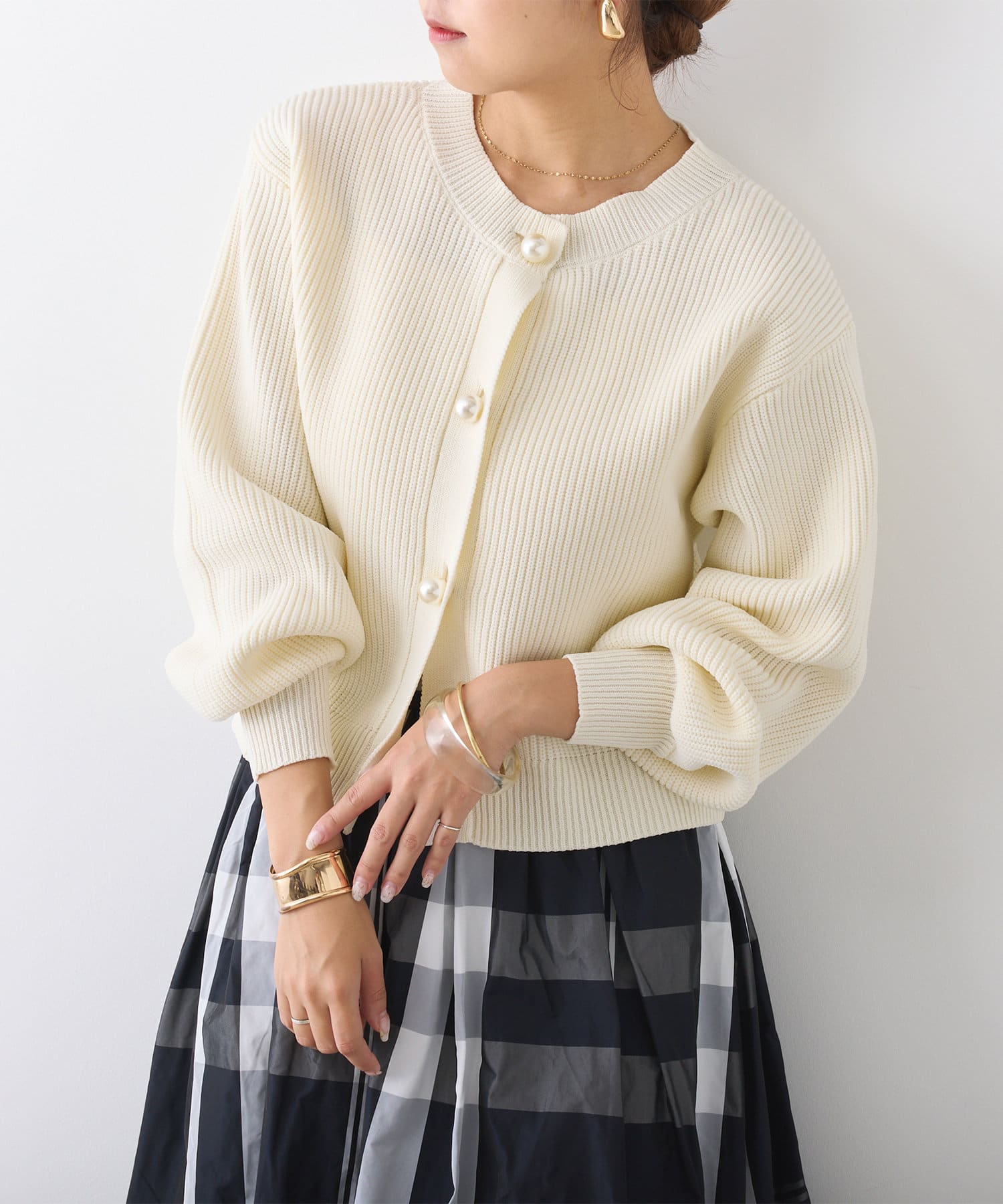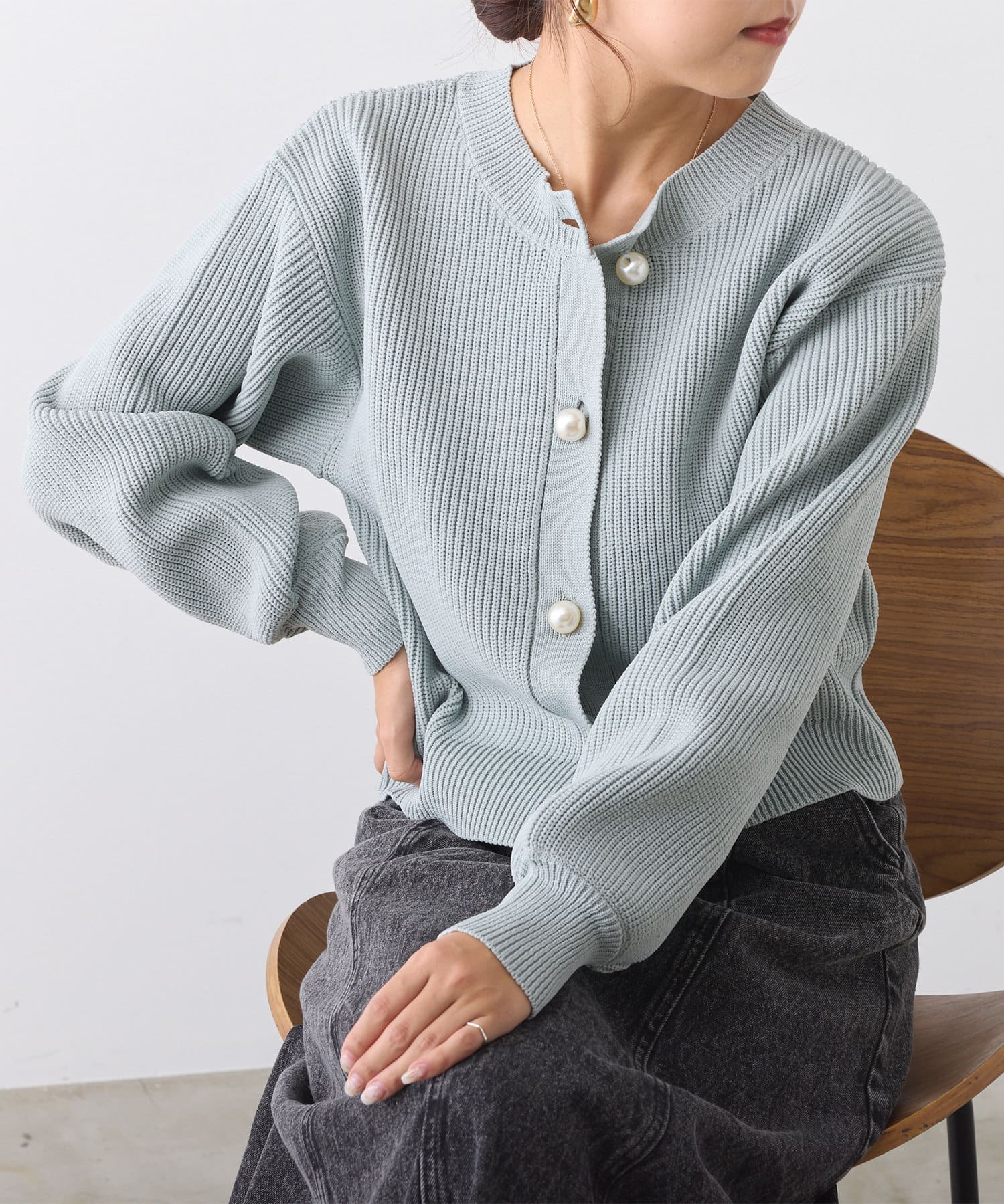 ・シンプルなデザインのなかに大振りなパールボタンをあしらったカーディガン。