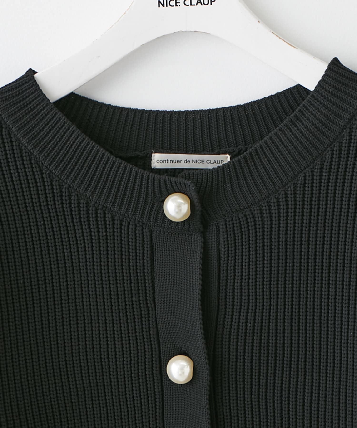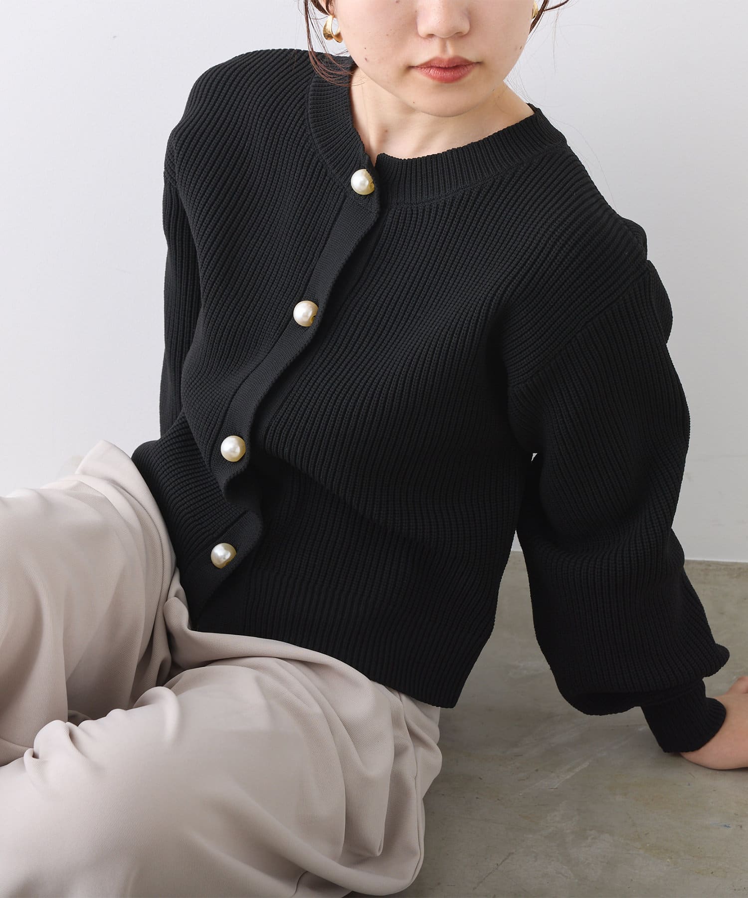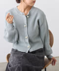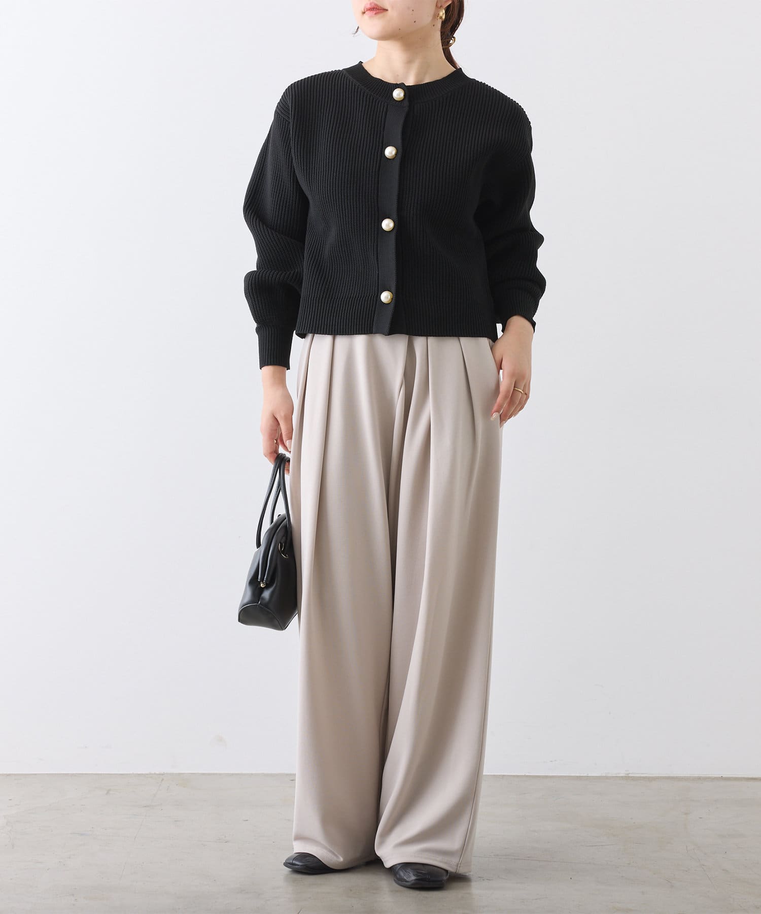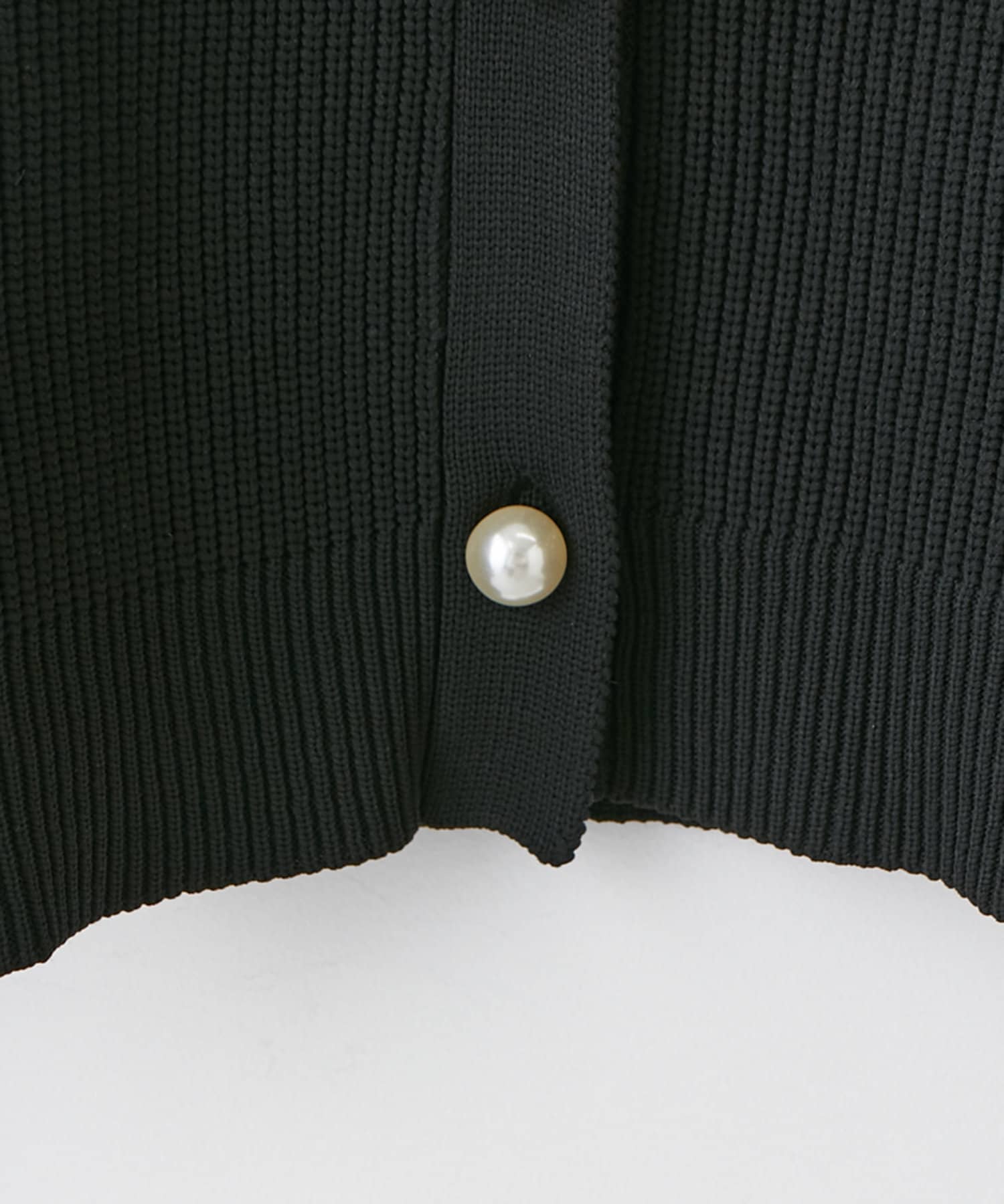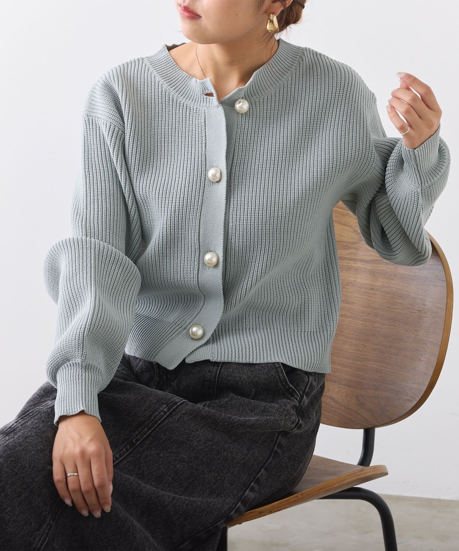 ・シンプルなデザインのなかに大振りなパールボタンをあしらったカーディガン。