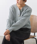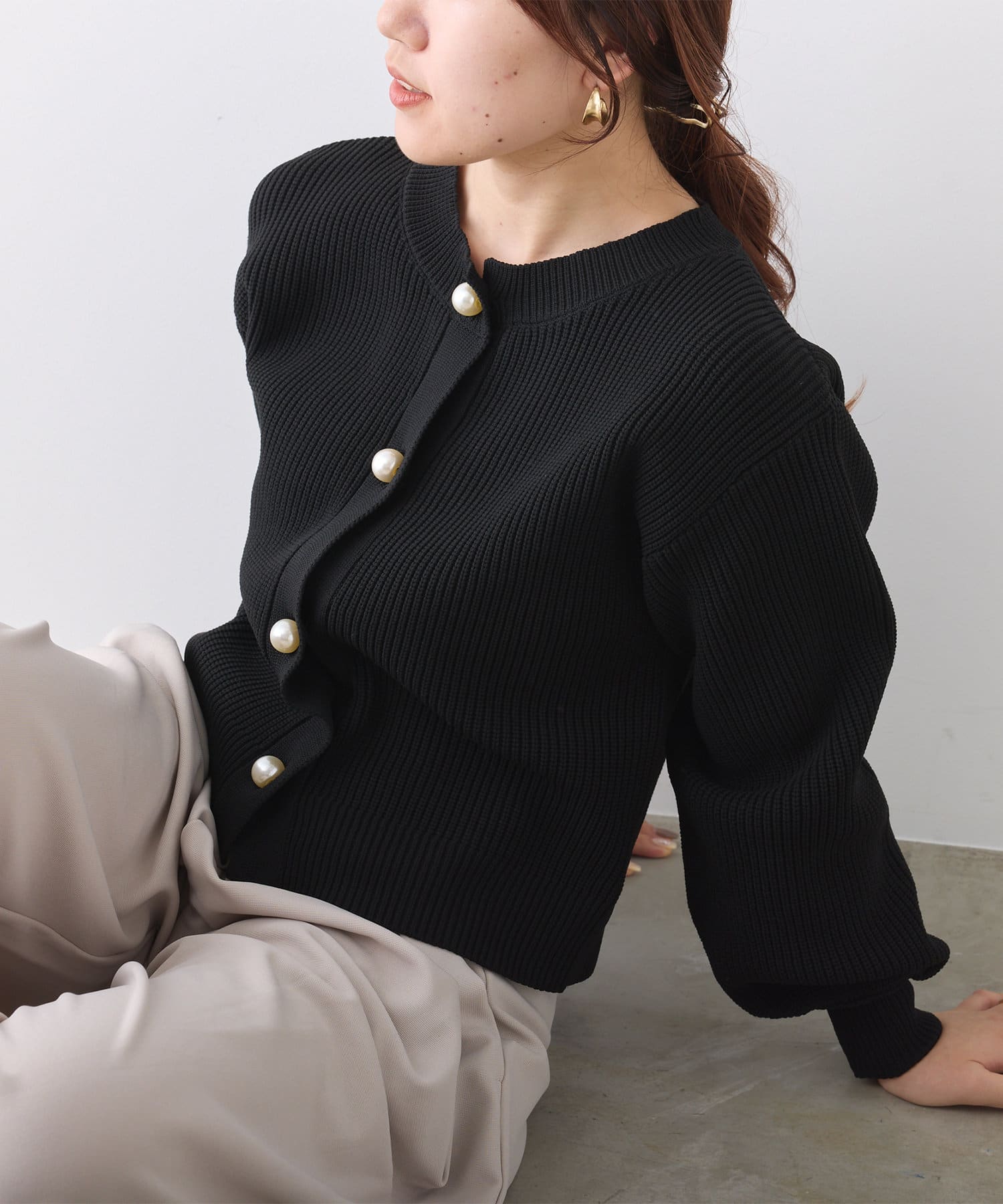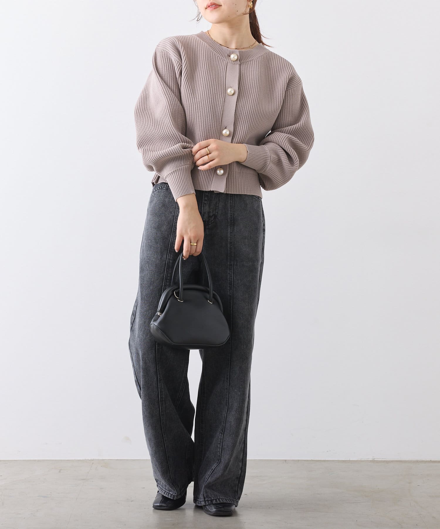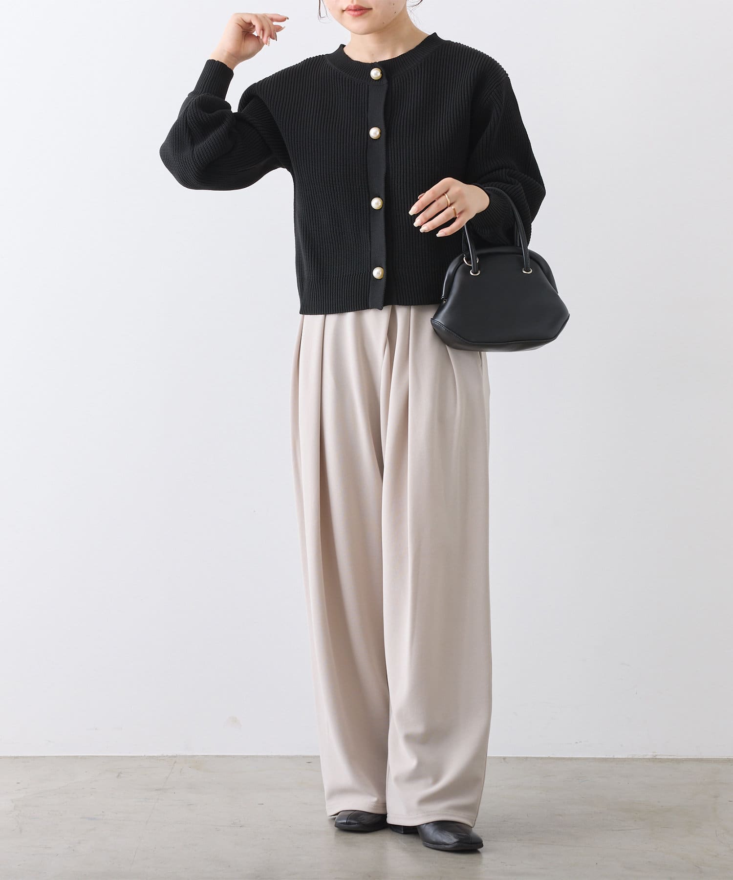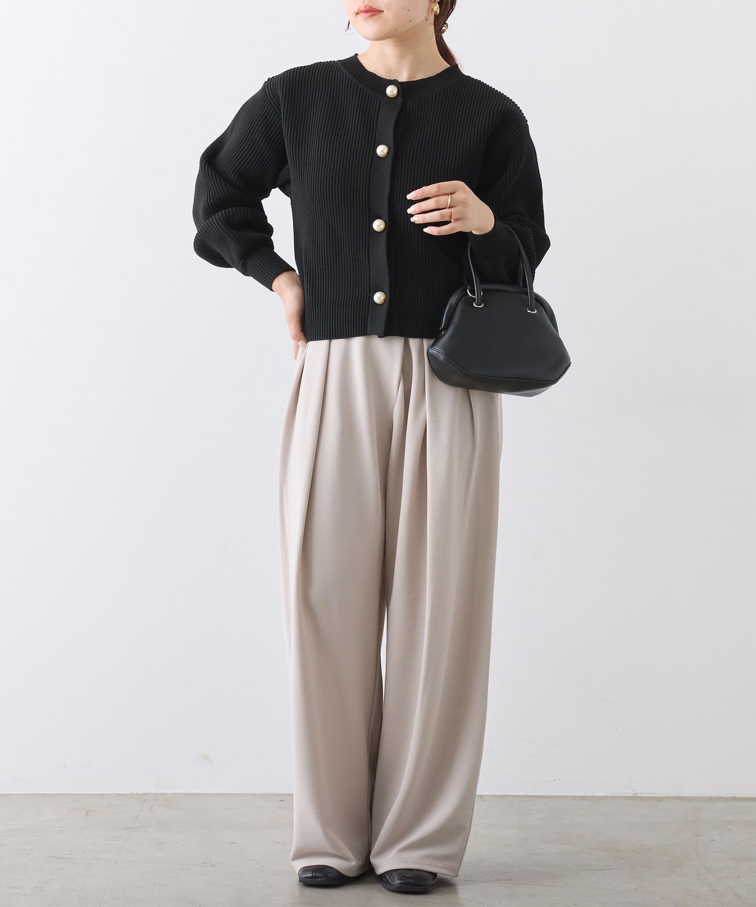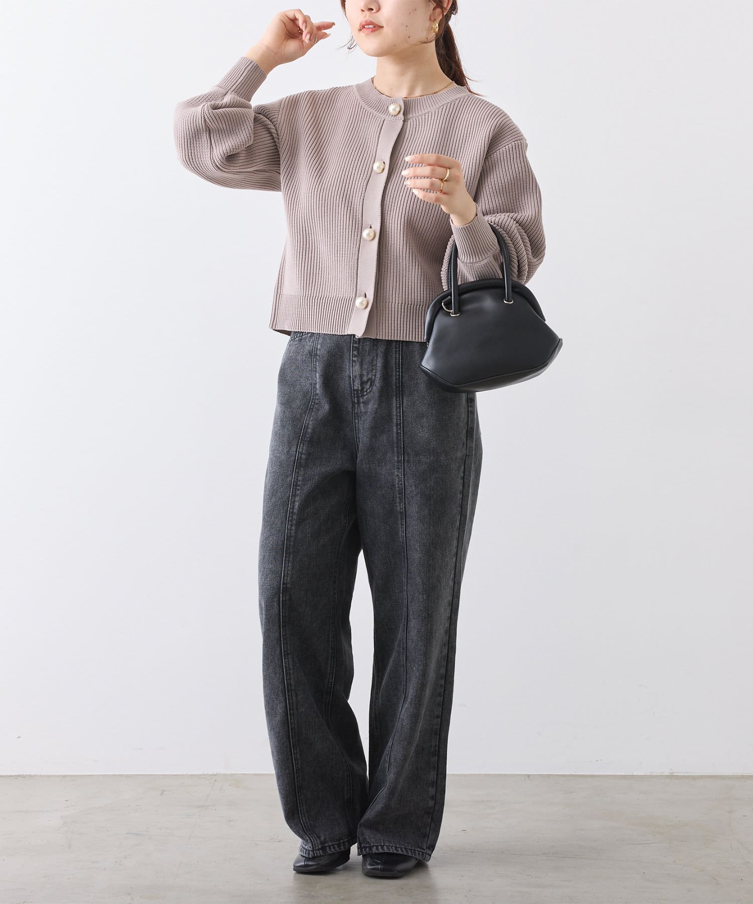 ・シンプルなデザインのなかに大振りなパールボタンをあしらったカーディガン。