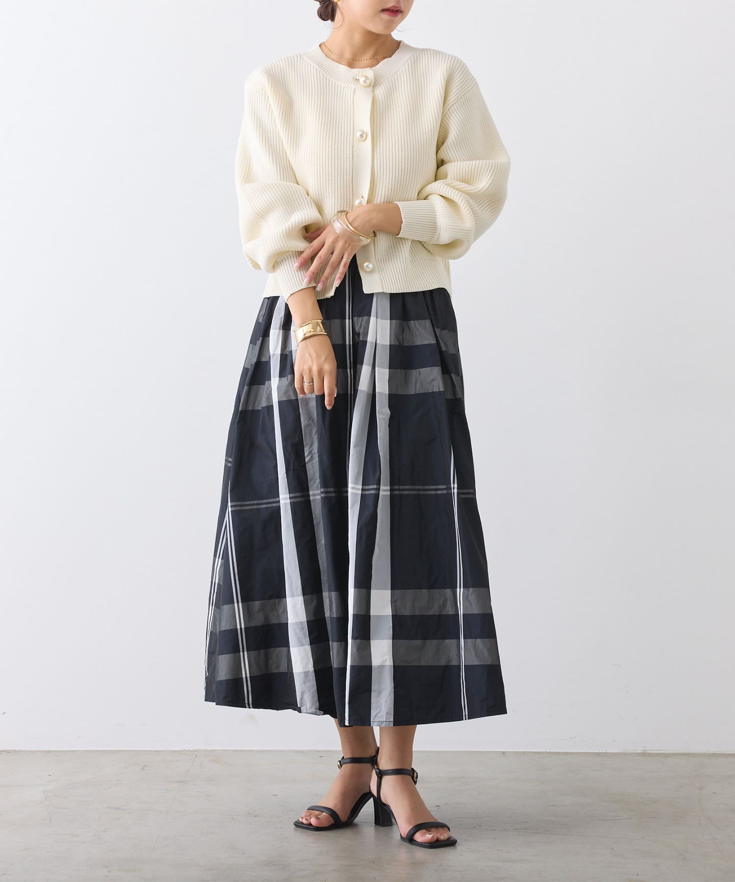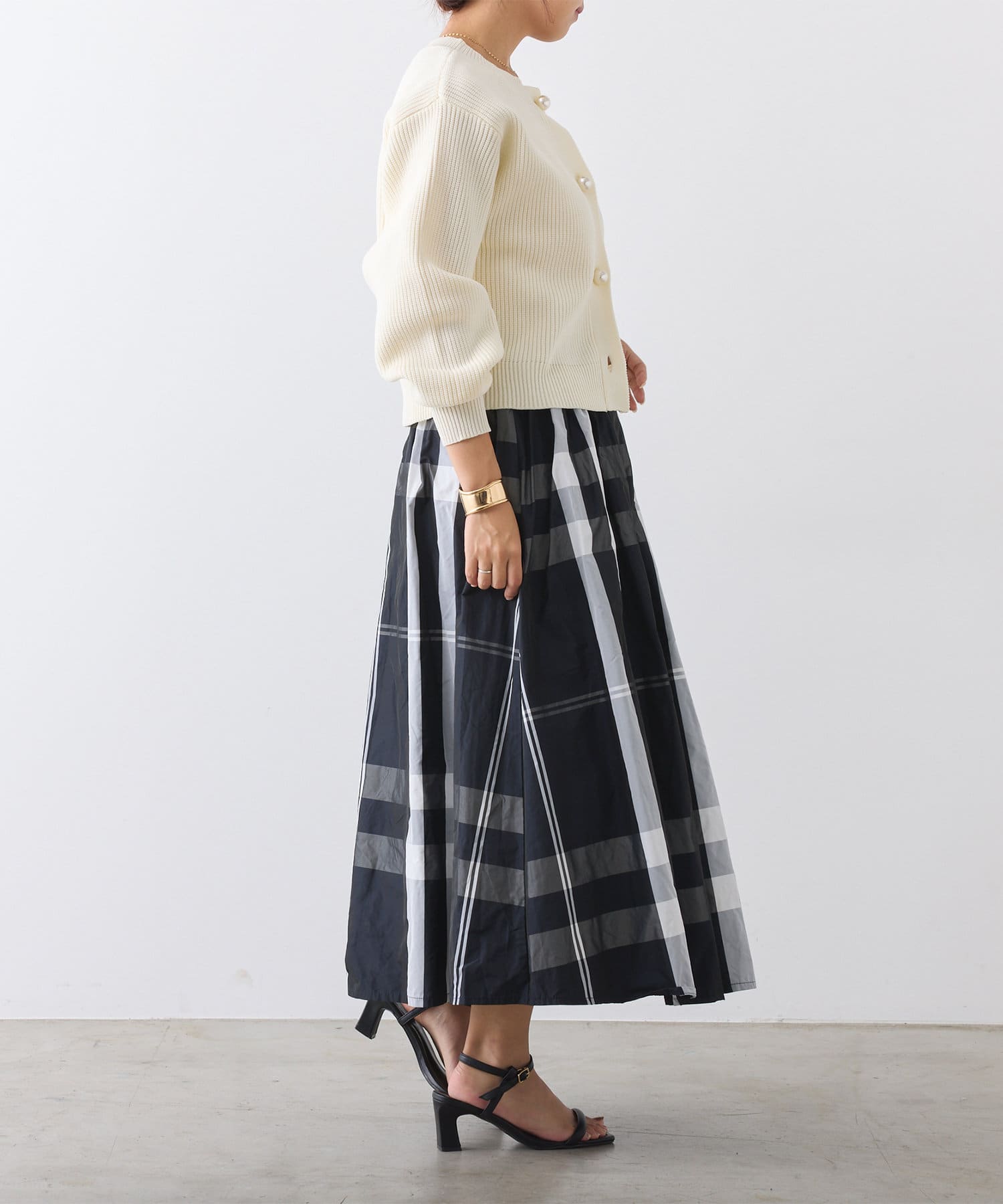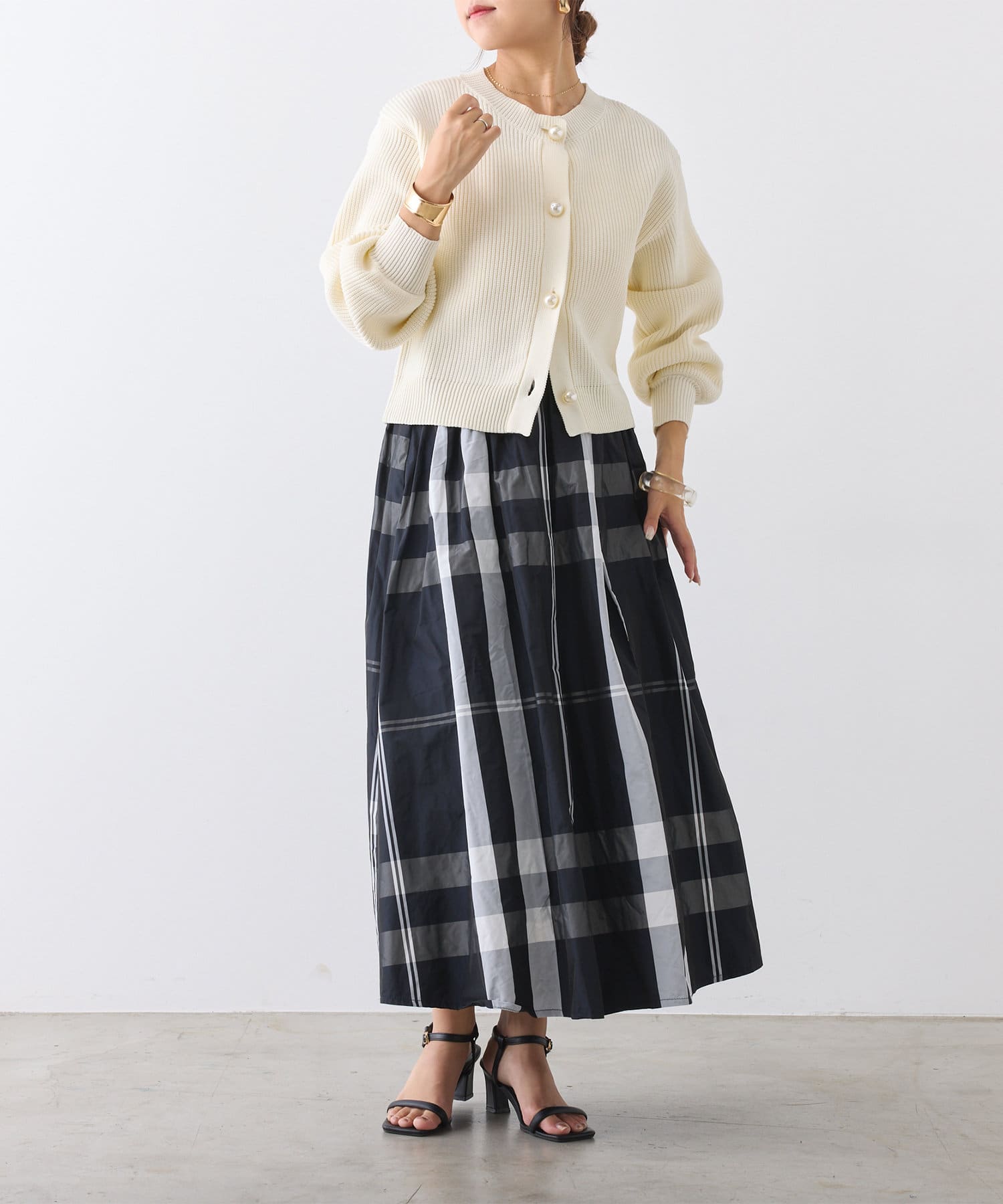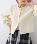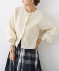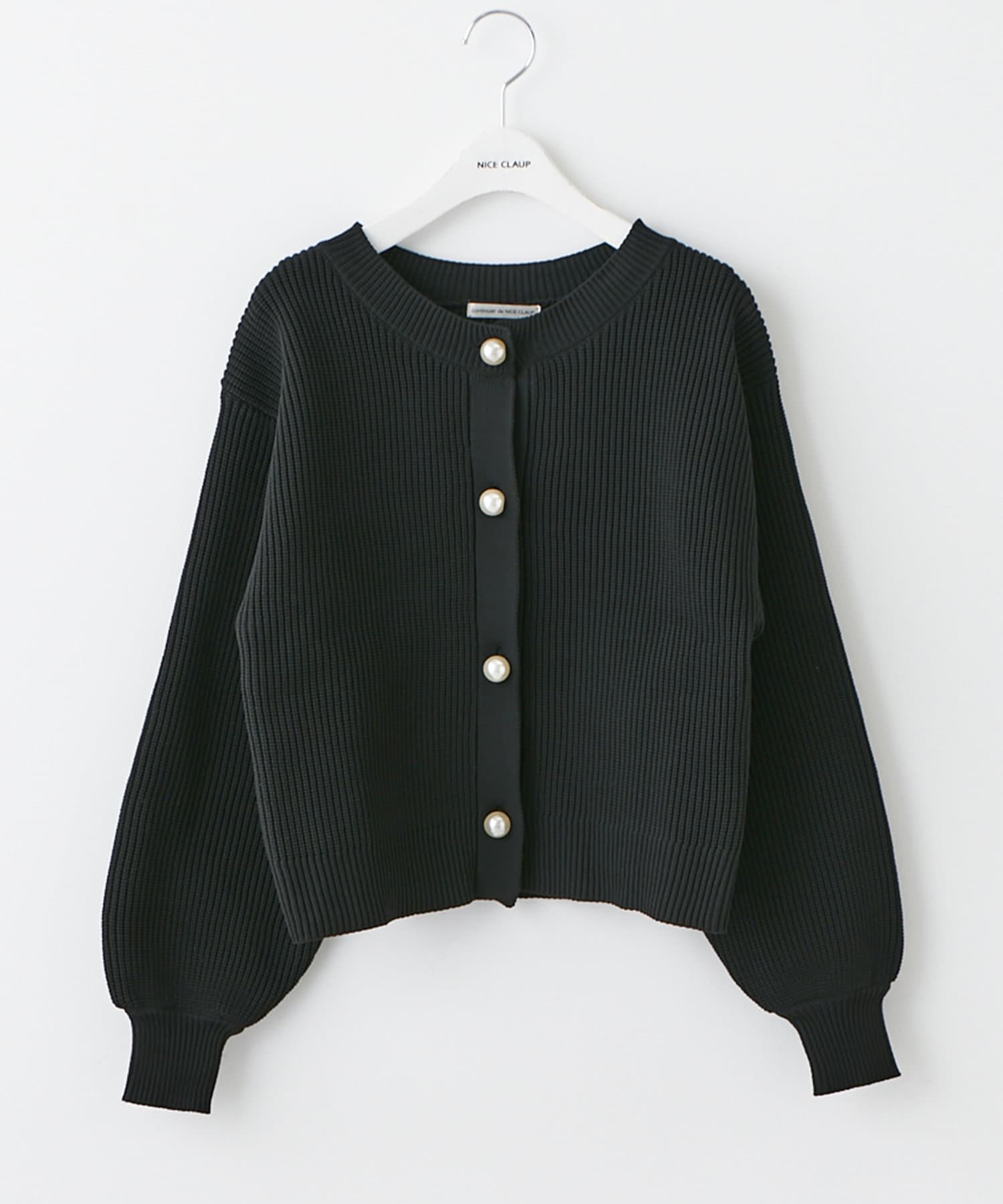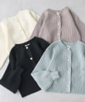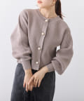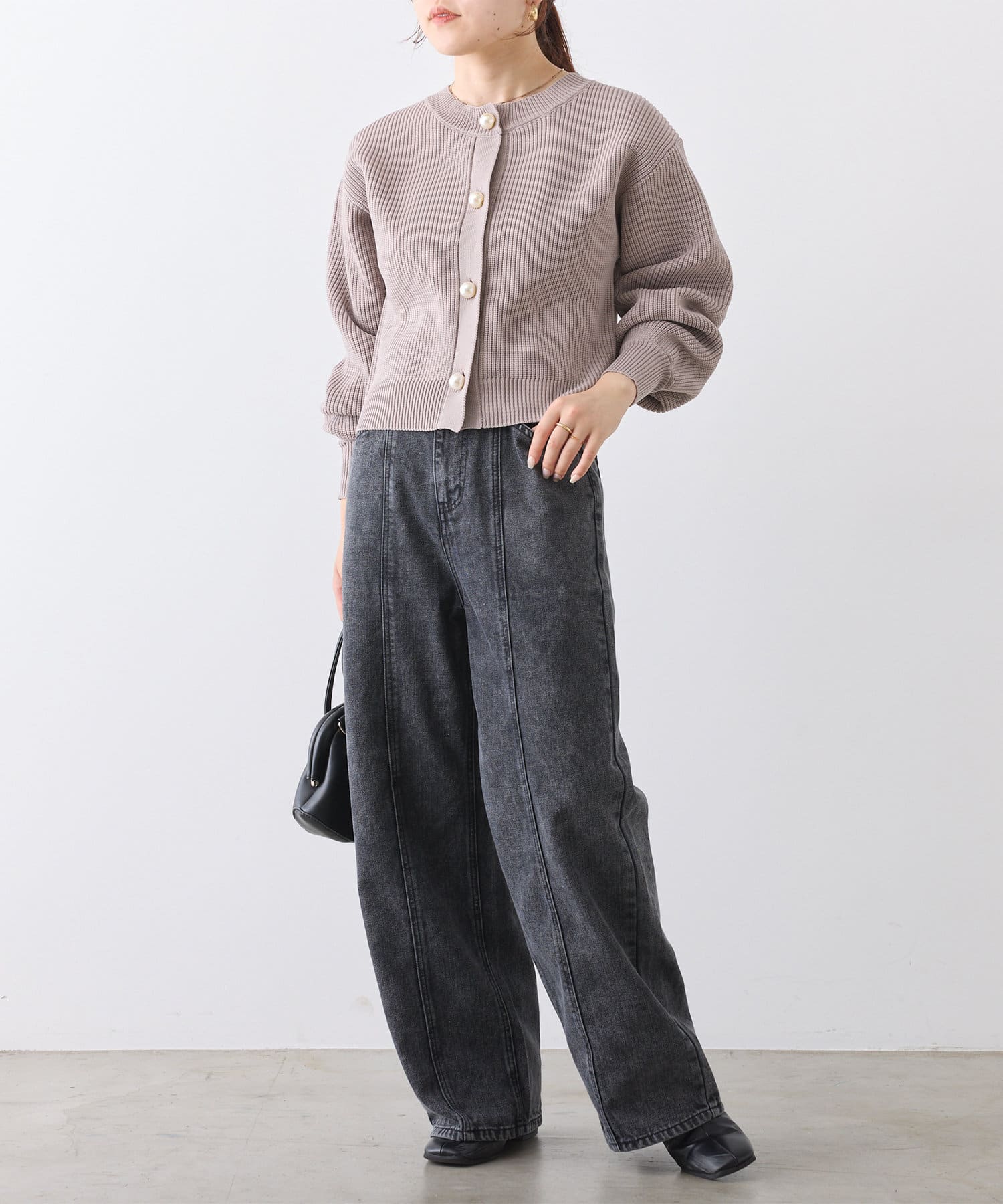 ・シンプルなデザインのなかに大振りなパールボタンをあしらったカーディガン。