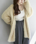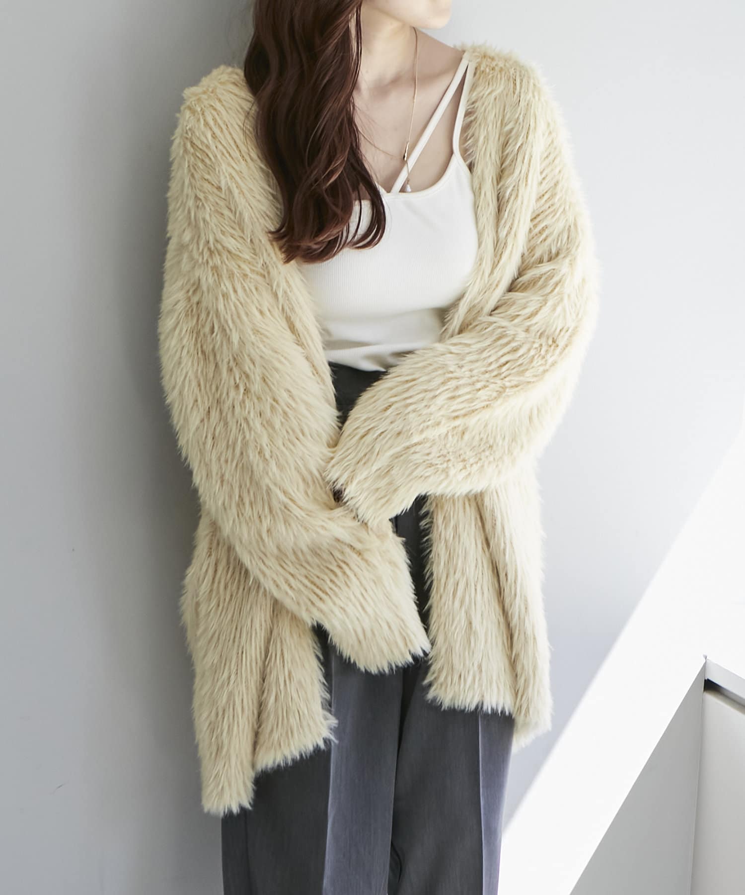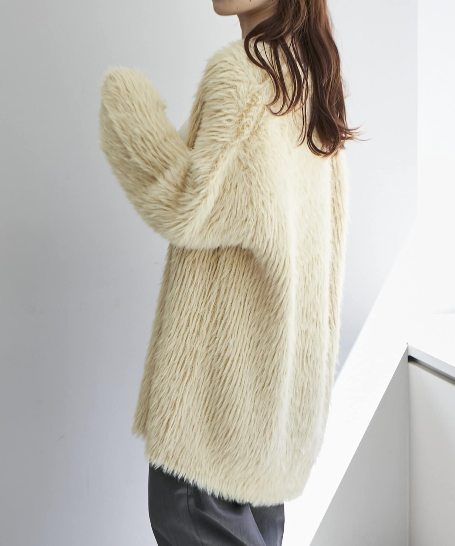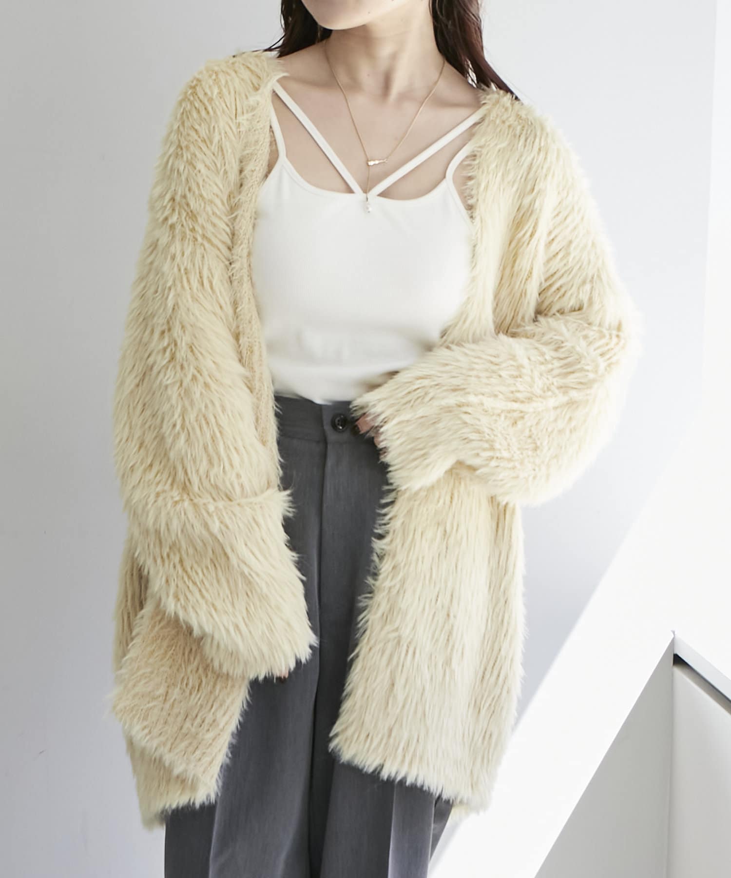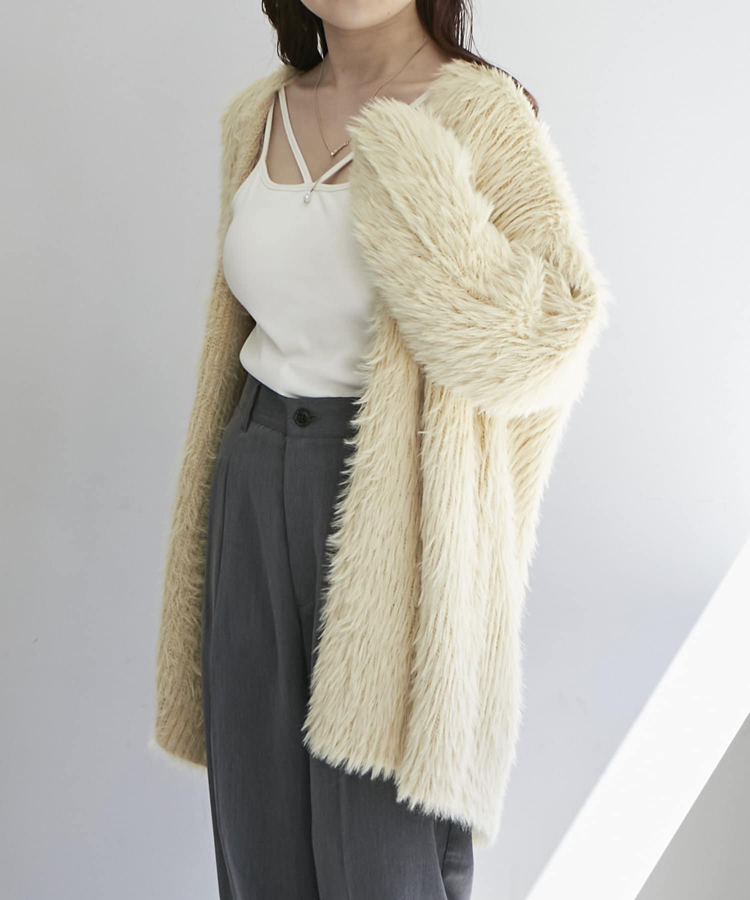・トレンドライクな毛足の長いシャギーカーディガン。