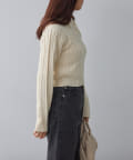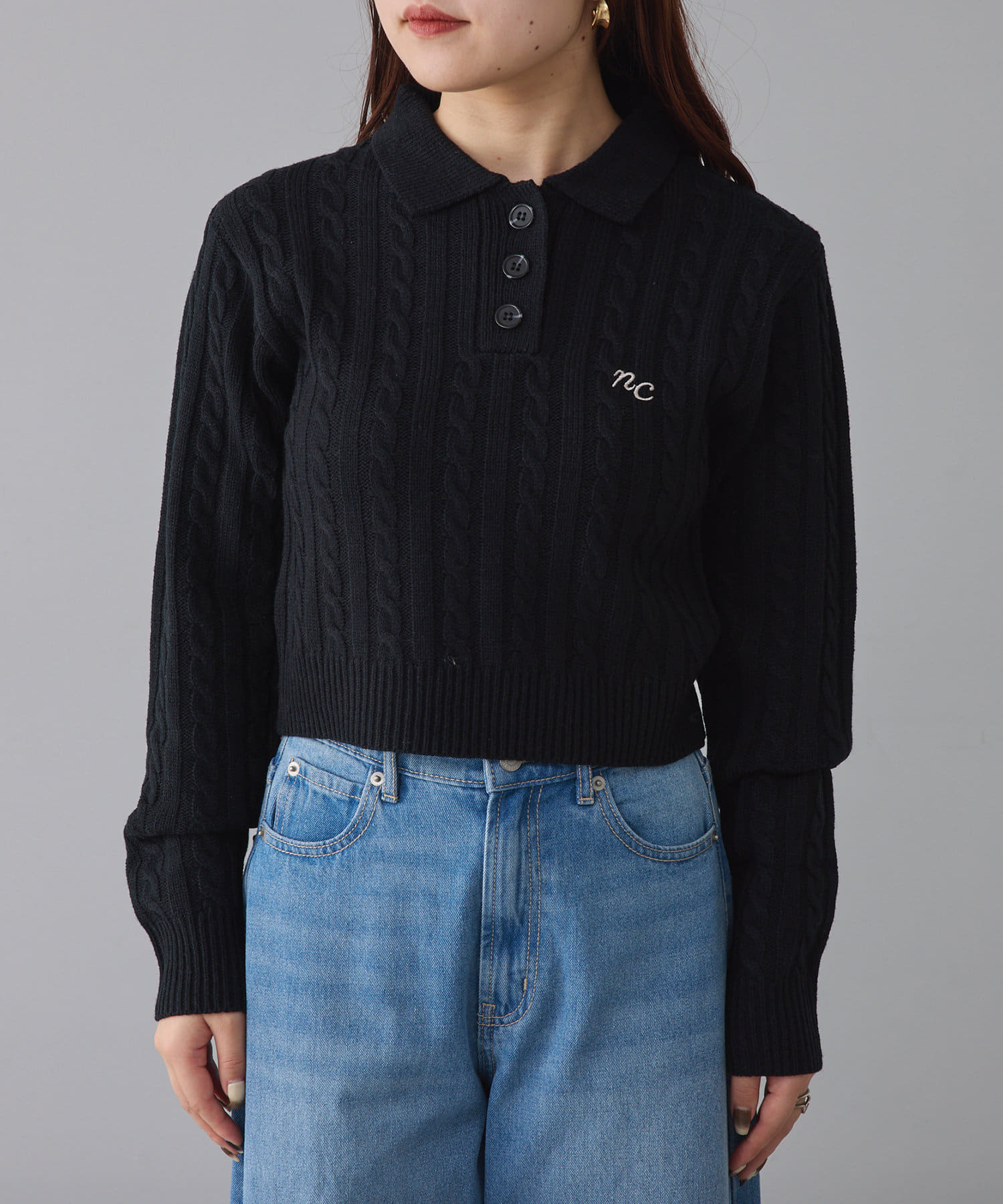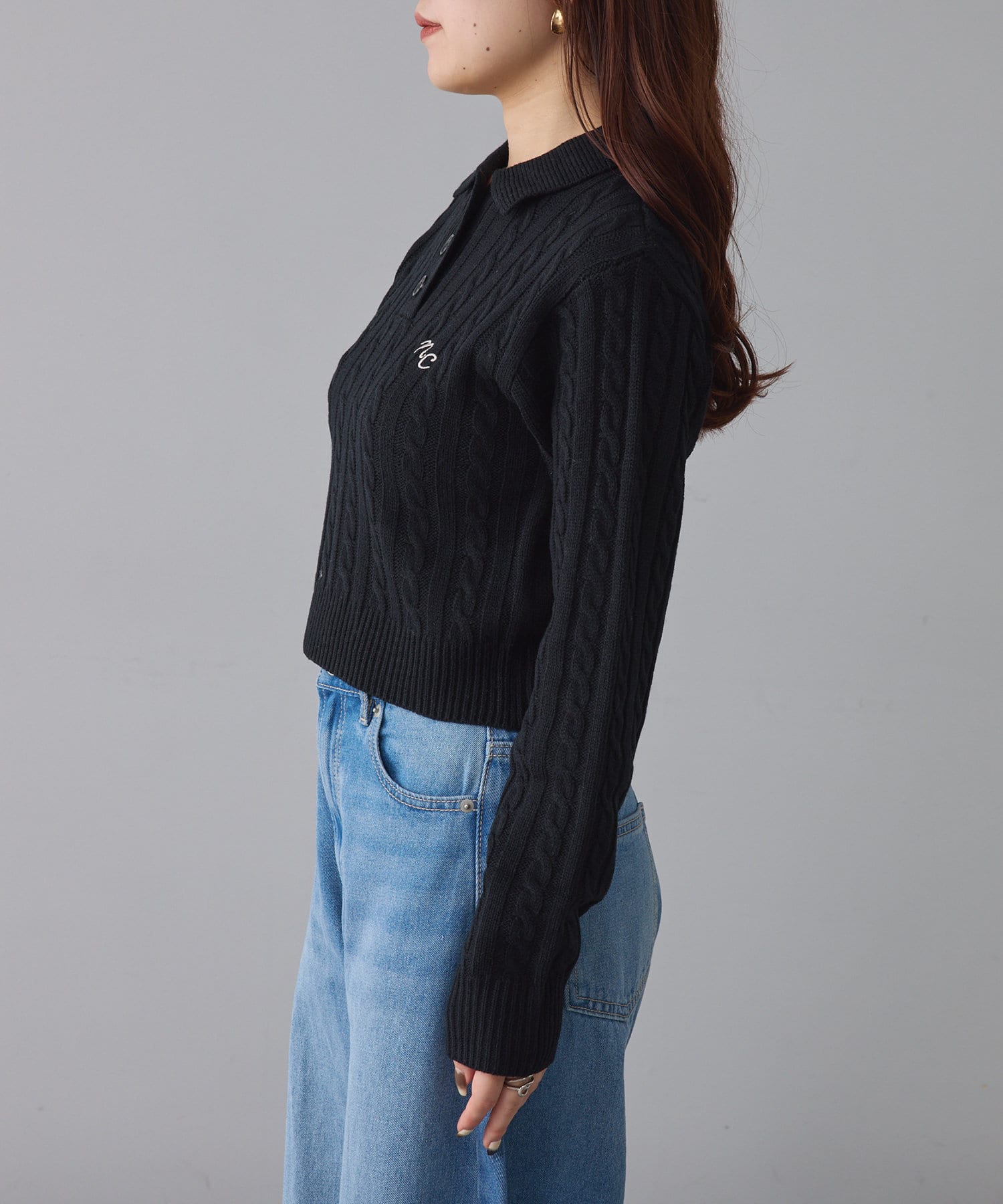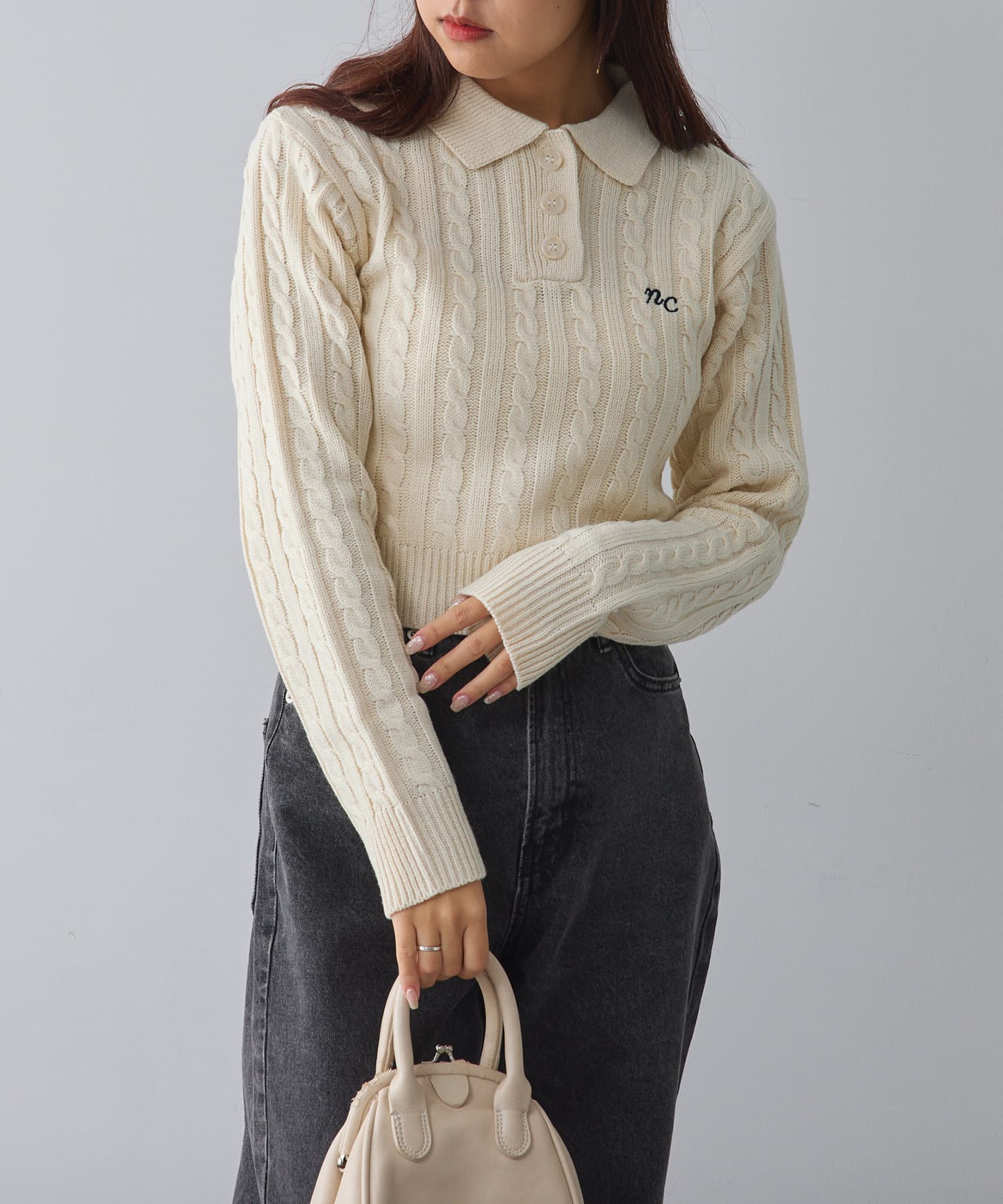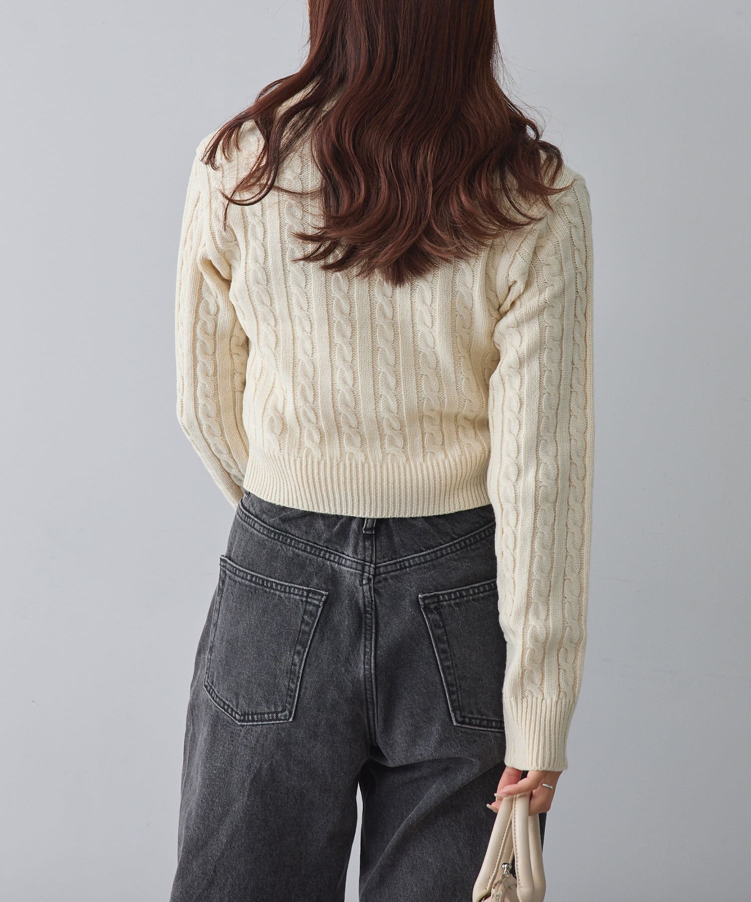 ・存在感のあるケーブルニットをショート丈のポロニットトップスに
