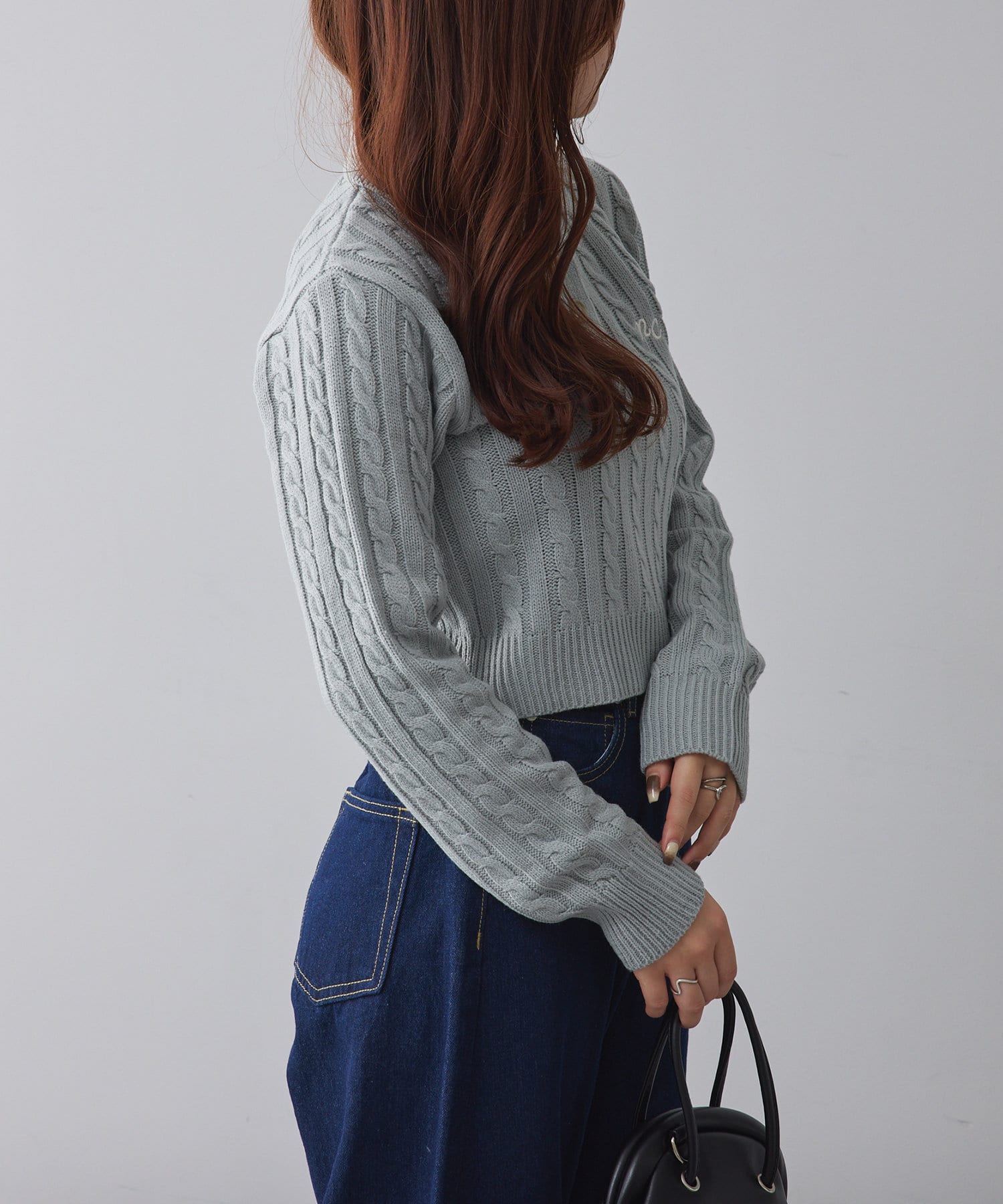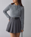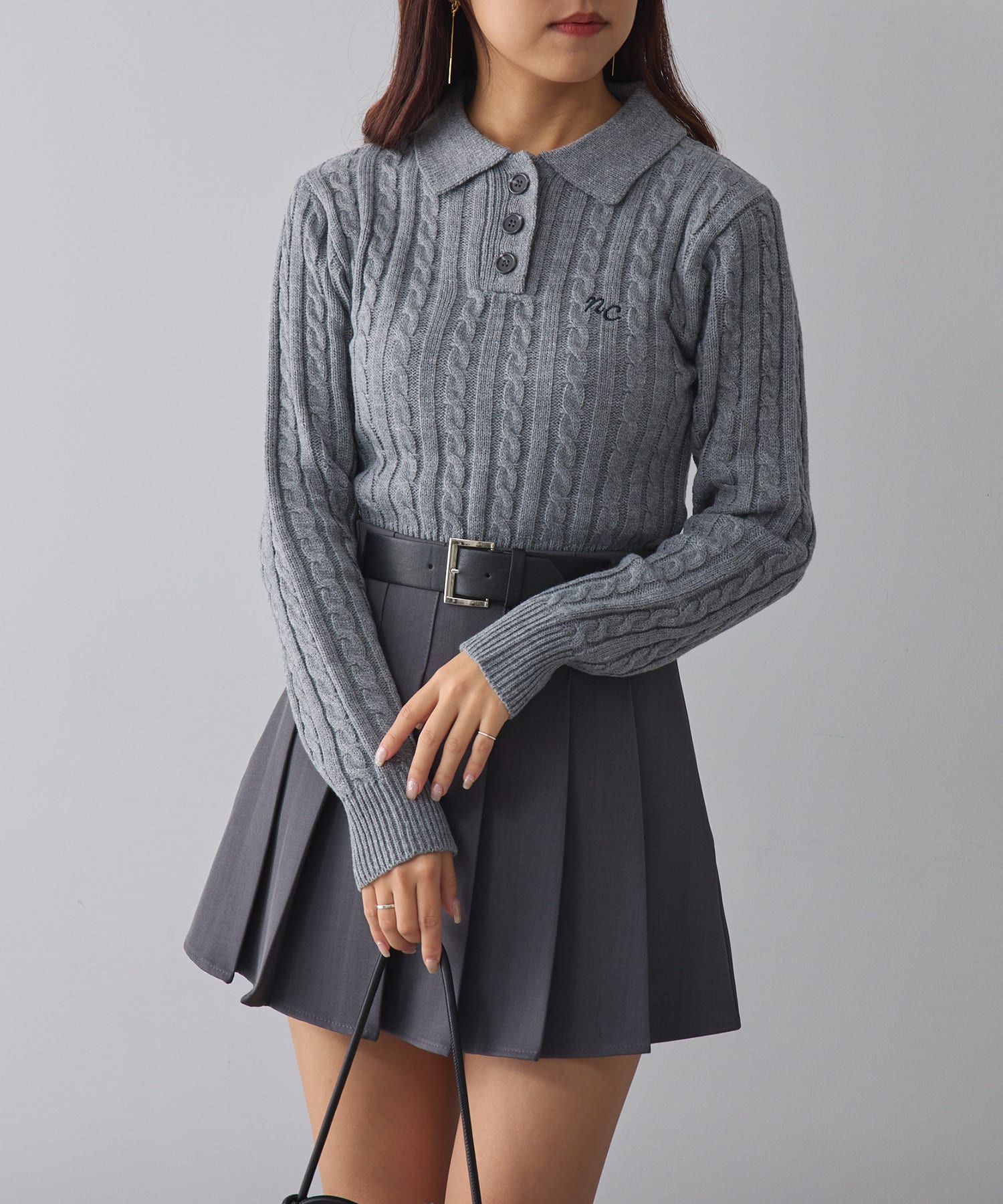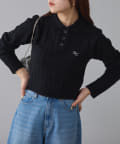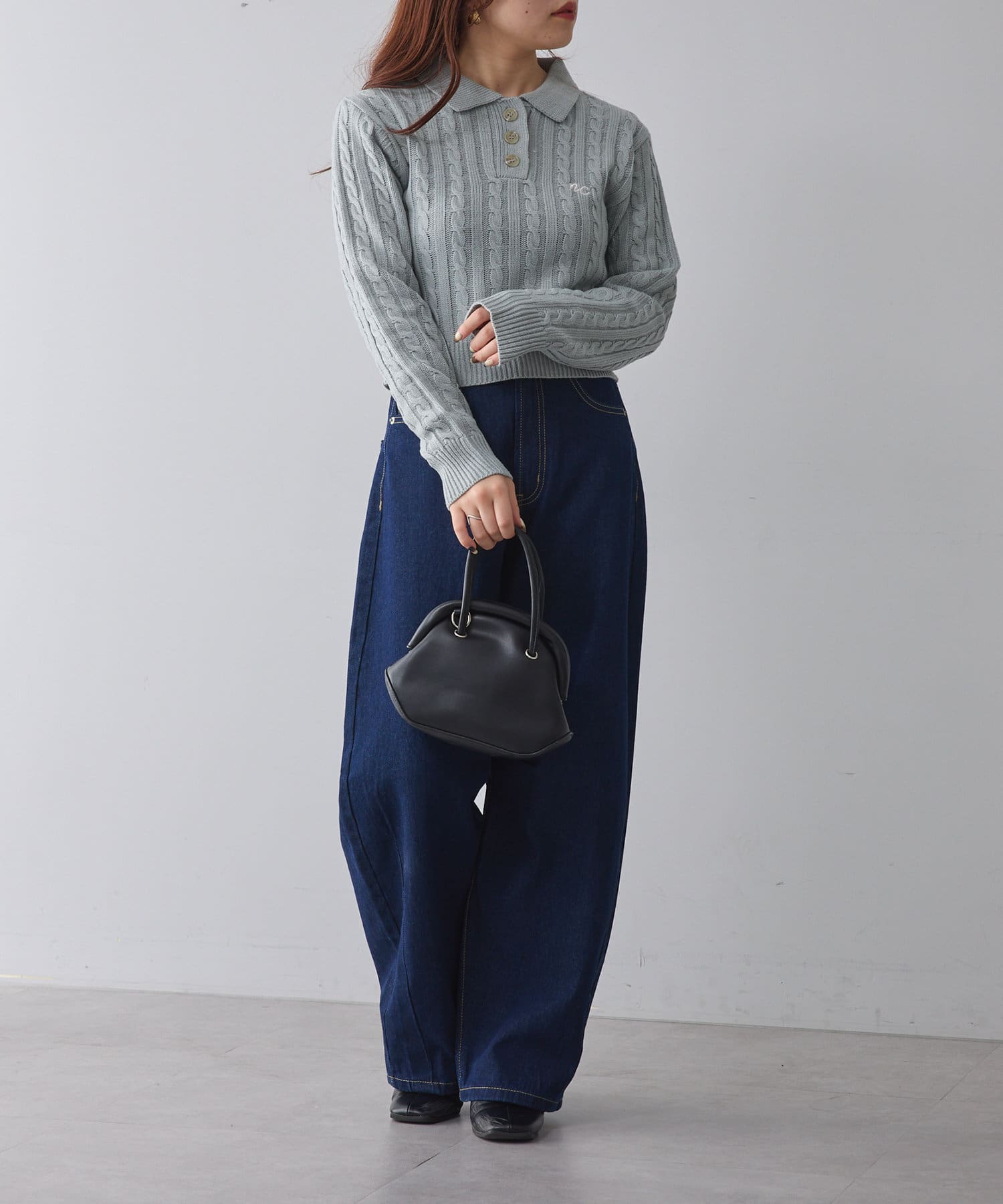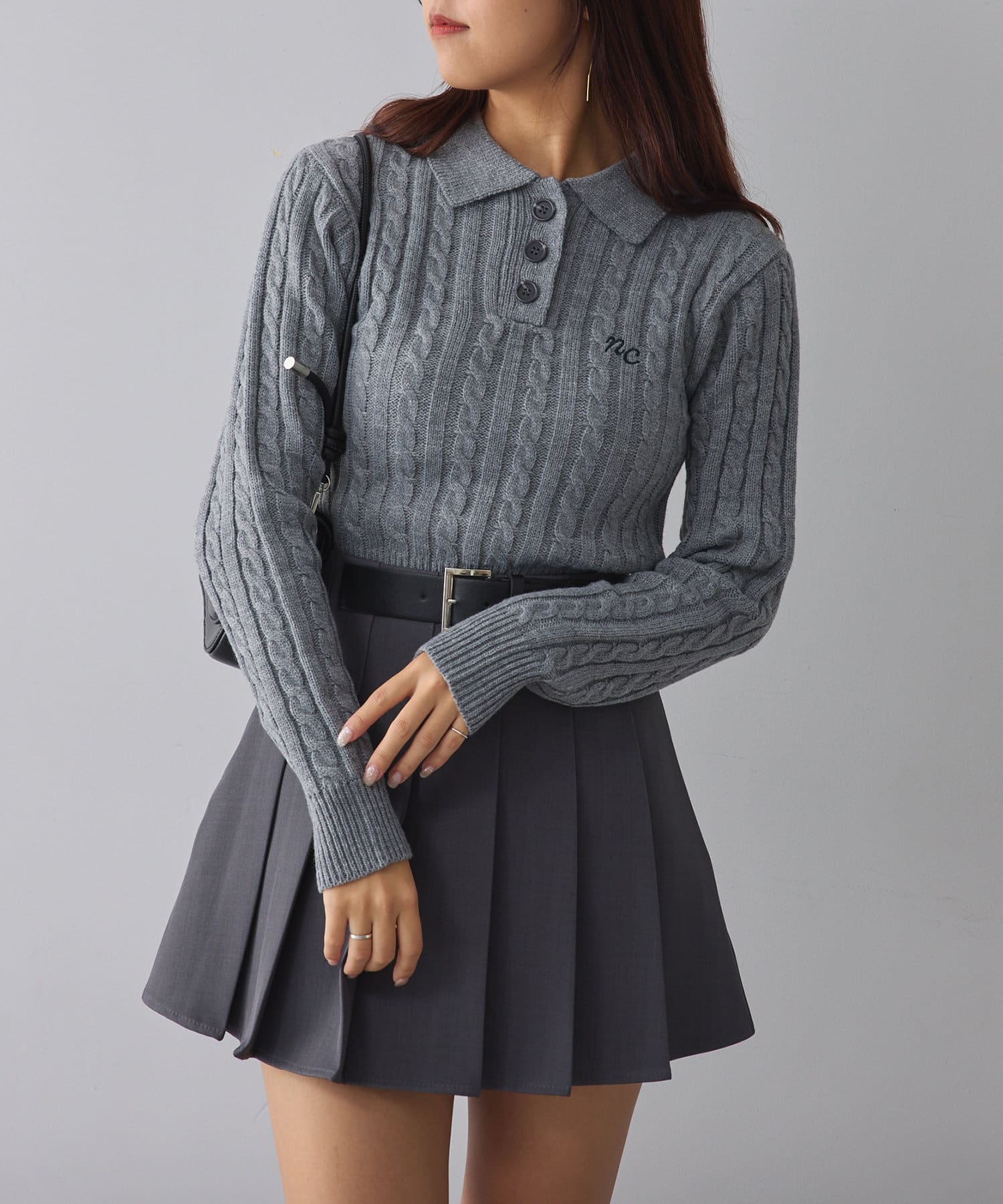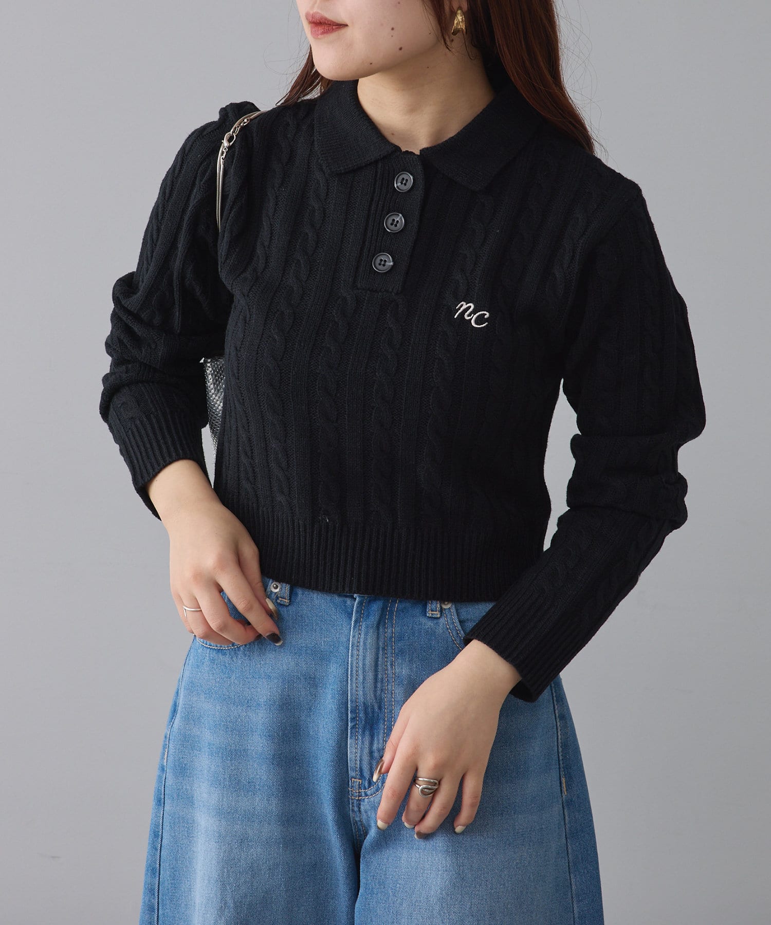 ・存在感のあるケーブルニットをショート丈のポロニットトップスに