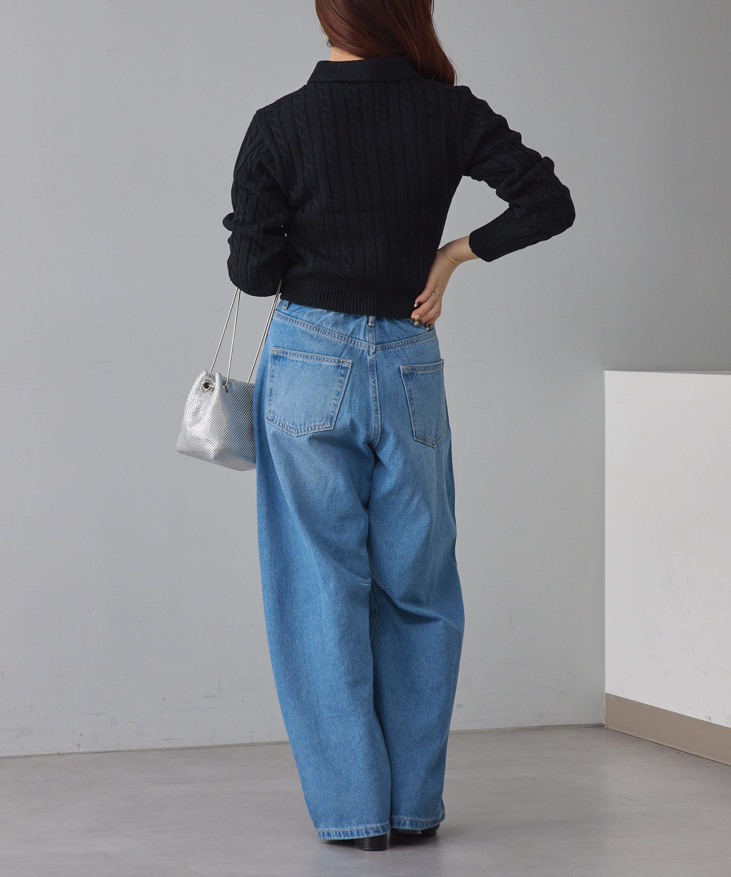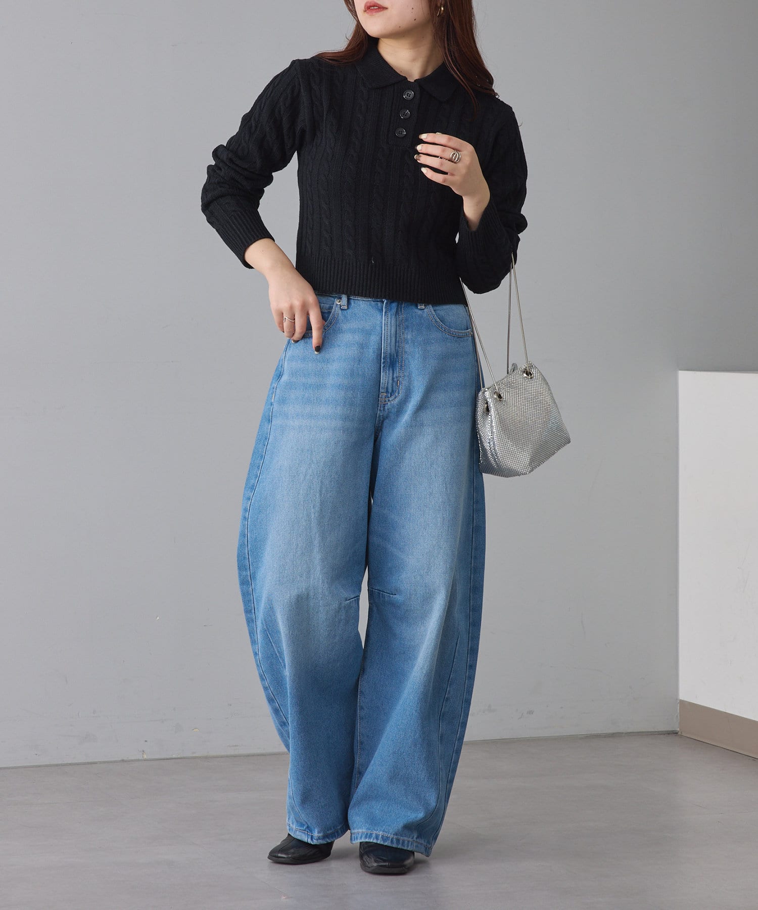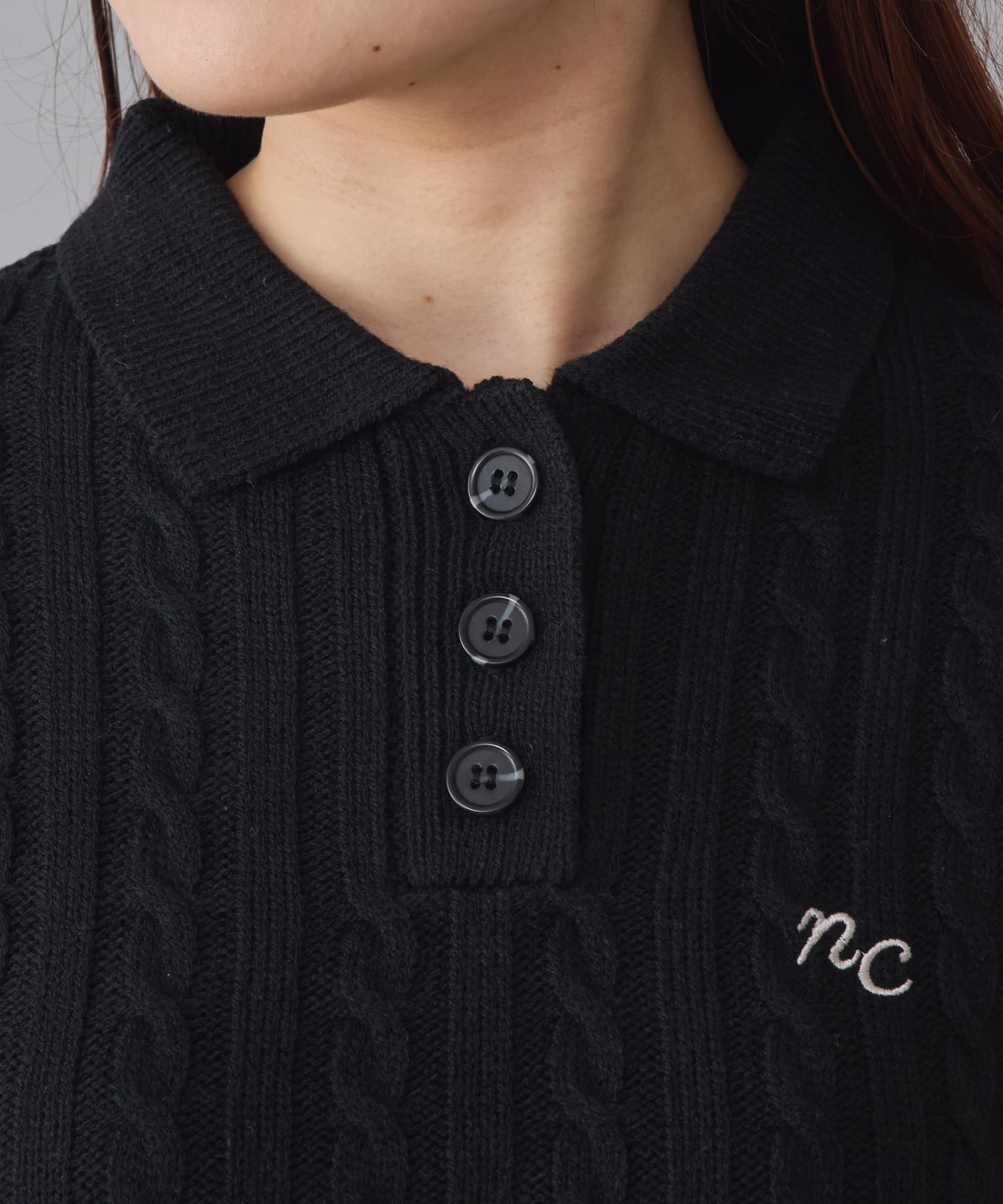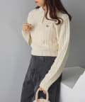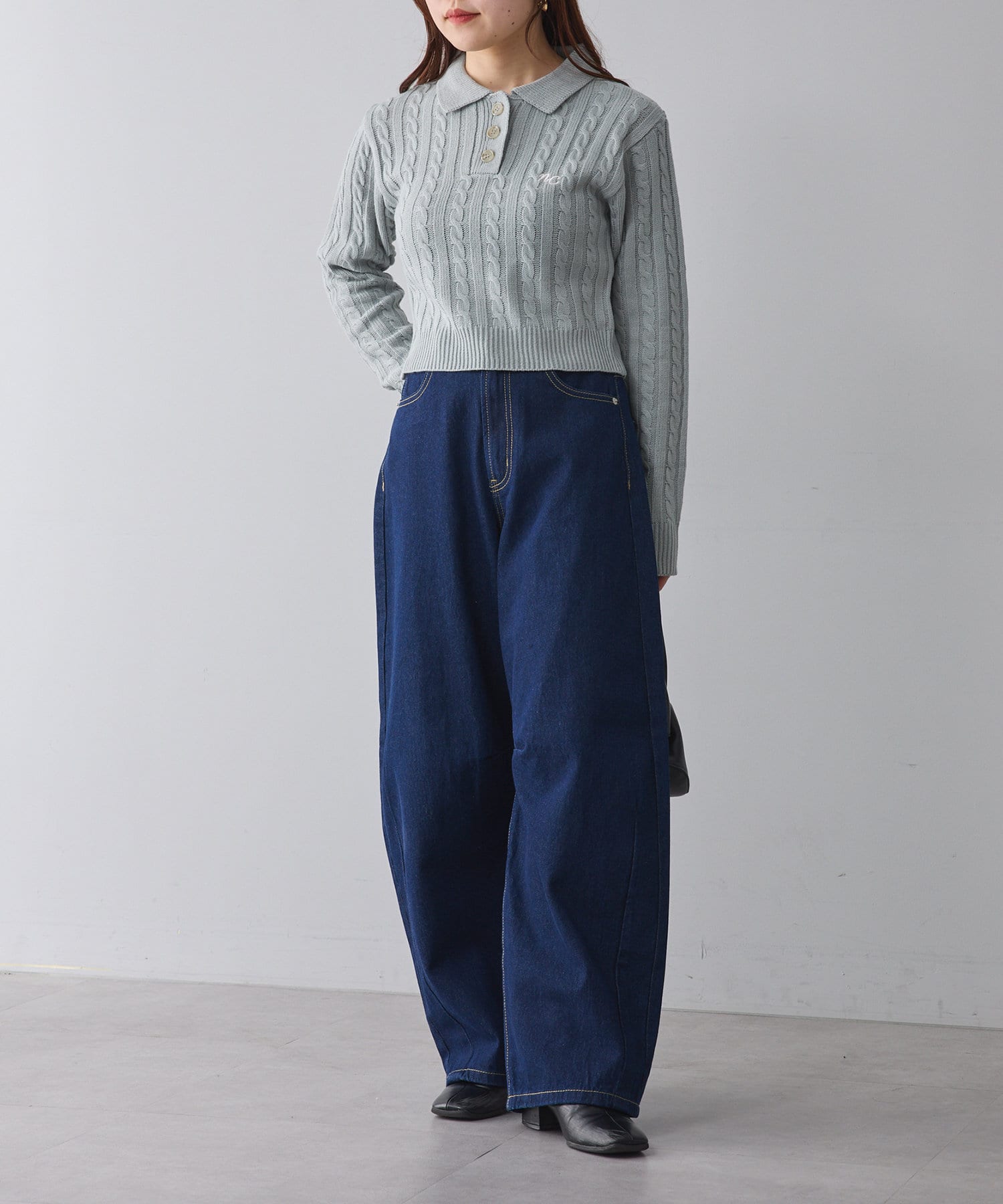 ・存在感のあるケーブルニットをショート丈のポロニットトップスに