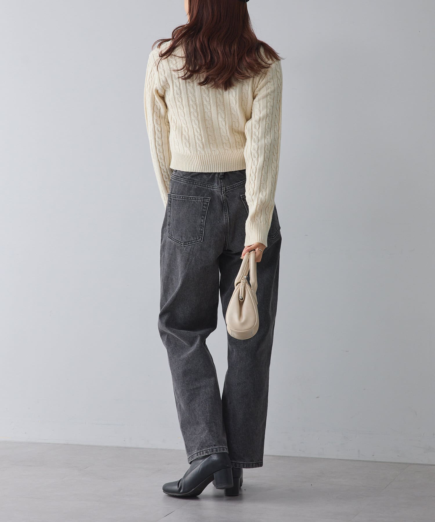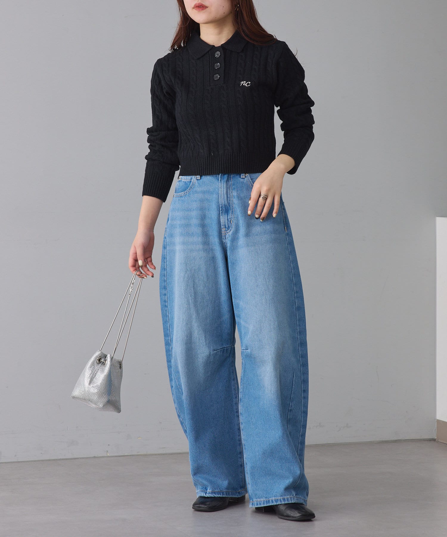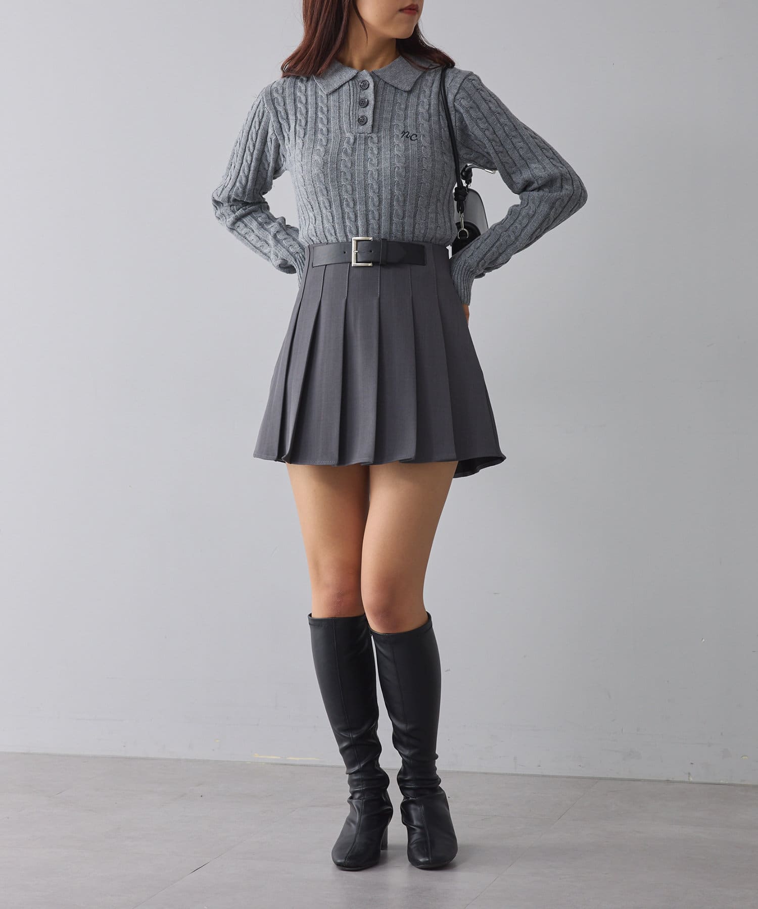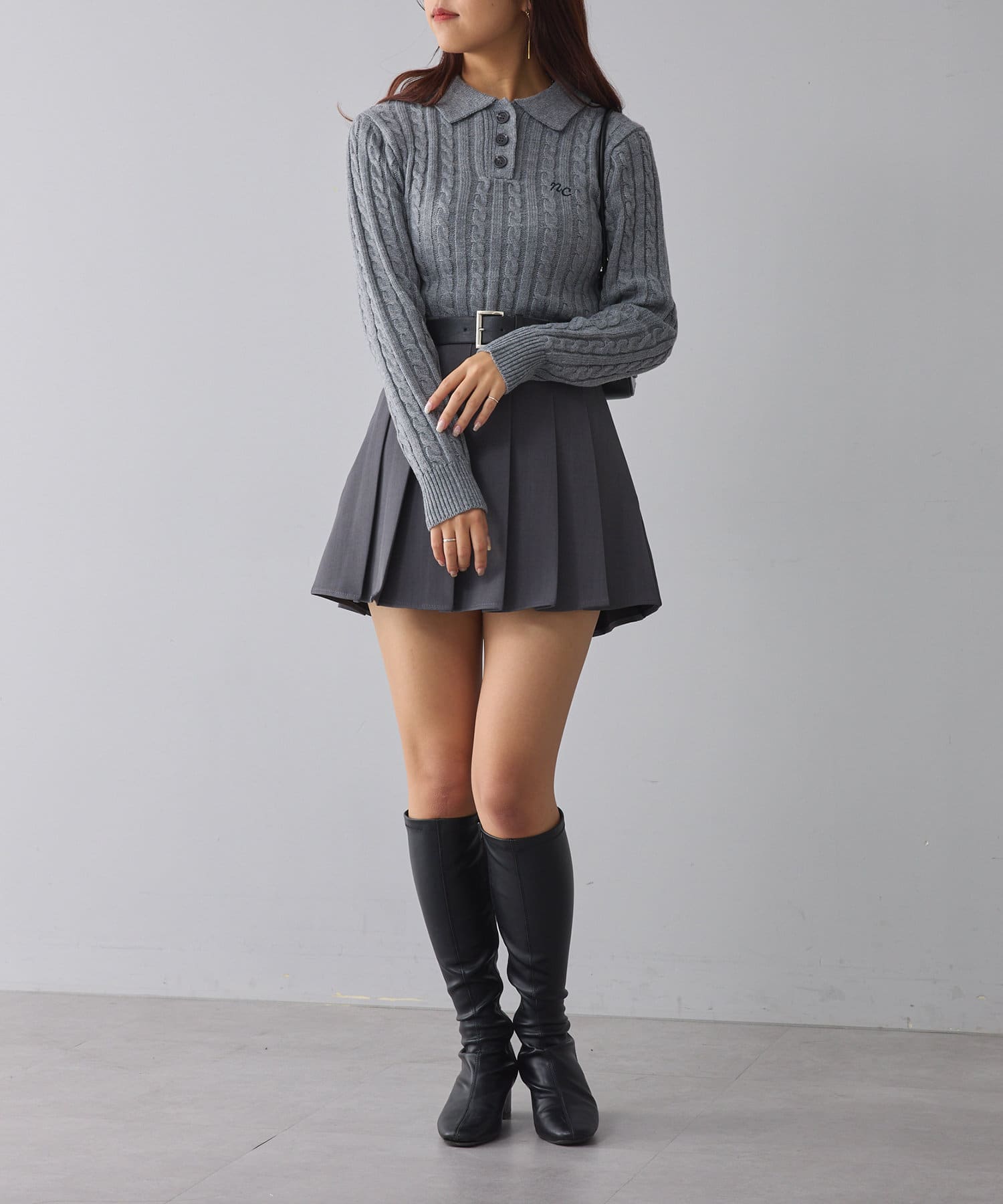・存在感のあるケーブルニットをショート丈のポロニットトップスに