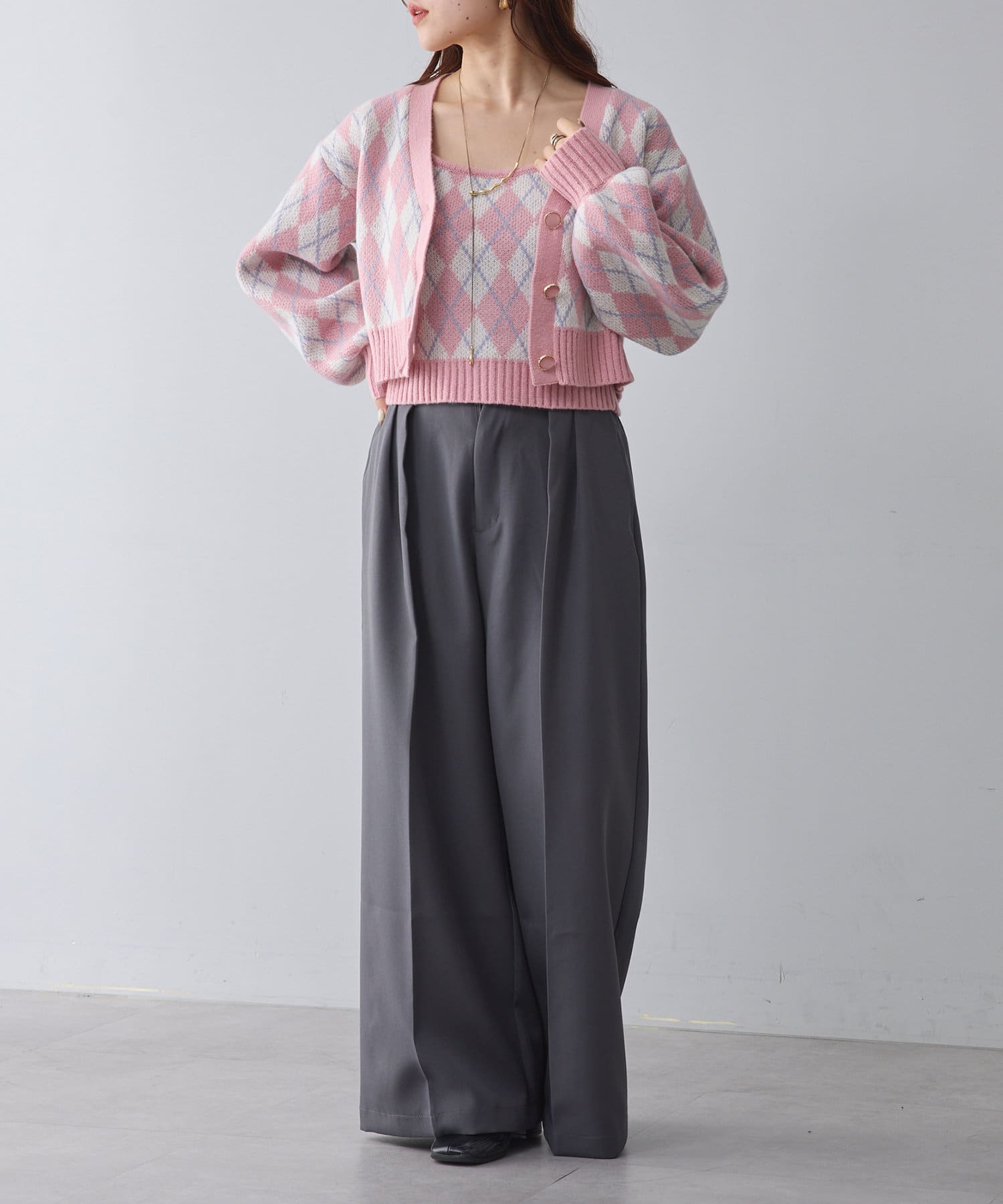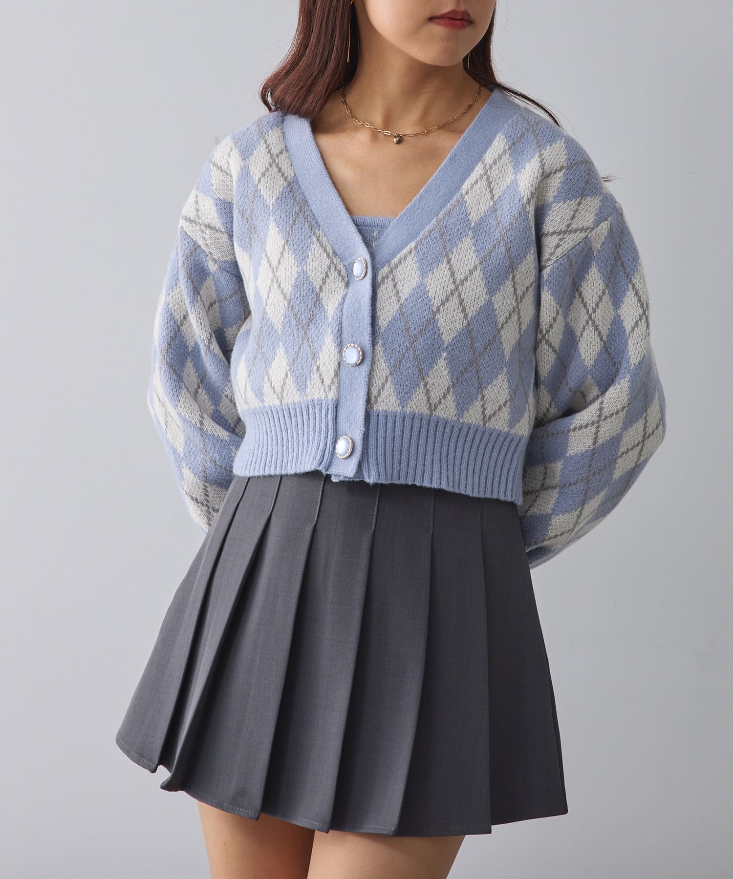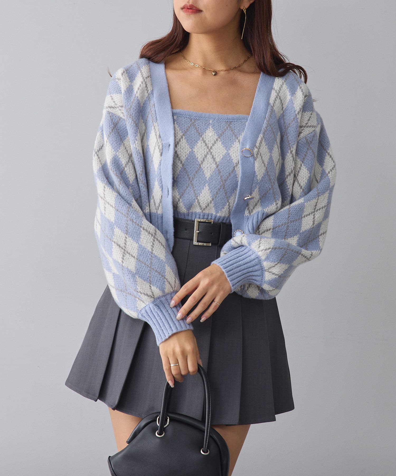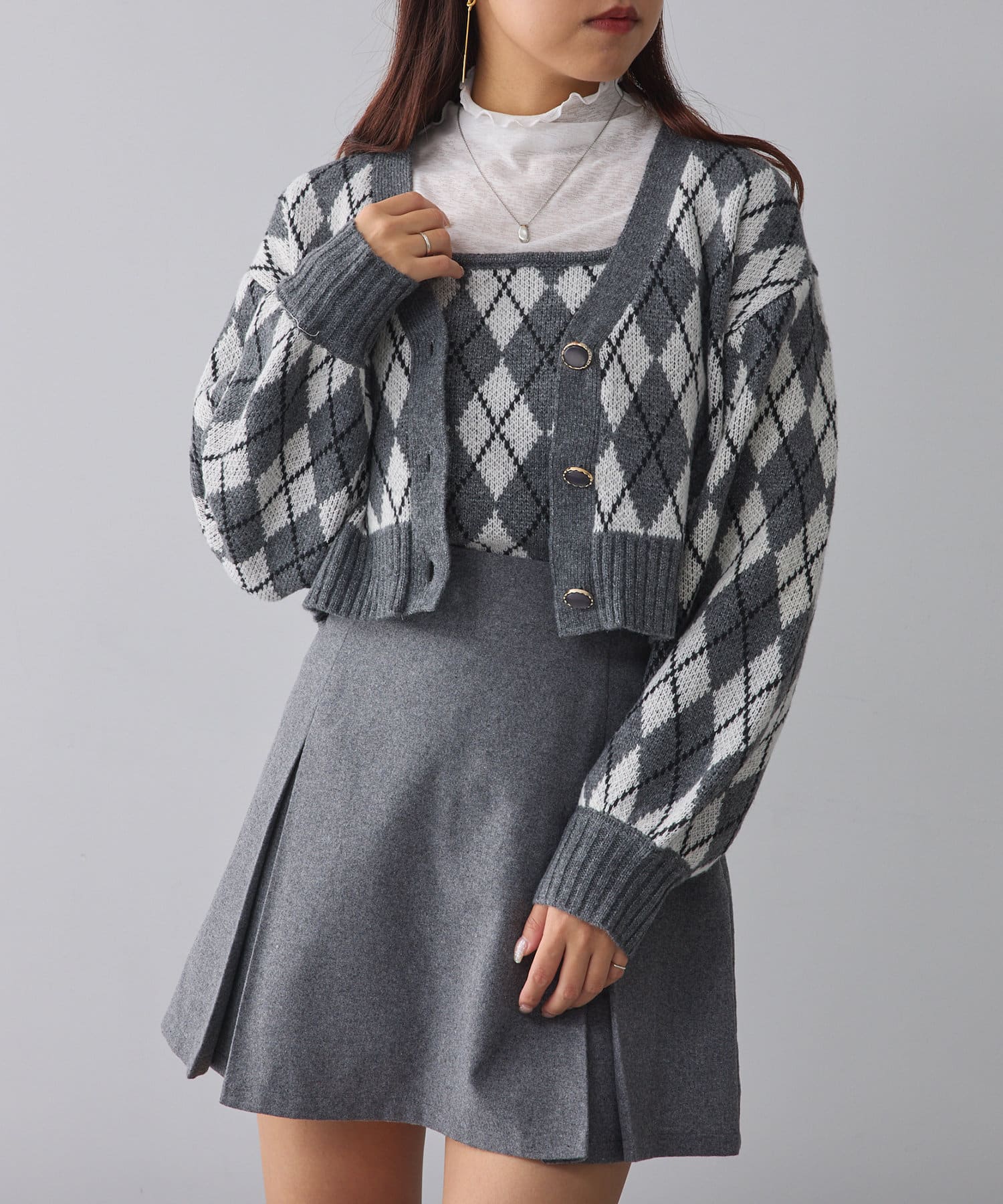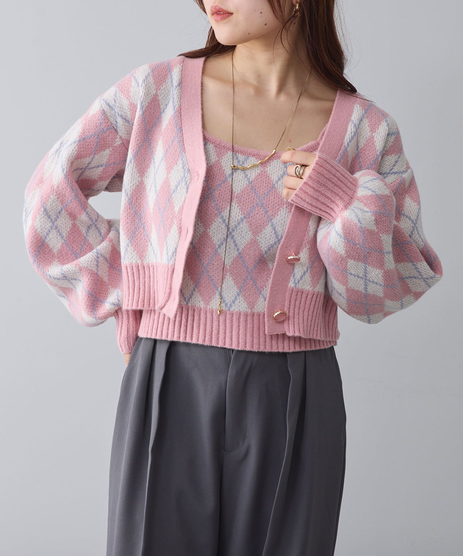 ・明るいアーガイルチェックが特徴のキャミとカーデのセット