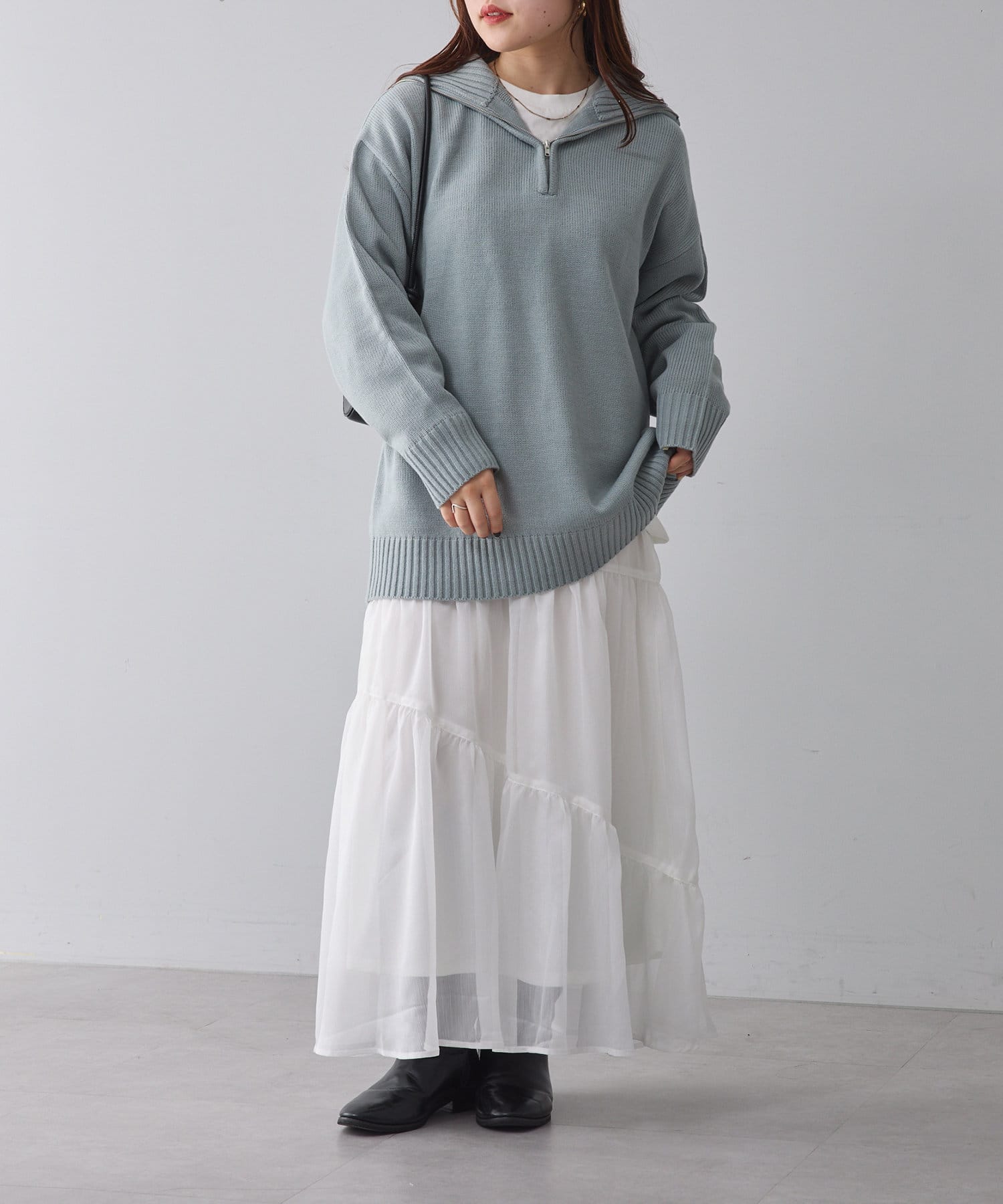 ・ジップを深く開けて、ネックレスと合わせたスタイリングがオススメです