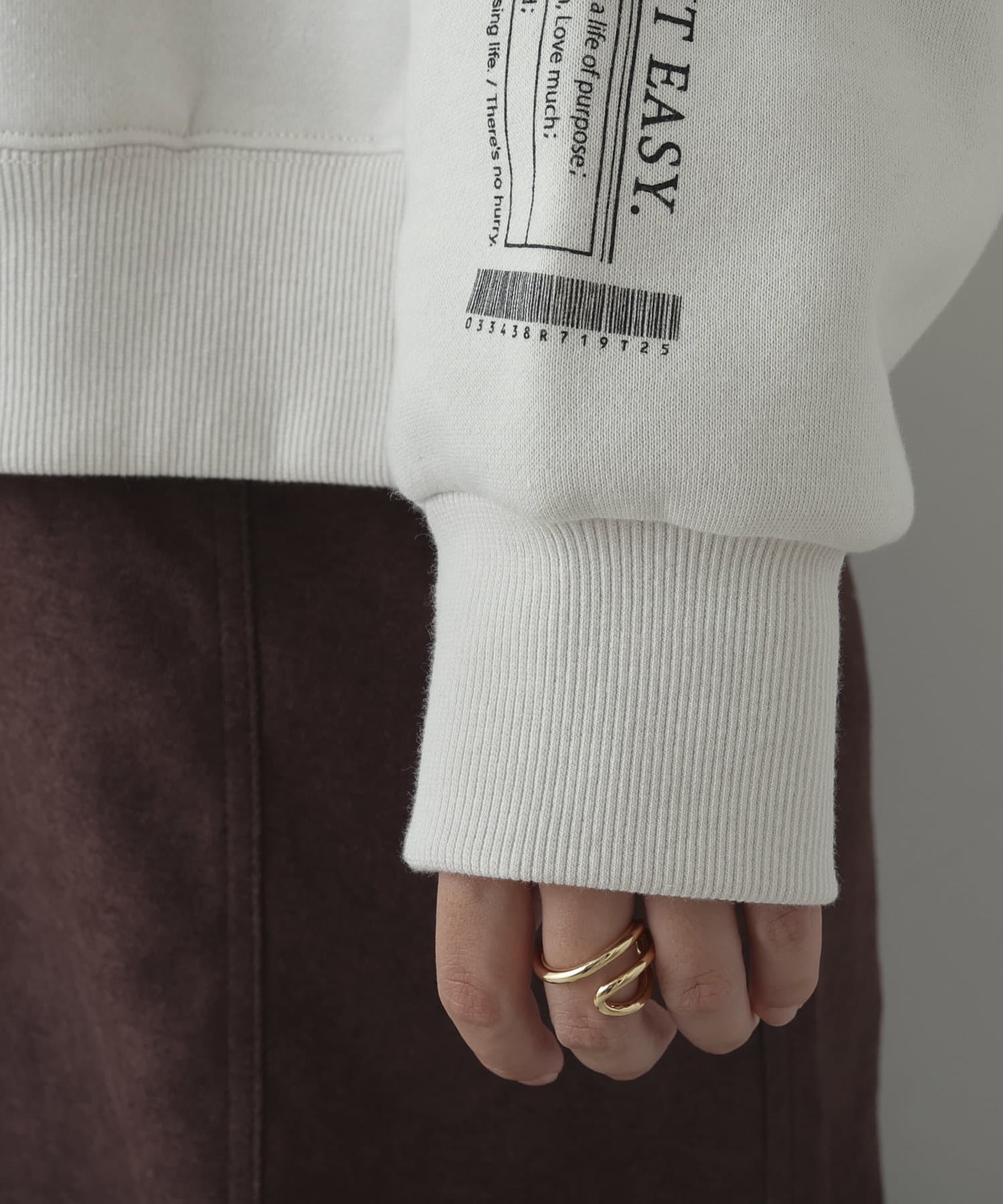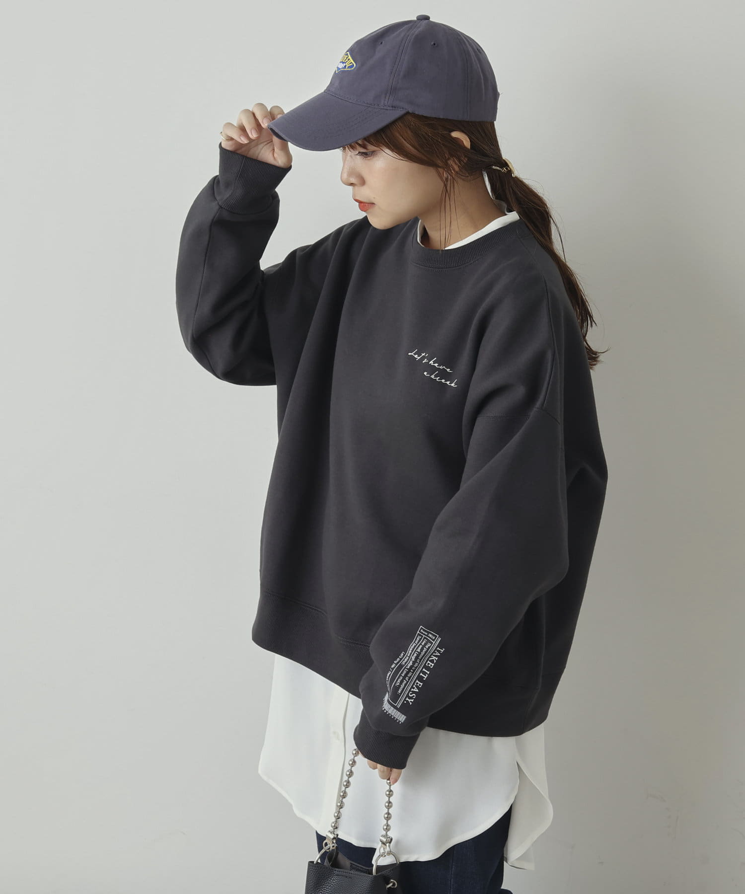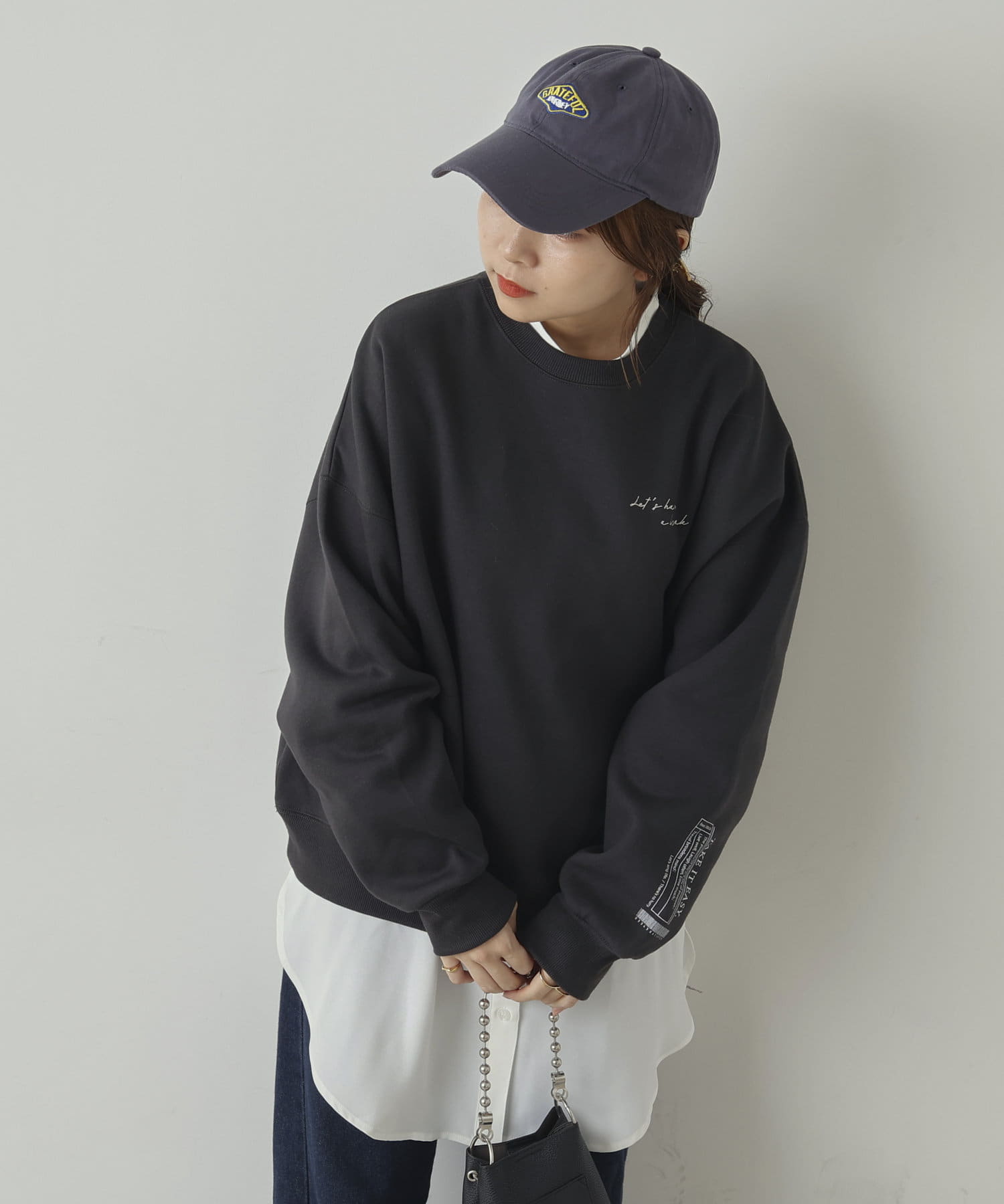 ・袖のロゴがシンプルなコーデでもオシャレ度を格上げ。