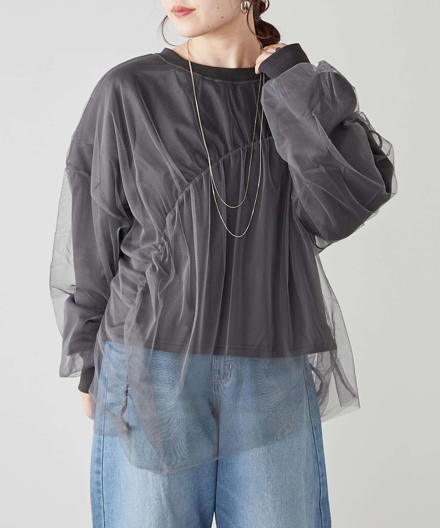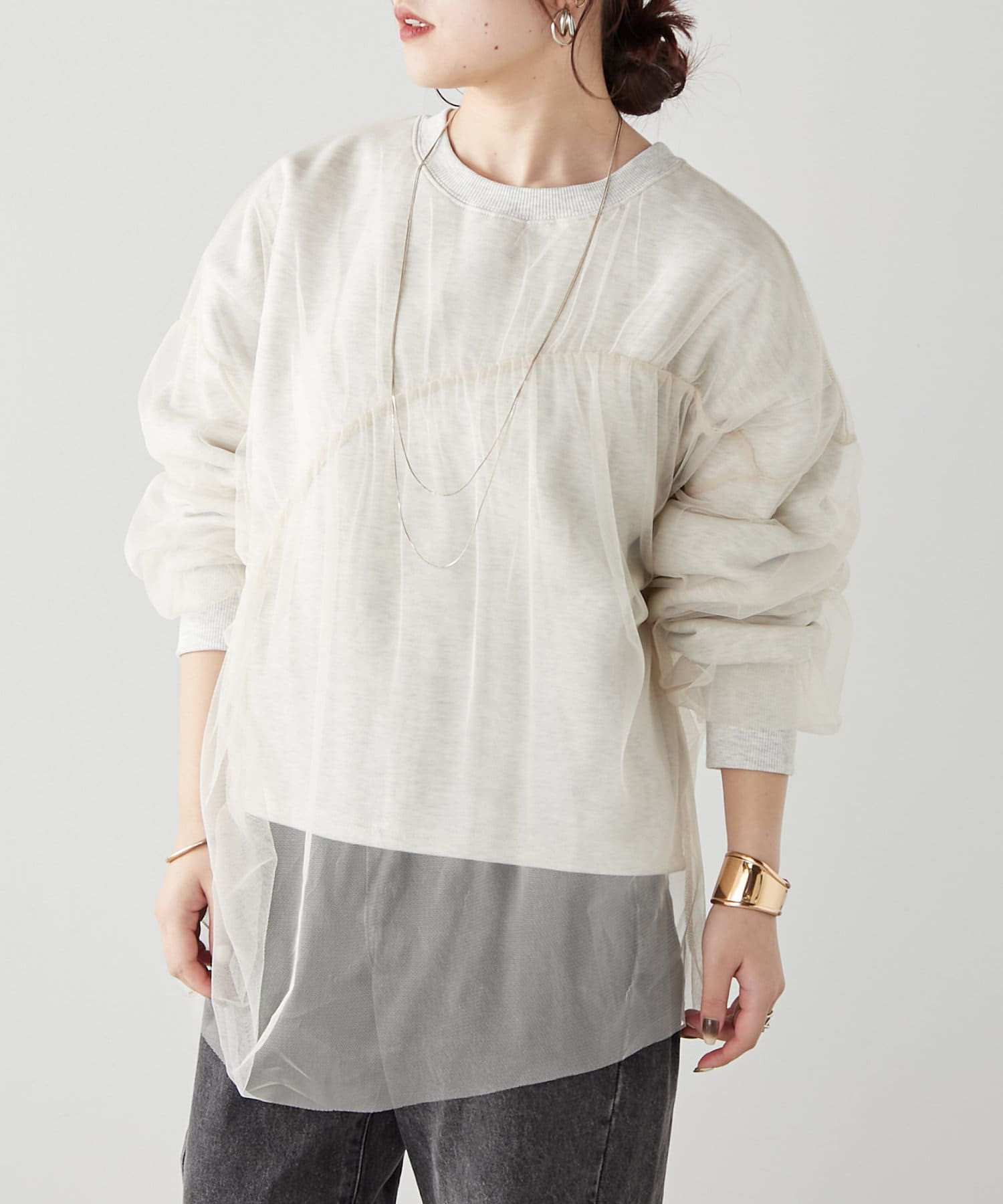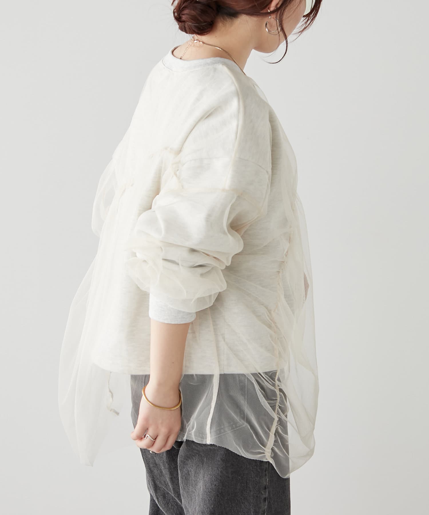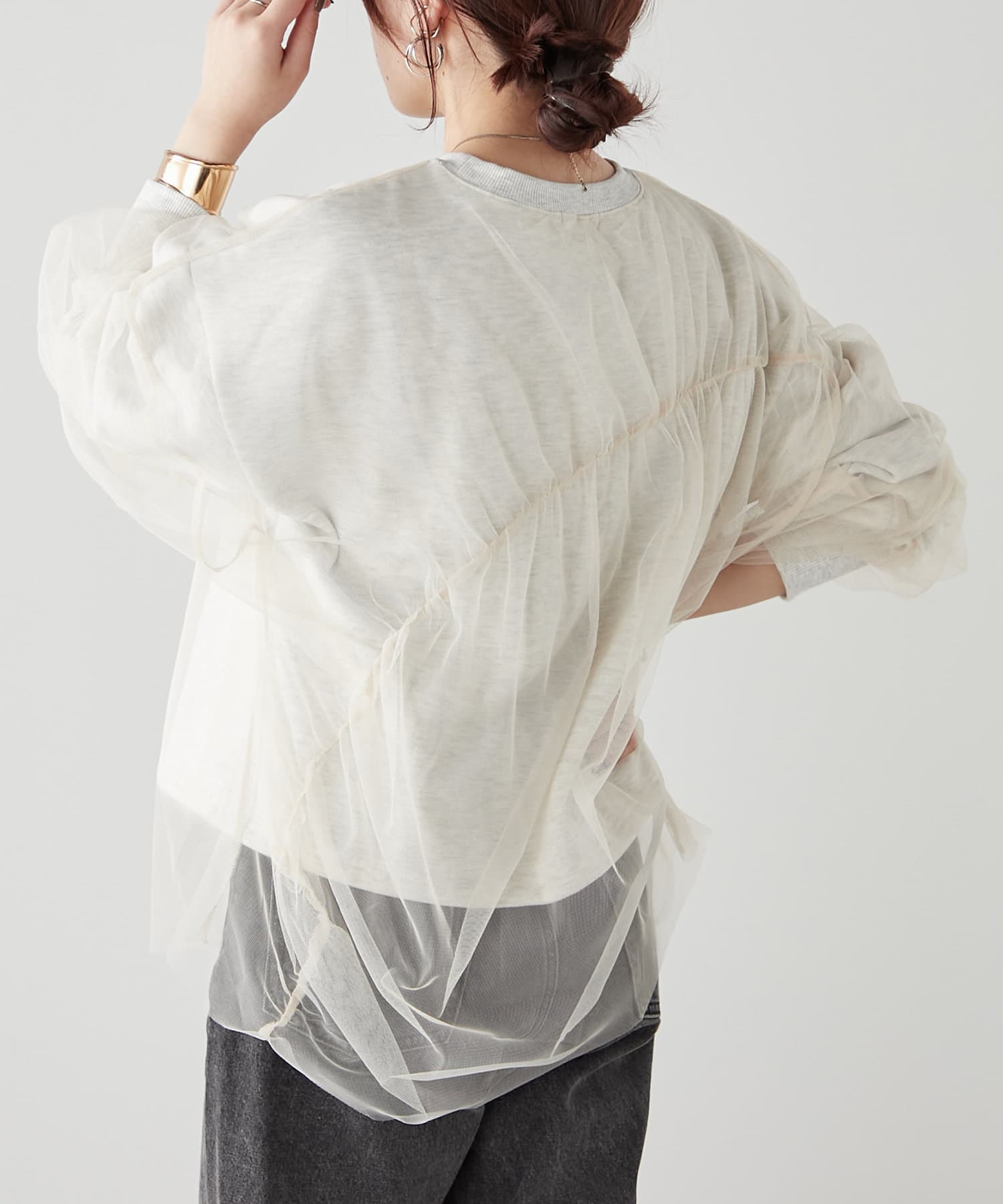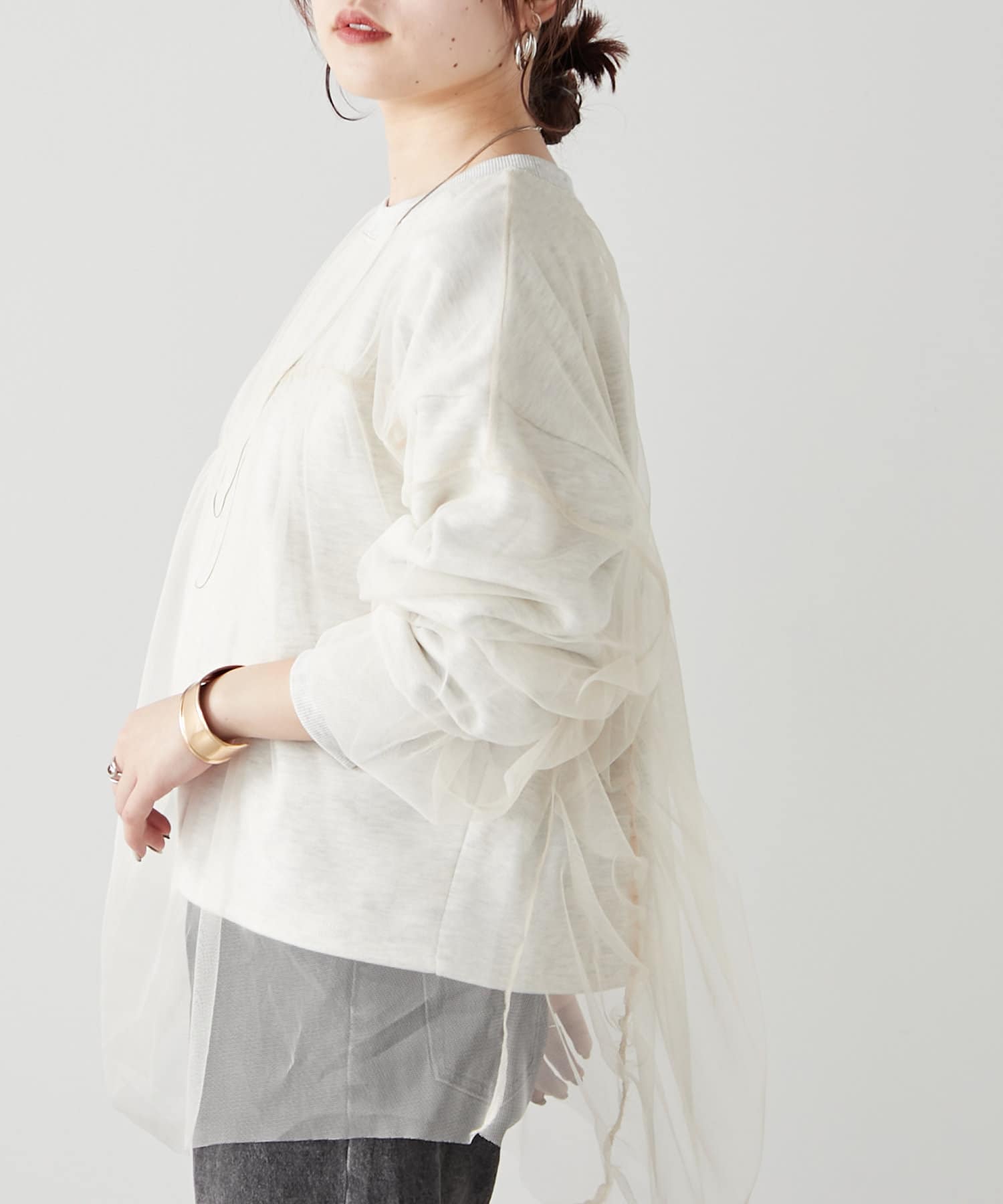 ・カジュアルアイテムのスウェットトップスにギャザーを施したチュールをレイヤードした、カジュアルフェミニンなアイテム。