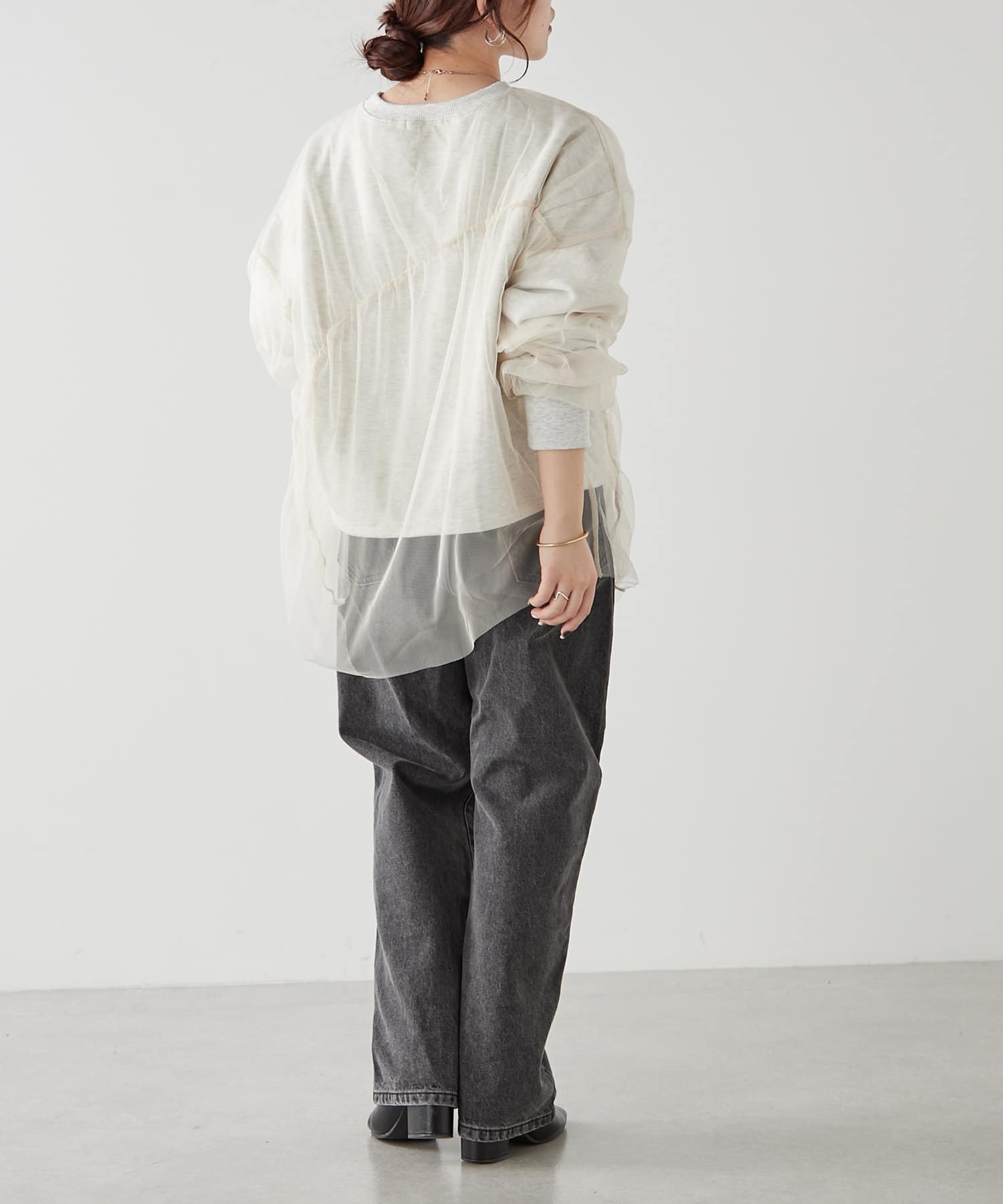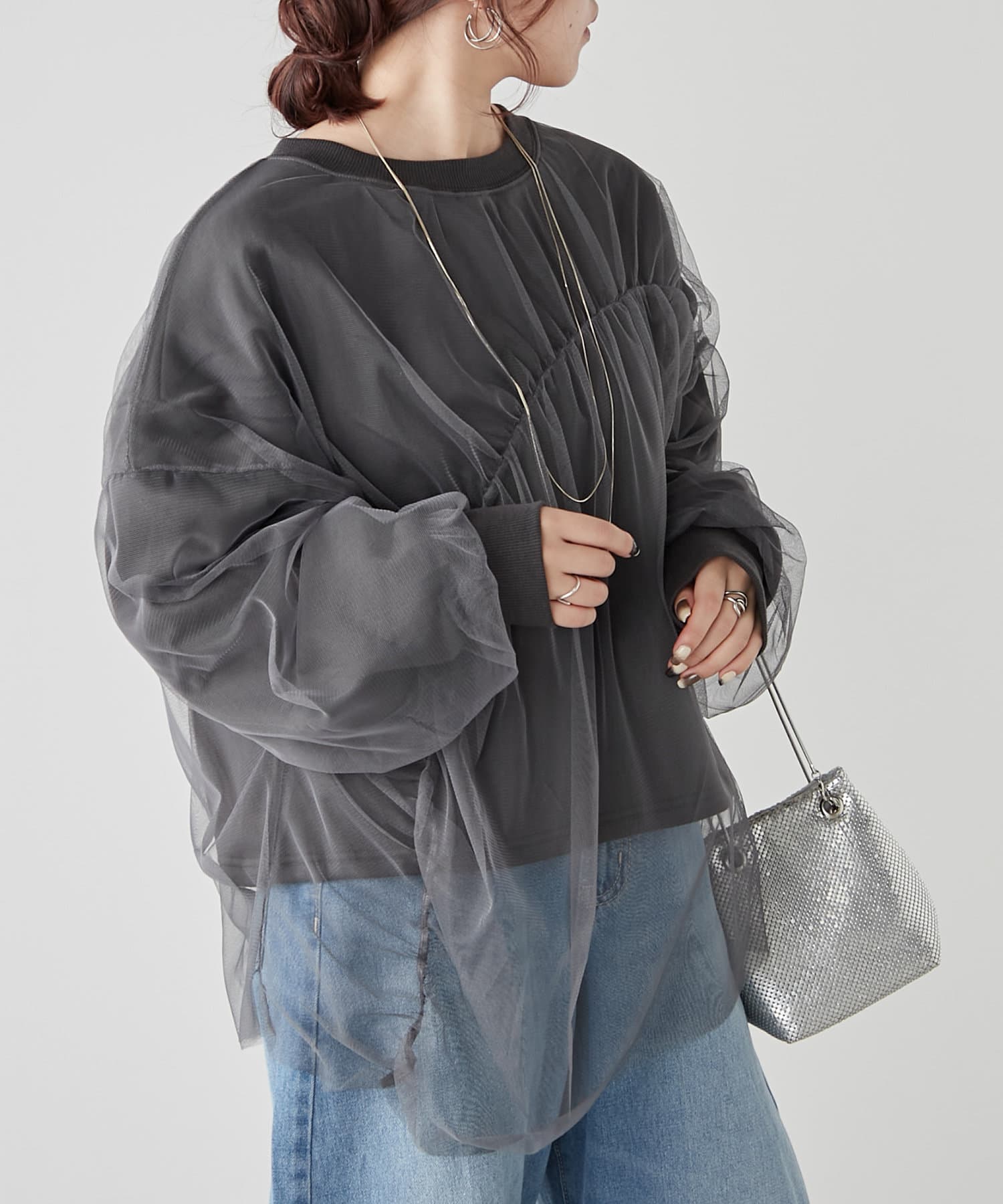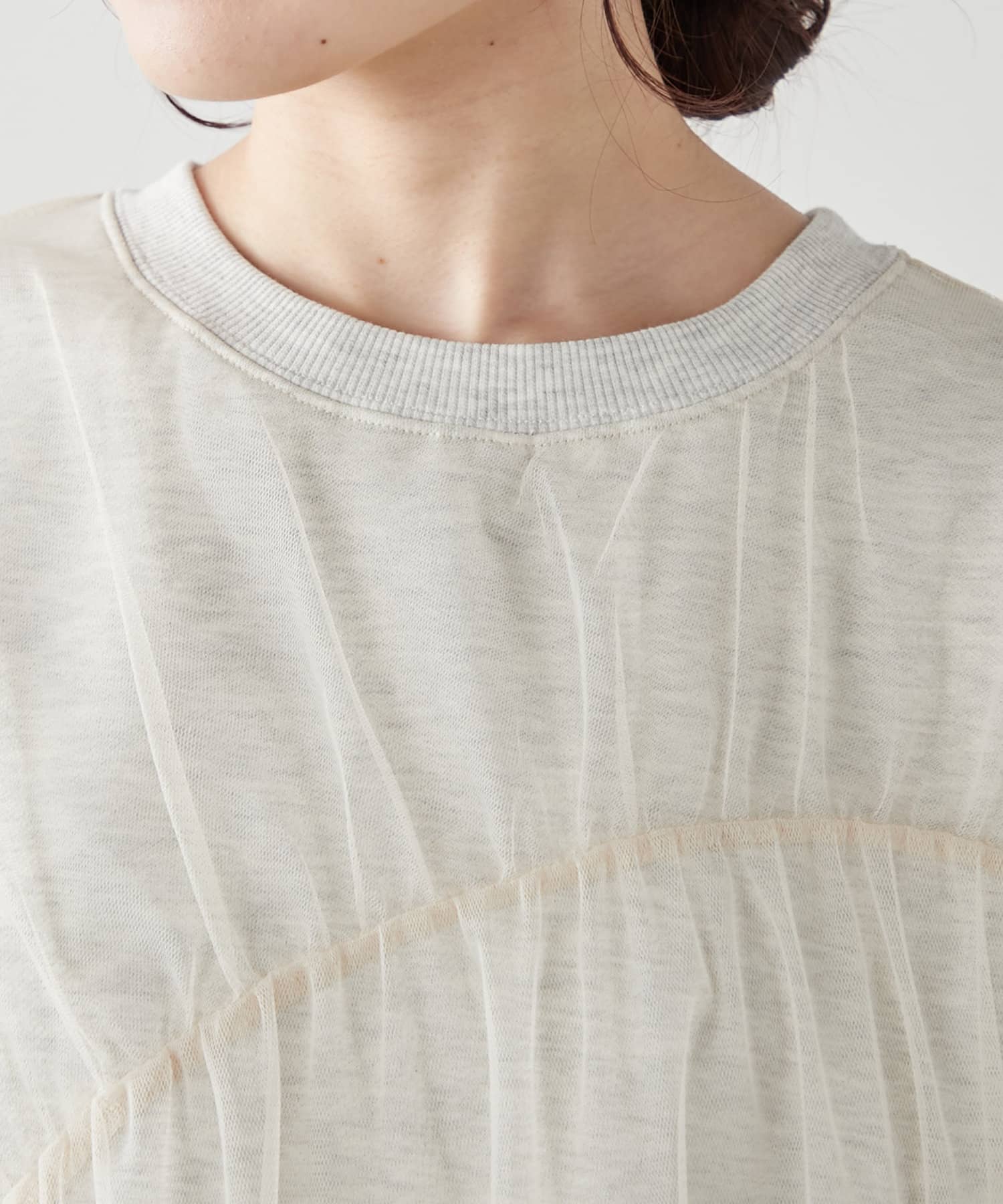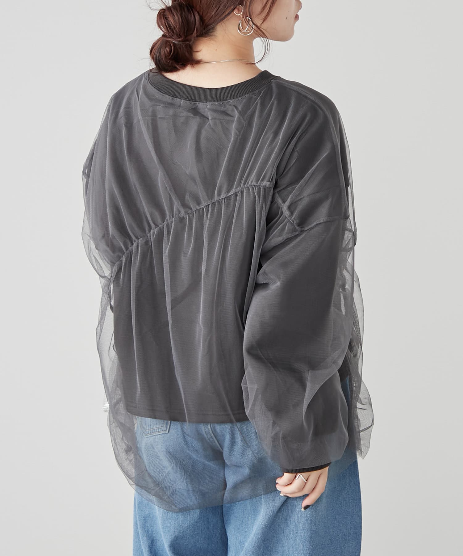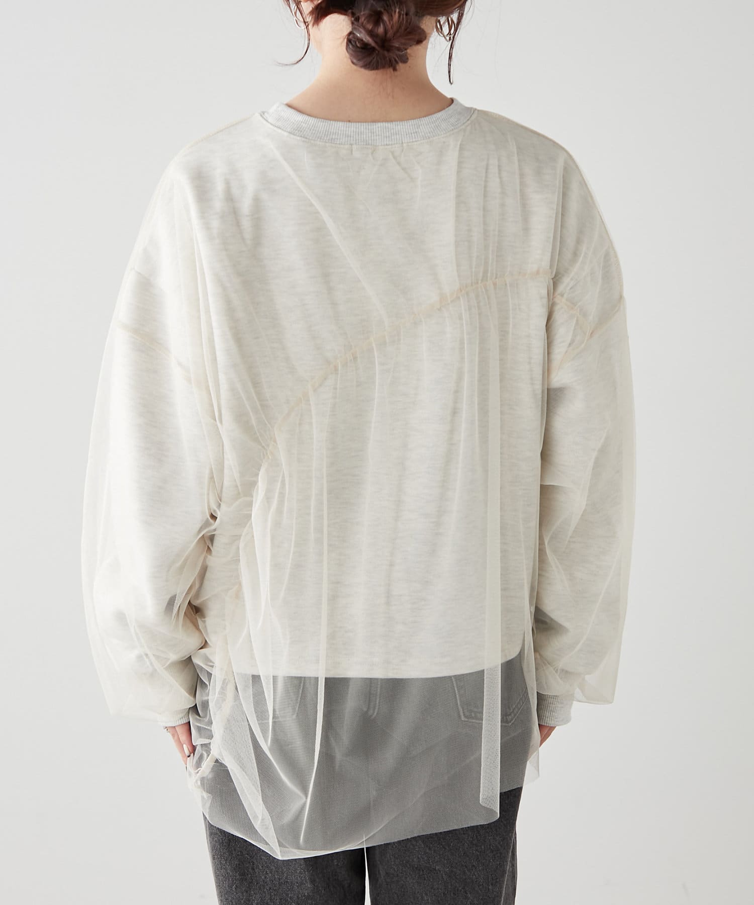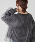 ・カジュアルアイテムのスウェットトップスにギャザーを施したチュールをレイヤードした、カジュアルフェミニンなアイテム。