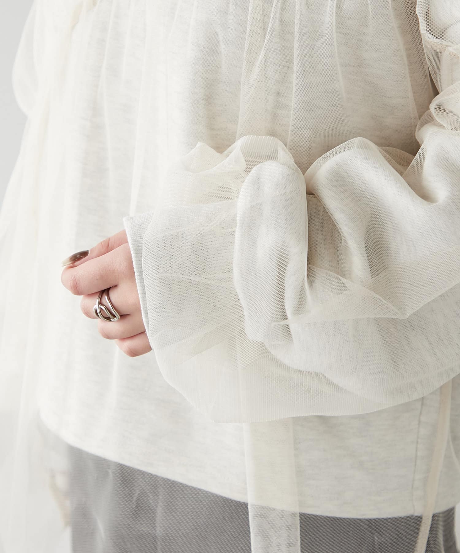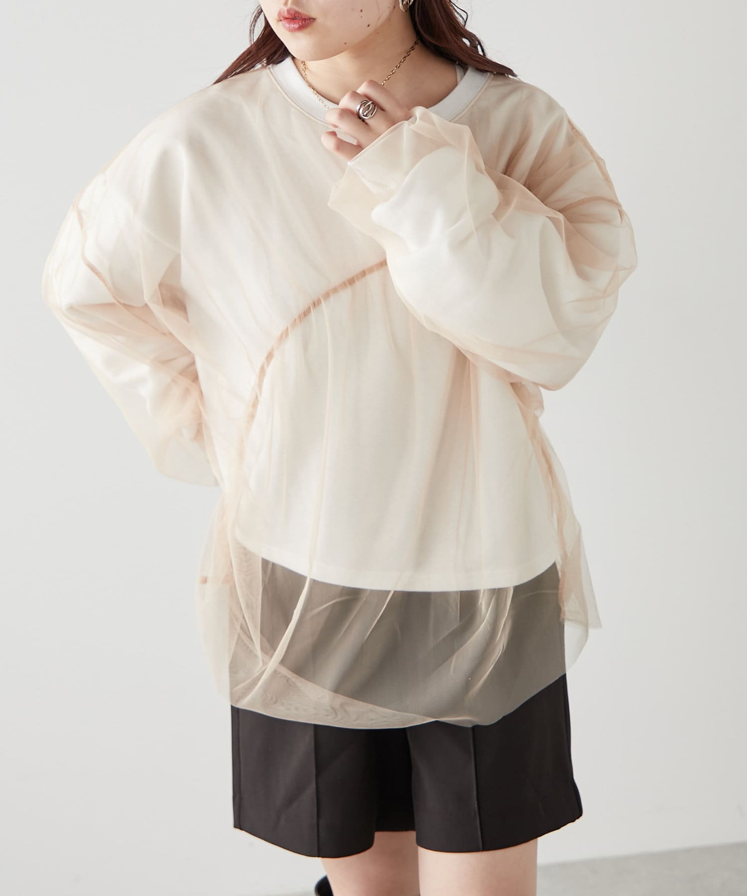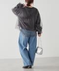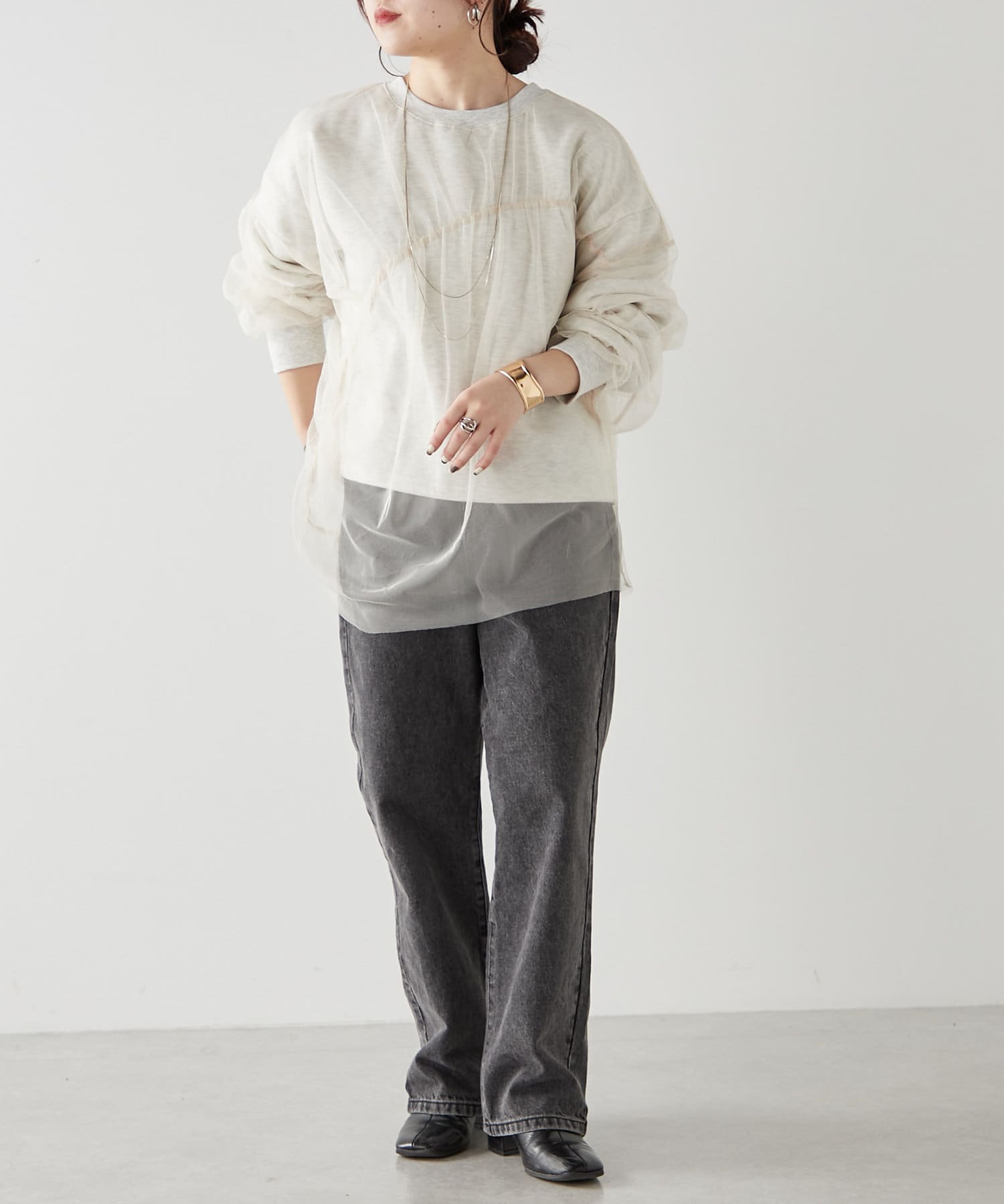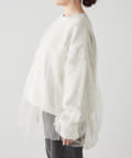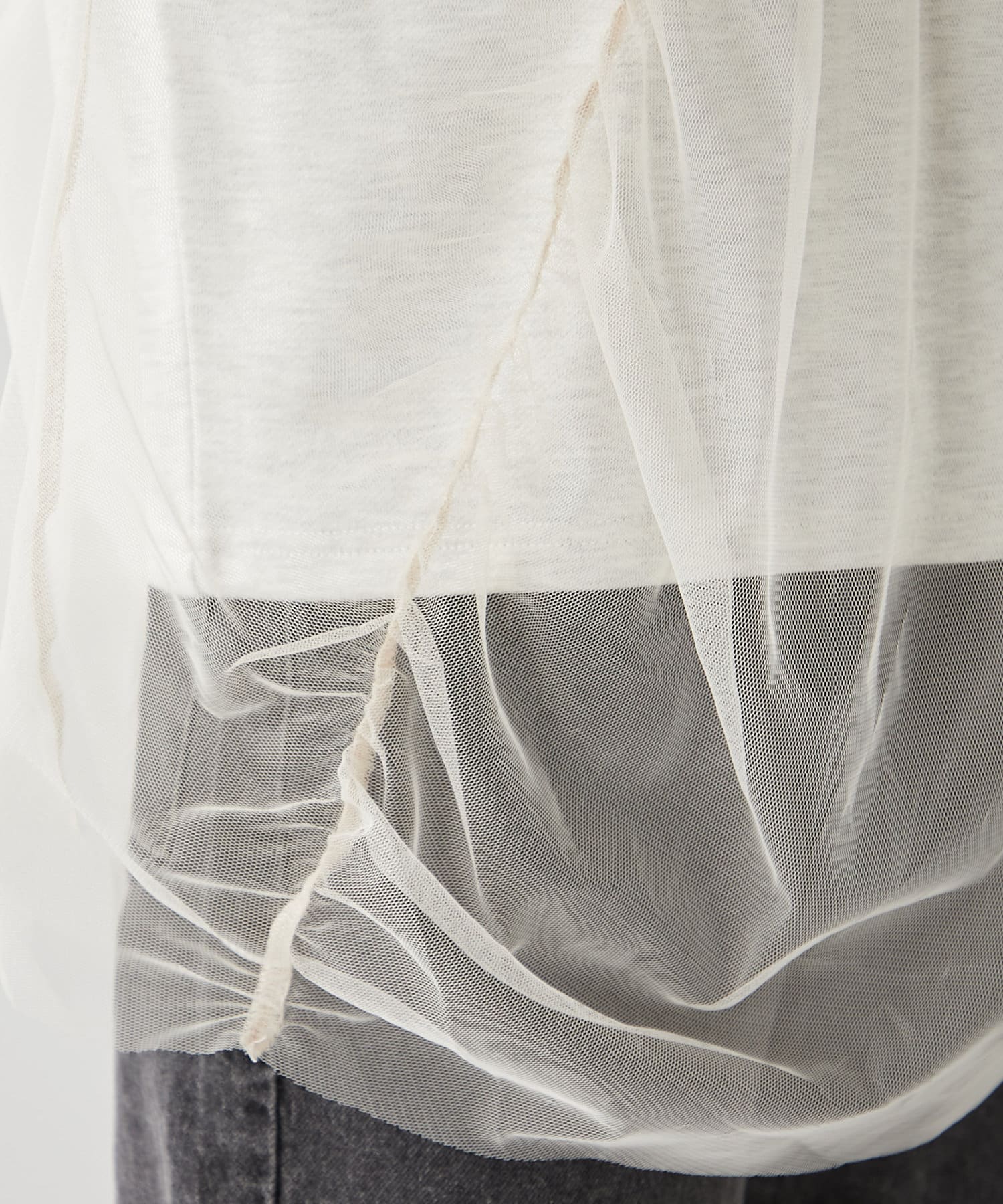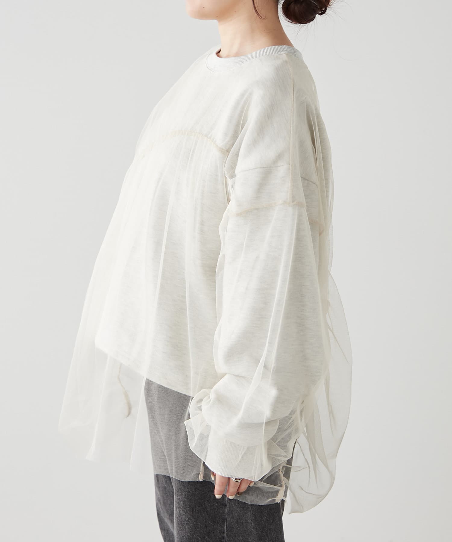 ・カジュアルアイテムのスウェットトップスにギャザーを施したチュールをレイヤードした、カジュアルフェミニンなアイテム。