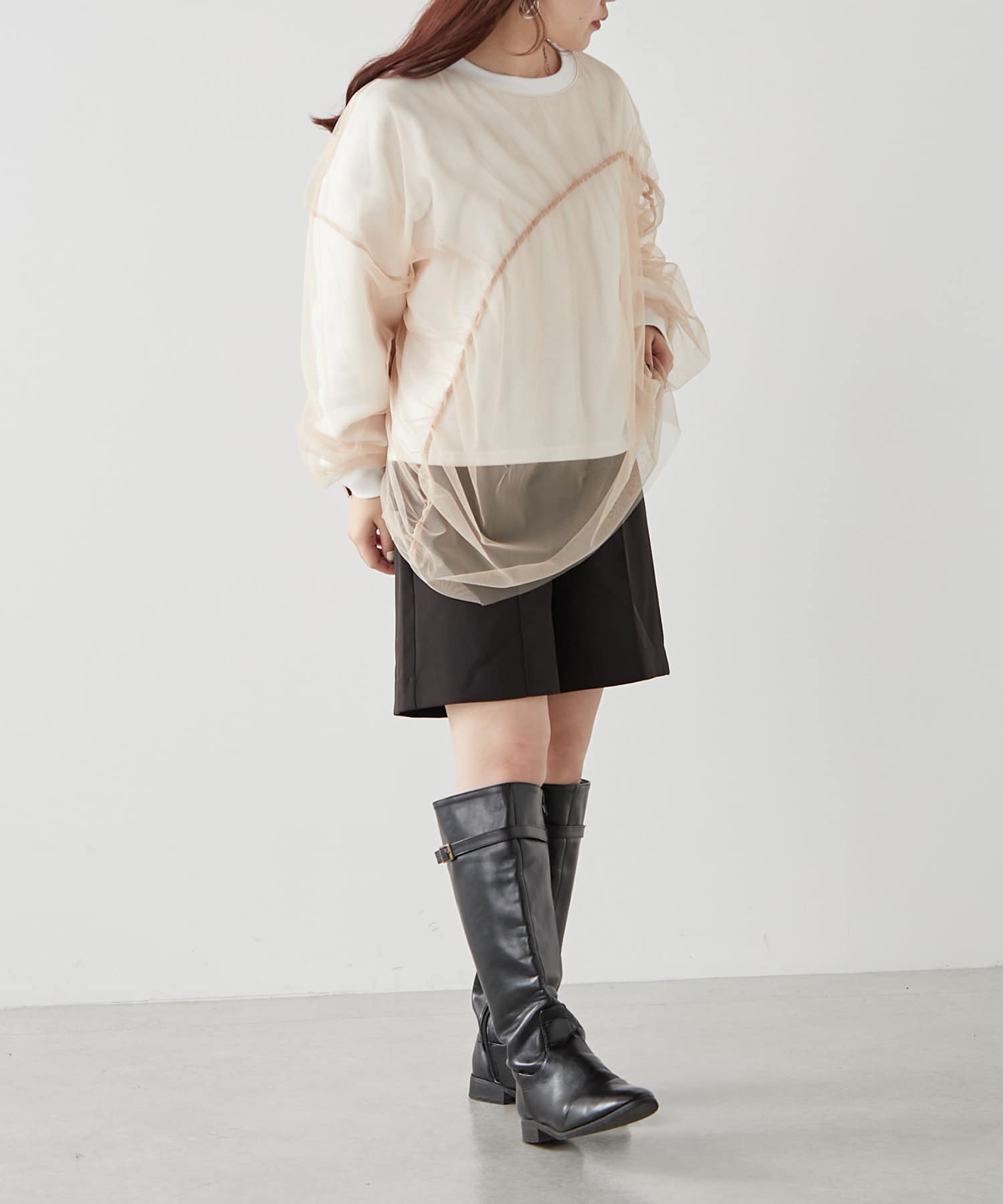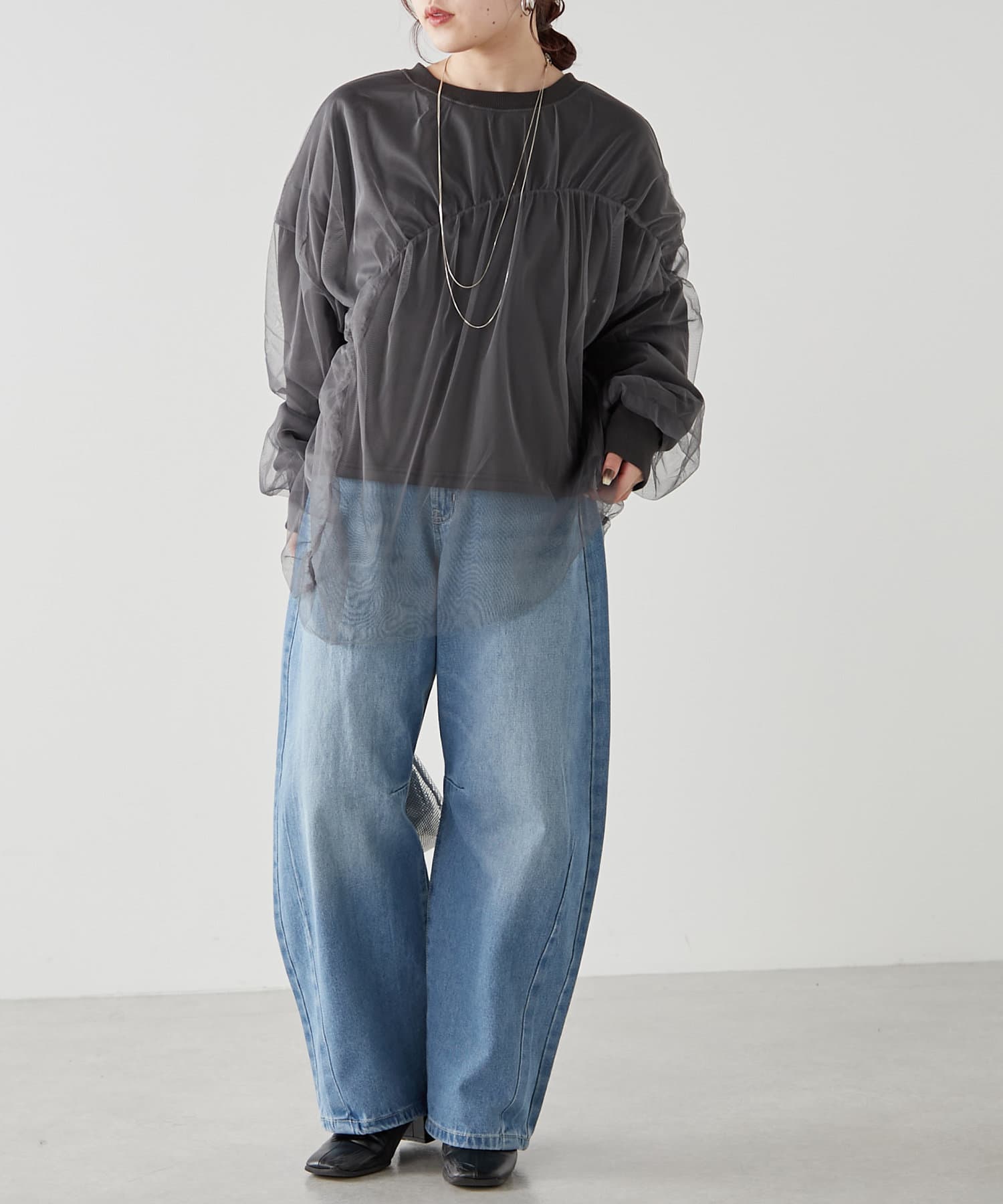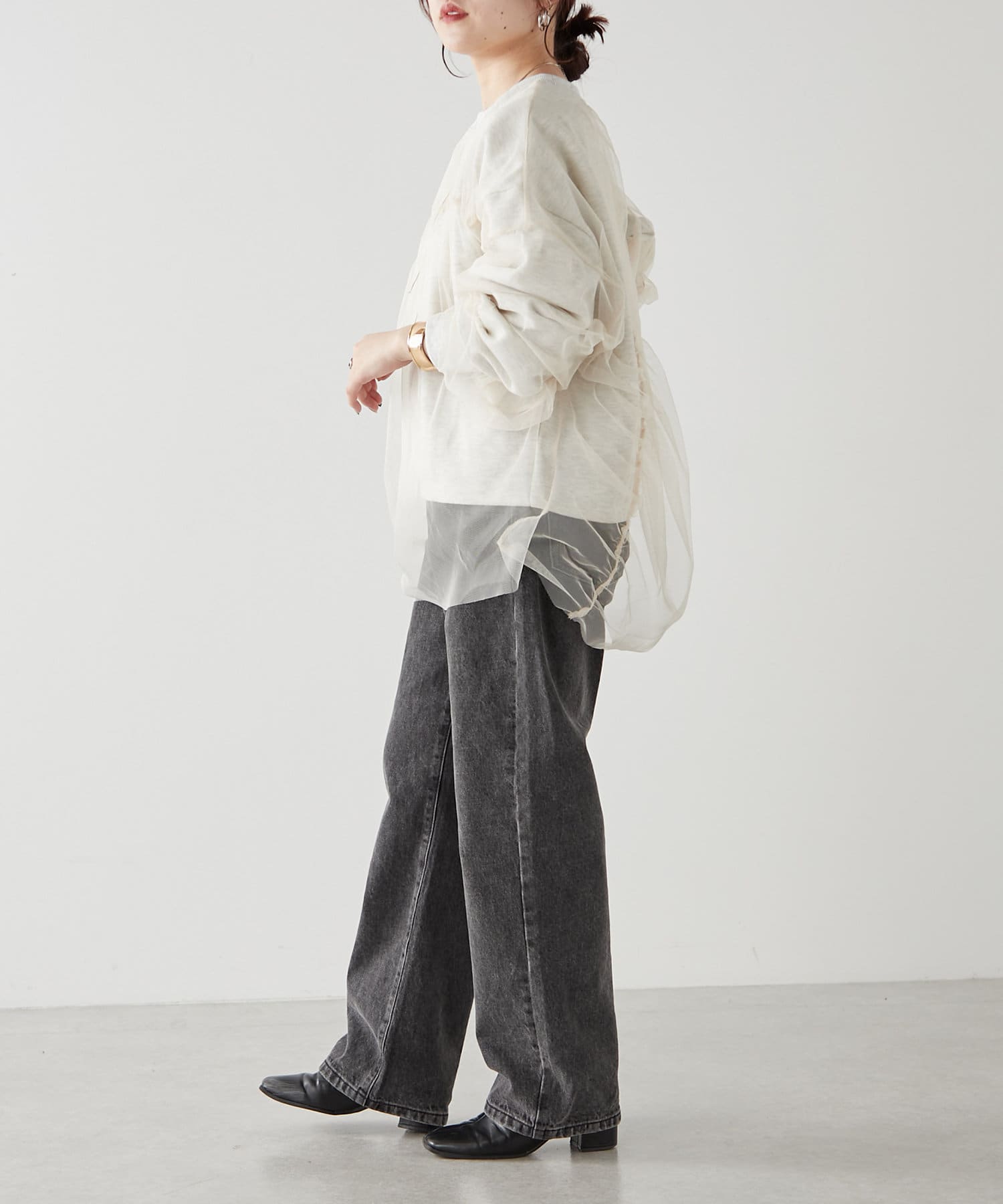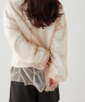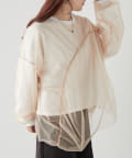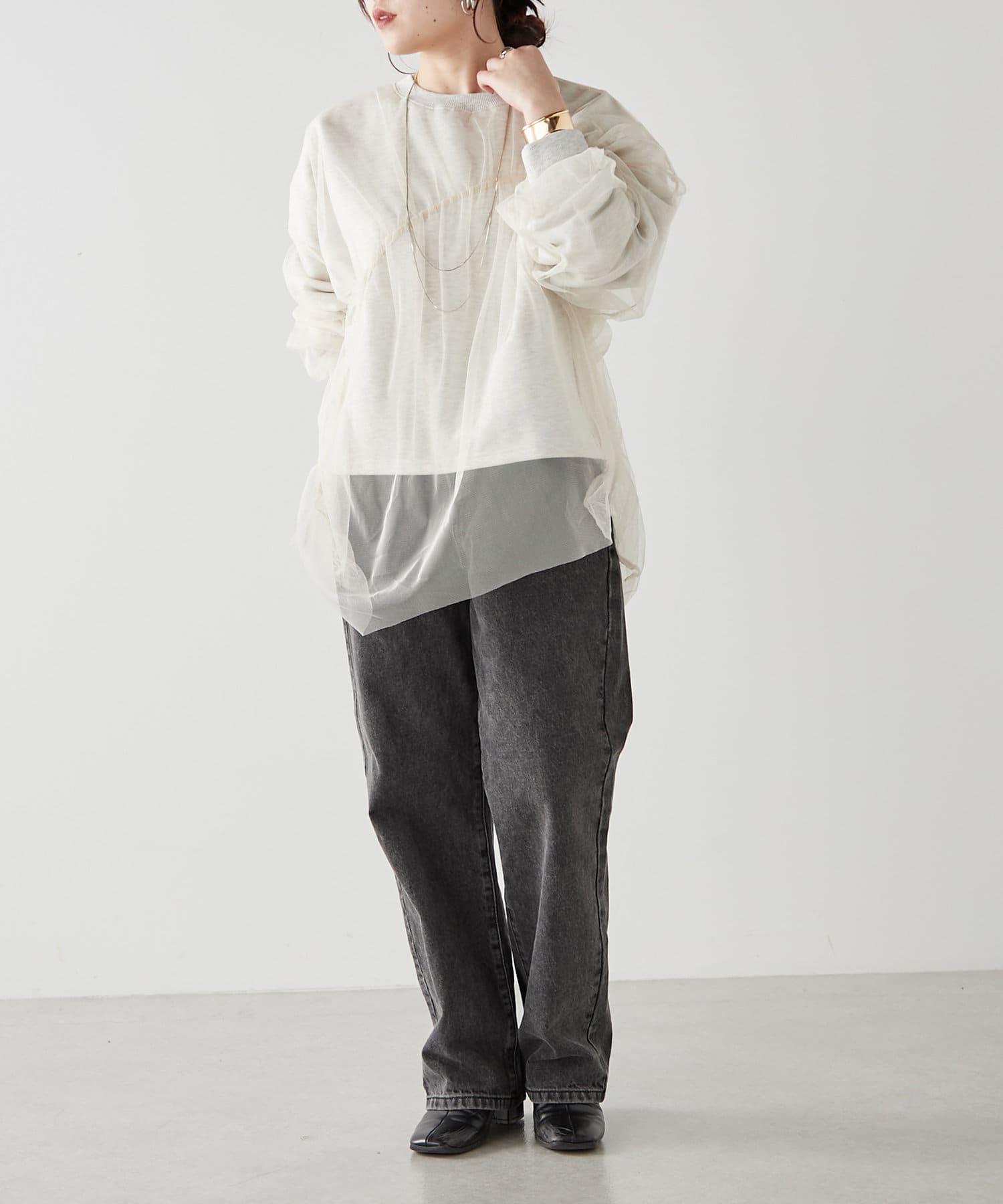・カジュアルアイテムのスウェットトップスにギャザーを施したチュールをレイヤードした、カジュアルフェミニンなアイテム。