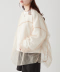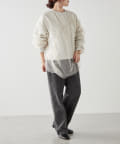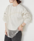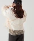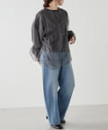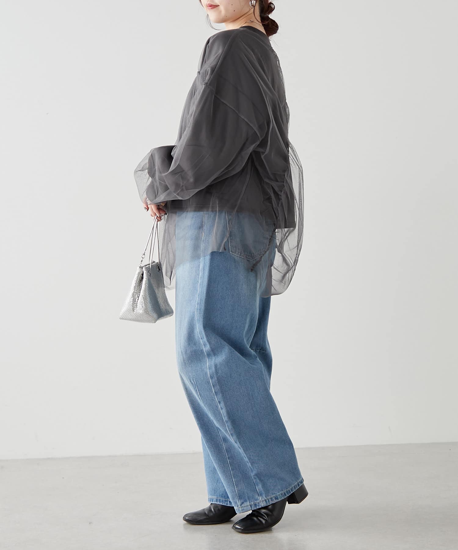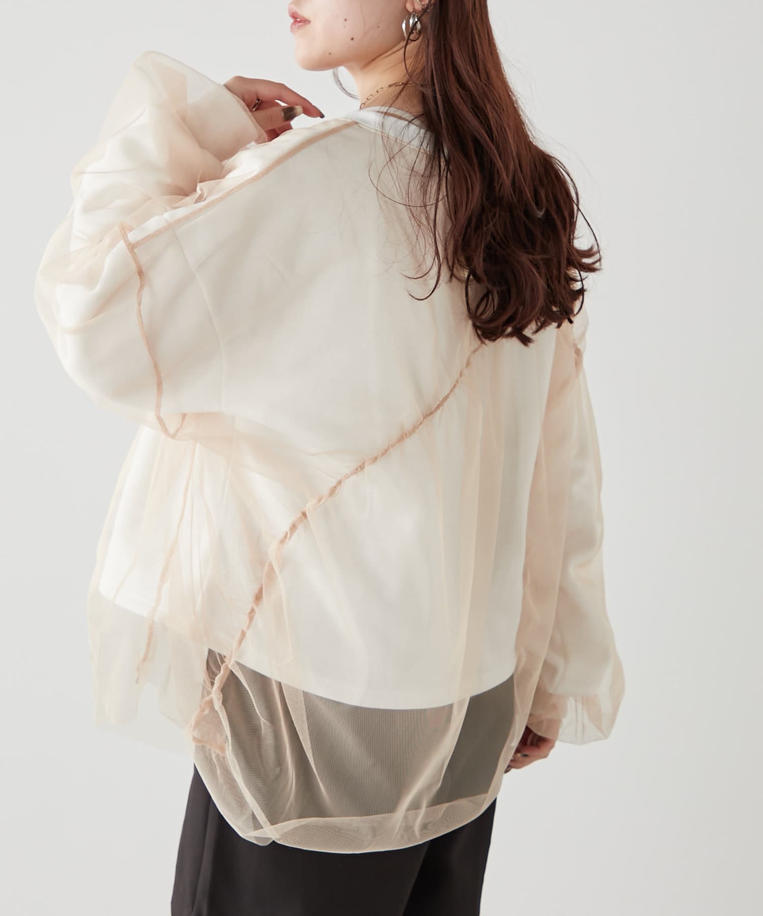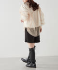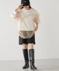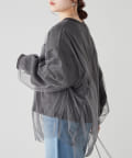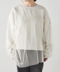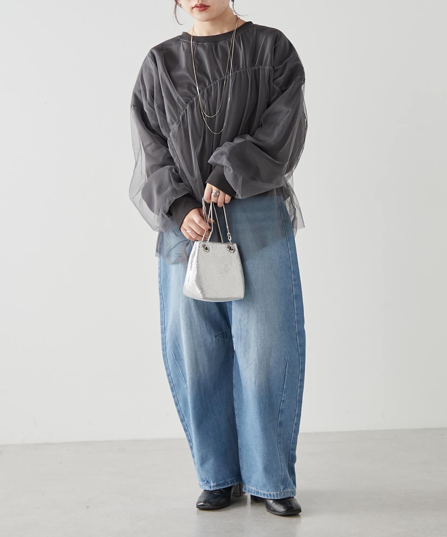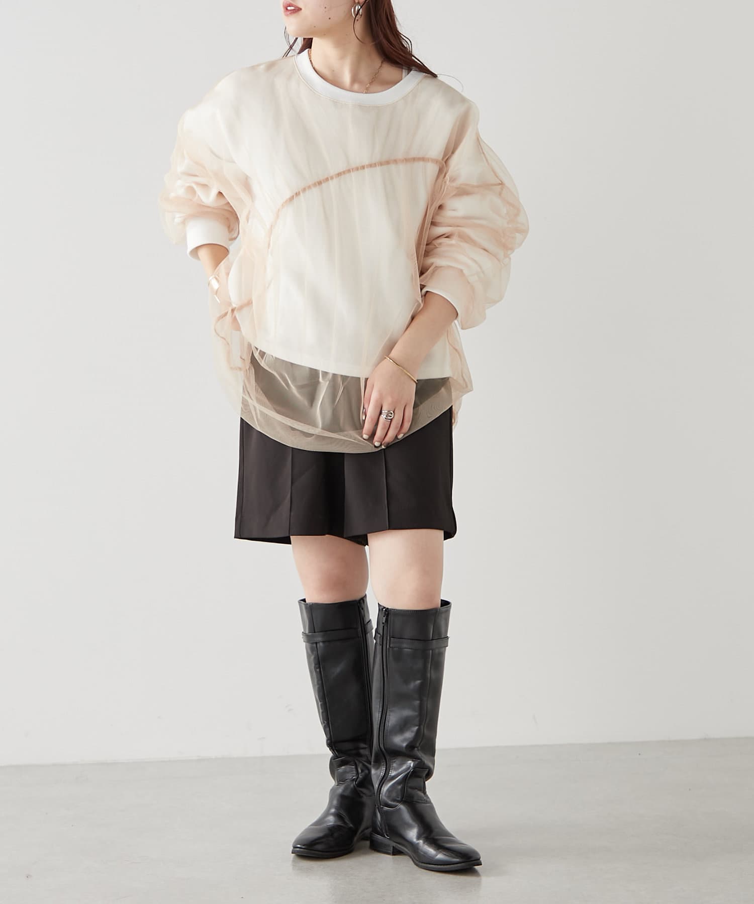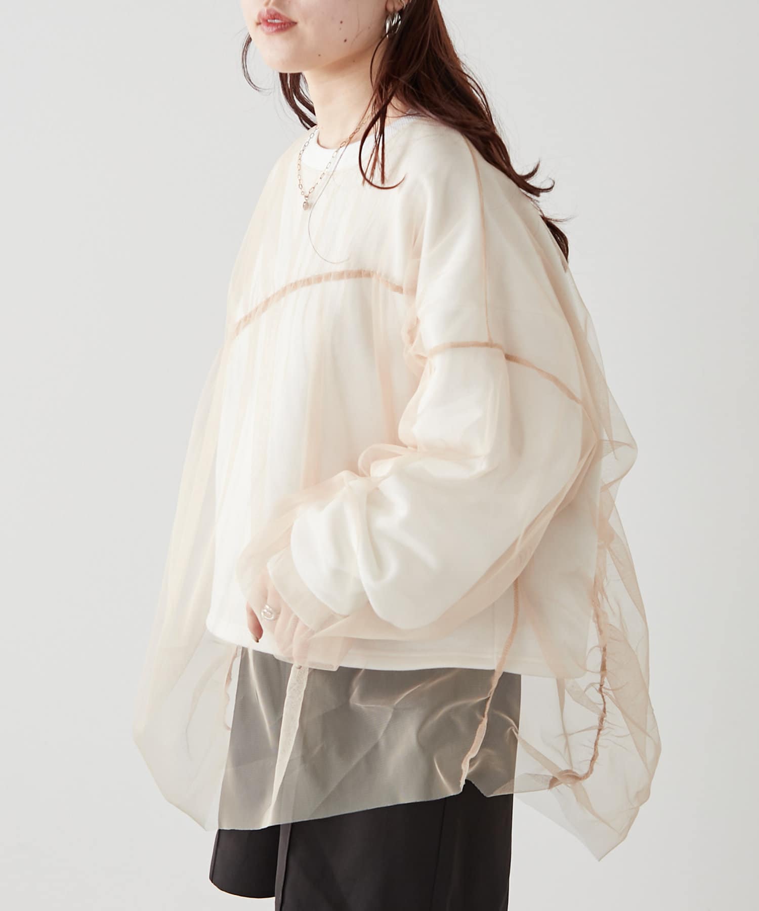 ・カジュアルアイテムのスウェットトップスにギャザーを施したチュールをレイヤードした、カジュアルフェミニンなアイテム。