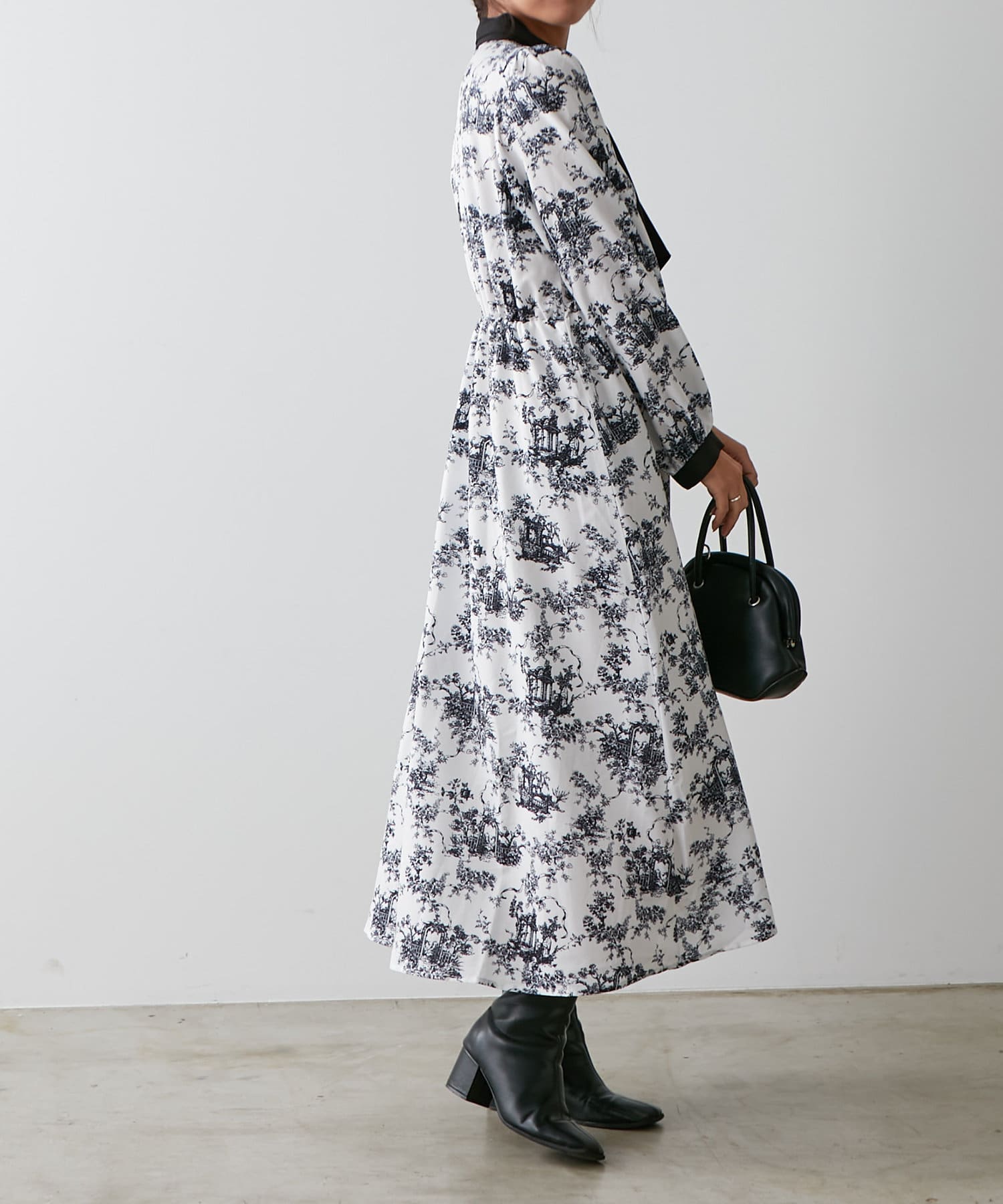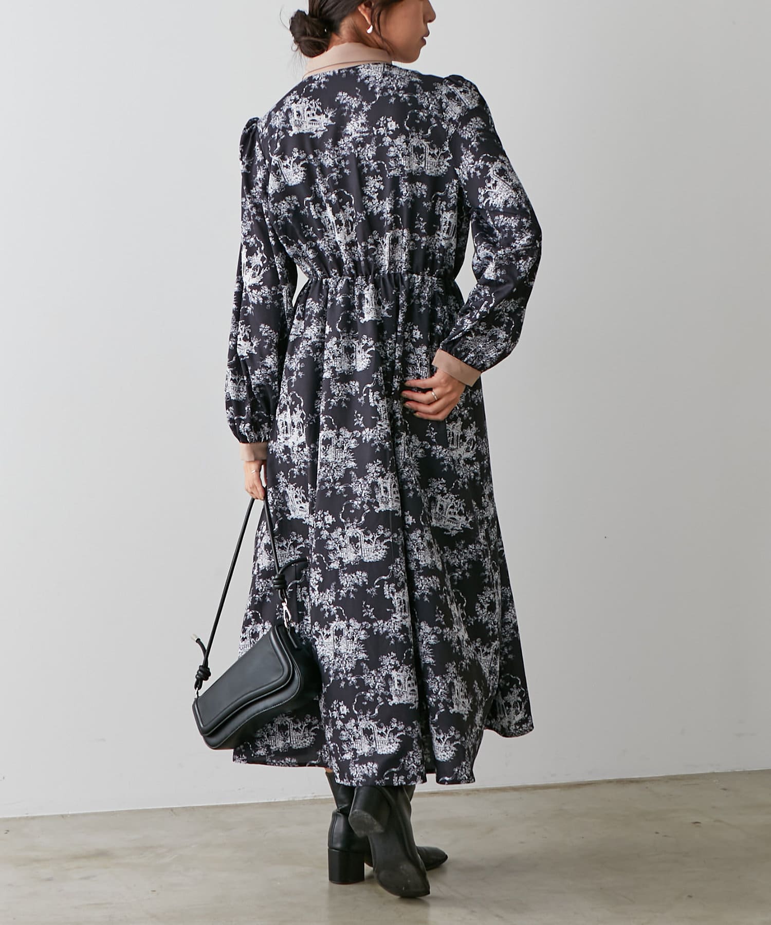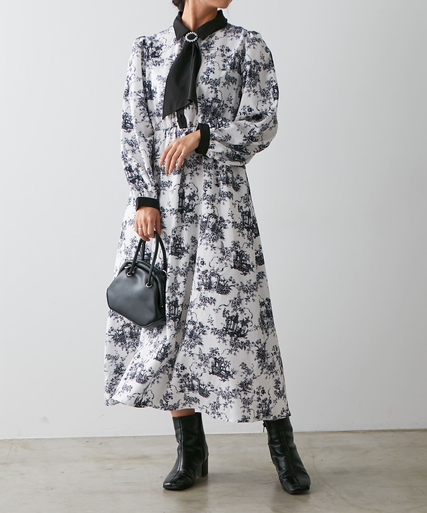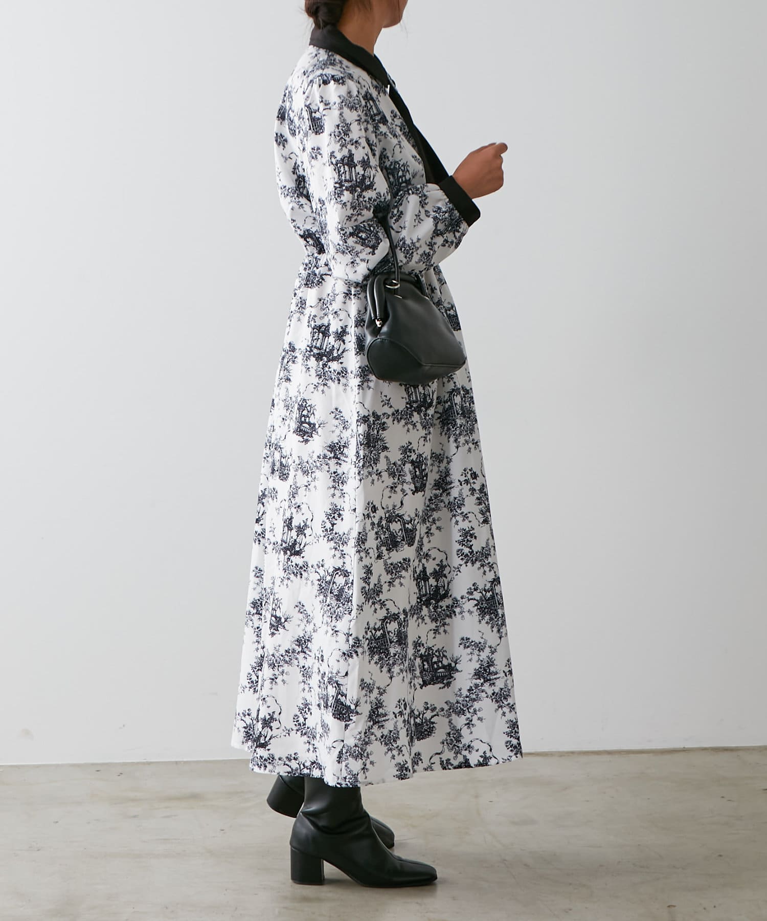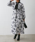 ・華やかなトワルドジュイ柄が女性らしい印象のワンピース。