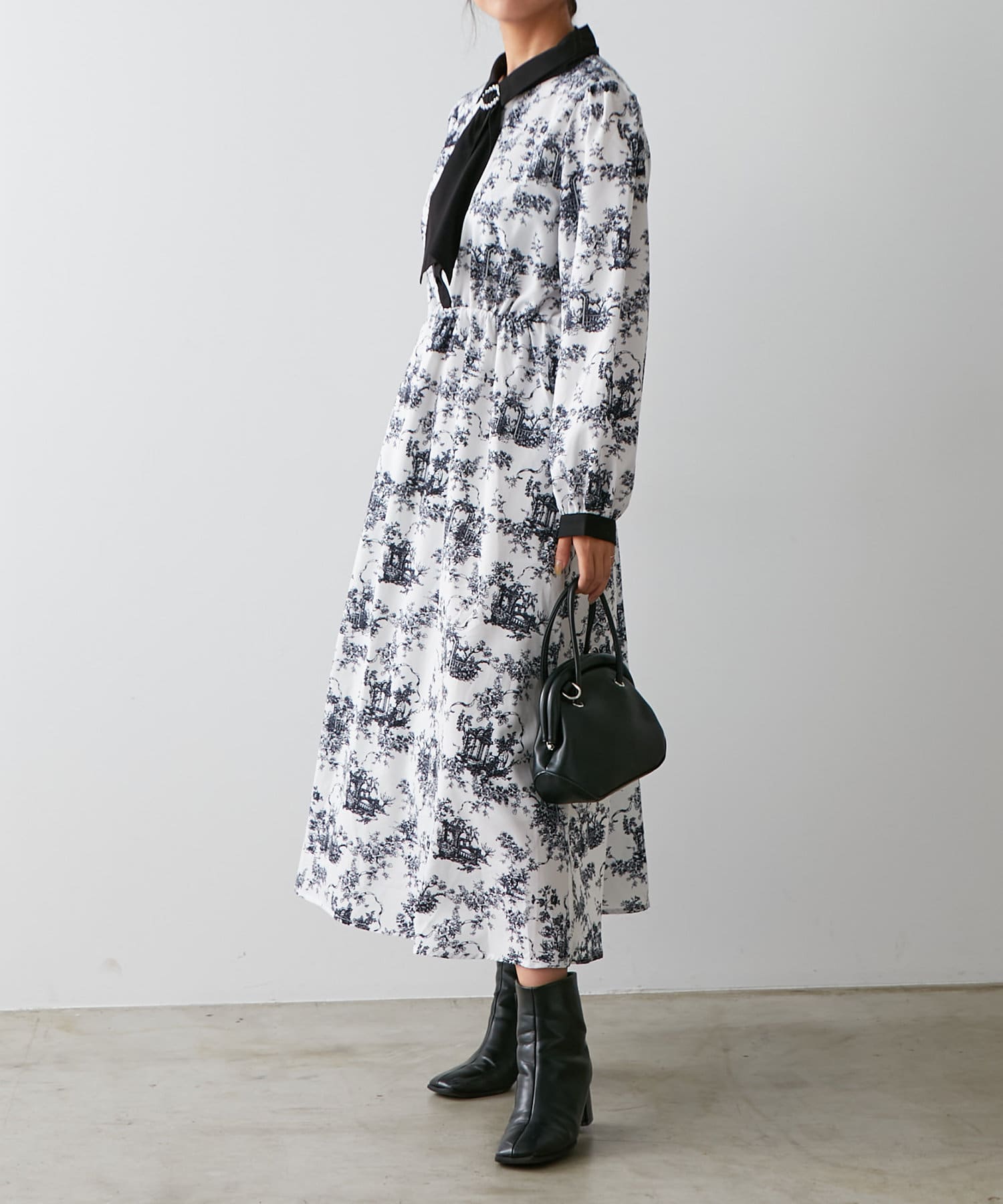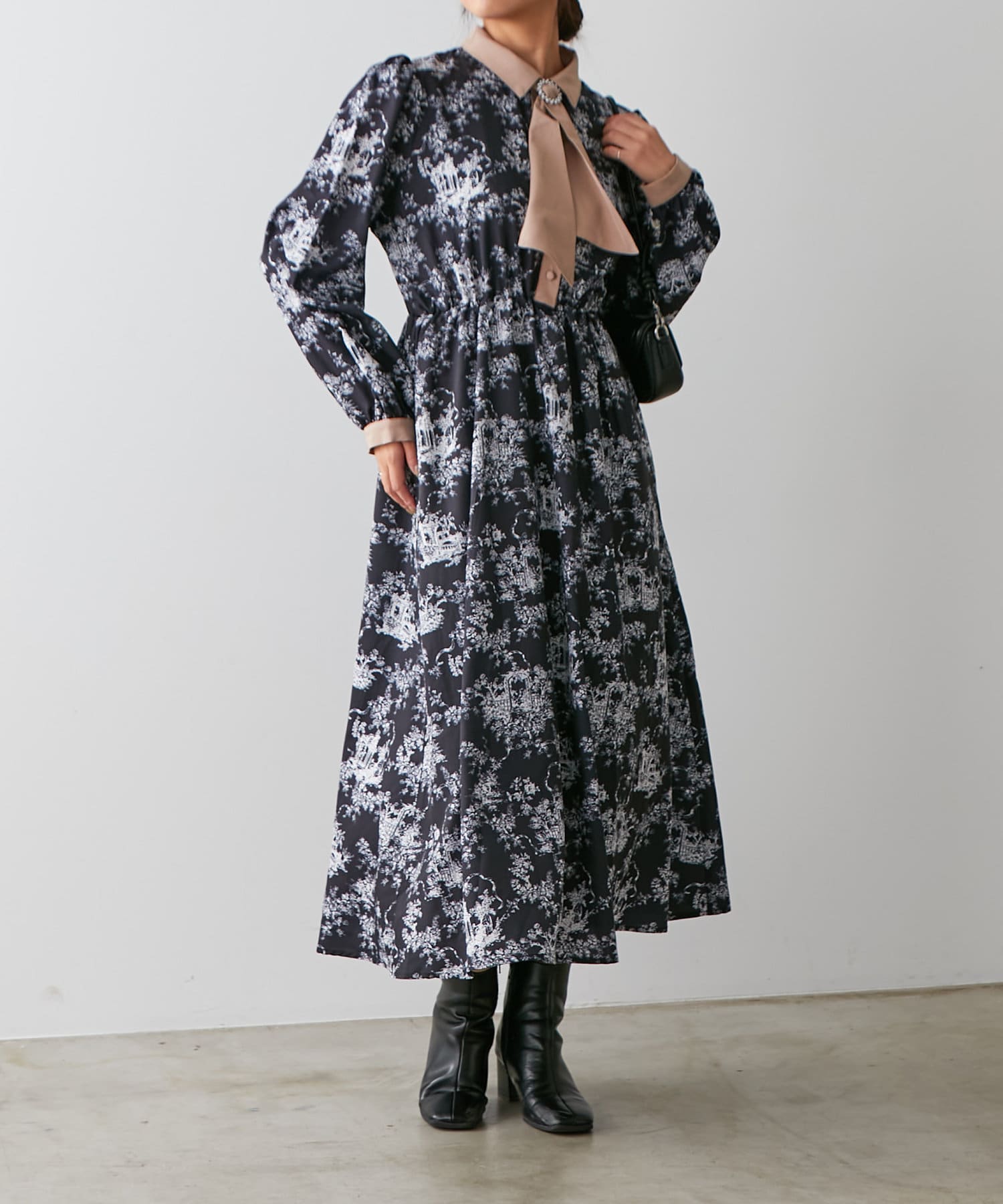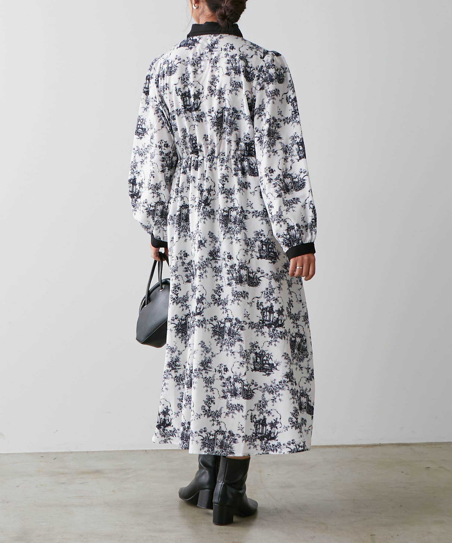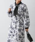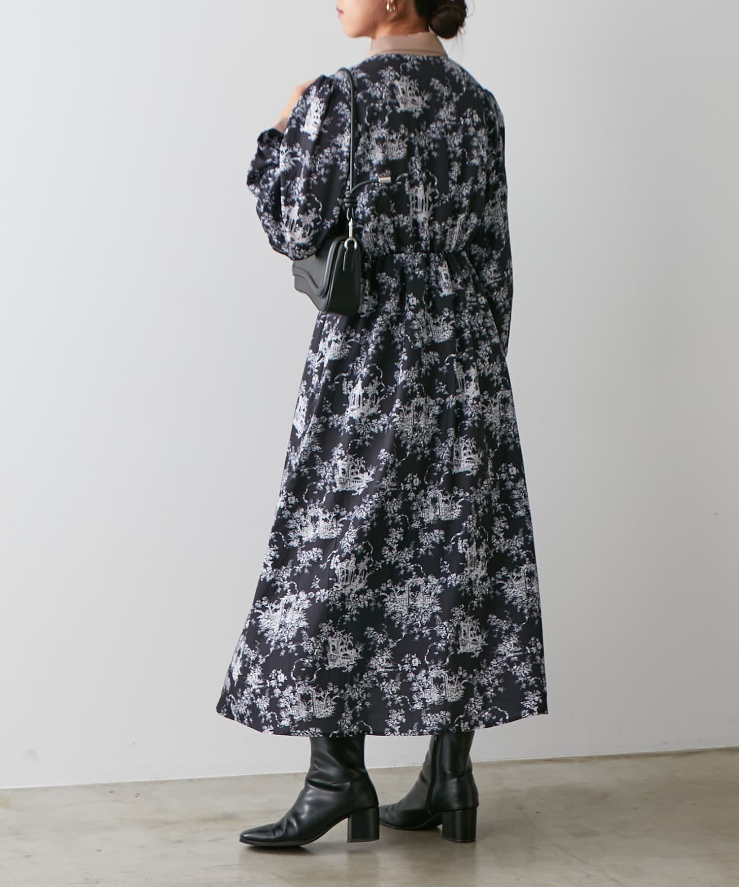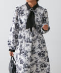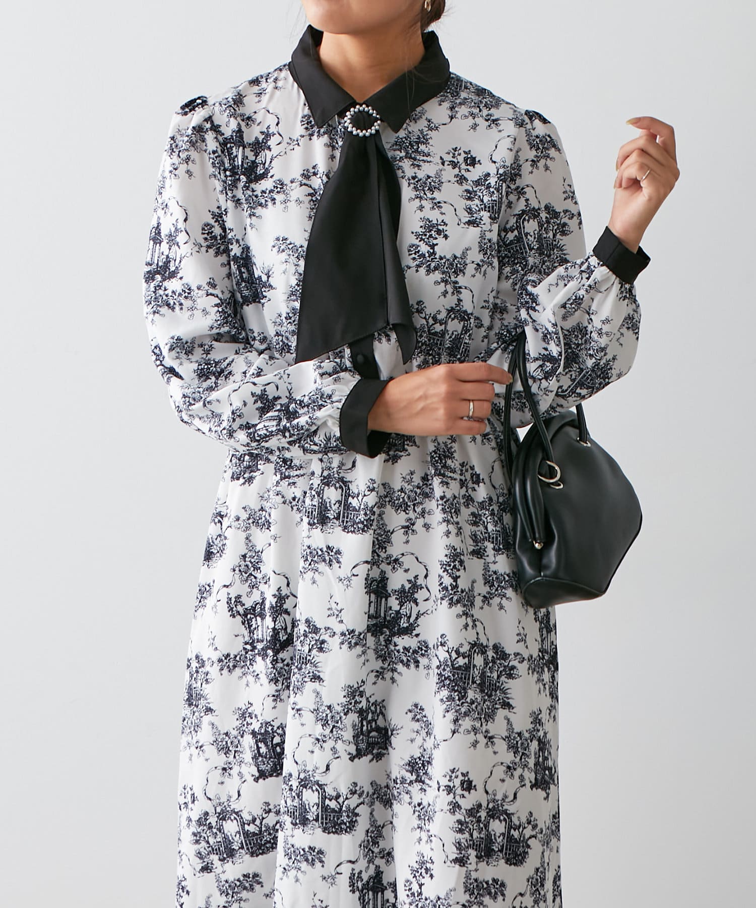・華やかなトワルドジュイ柄が女性らしい印象のワンピース。