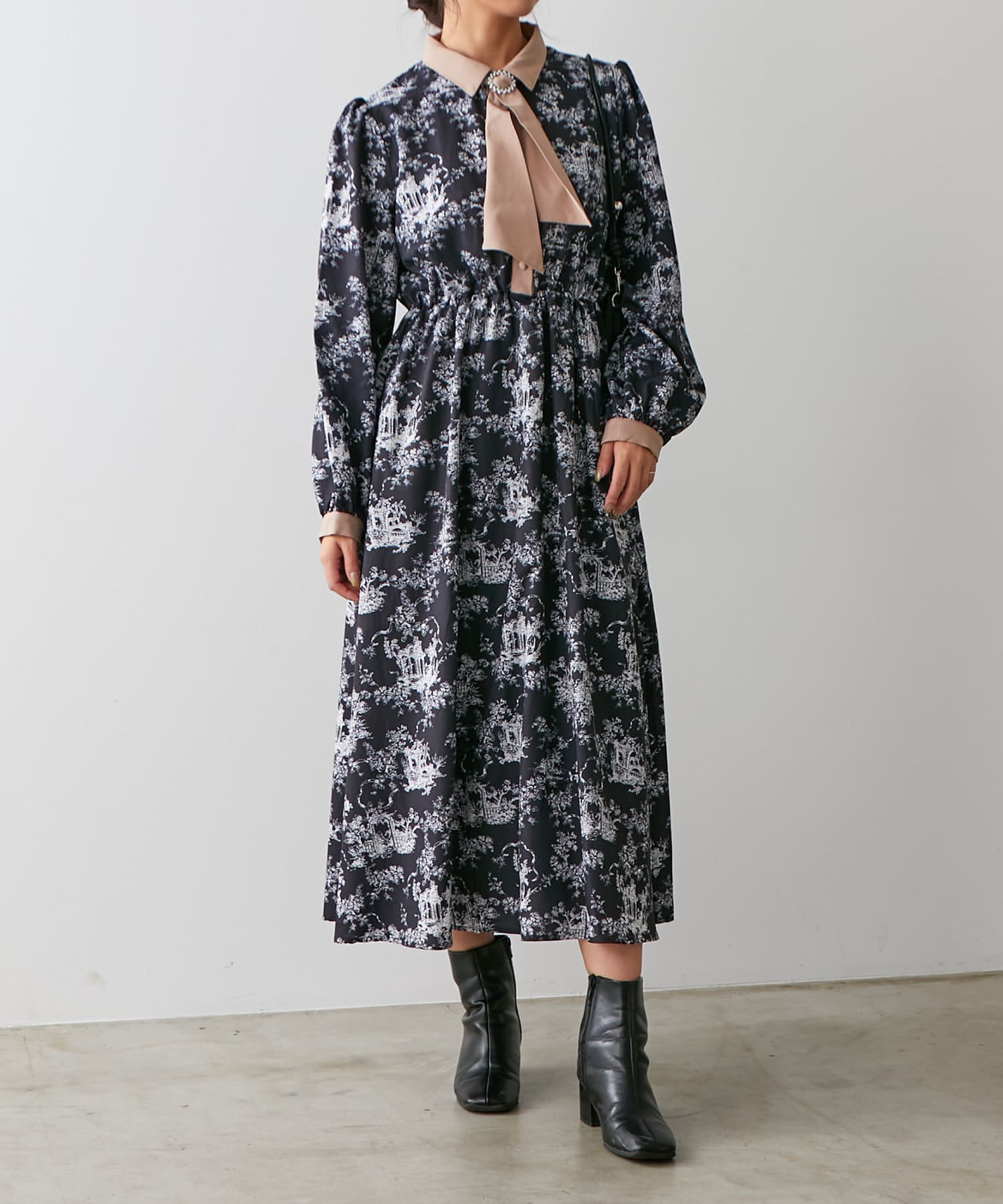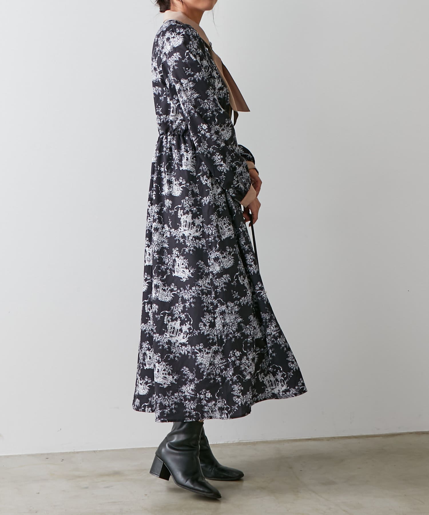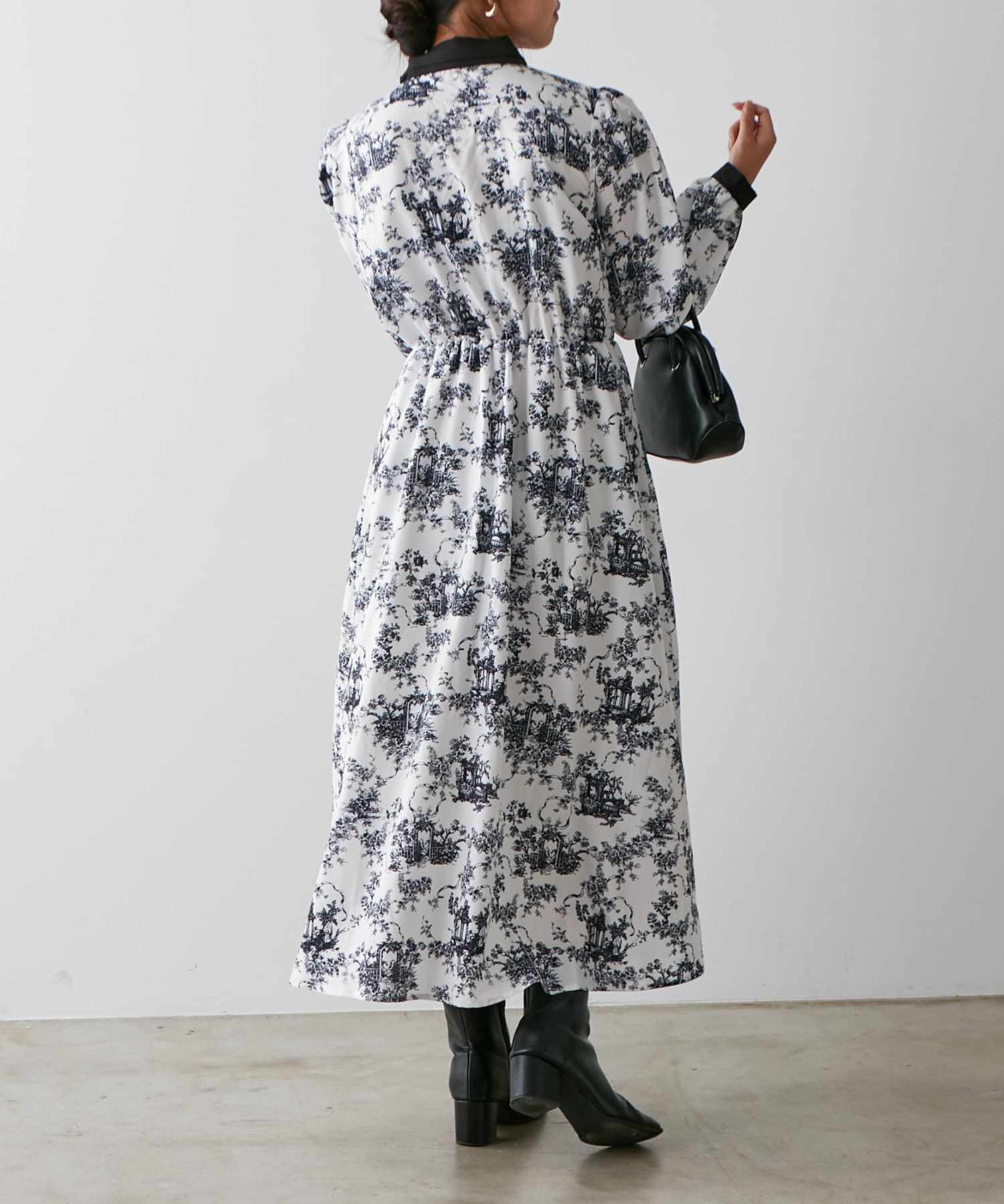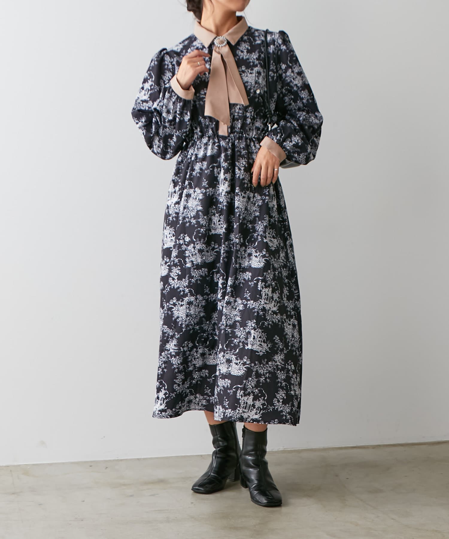 ・華やかなトワルドジュイ柄が女性らしい印象のワンピース。