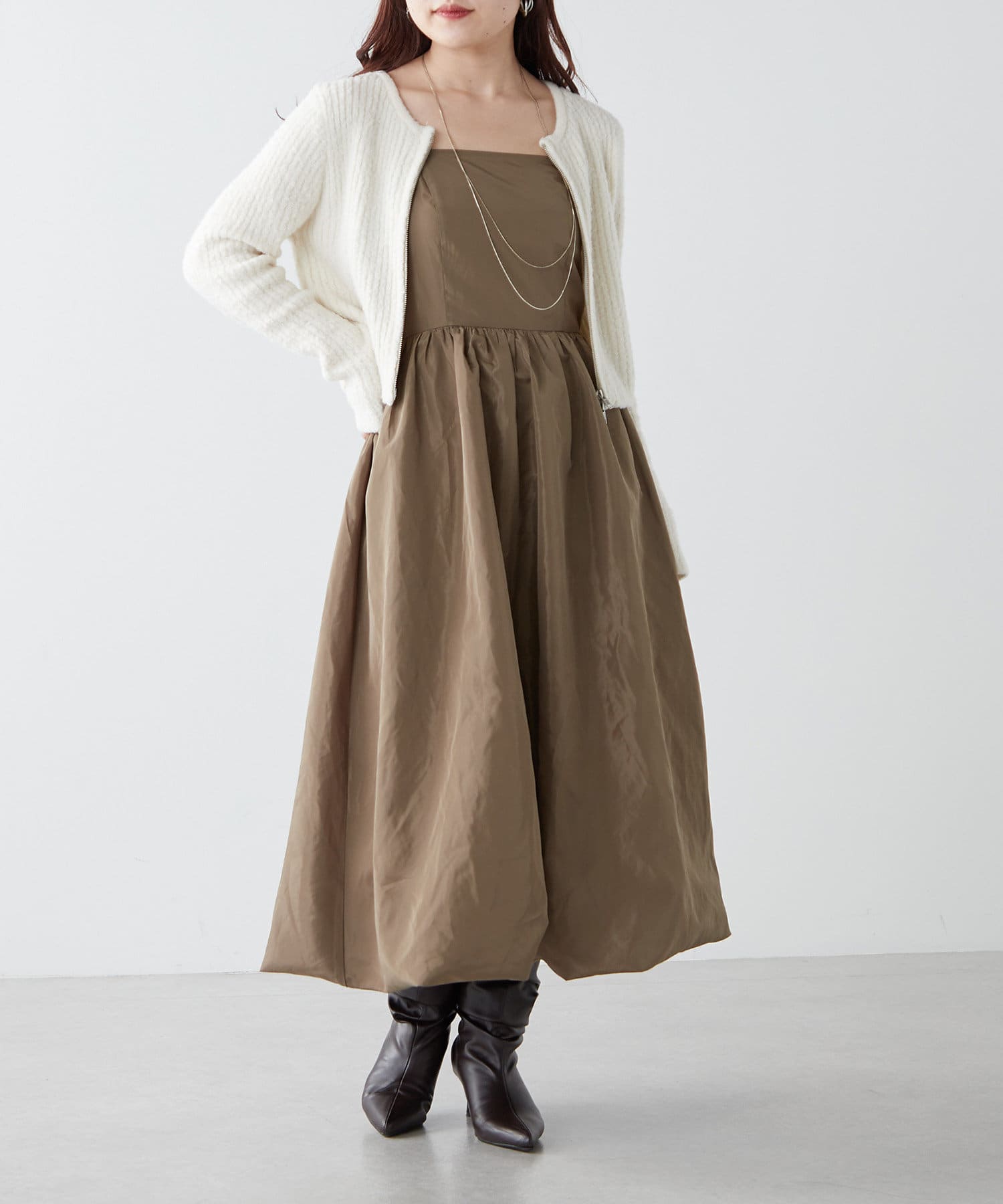 ・カーディガンを上に羽織ってこなれ感を演出
