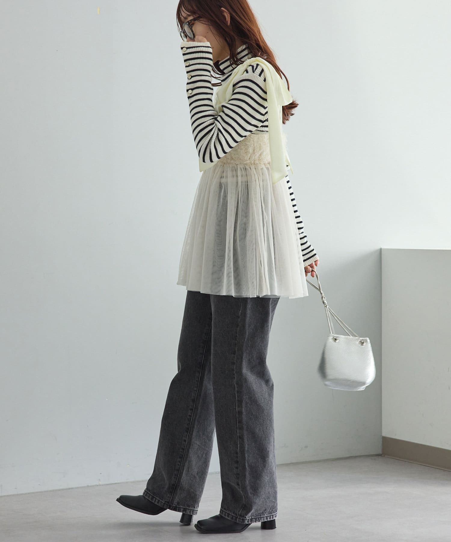 ・デニムパンツやスラックスなどのパンツスタイルにも。