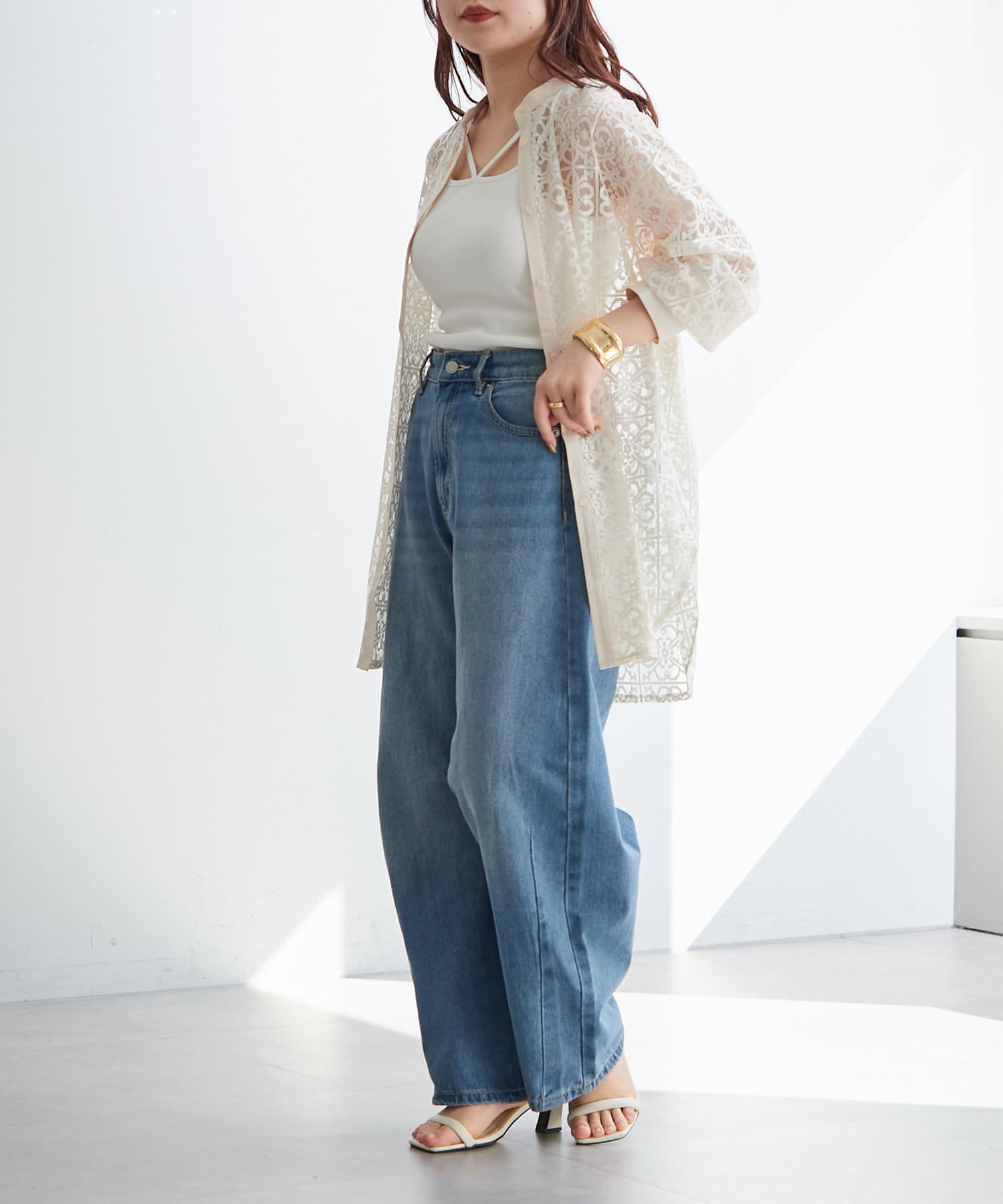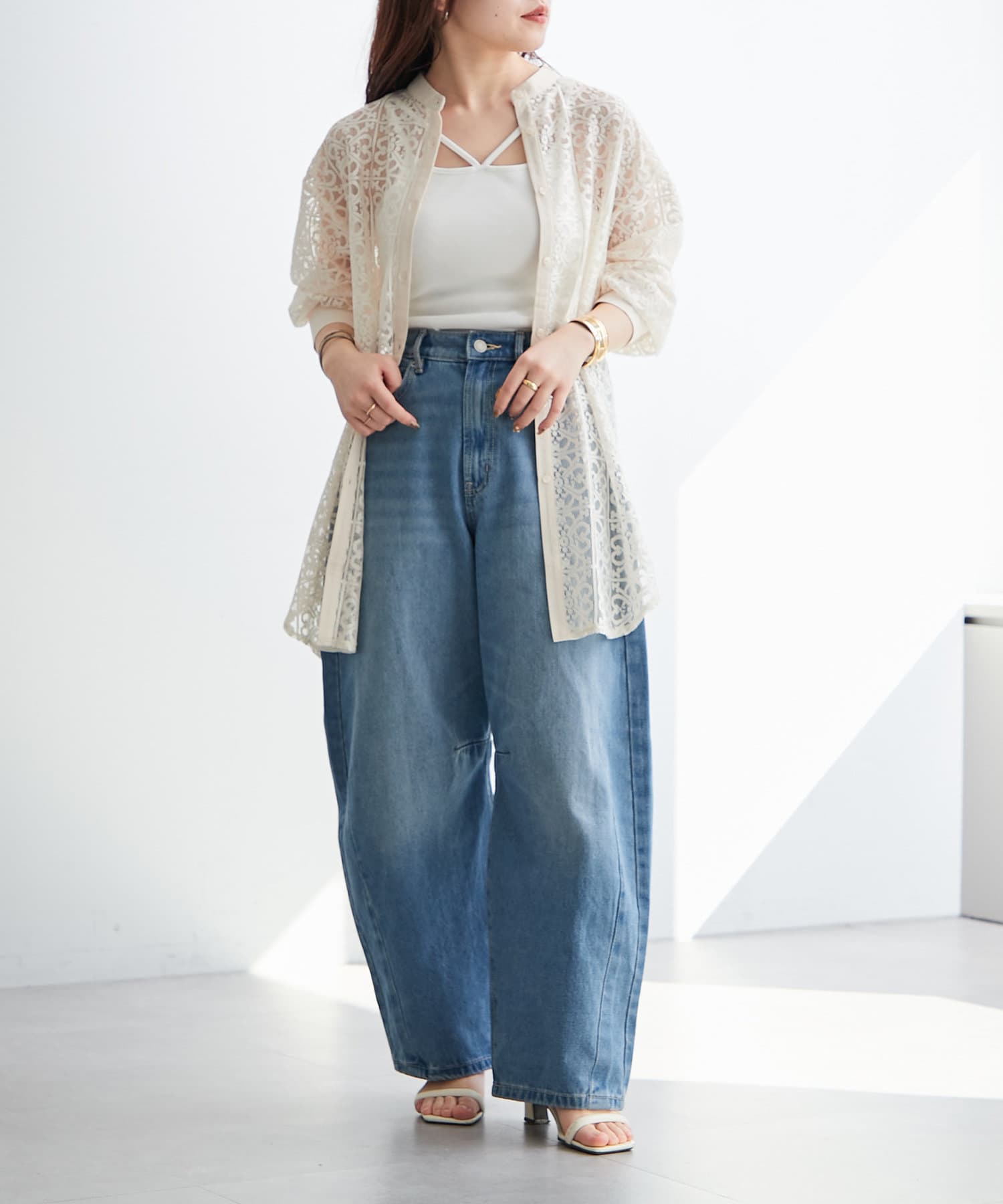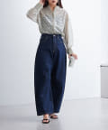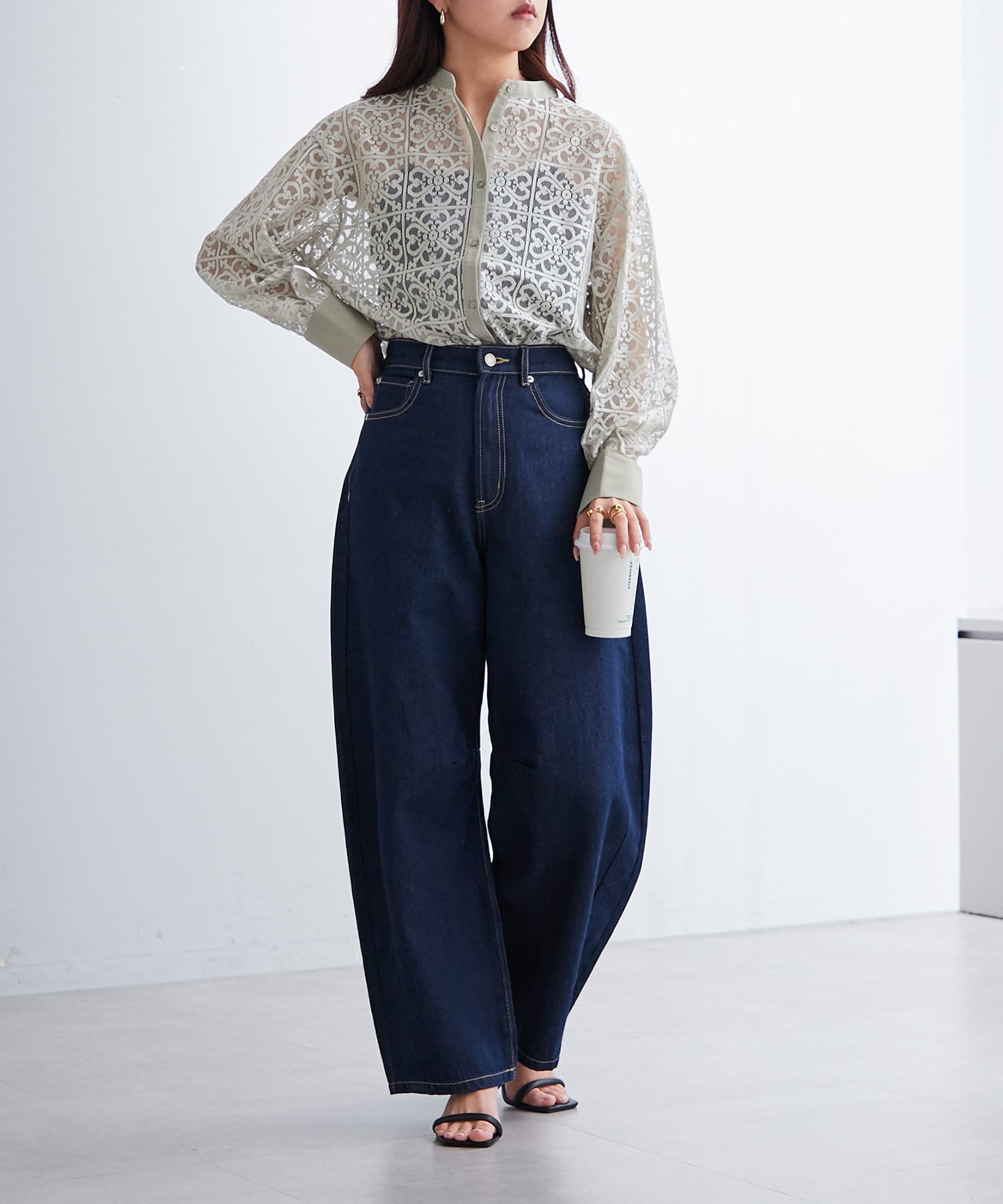 ・ボタンを上部だけ閉めて、シルエットを楽しむスタイリングがオススメ