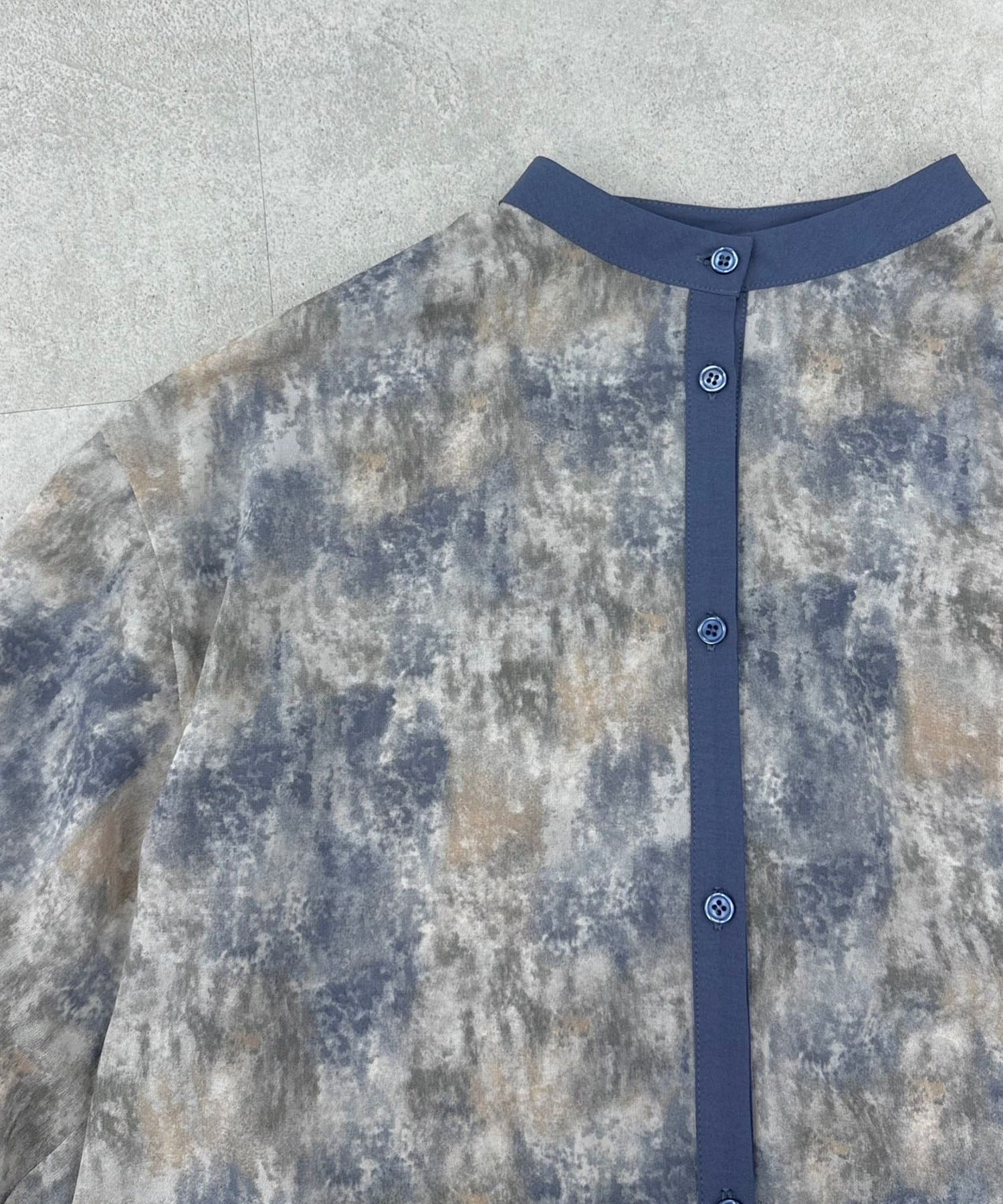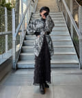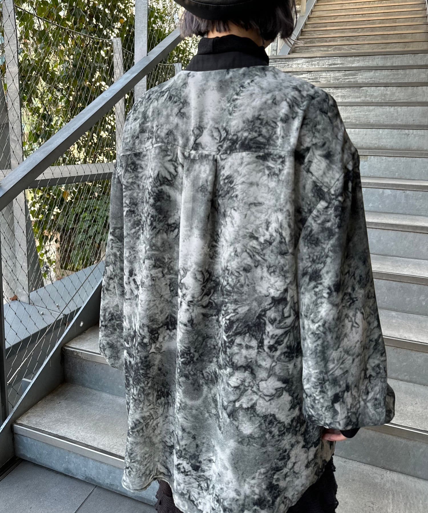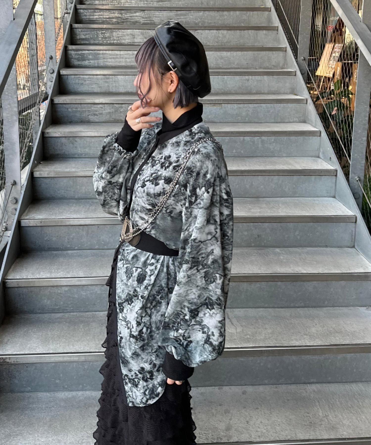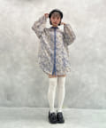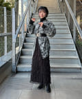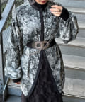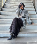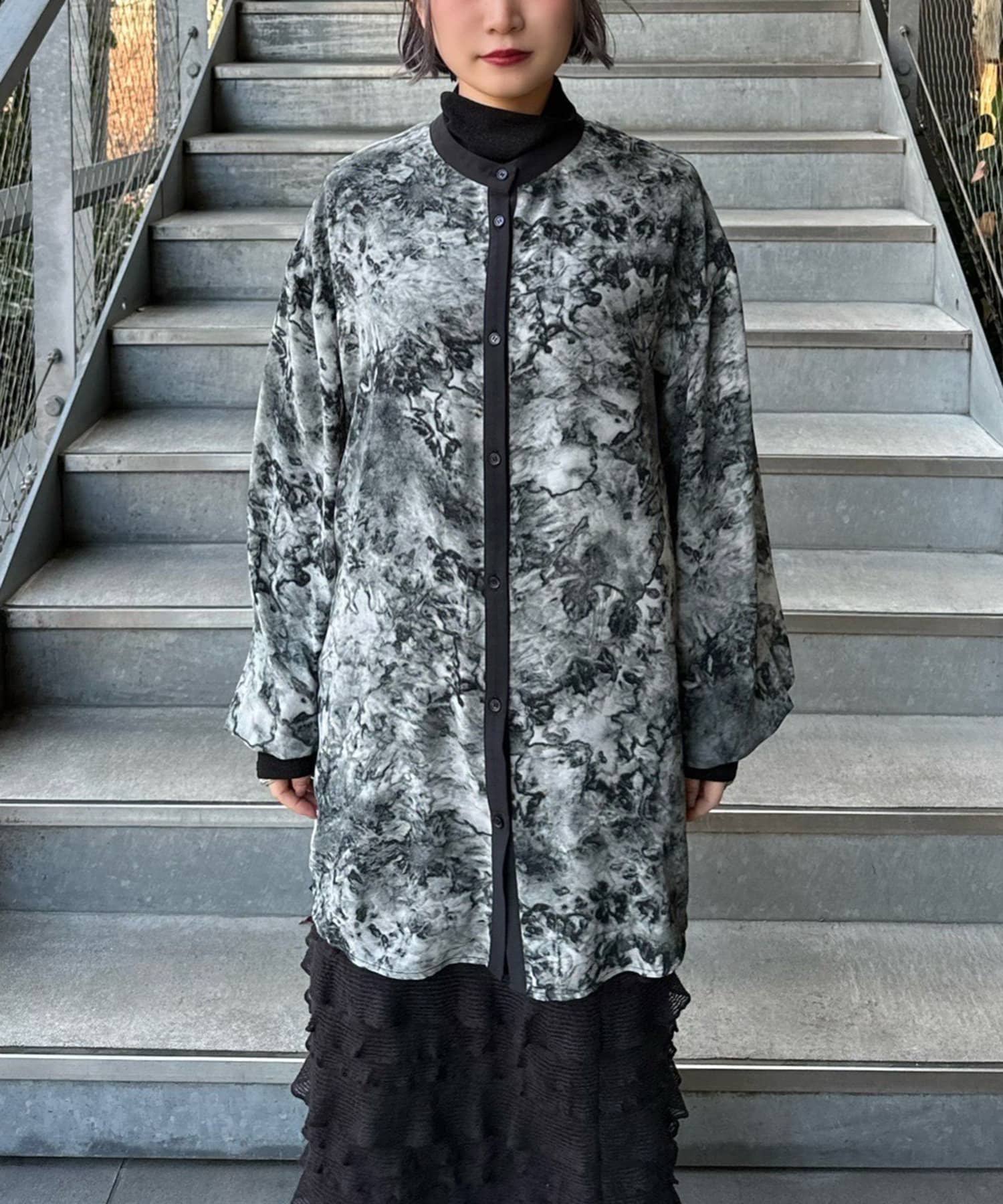 ・こんらしさのあるニュアンス柄とスタンドカラーのシルエットで上品な印象をプラス。