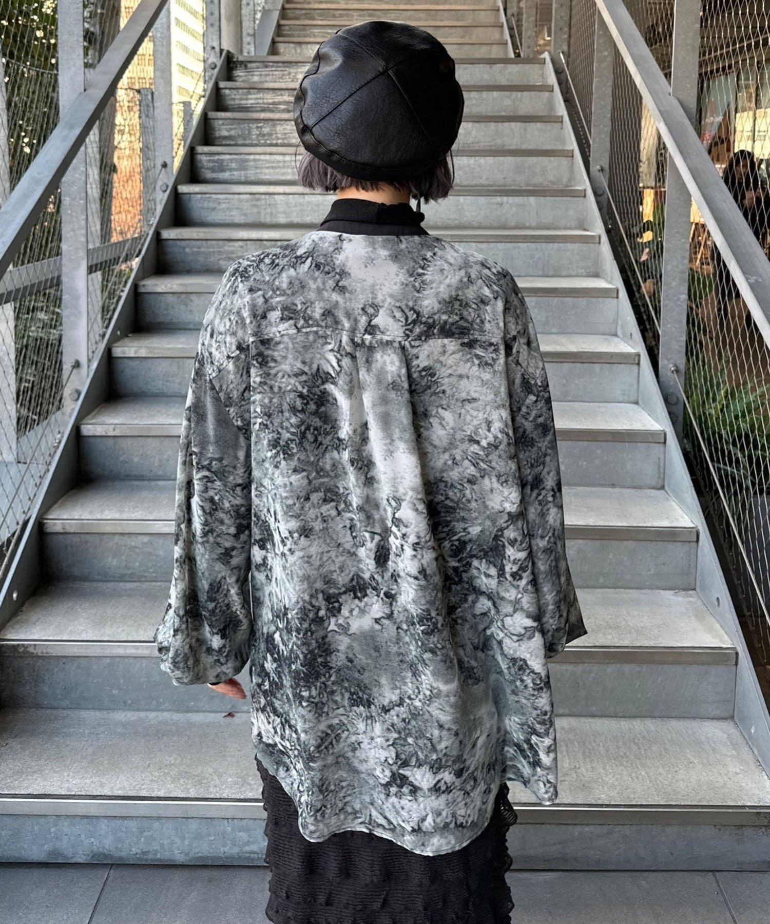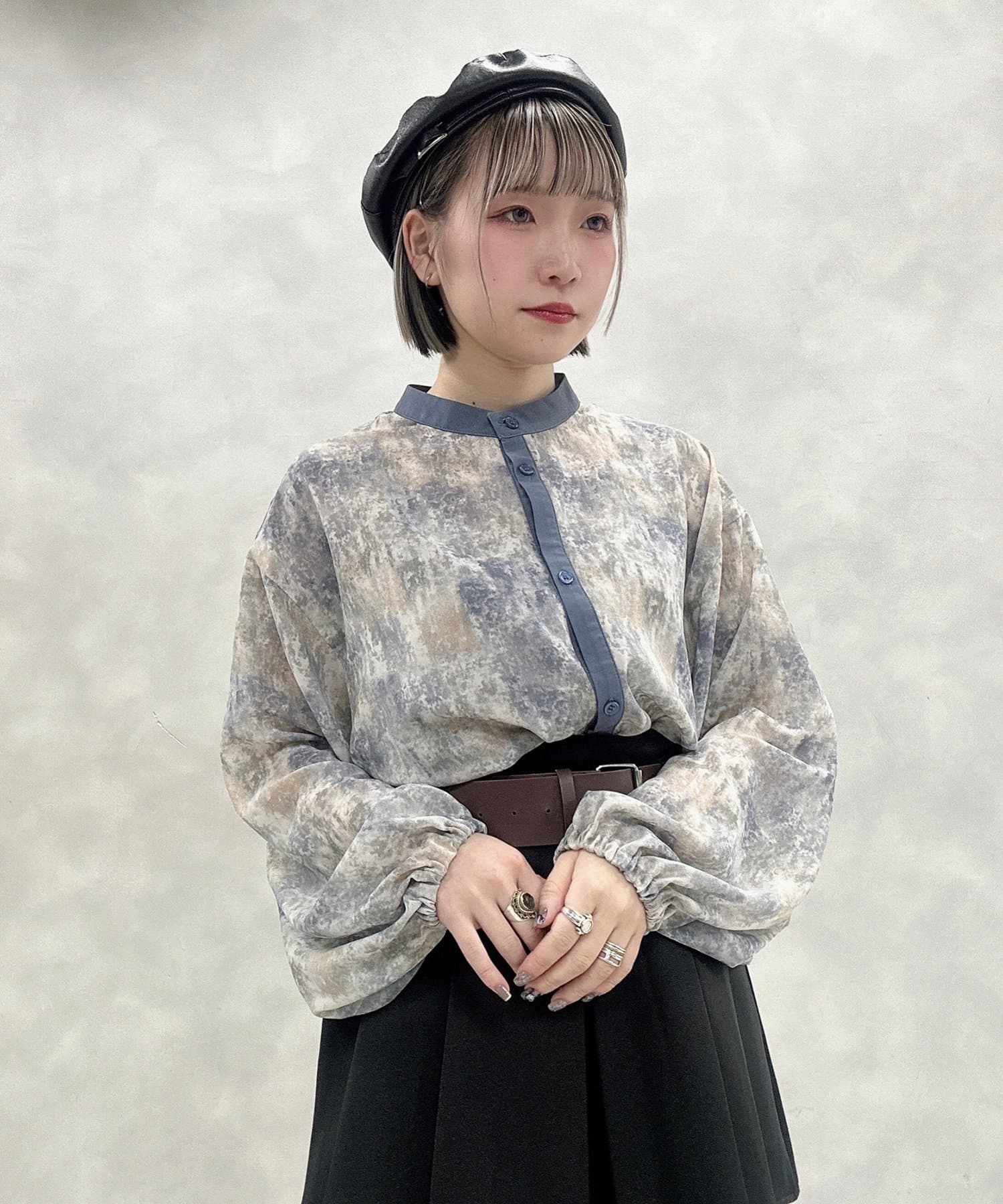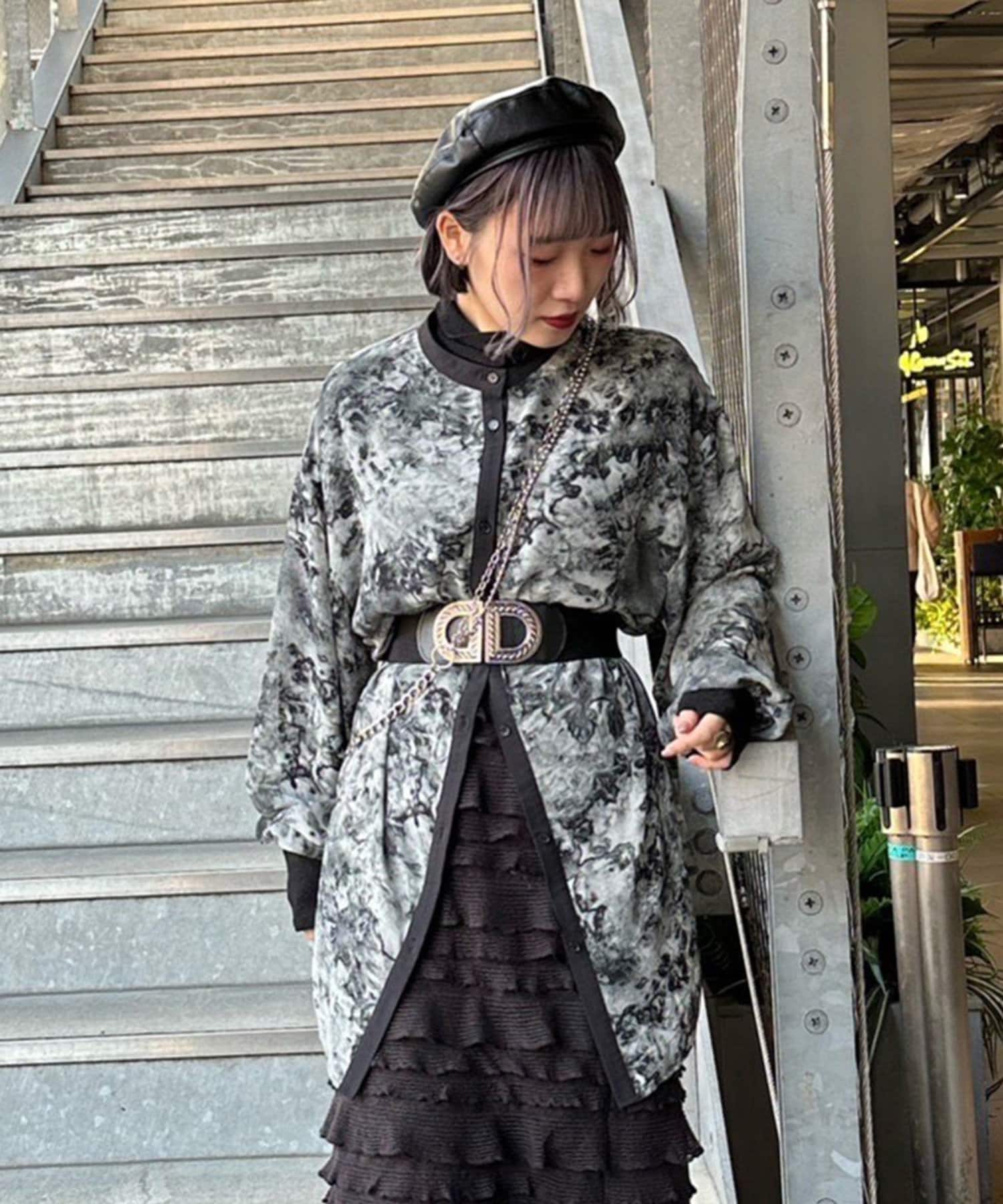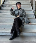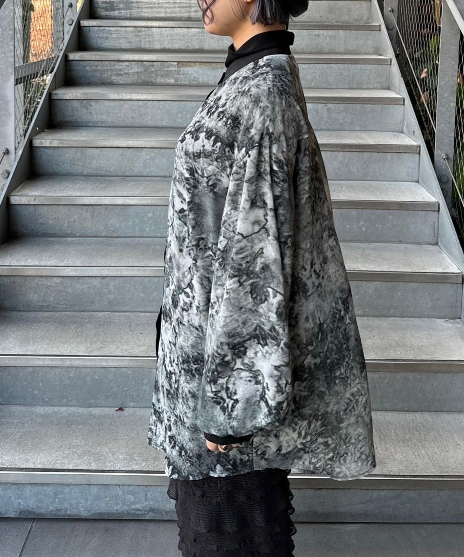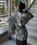 ・こんらしさのあるニュアンス柄とスタンドカラーのシルエットで上品な印象をプラス。