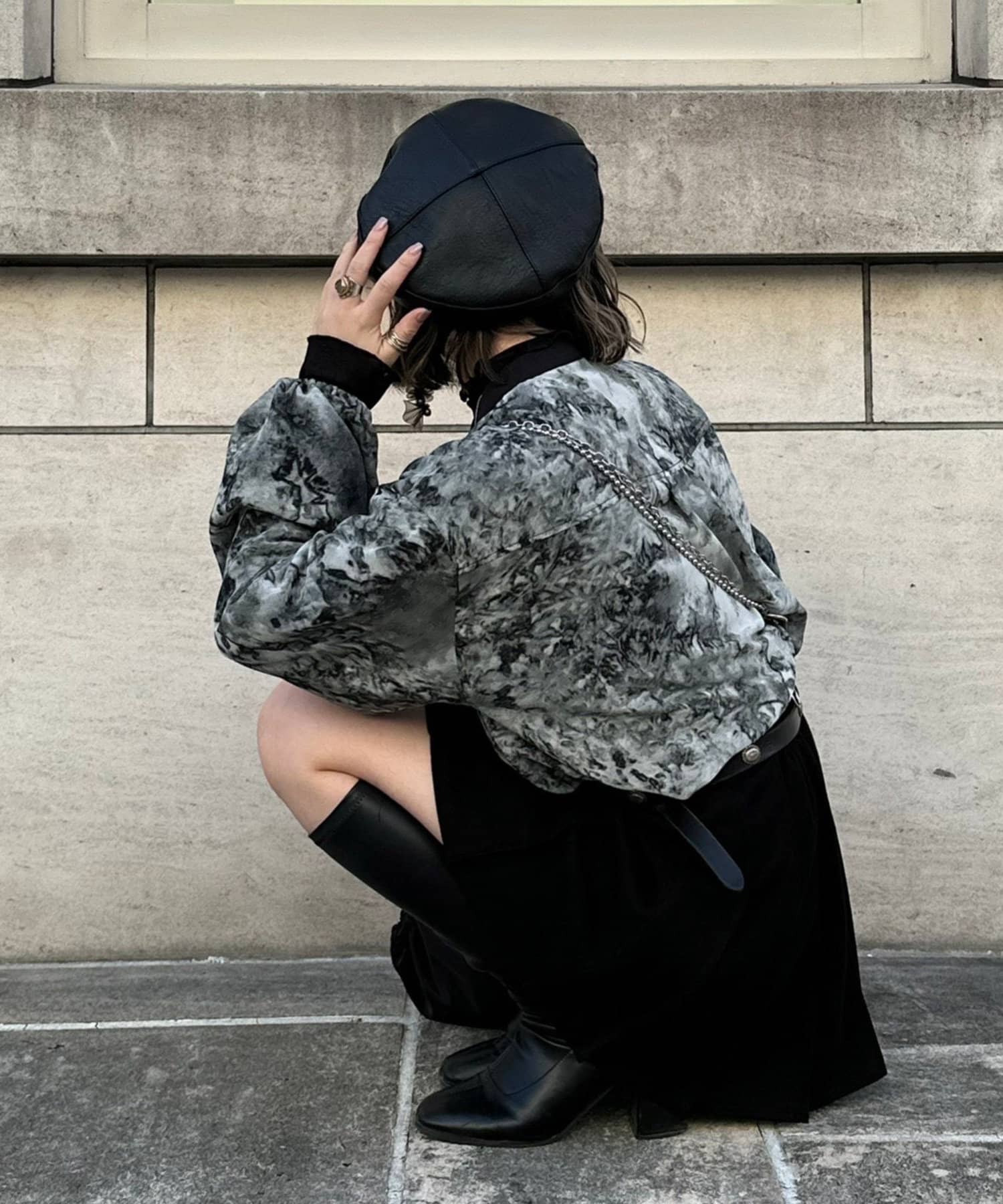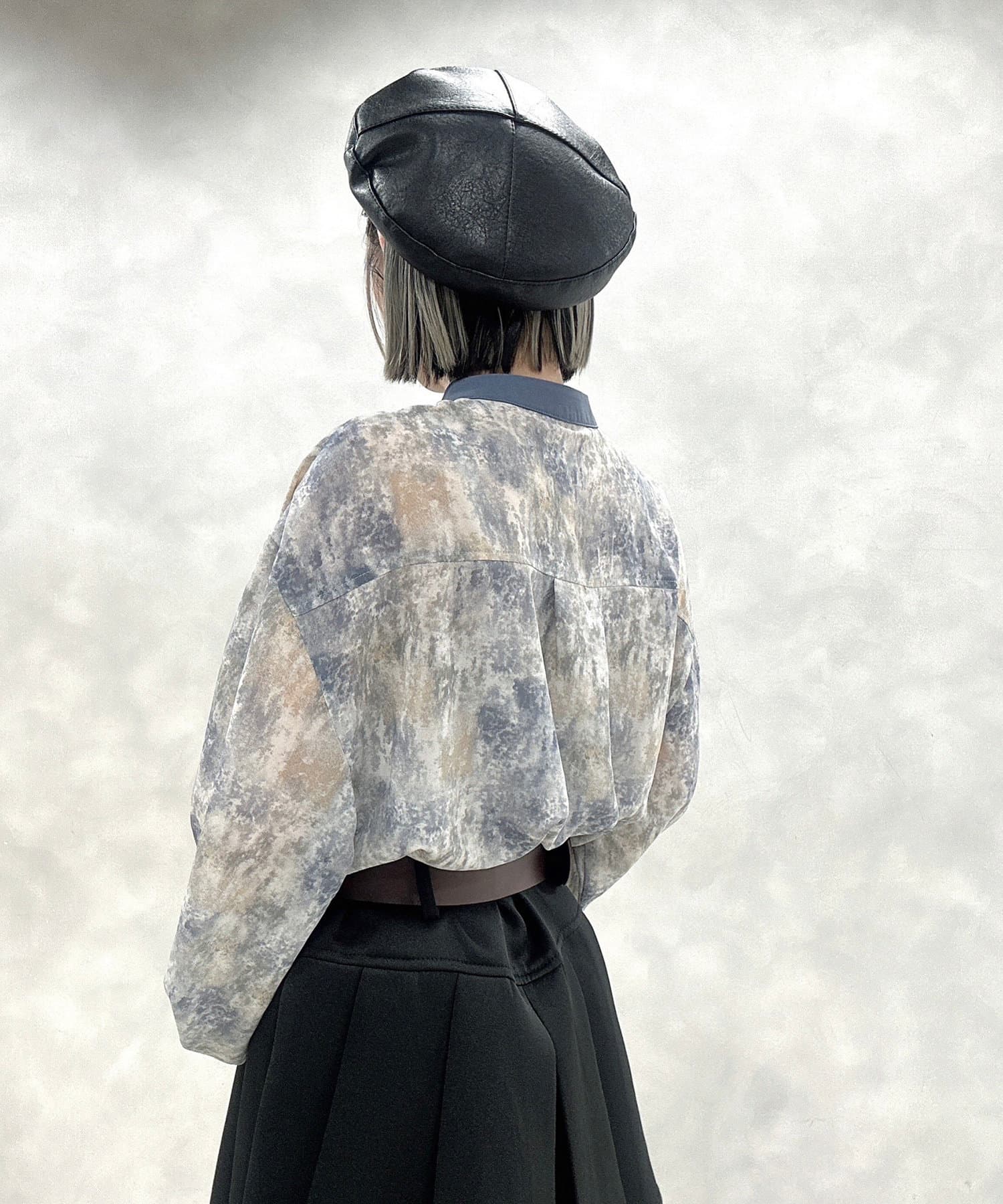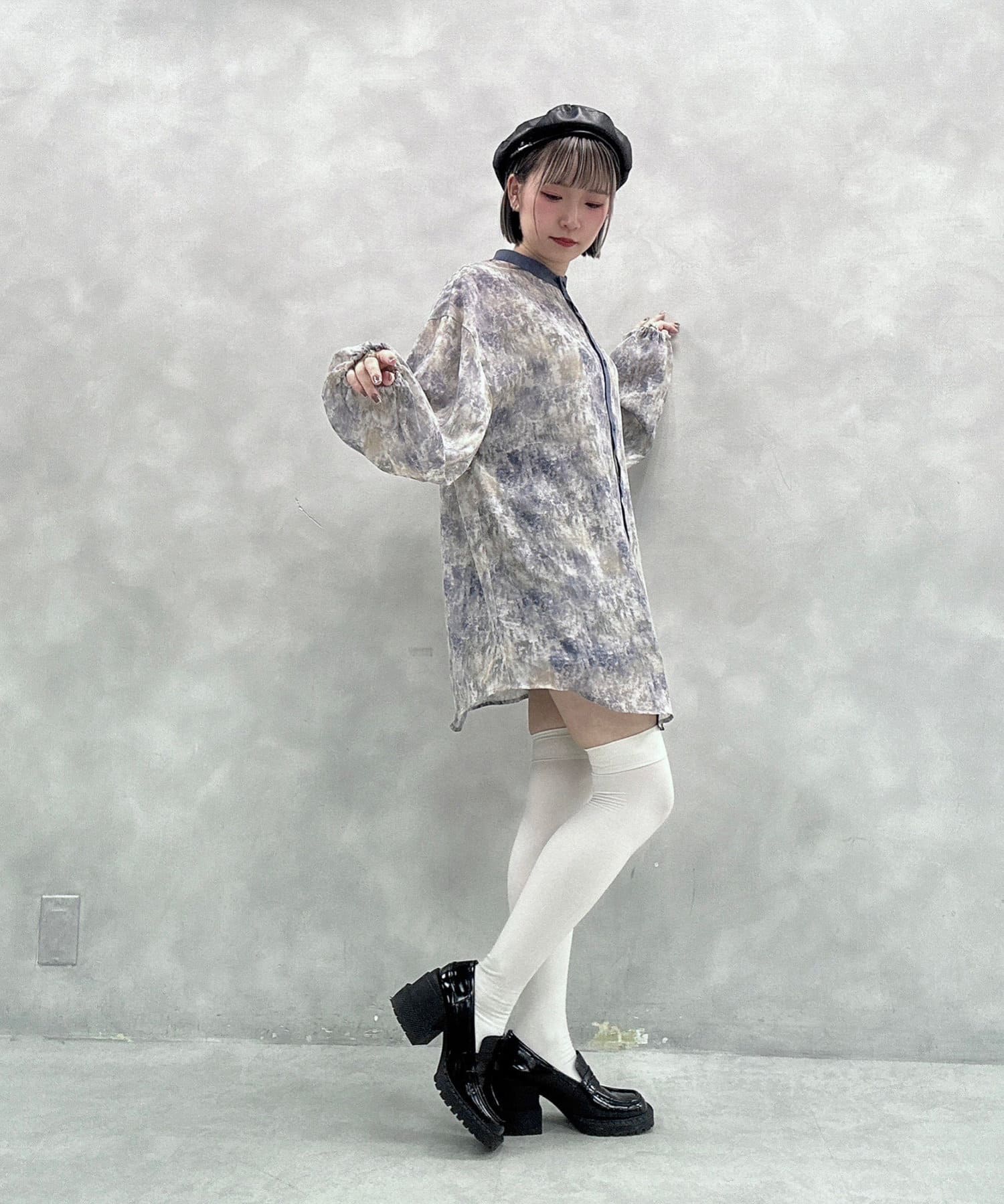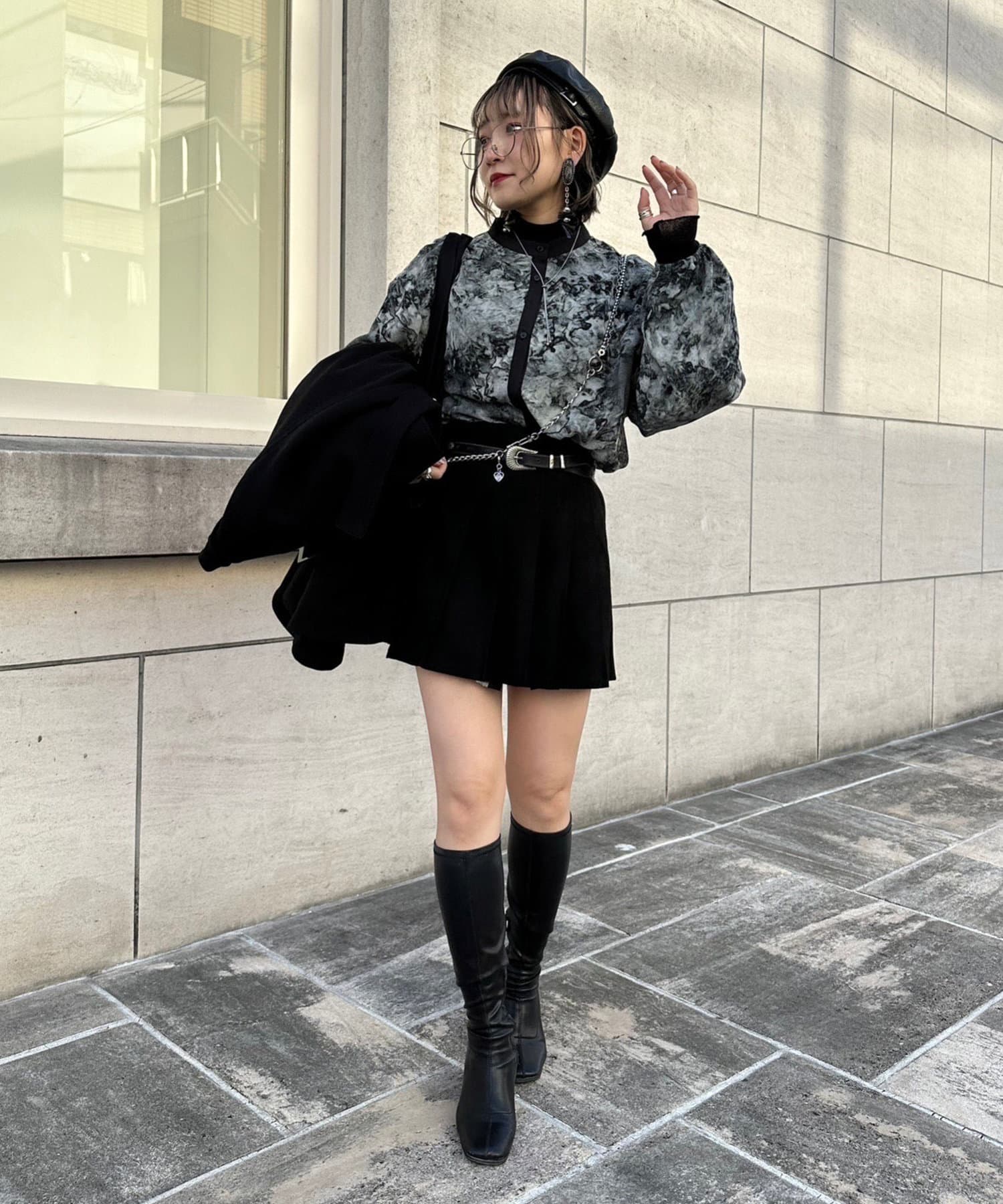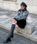 ・こんらしさのあるニュアンス柄とスタンドカラーのシルエットで上品な印象をプラス。