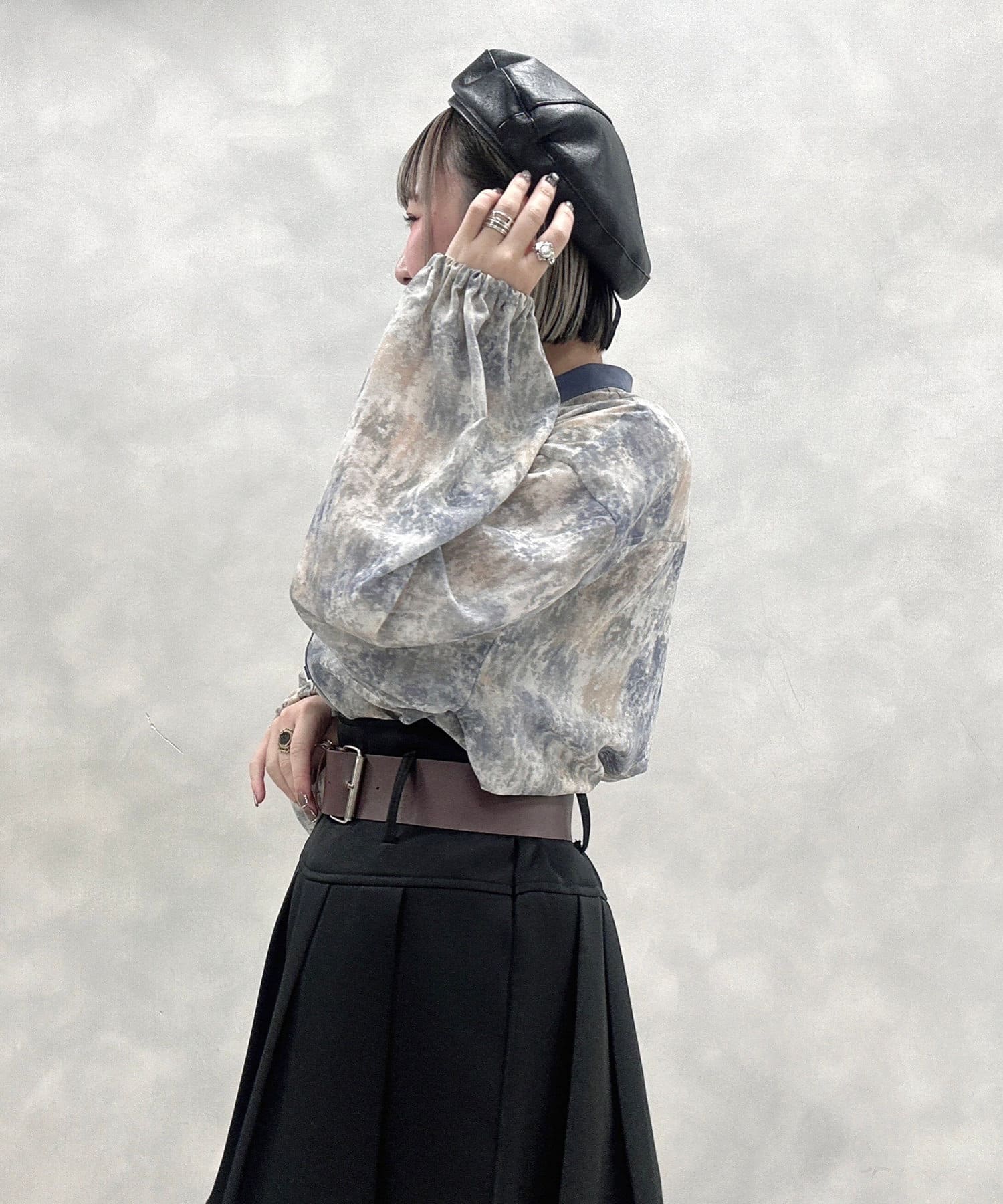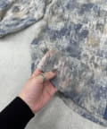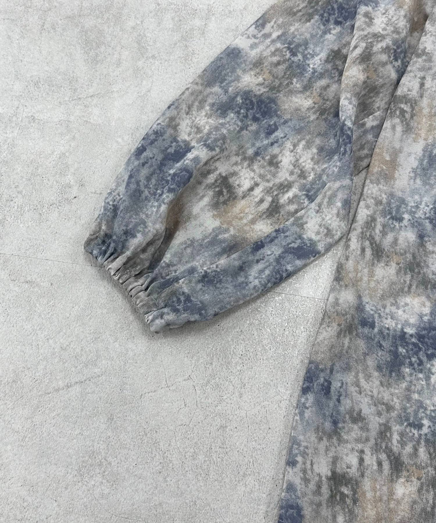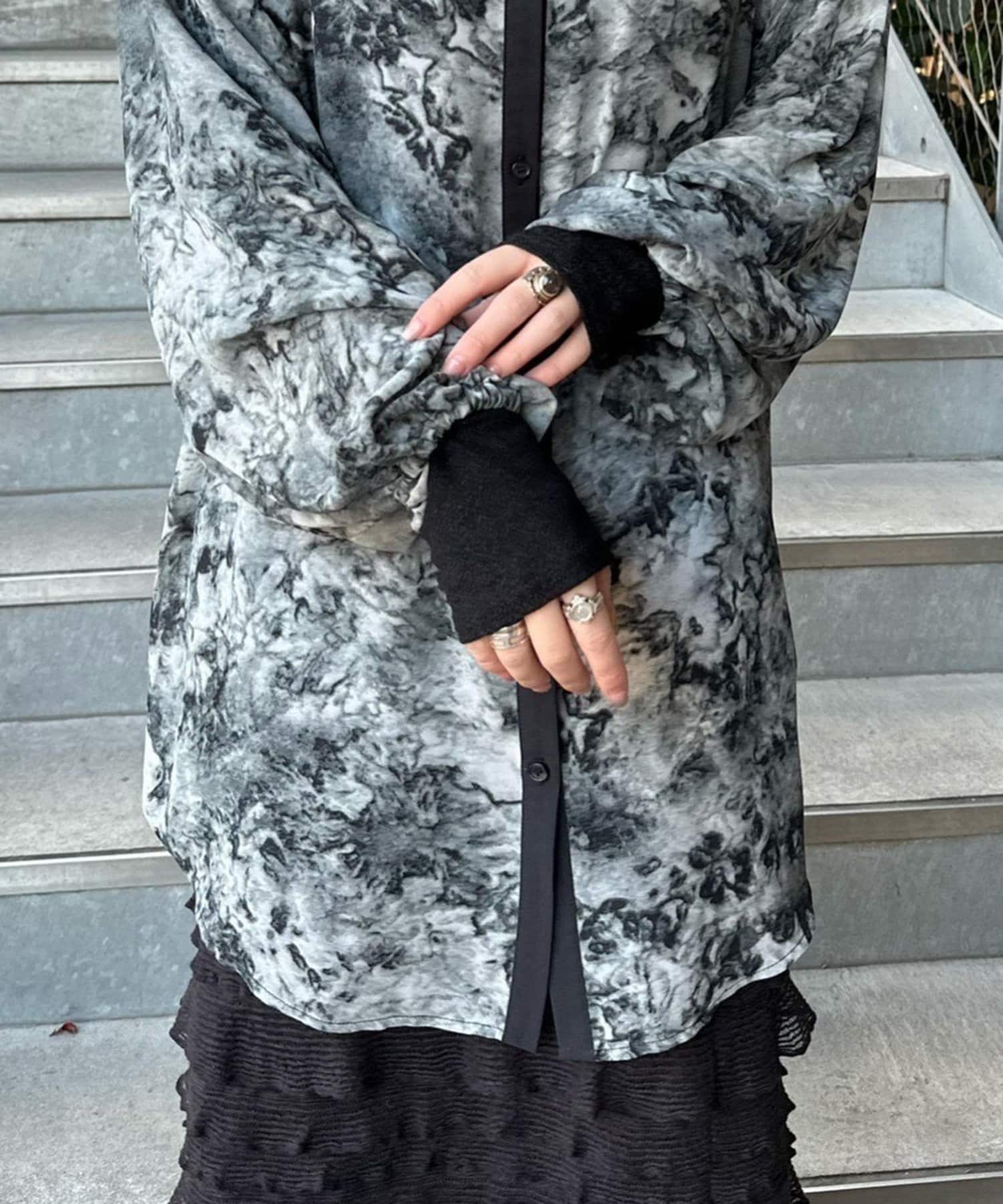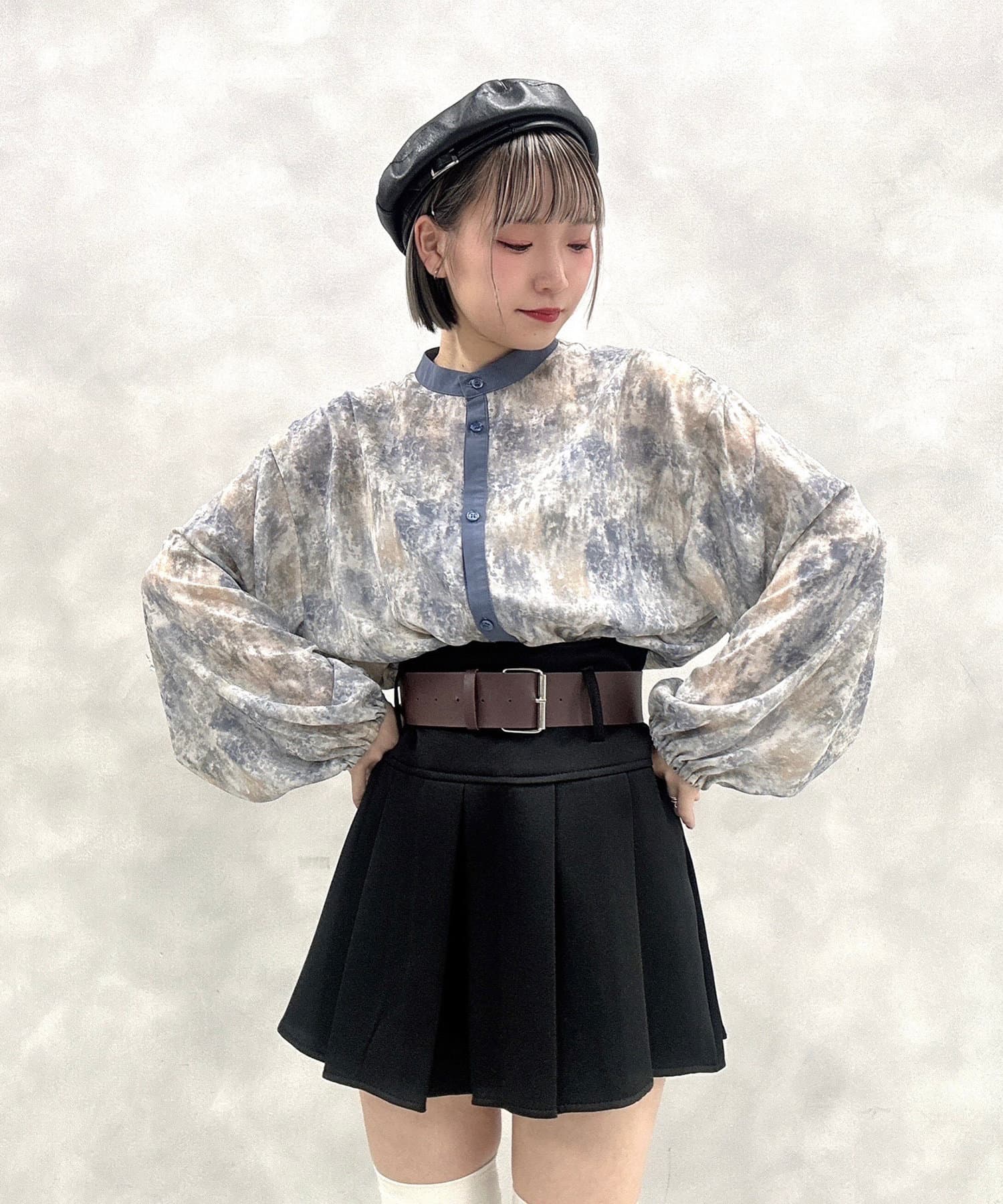 ・こんらしさのあるニュアンス柄とスタンドカラーのシルエットで上品な印象をプラス。