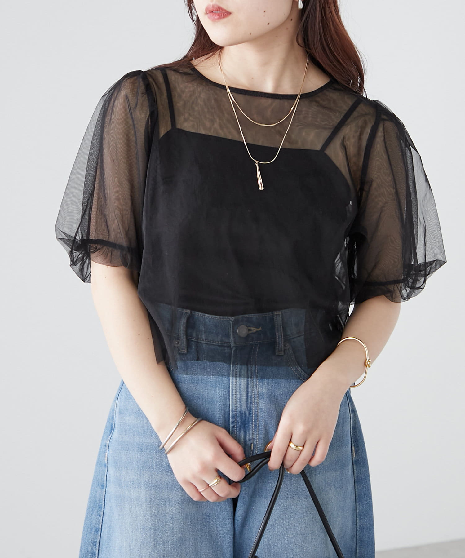 ・パフスリーブのチュールトップスとキャミソールのセットアイテム