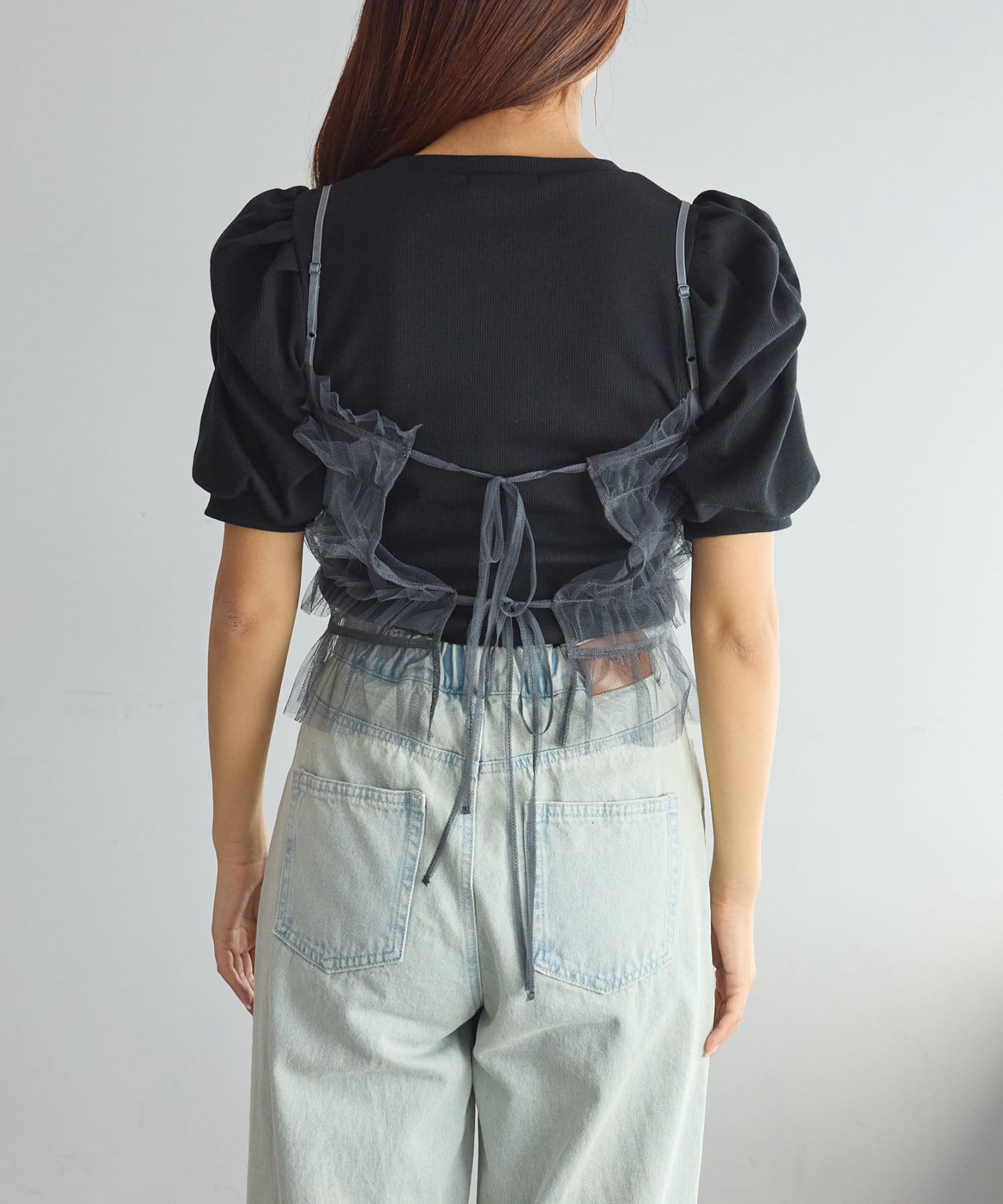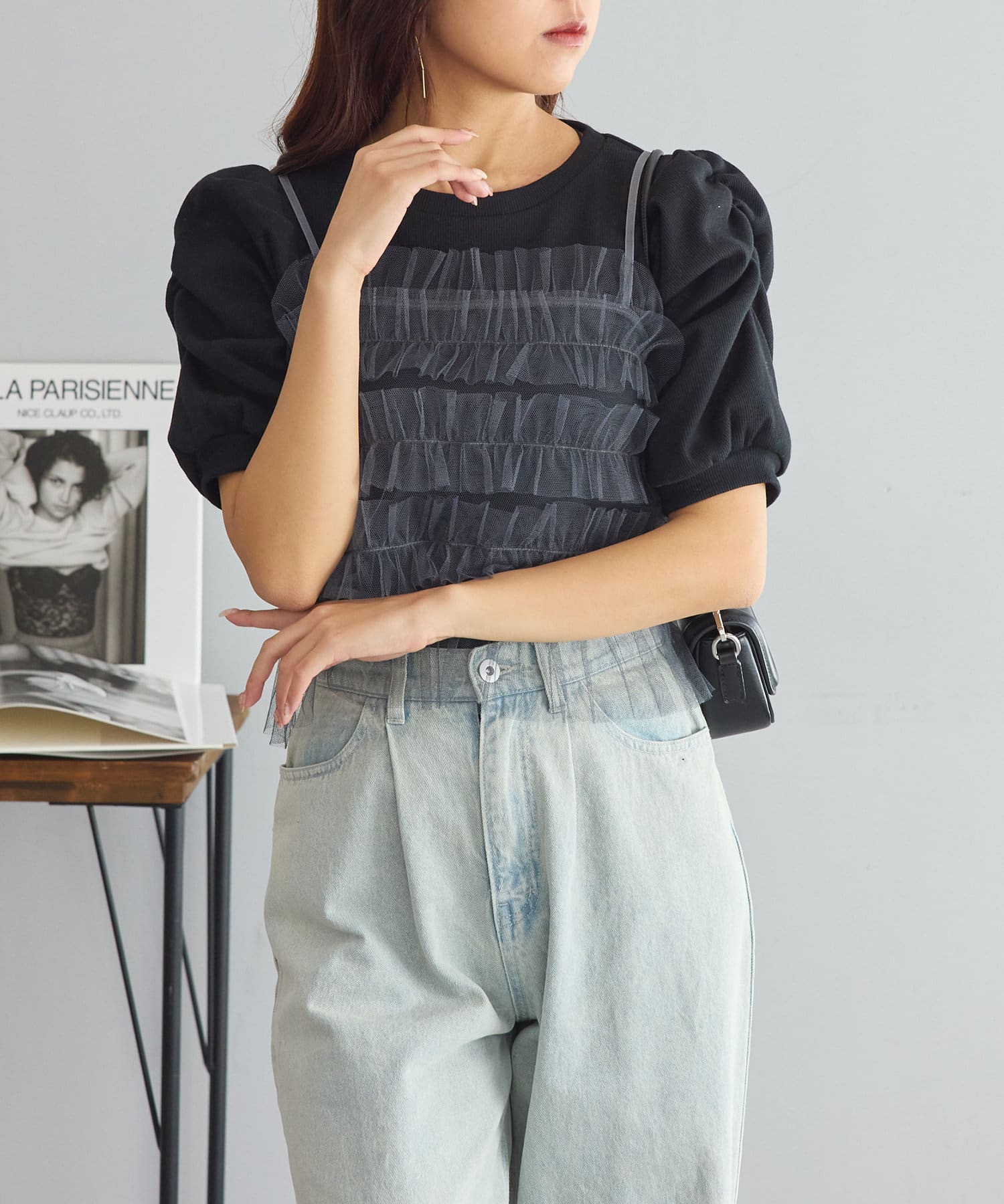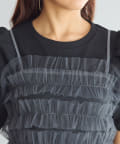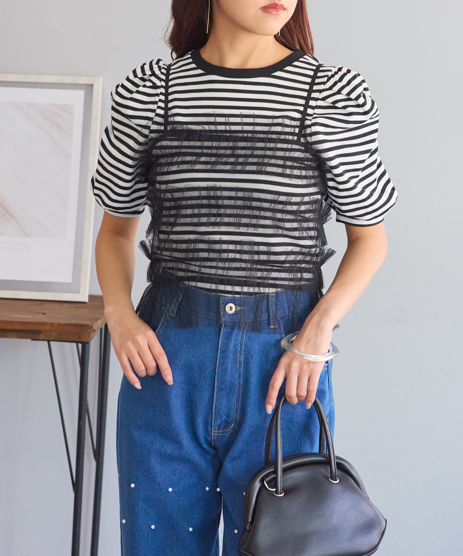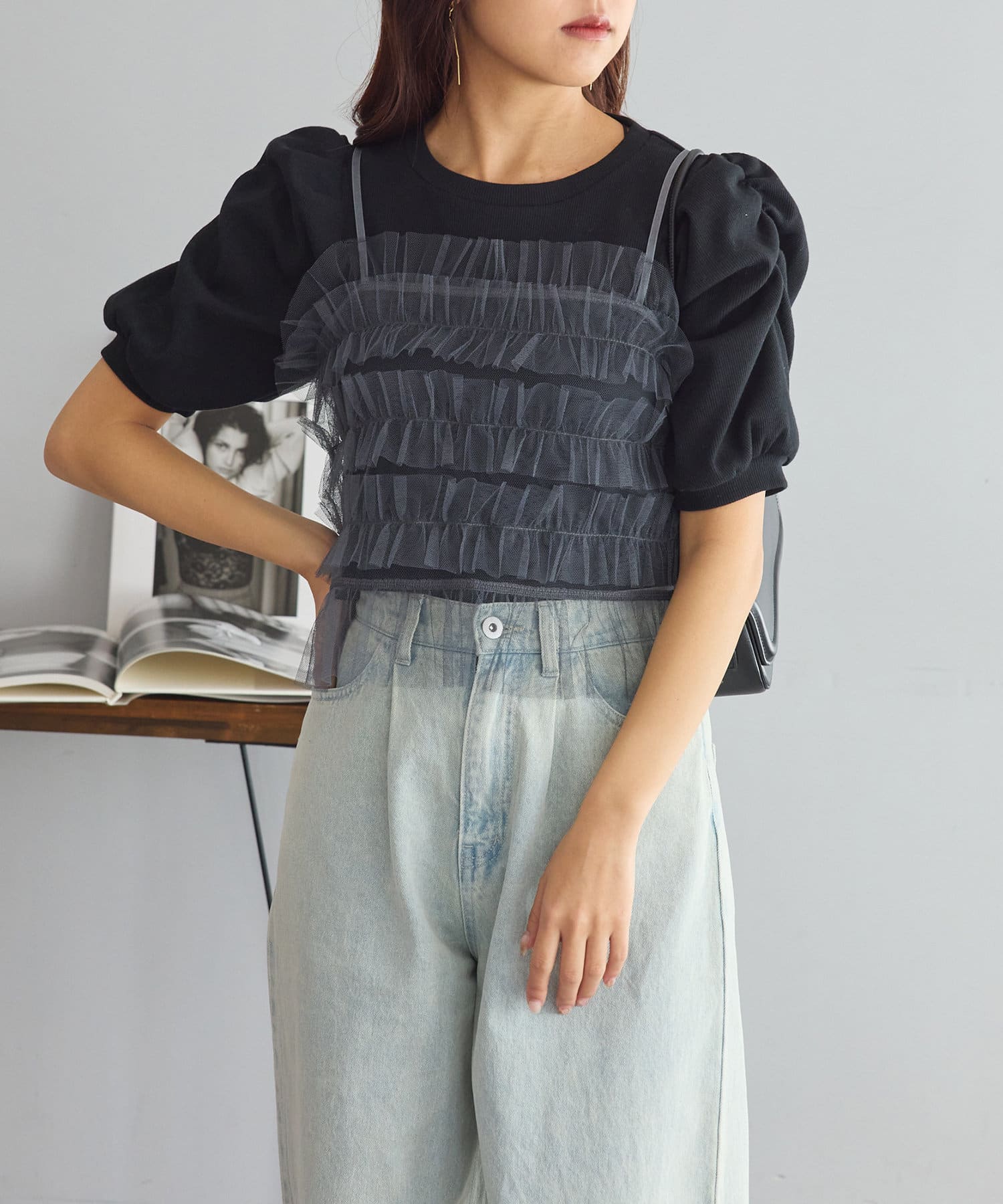 ・着まわしやすいシンプルなテレコトップスとトレンドのチュールキャミがセットに