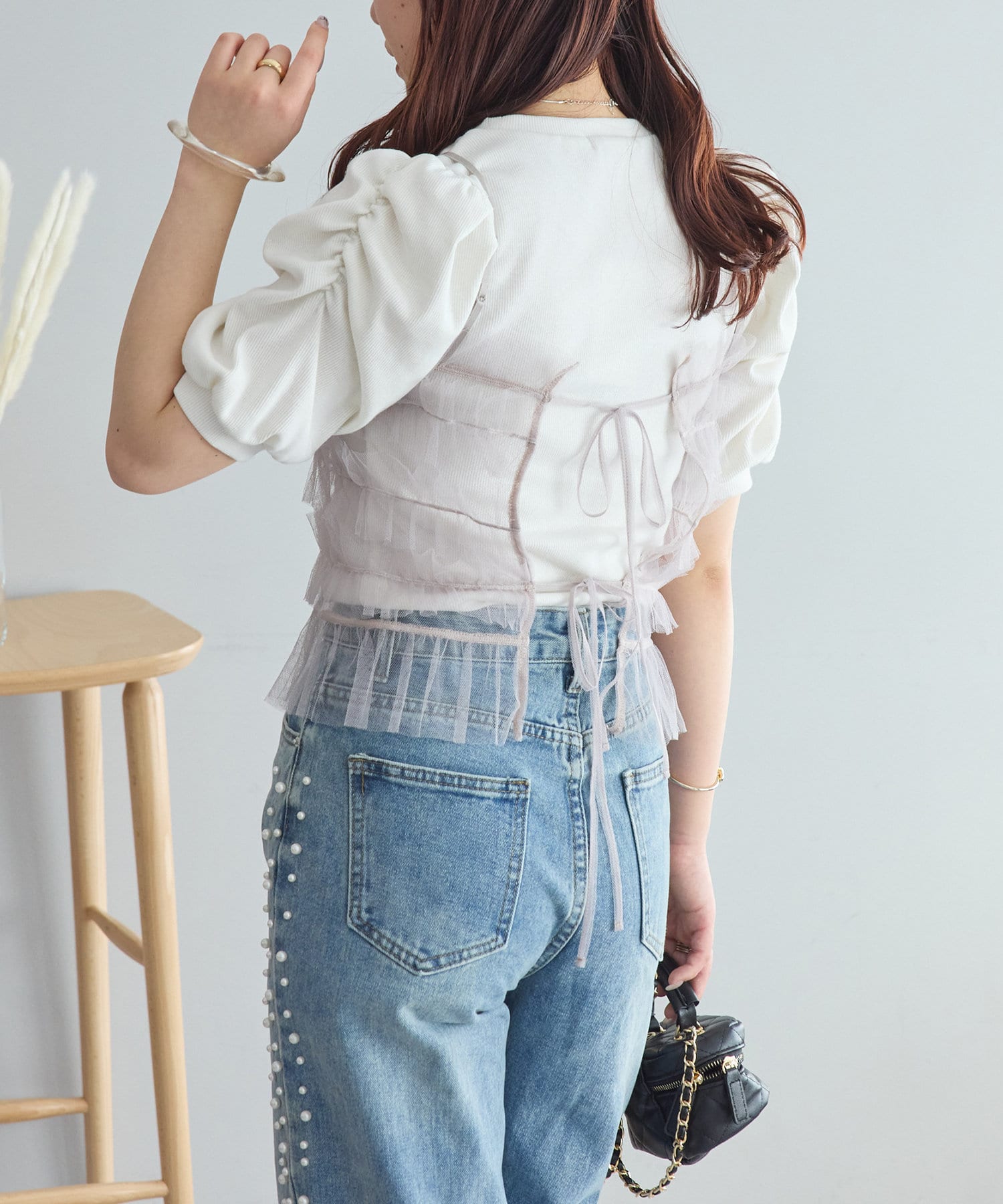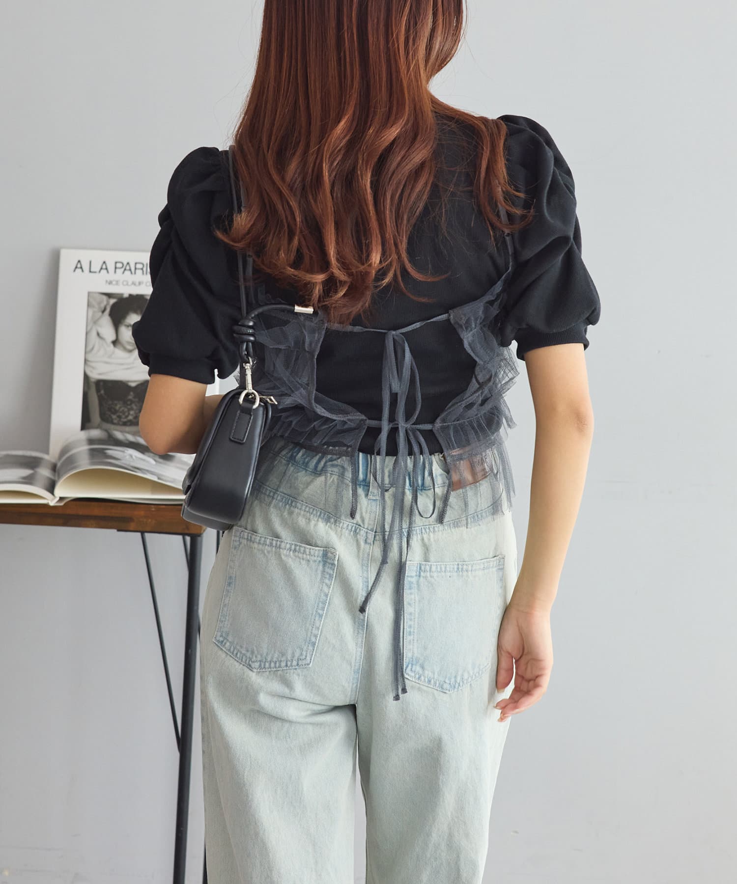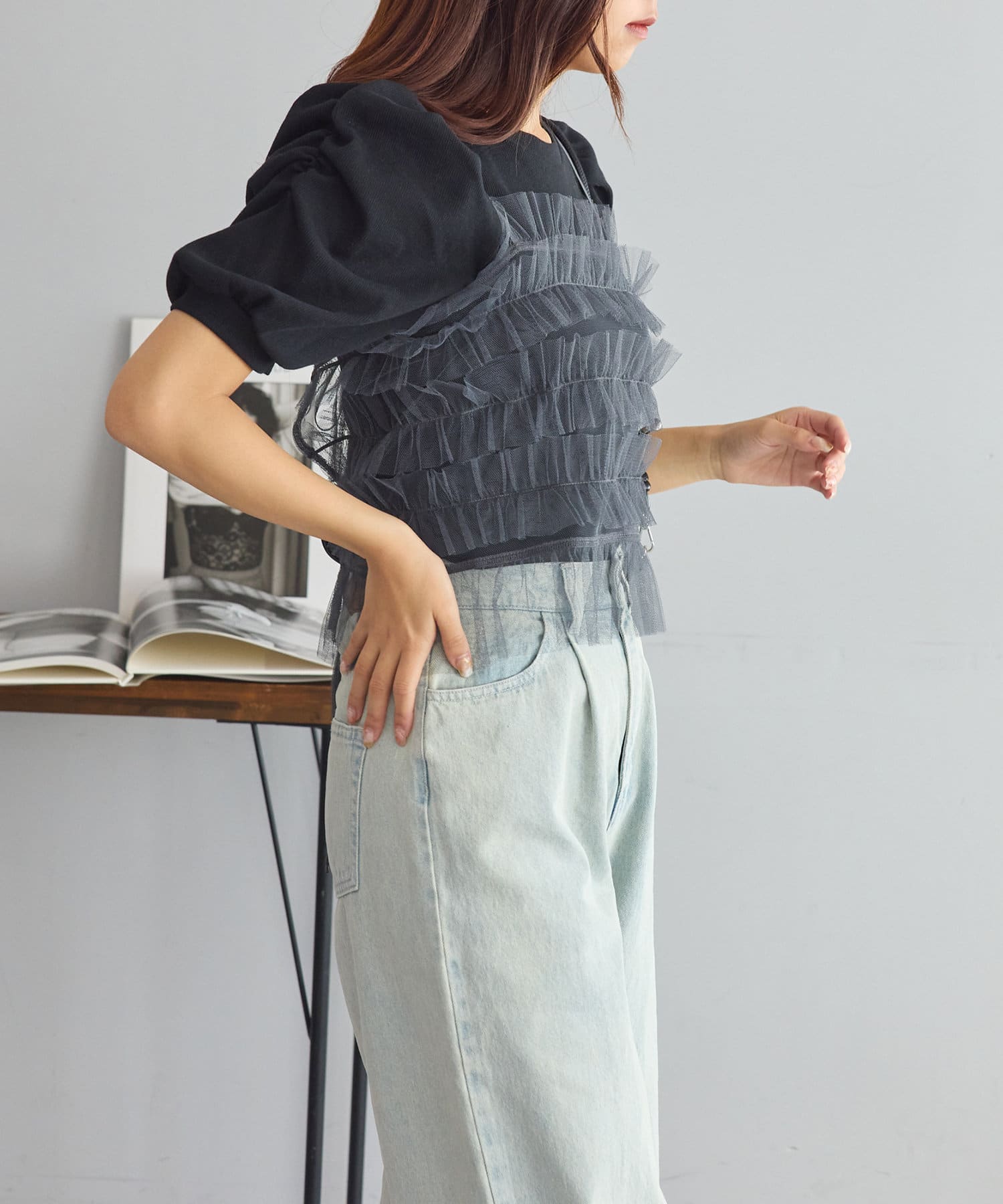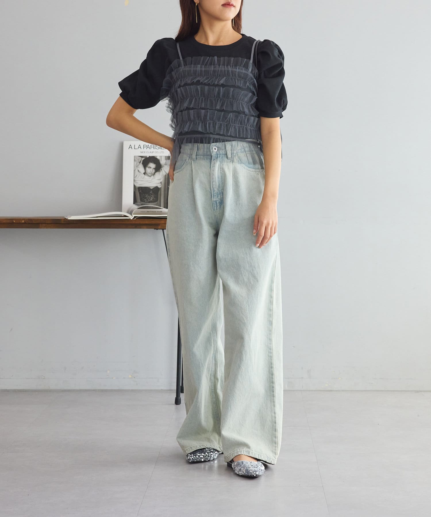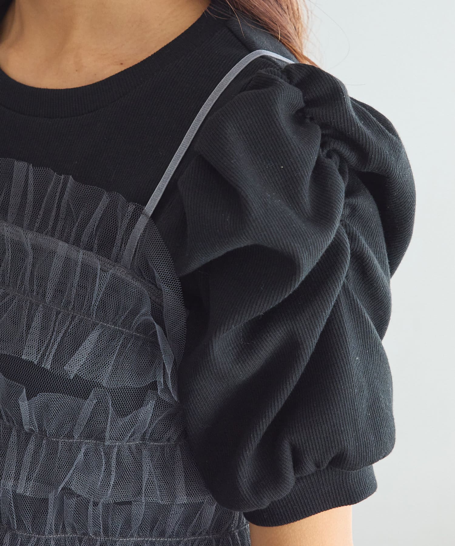 ・着まわしやすいシンプルなテレコトップスとトレンドのチュールキャミがセットに