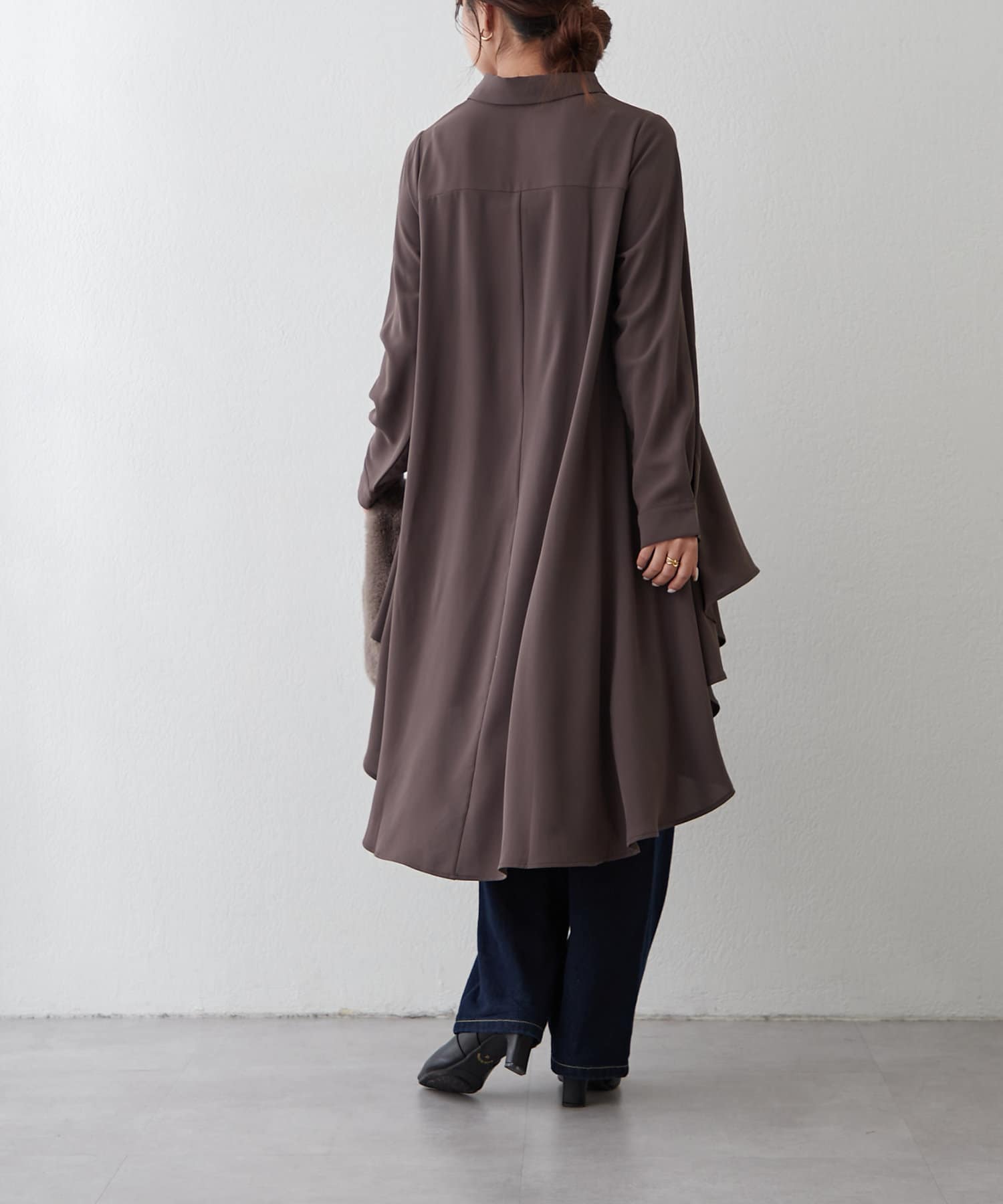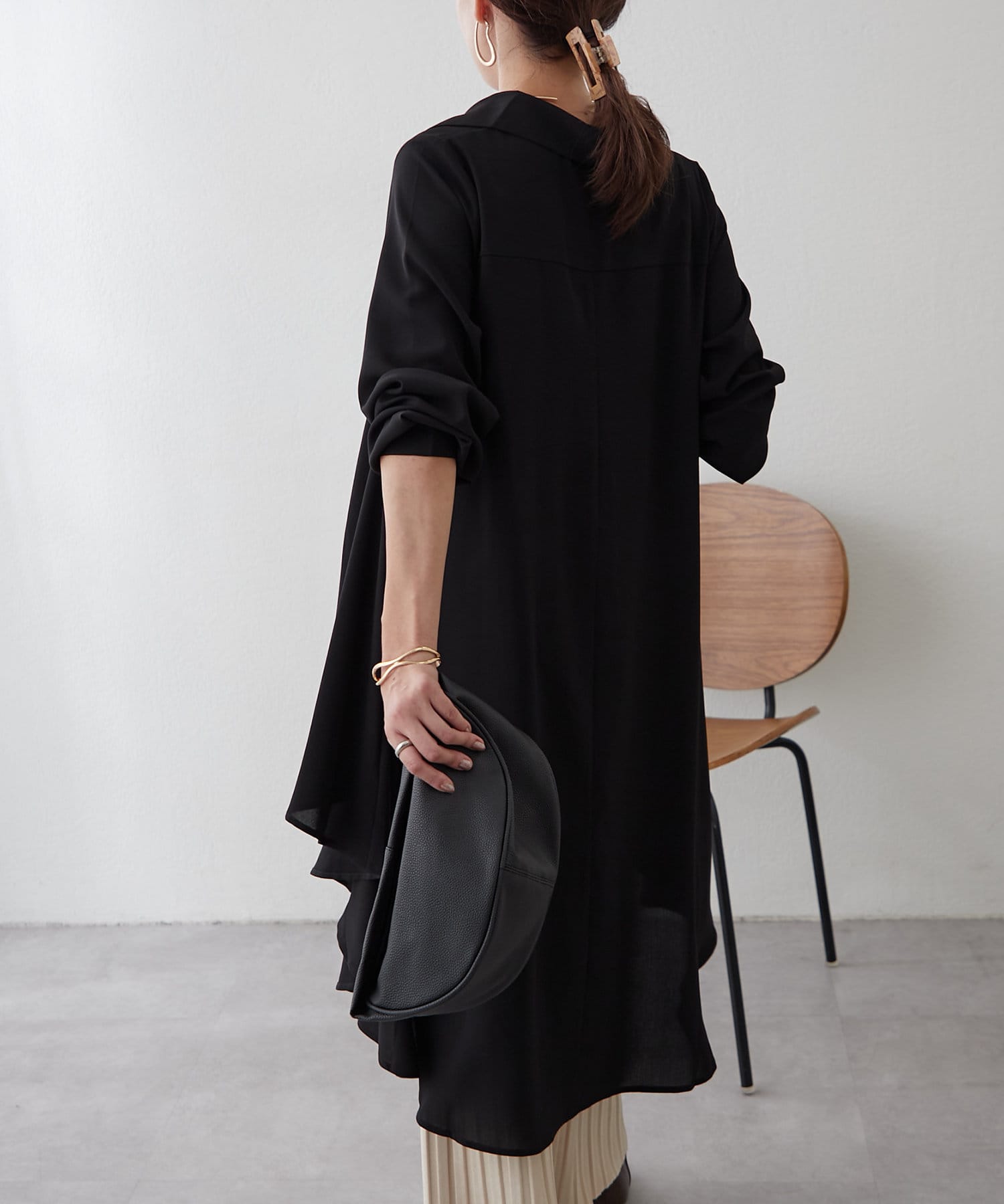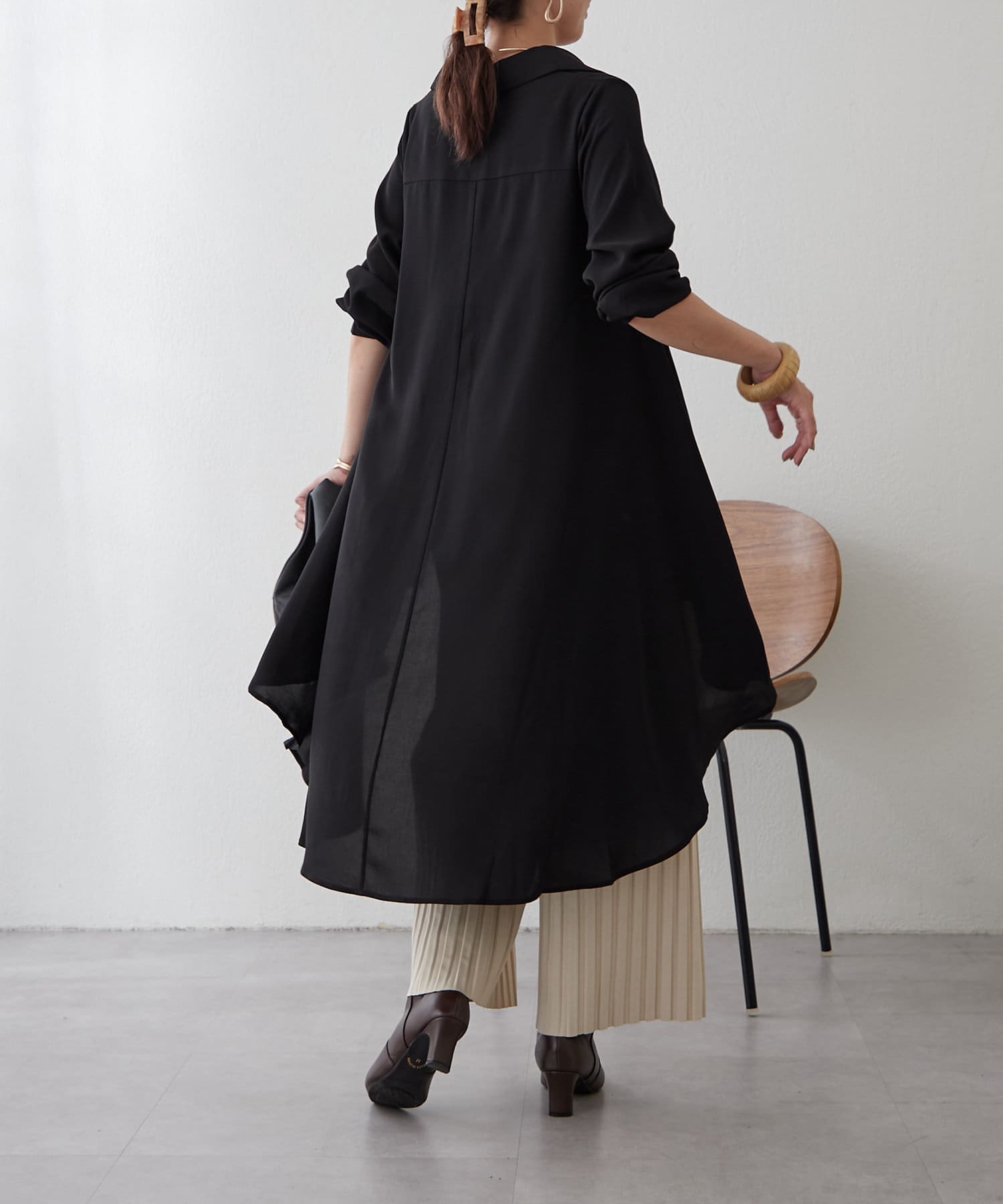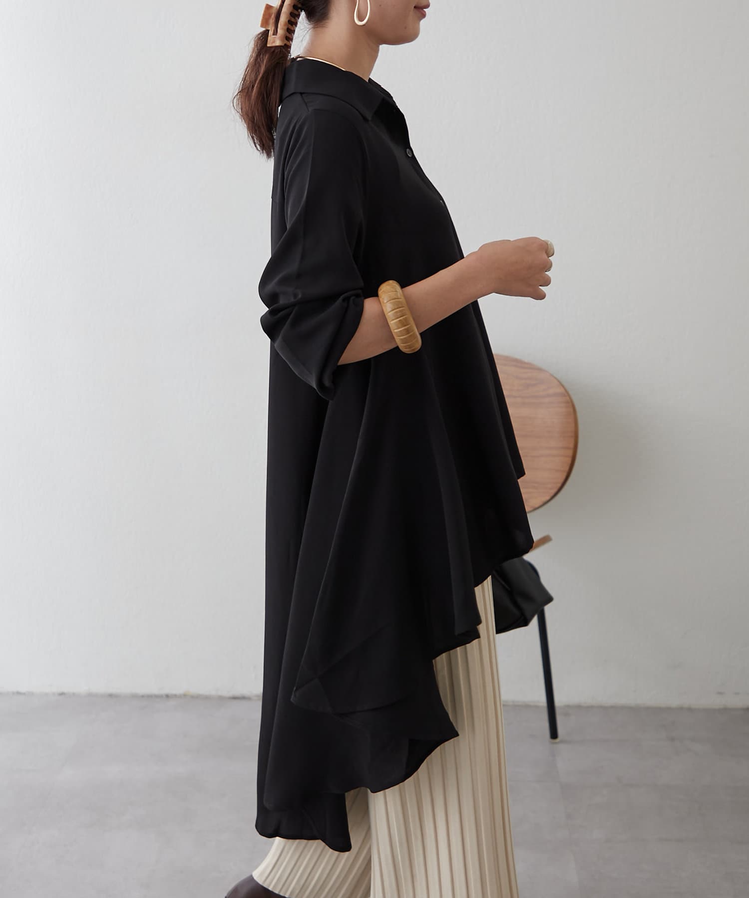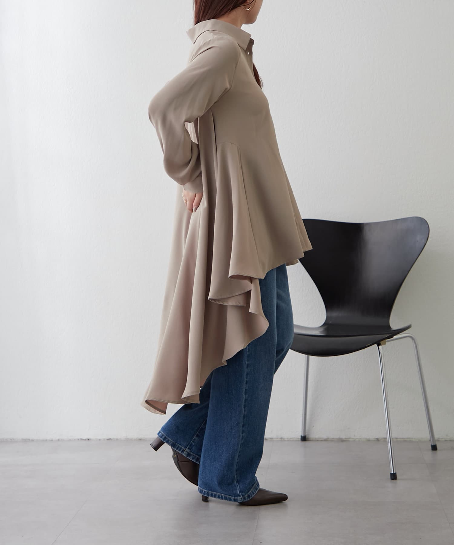 ブラウスの後ろのフレア部分を強調したエレガントなルックに。