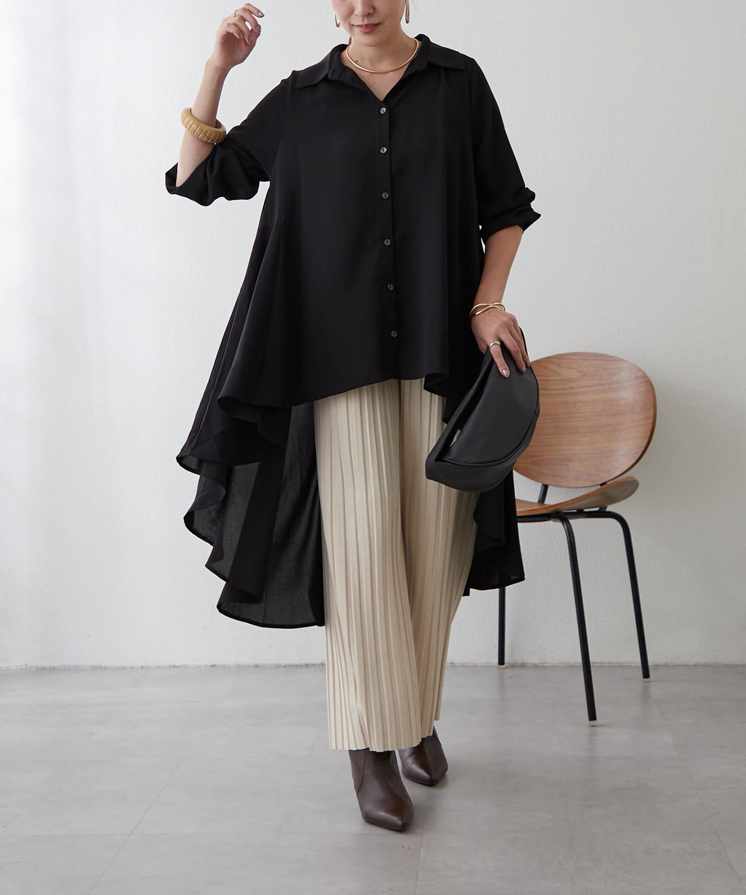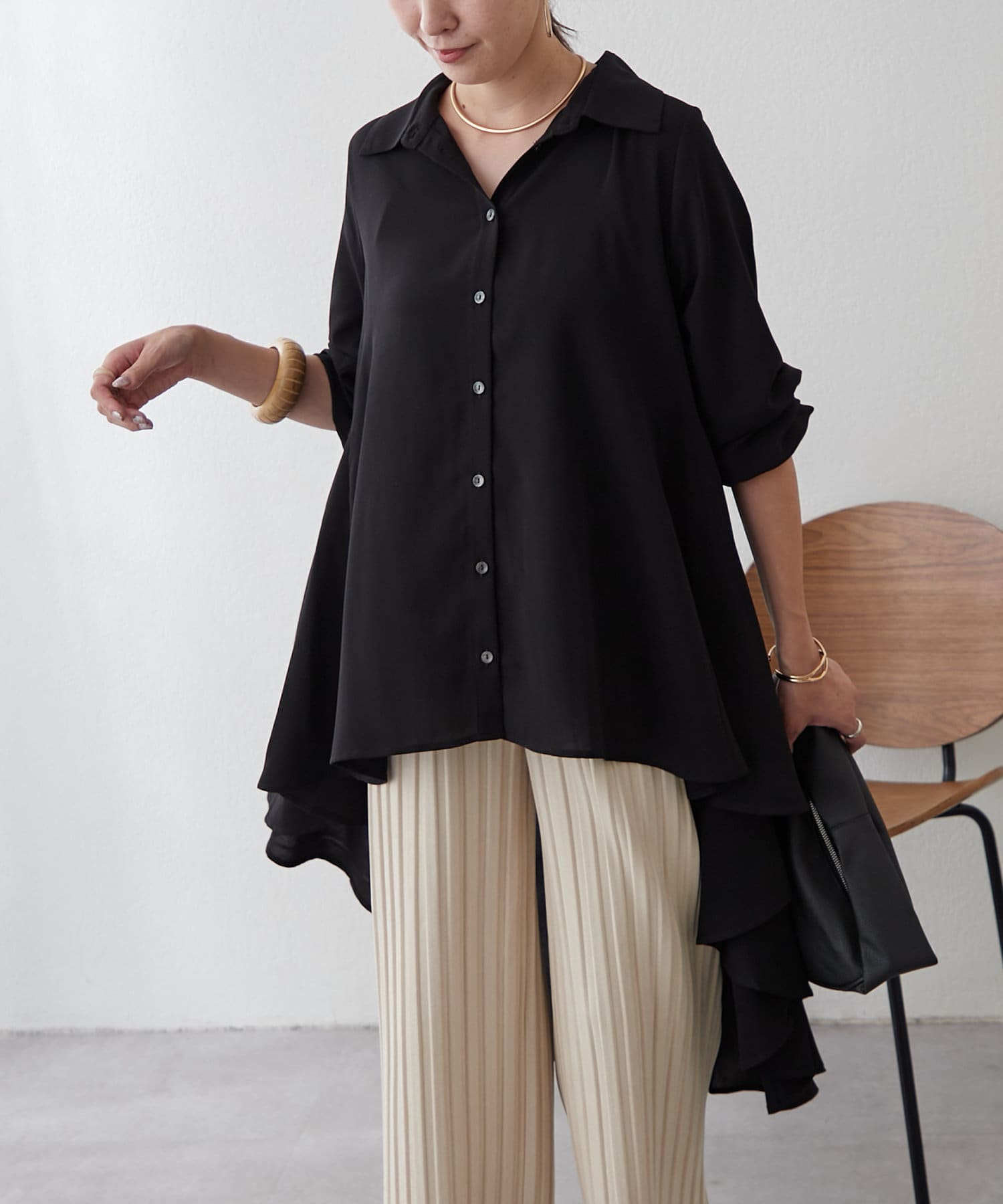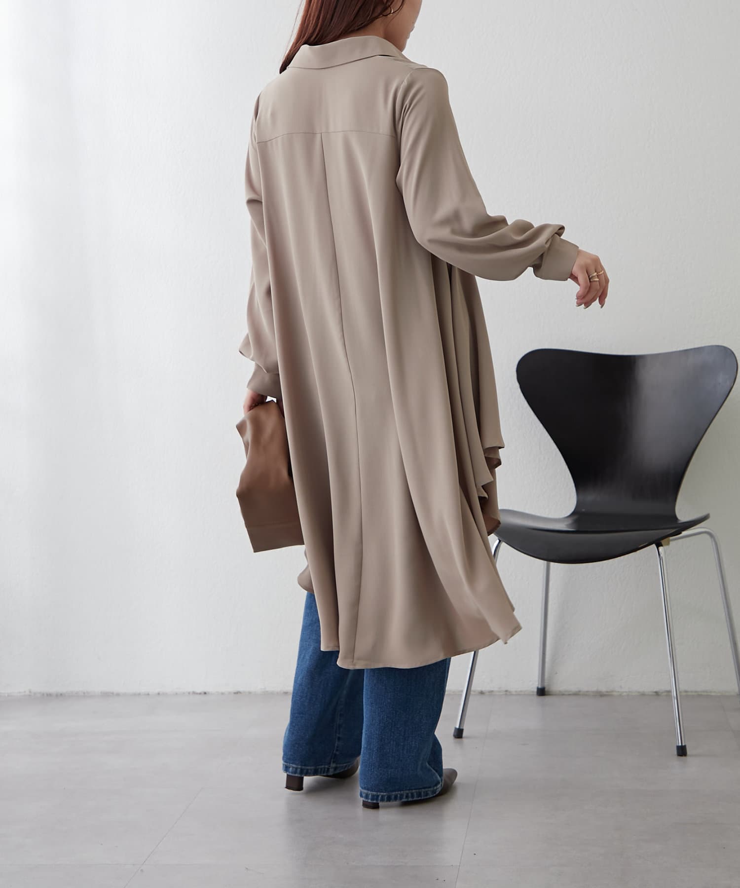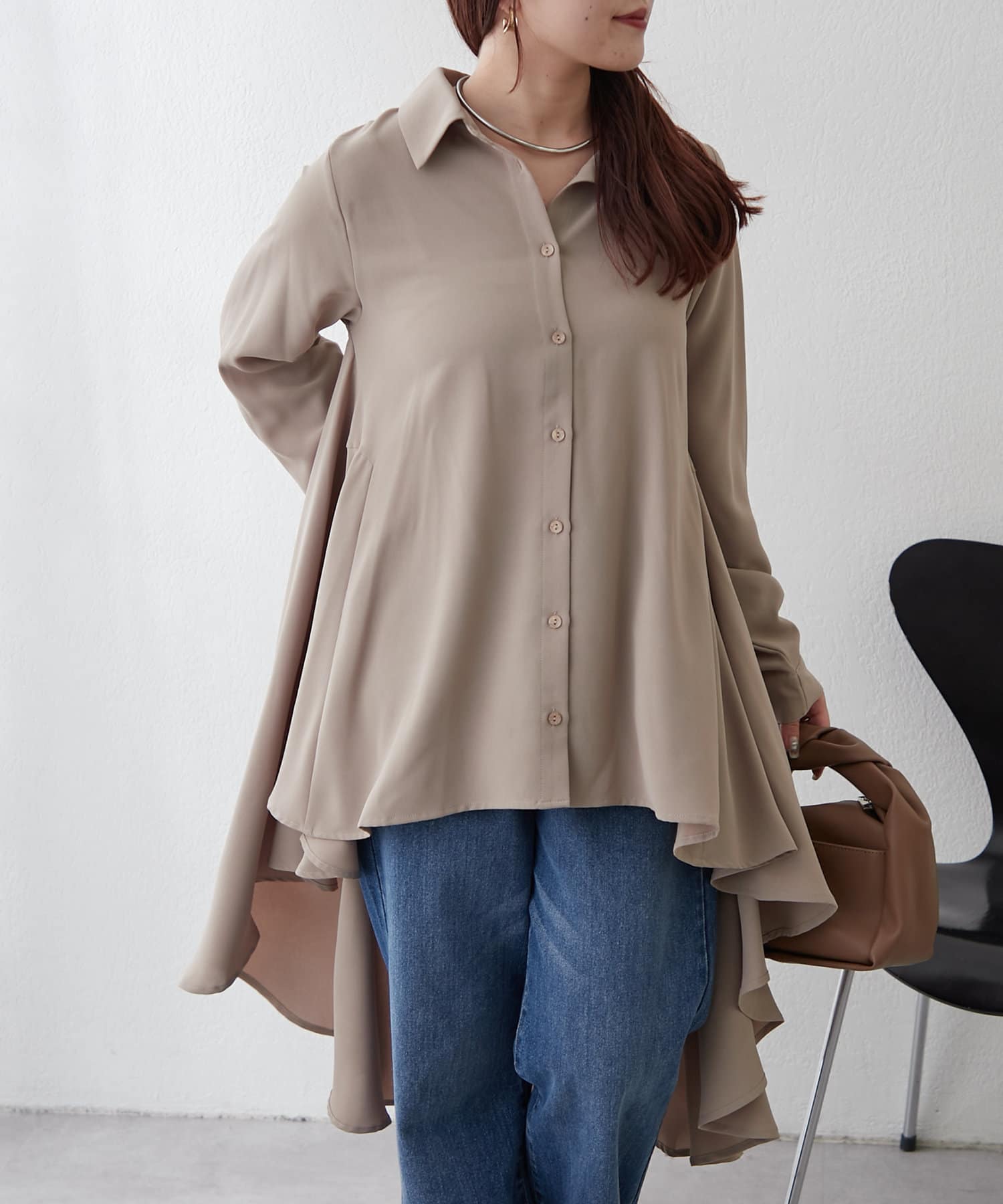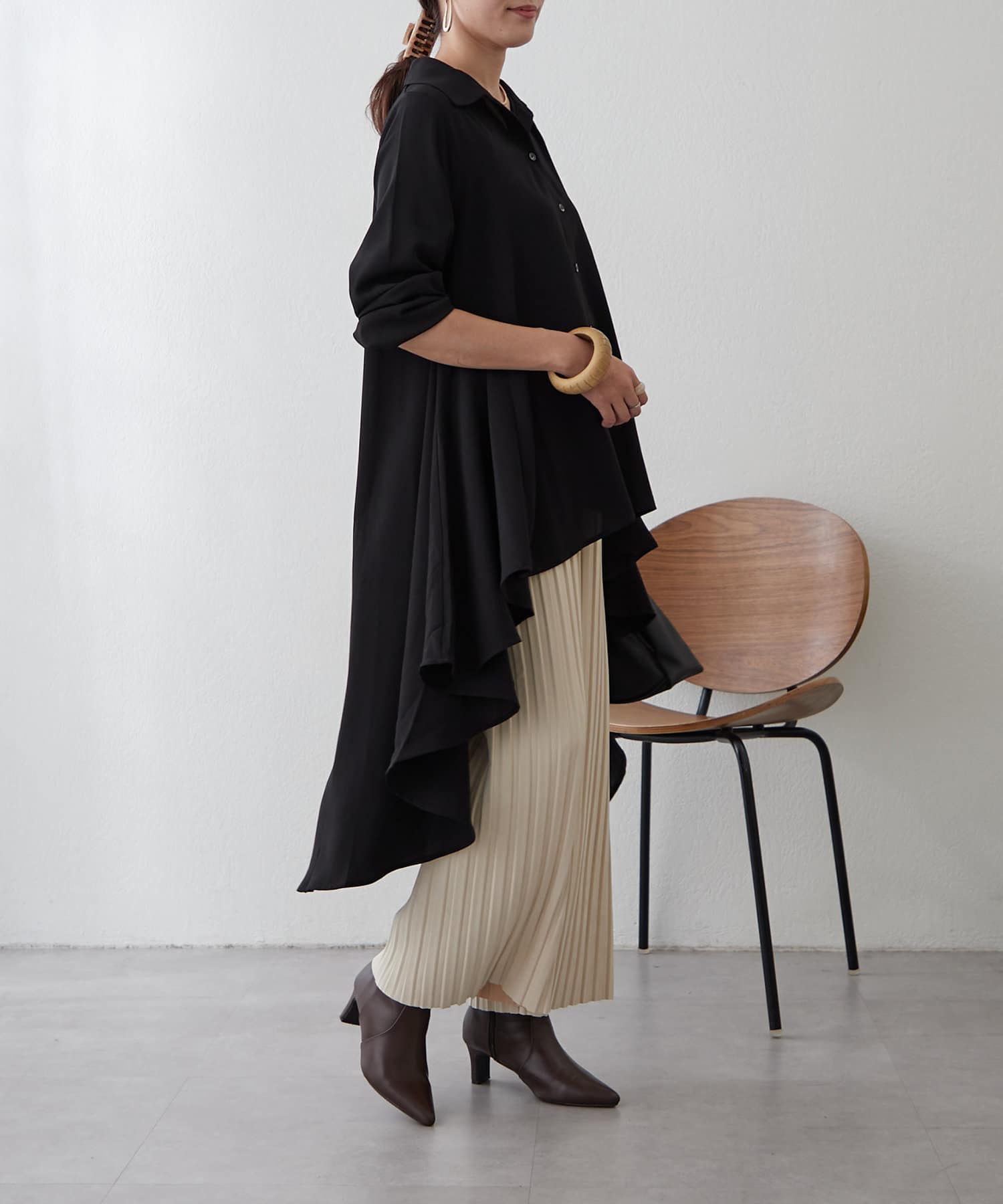ブラウスの後ろのフレア部分を強調したエレガントなルックに。