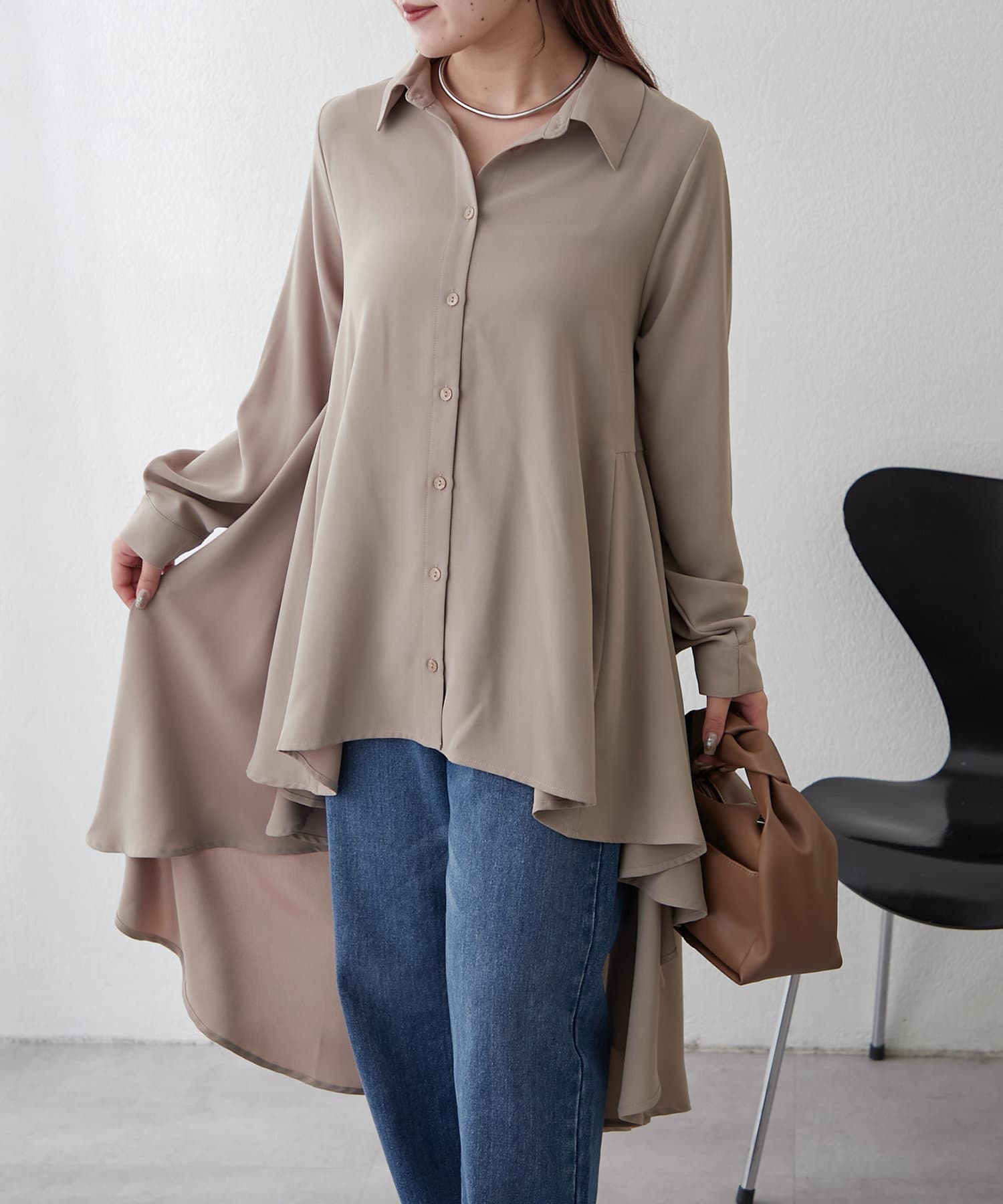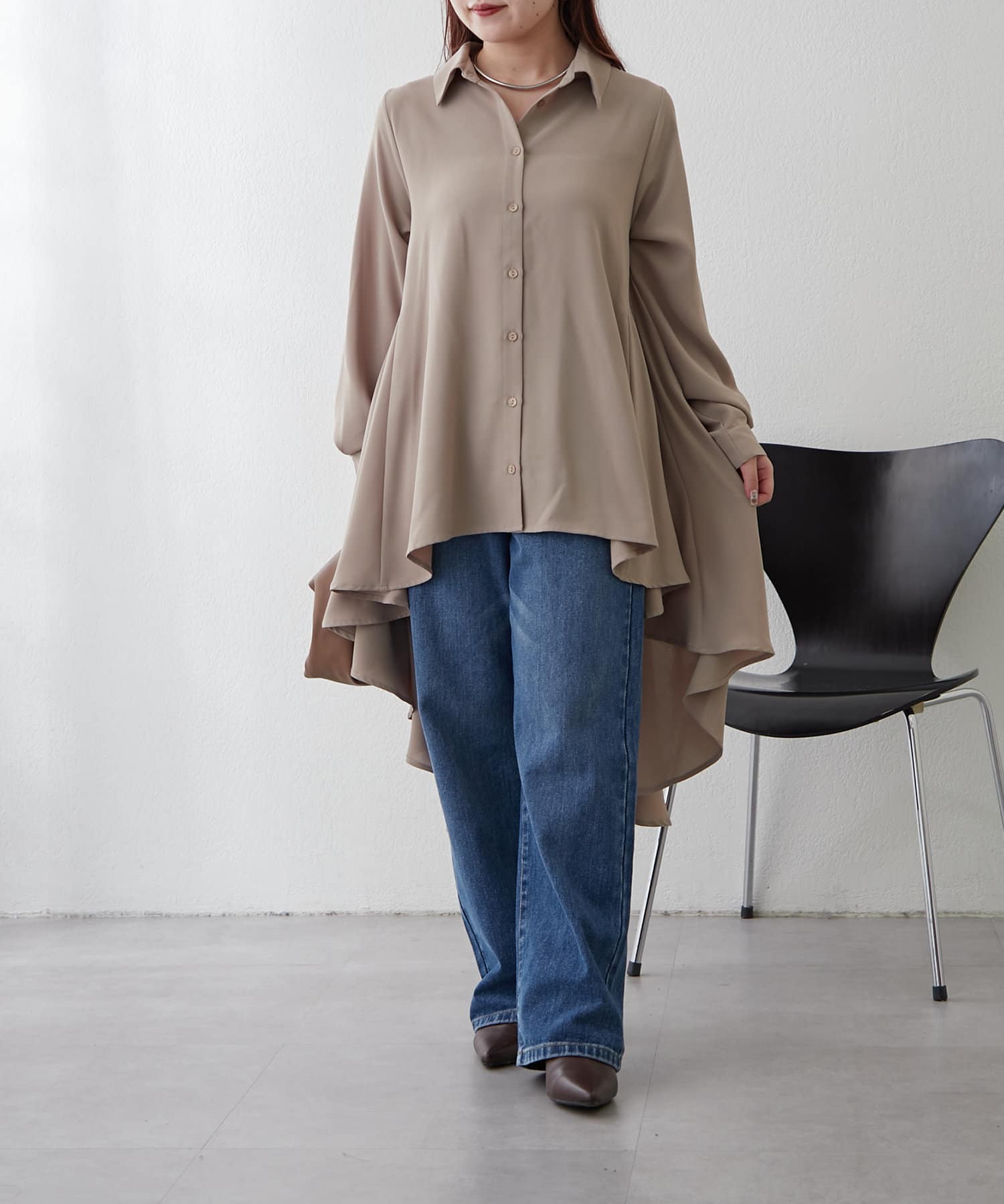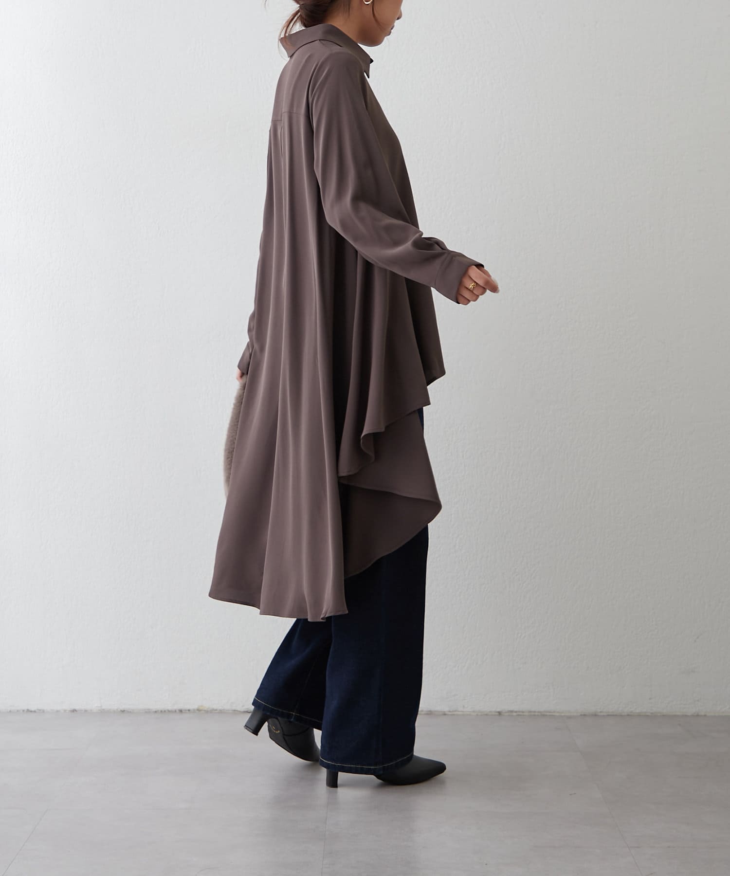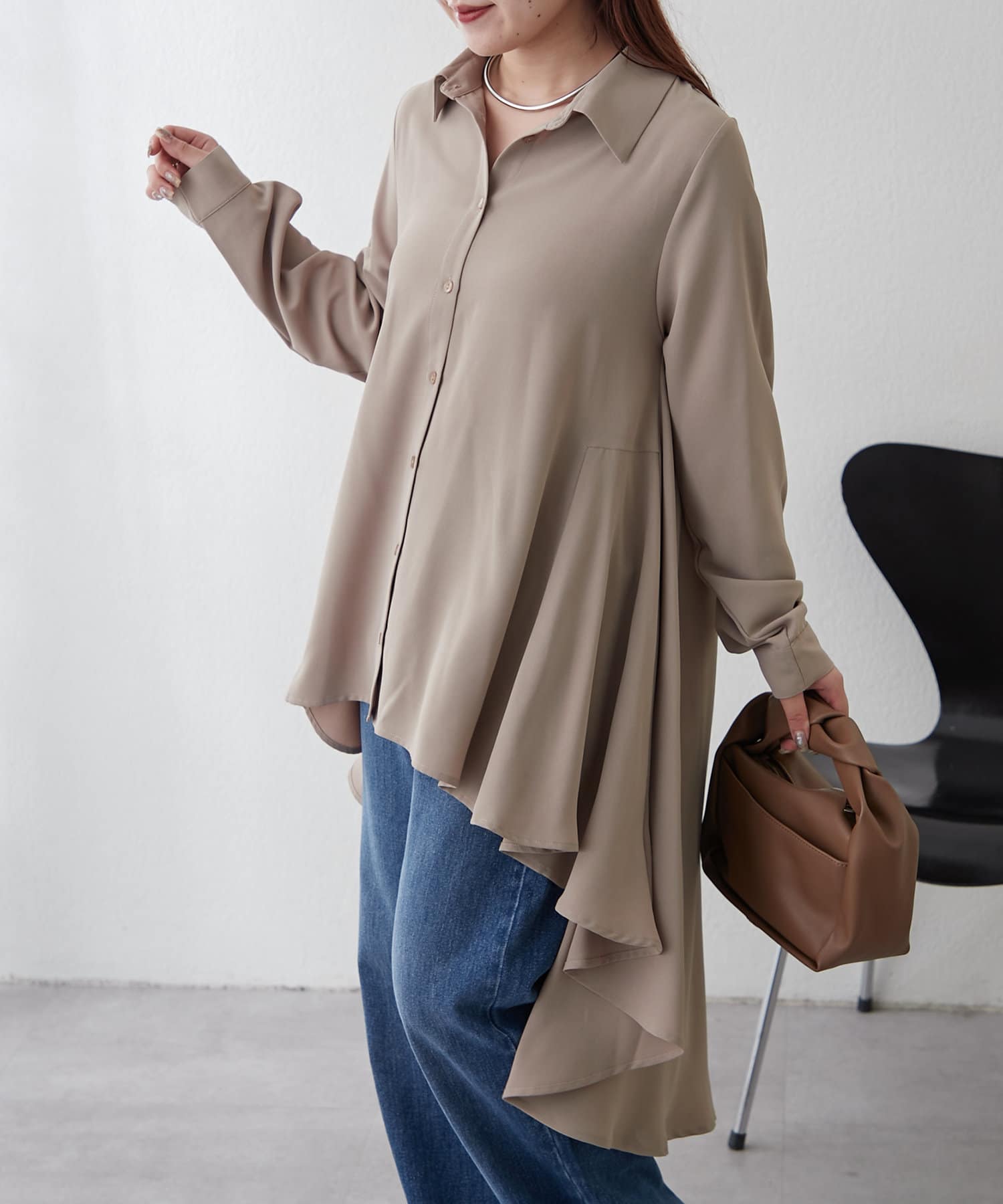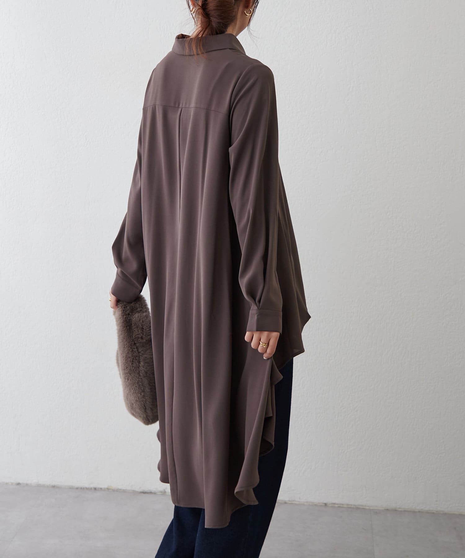 ブラウスの後ろのフレア部分を強調したエレガントなルックに。