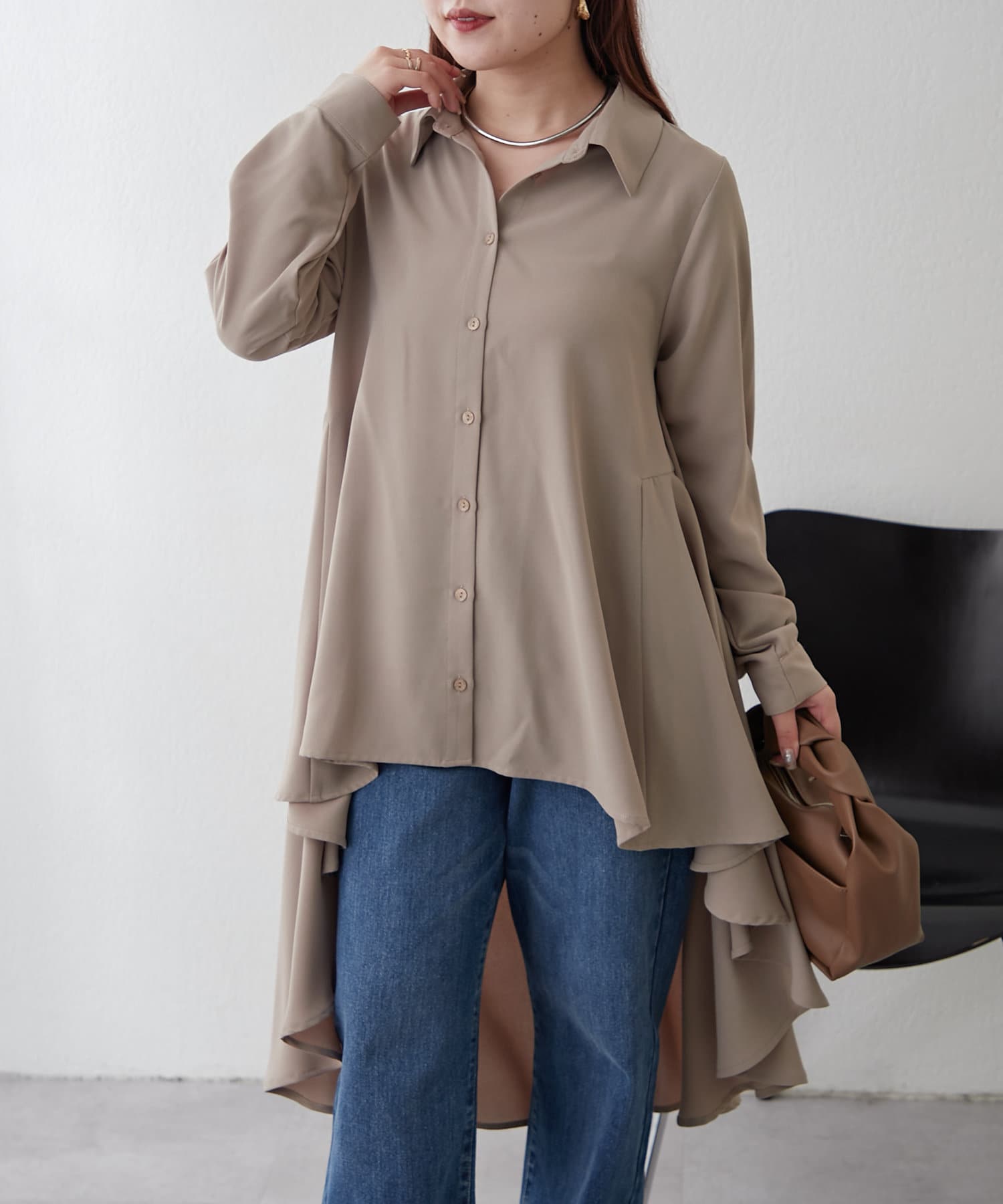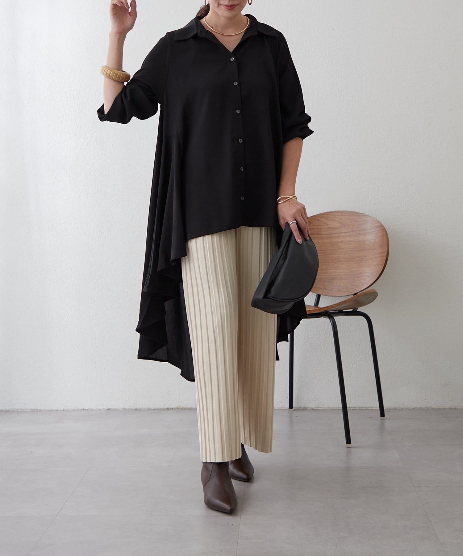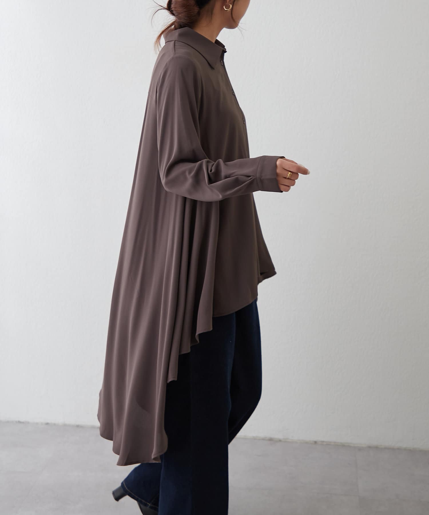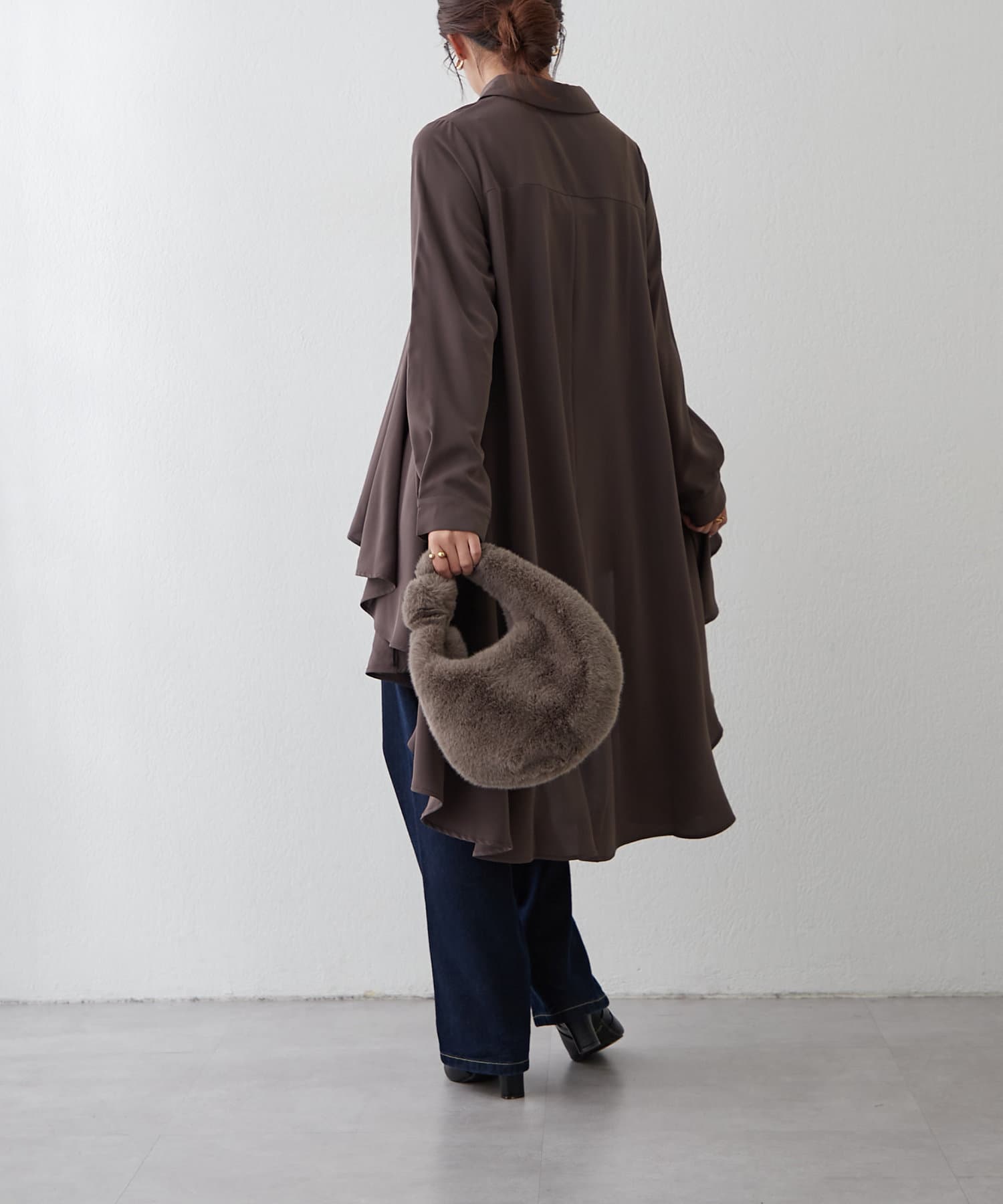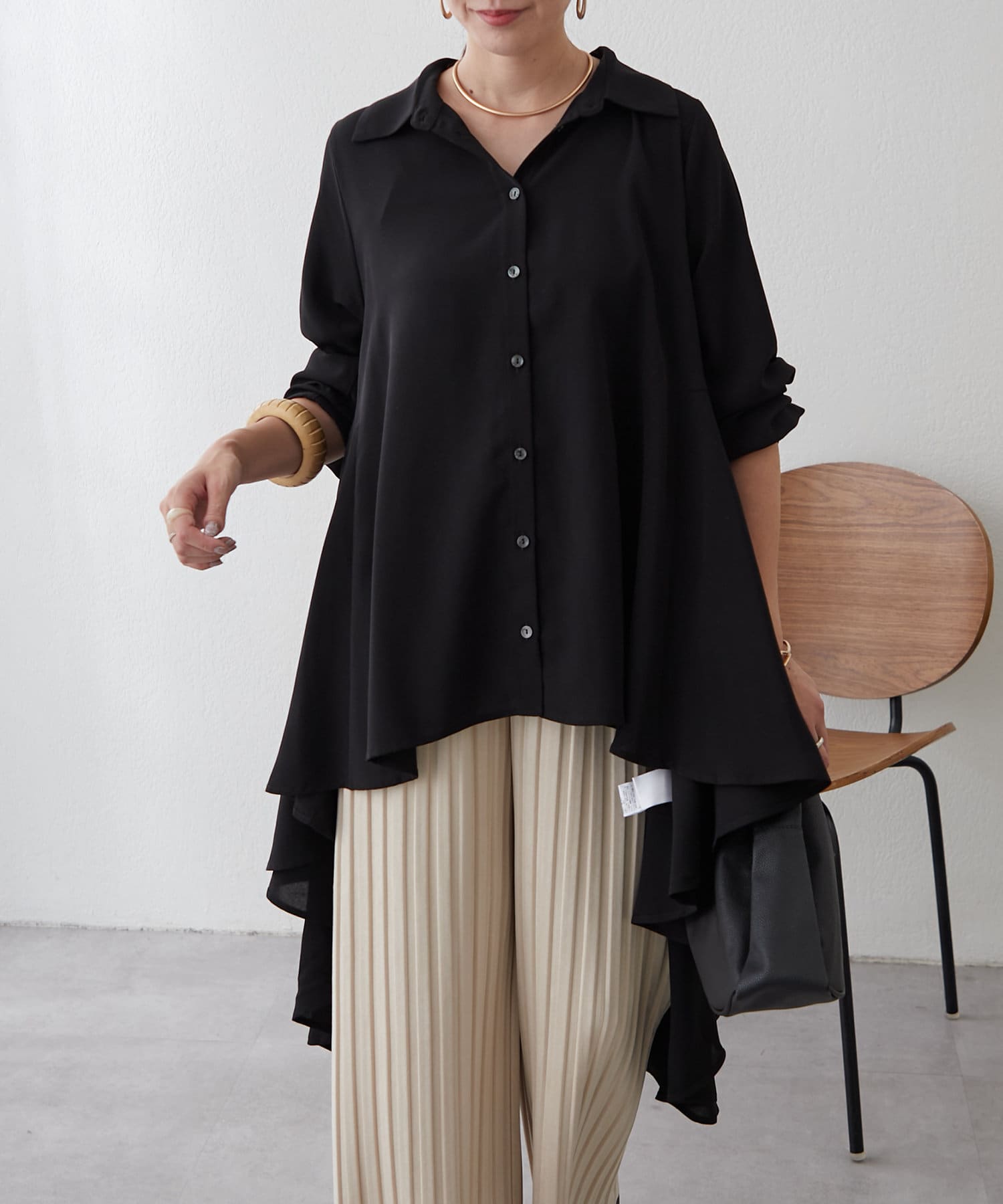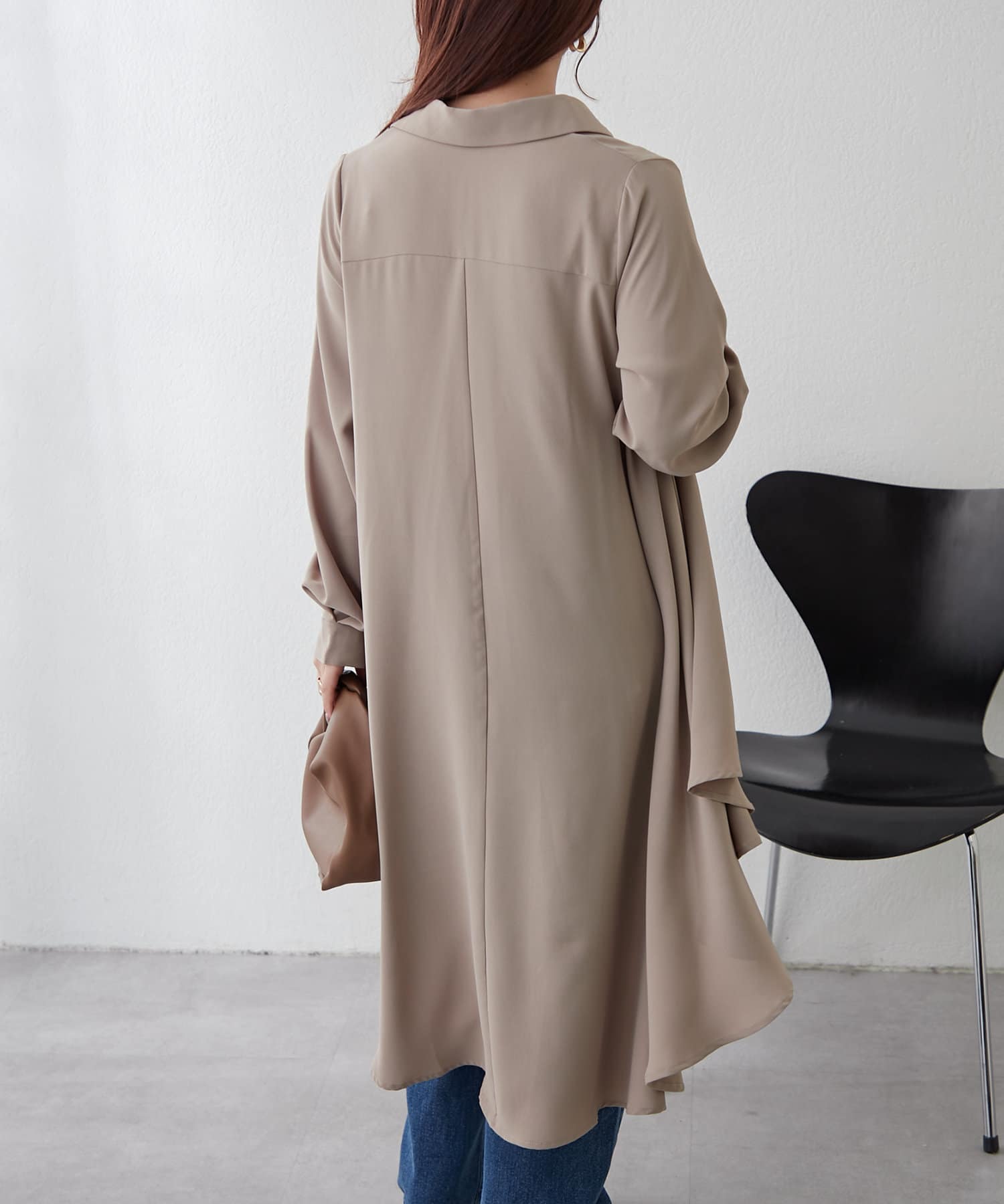 ブラウスの後ろのフレア部分を強調したエレガントなルックに。