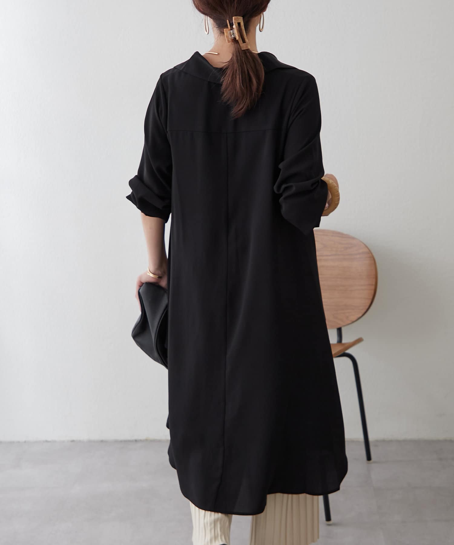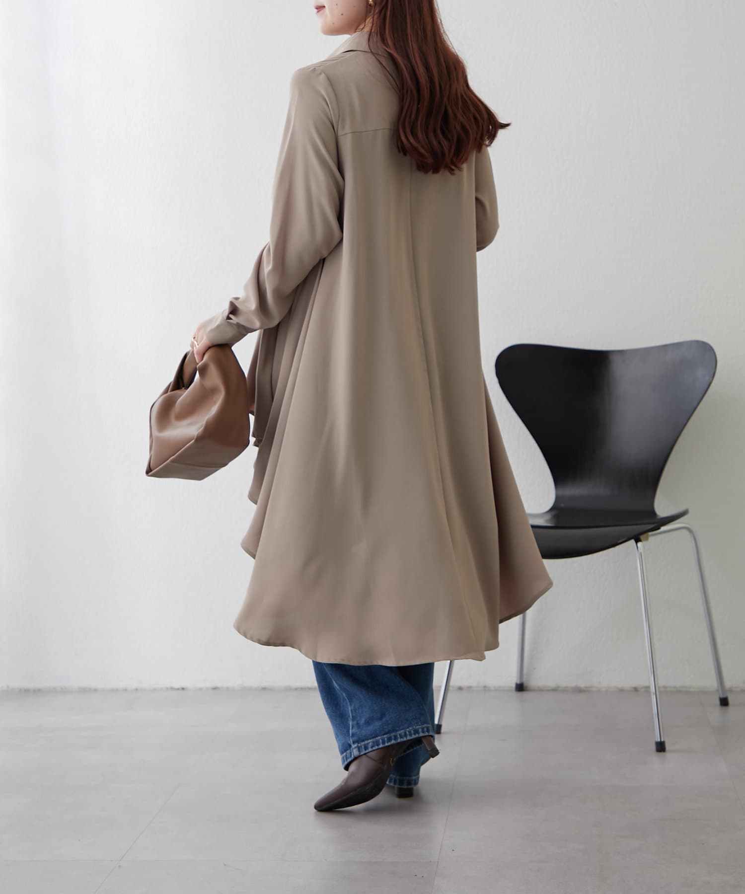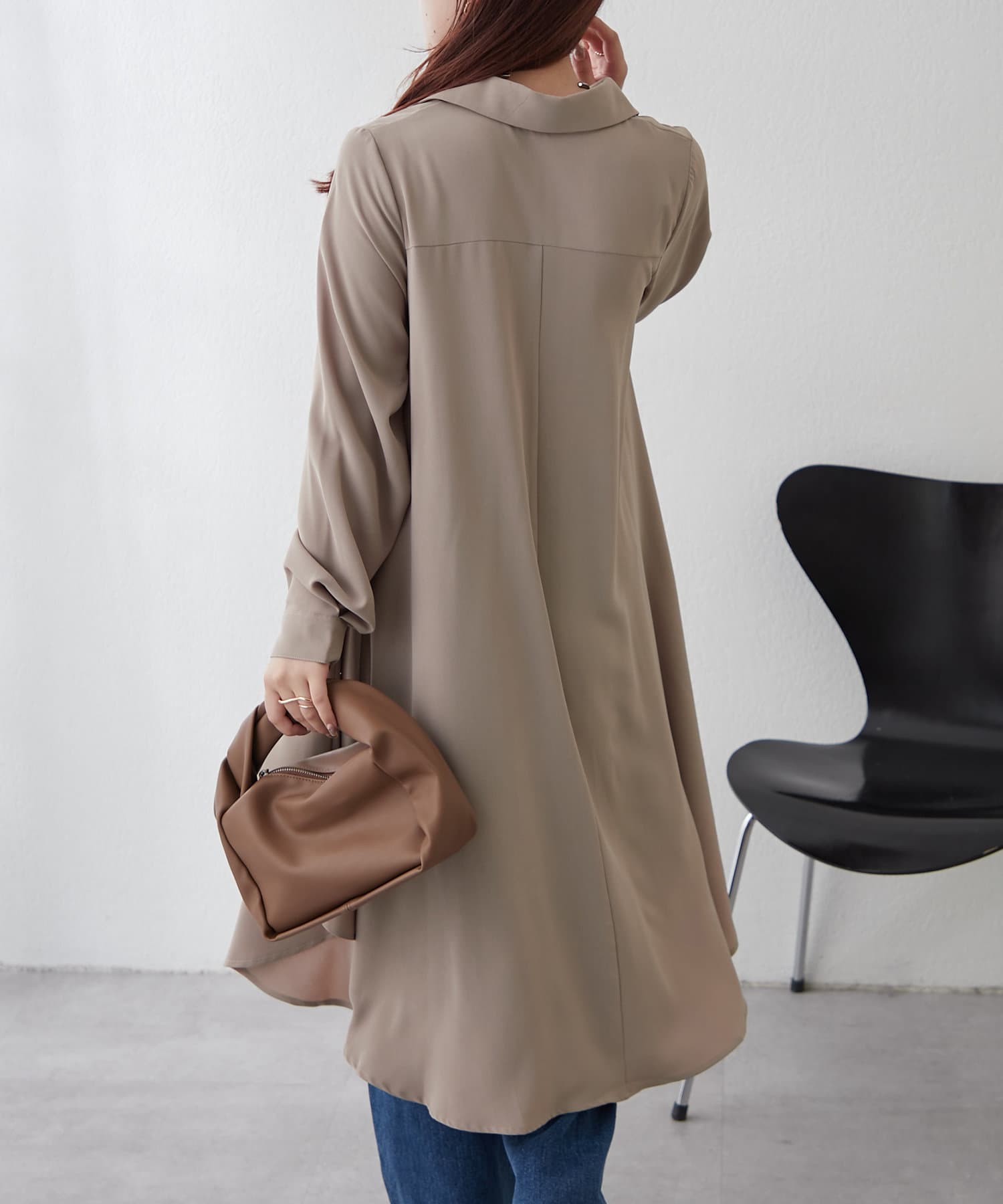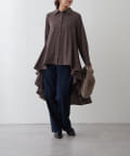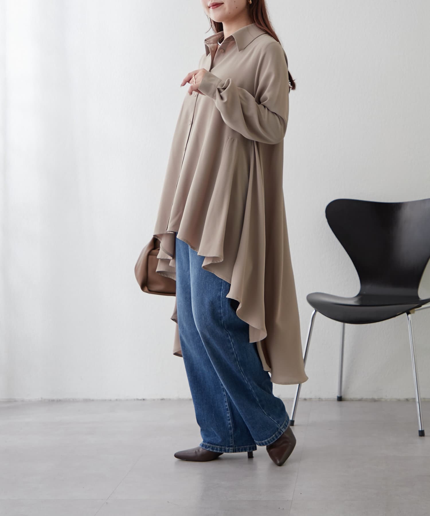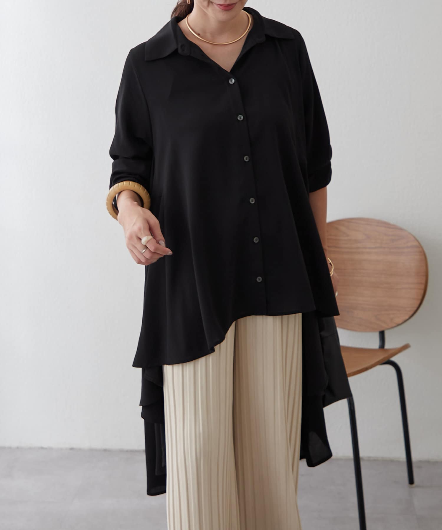 ブラウスの後ろのフレア部分を強調したエレガントなルックに。