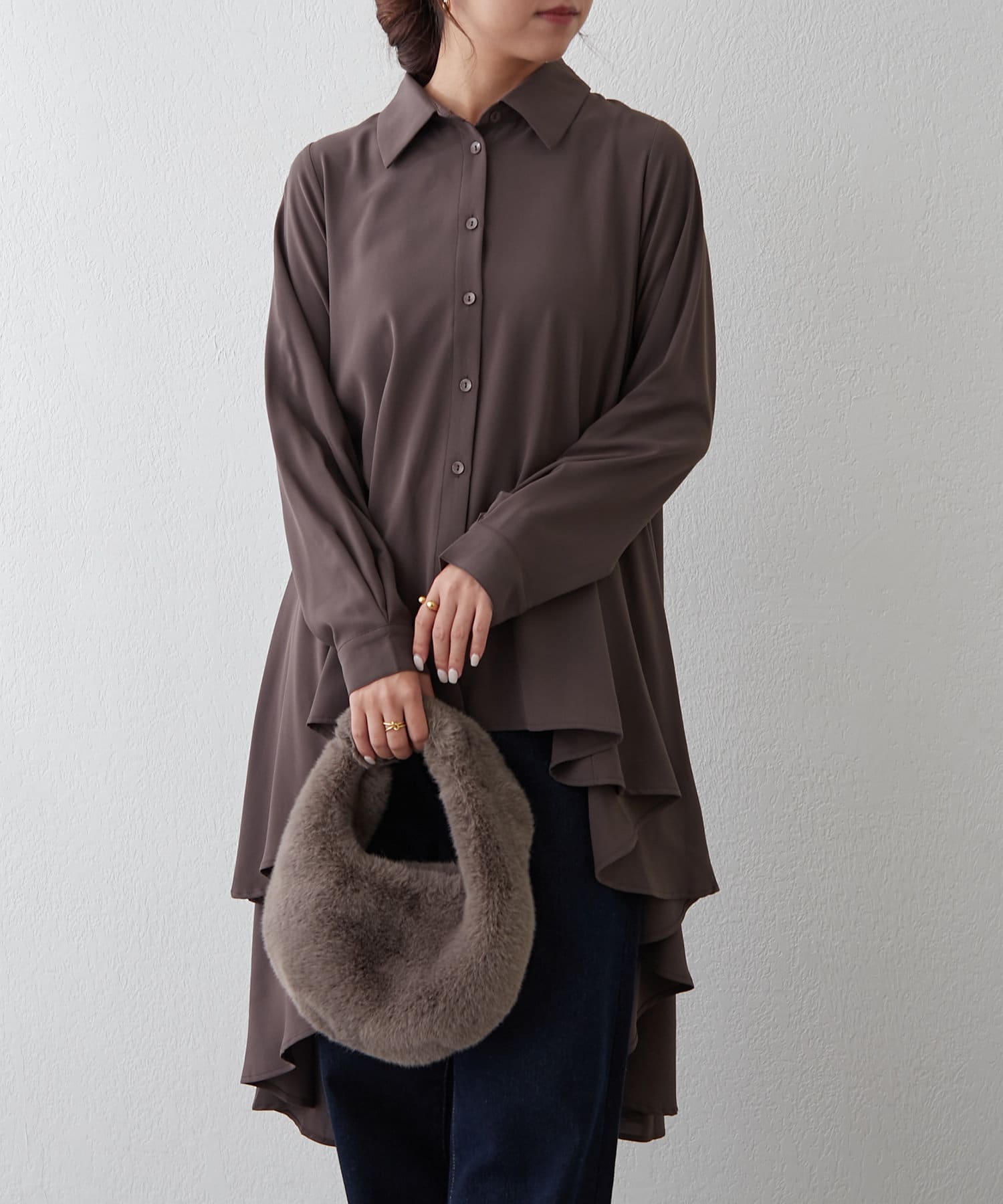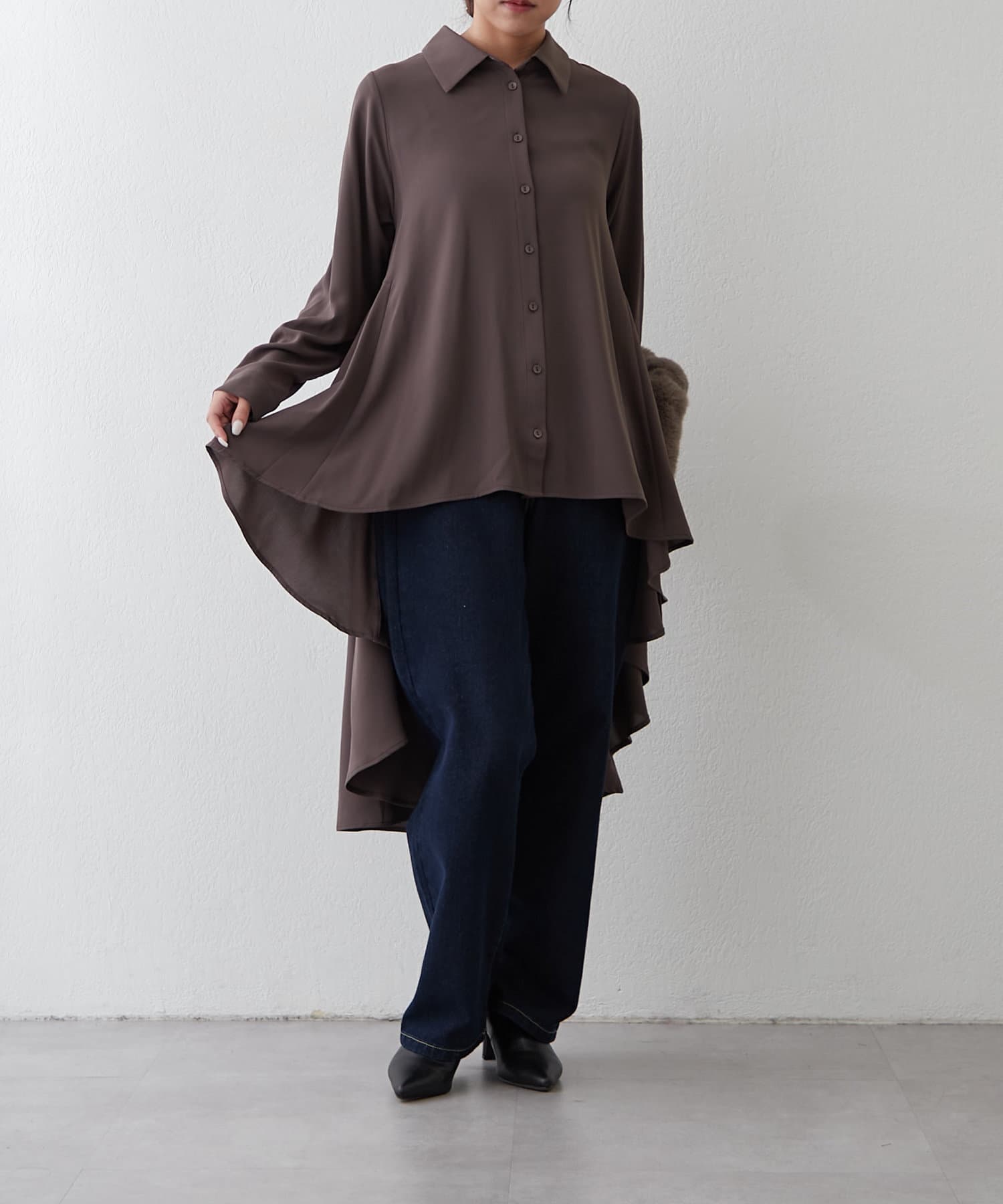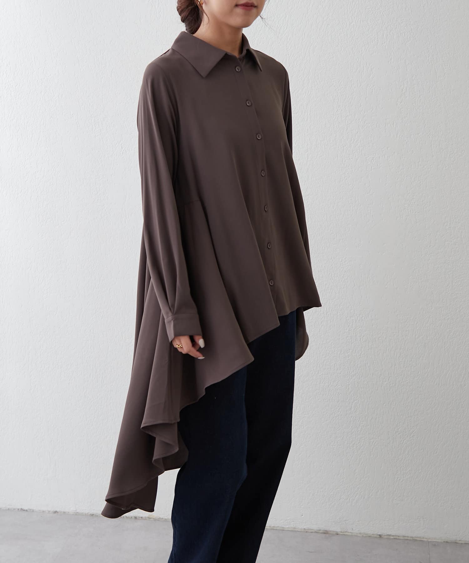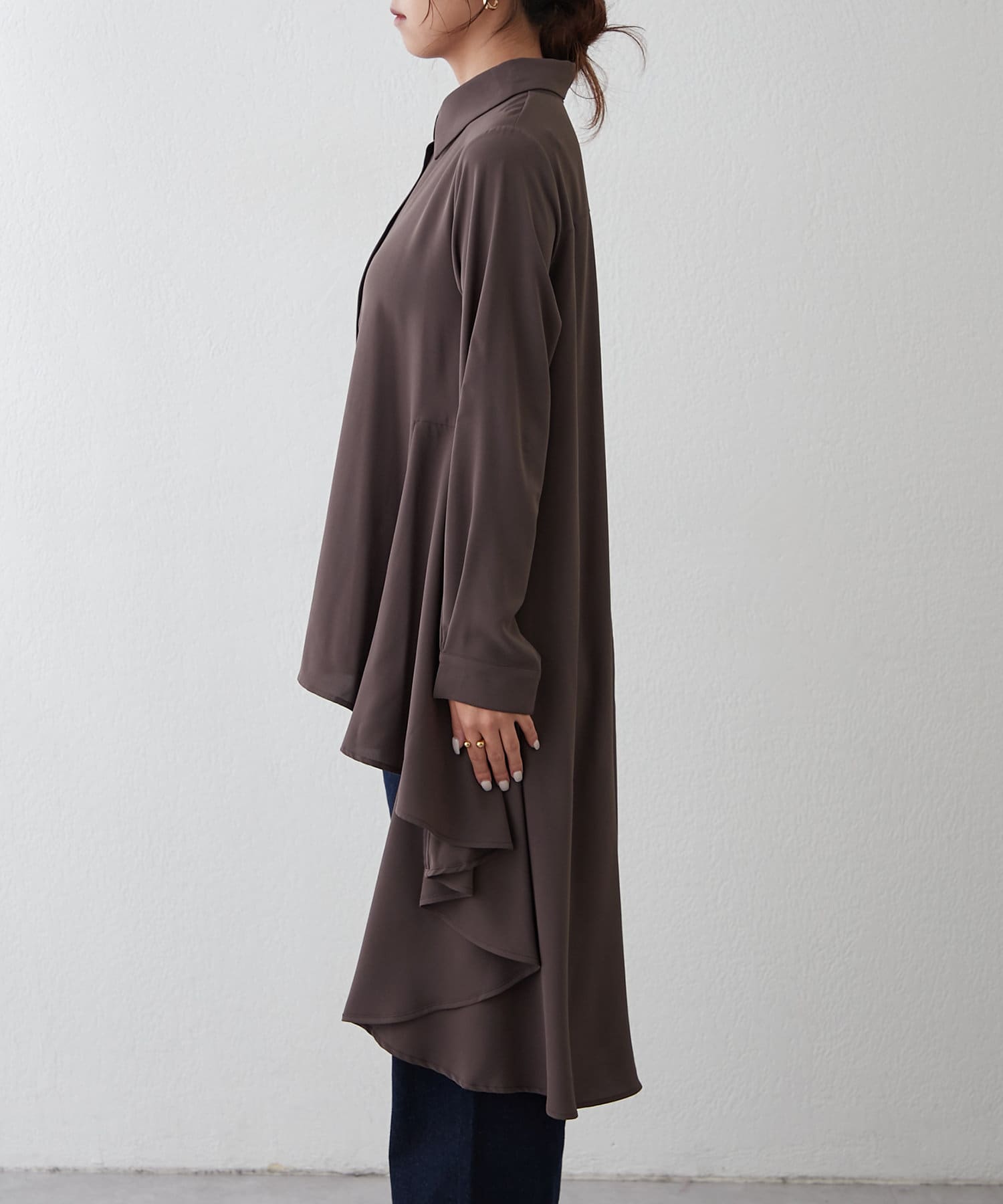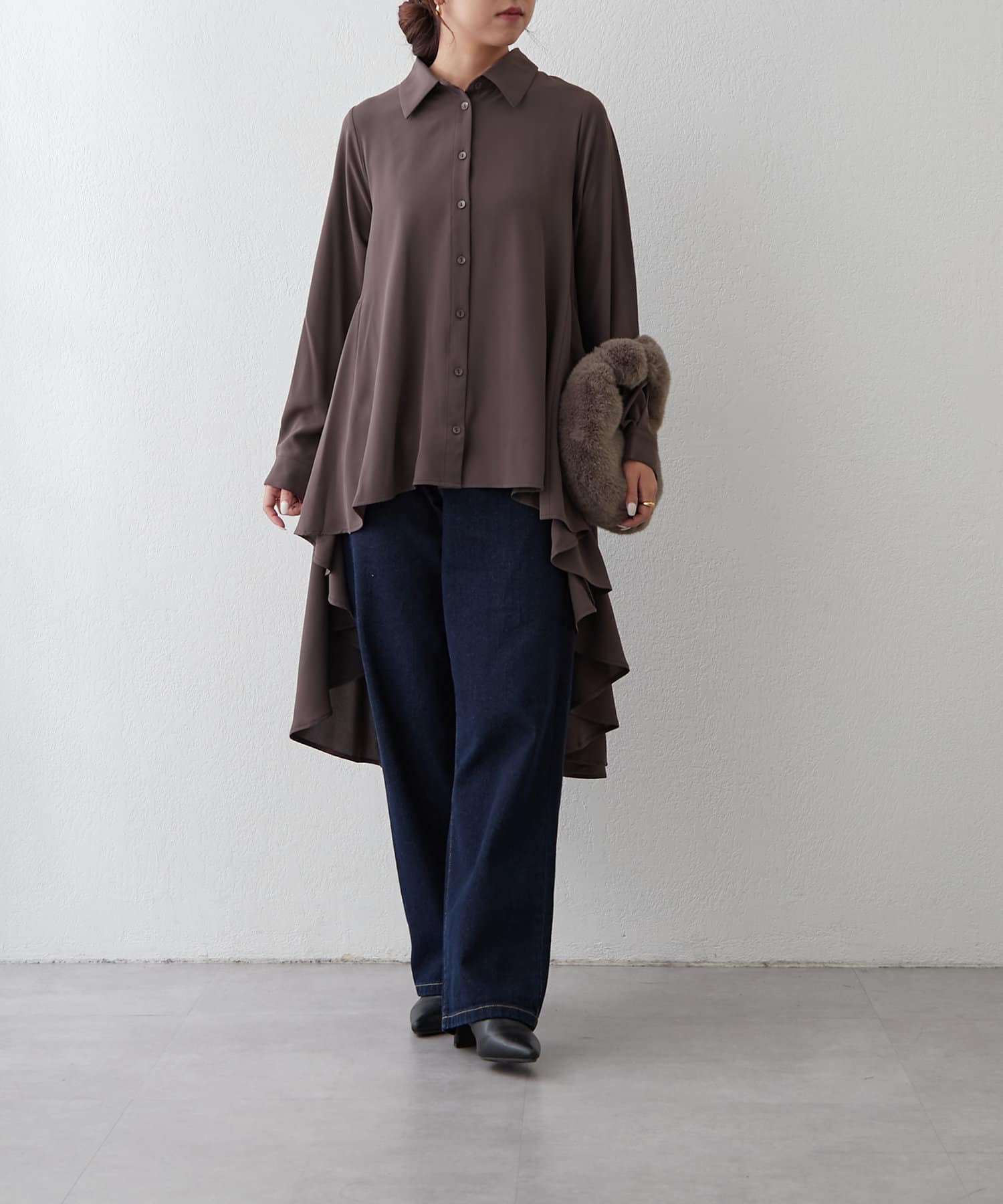ブラウスの後ろのフレア部分を強調したエレガントなルックに。