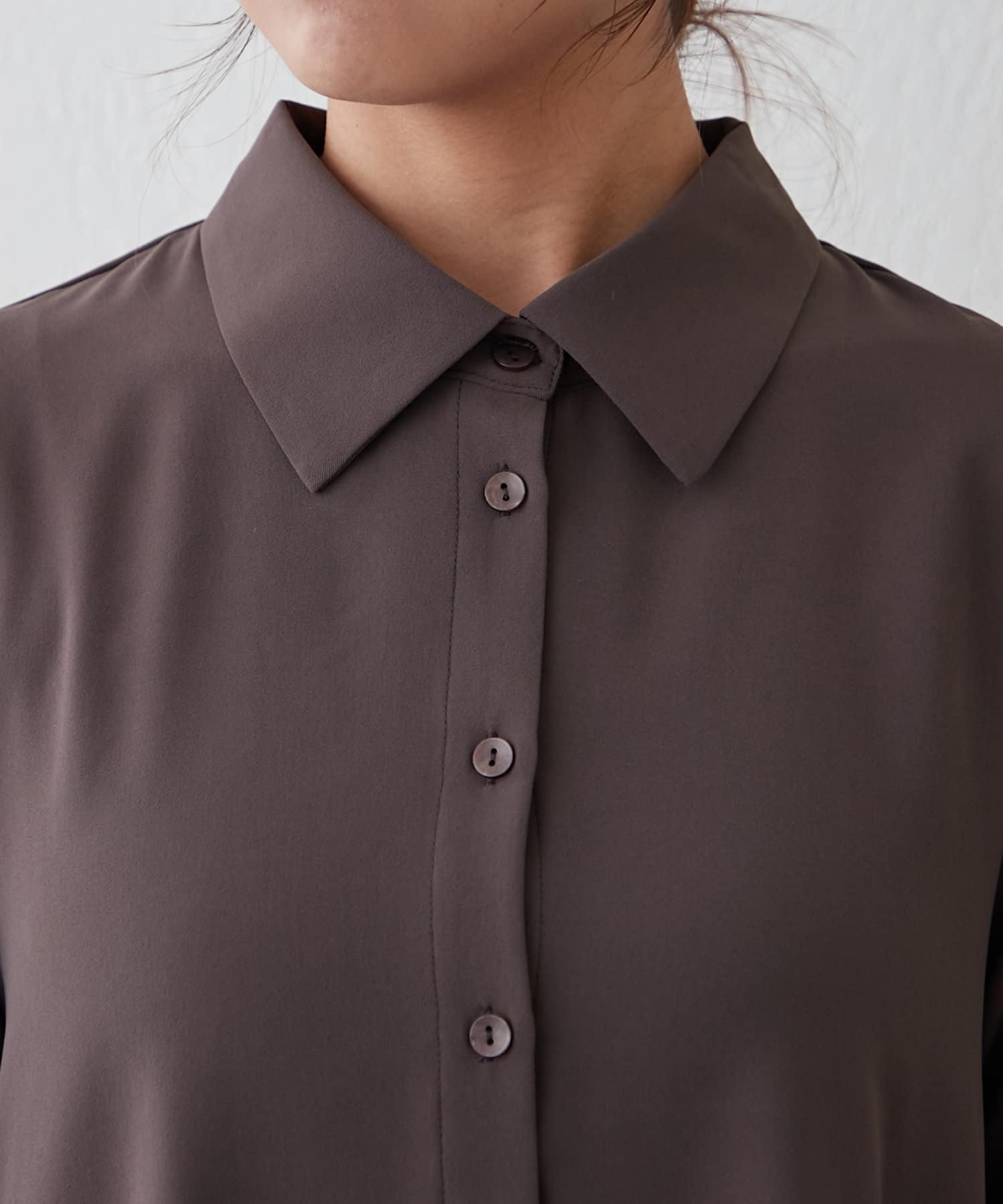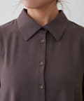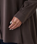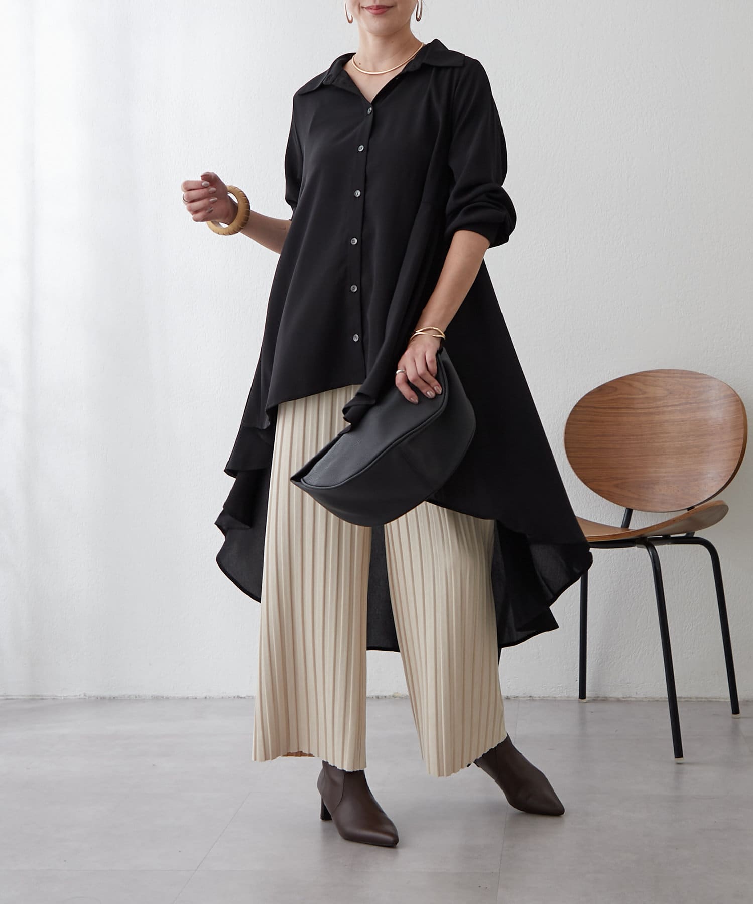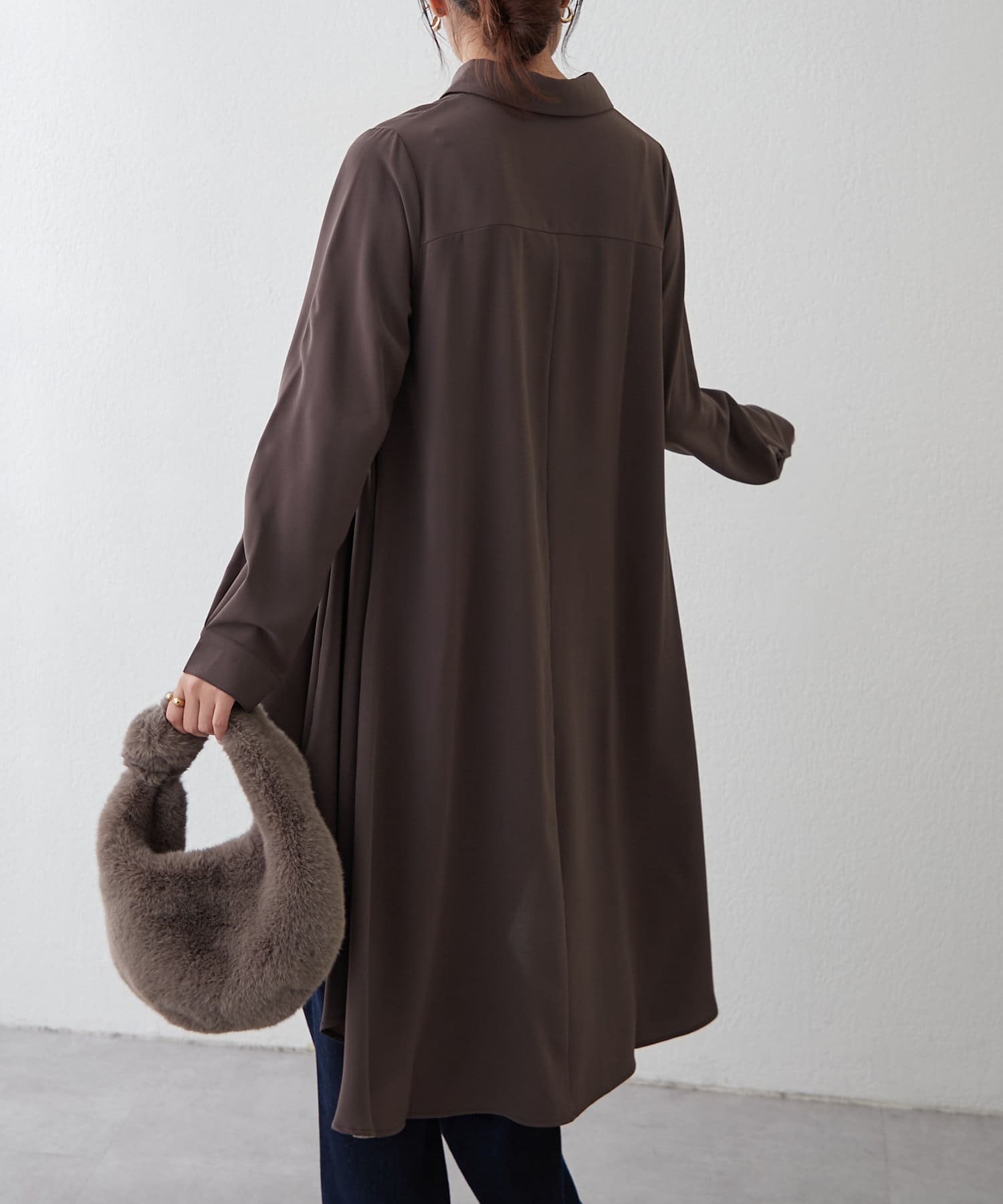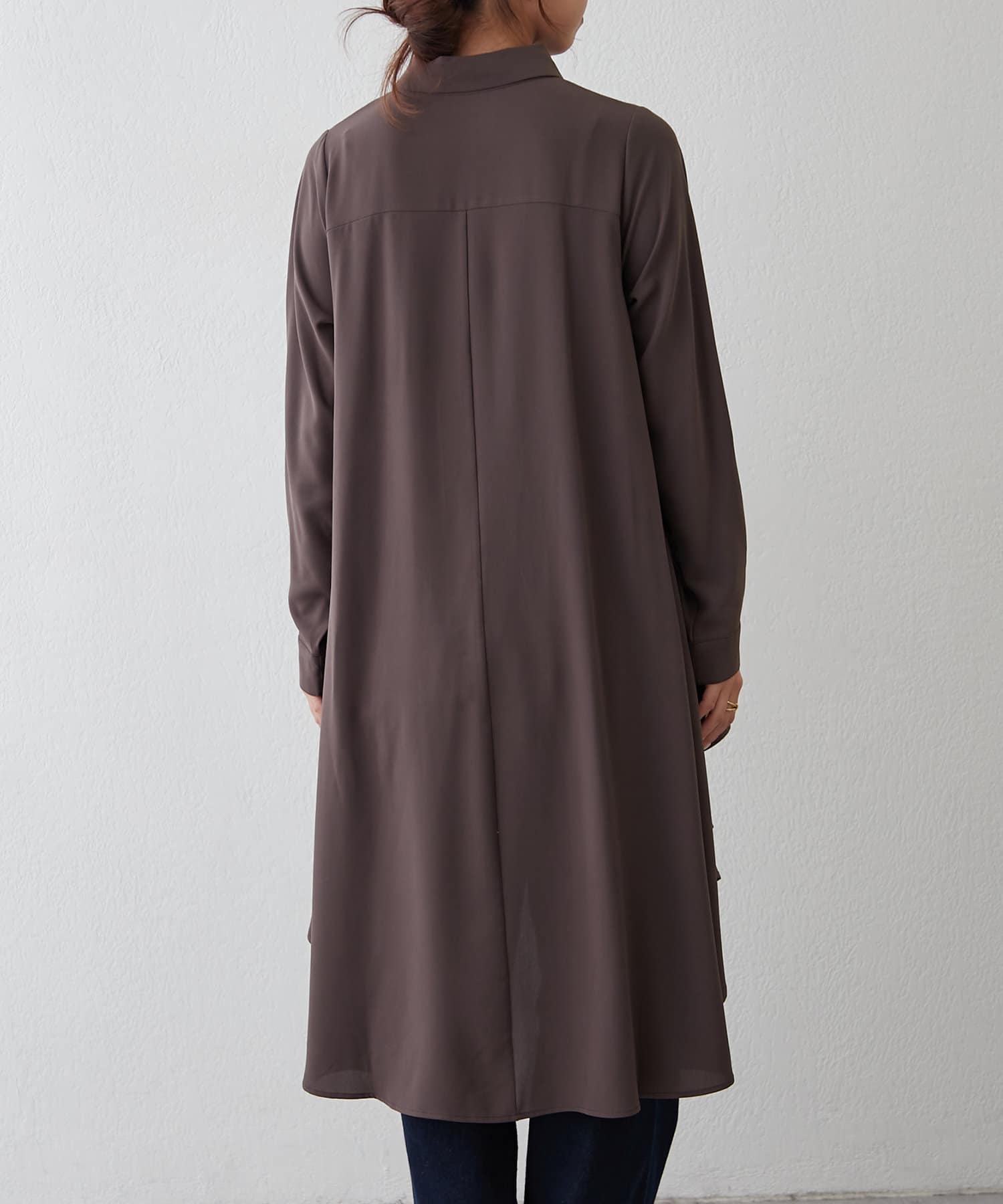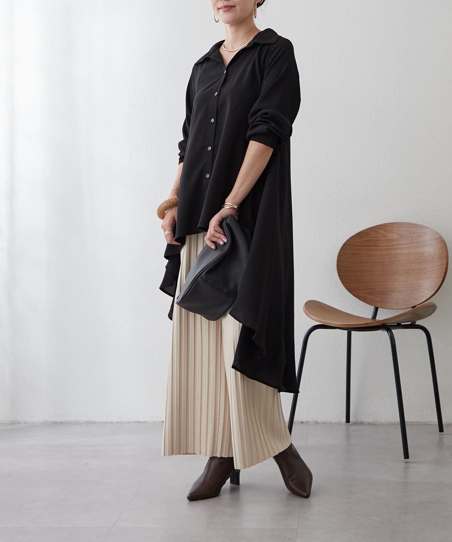 ブラウスの後ろのフレア部分を強調したエレガントなルックに。