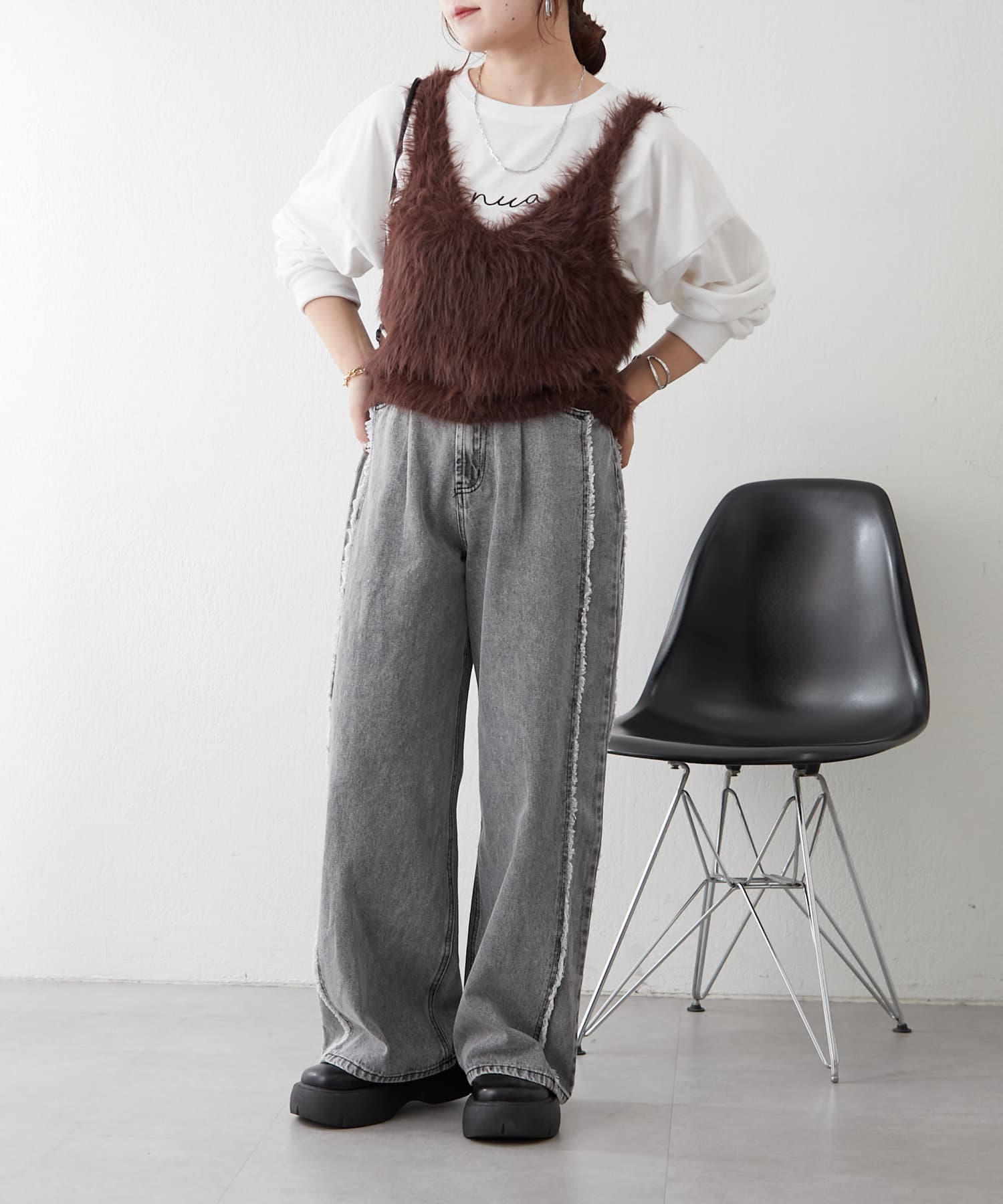 ・ロゴTシャツの上から重ねてデザインを見せるスタイリングがオススメ