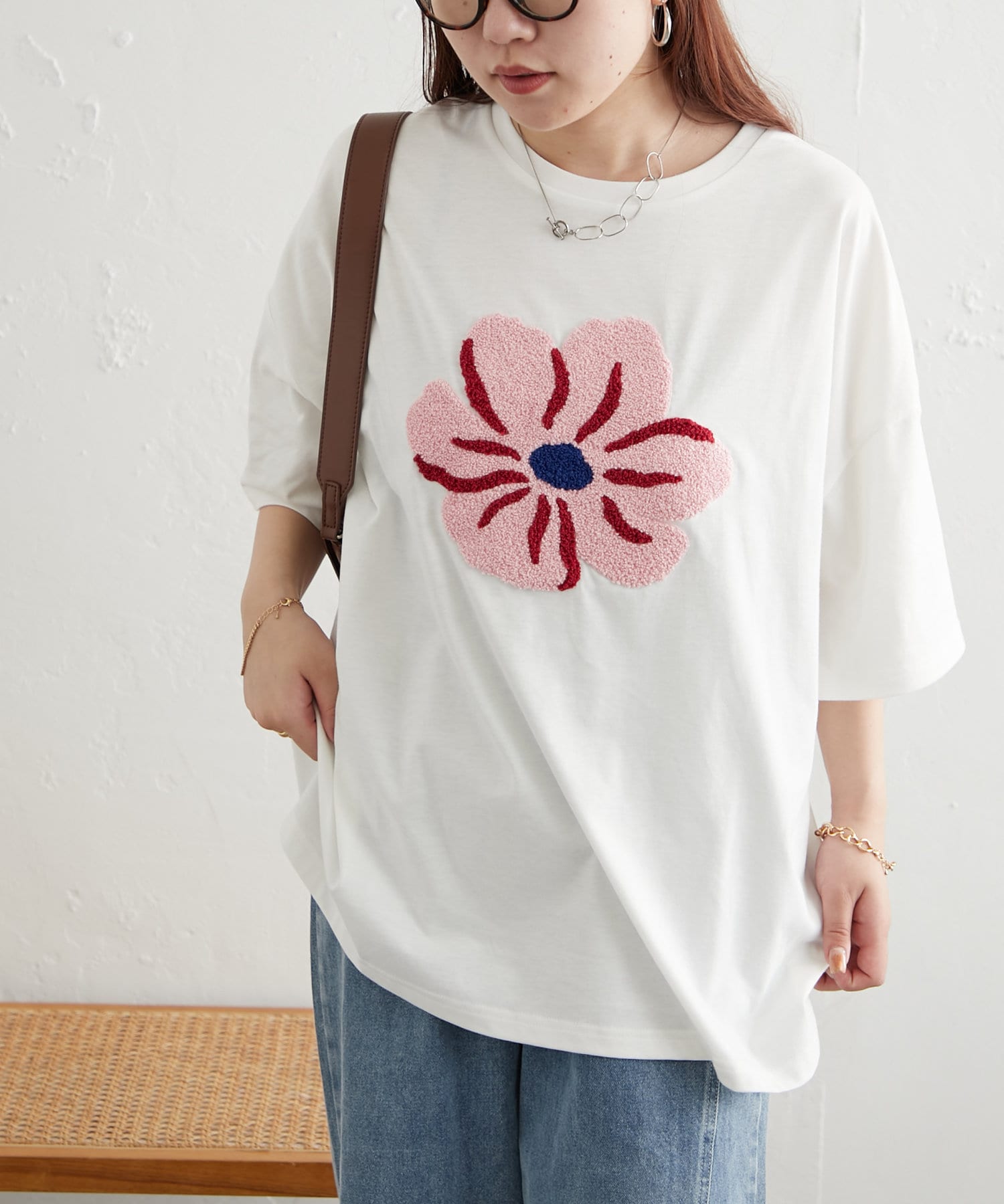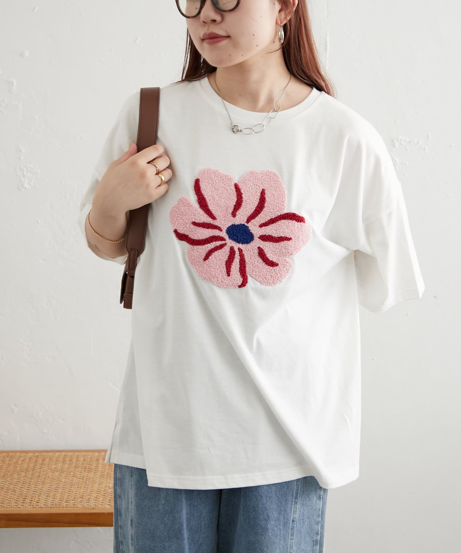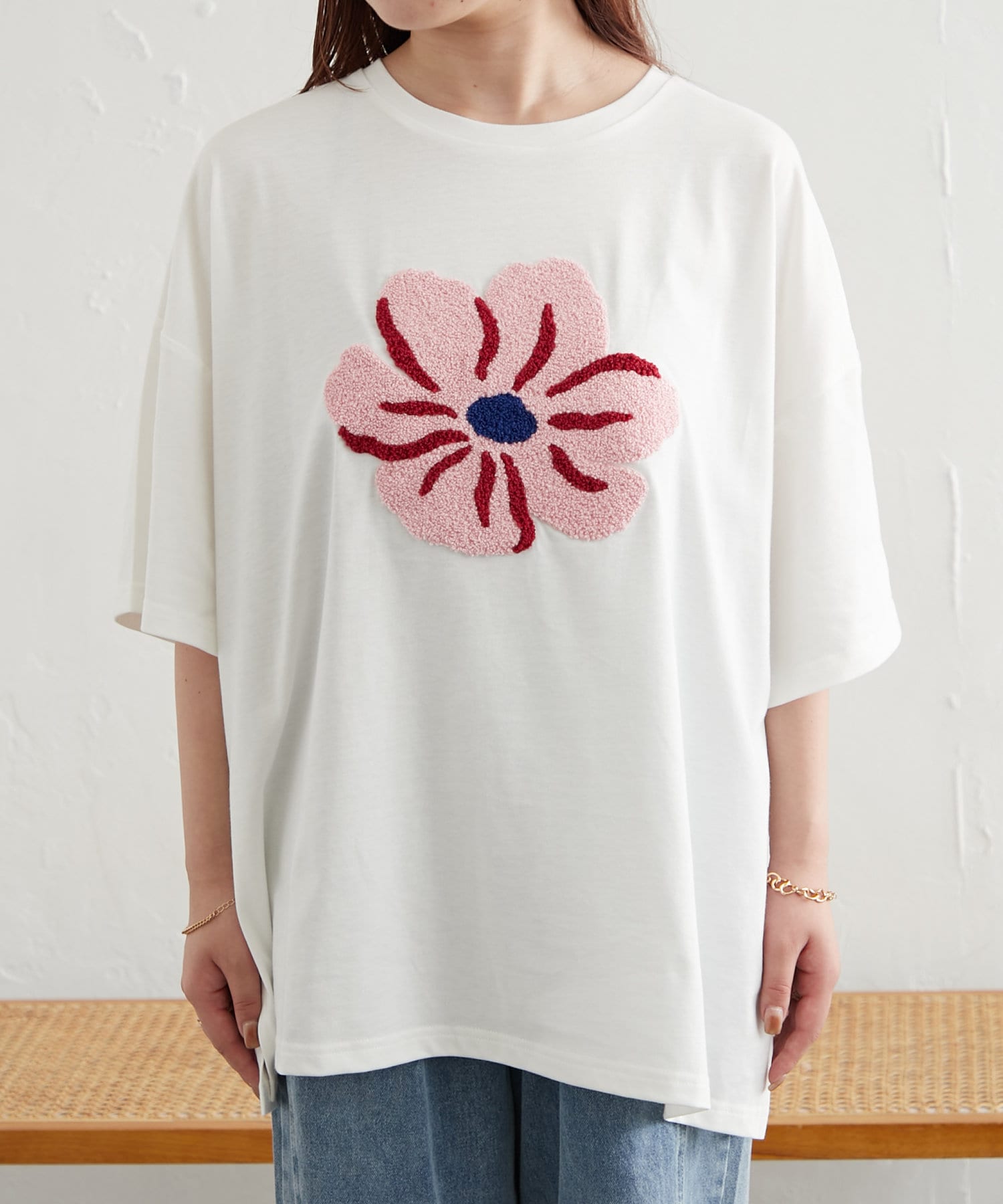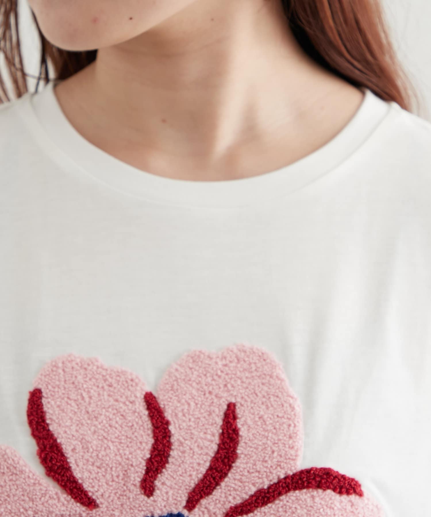 ・フラワーモチーフの立体的なサガラ刺しゅうが目を引くTシャツ。