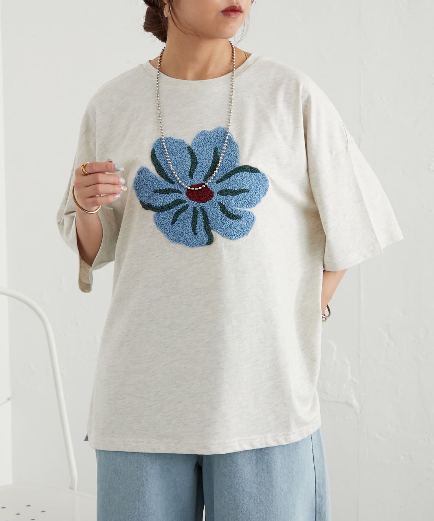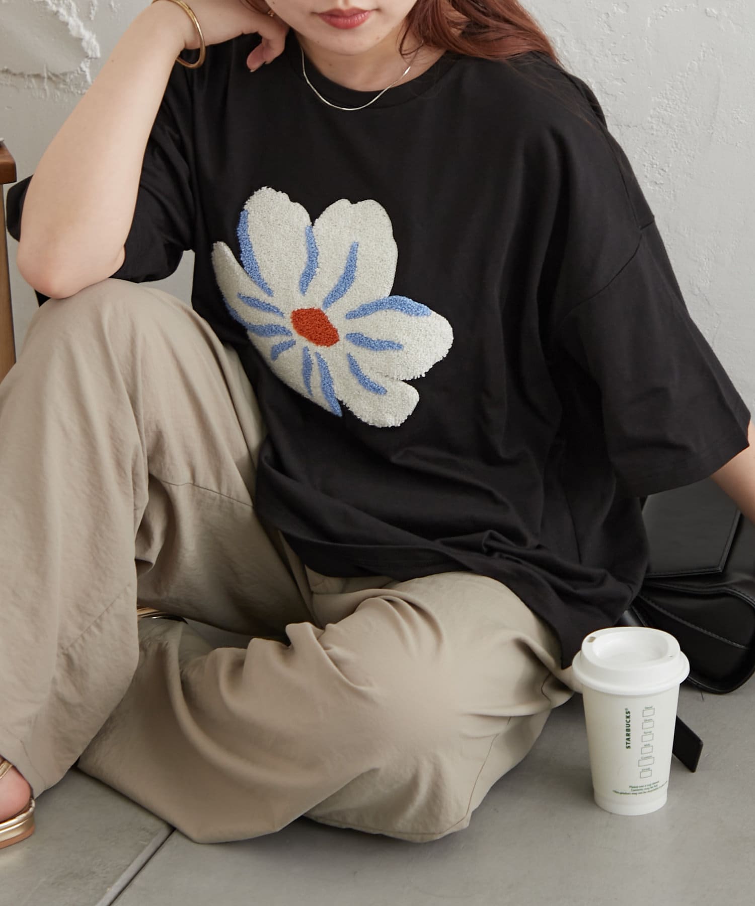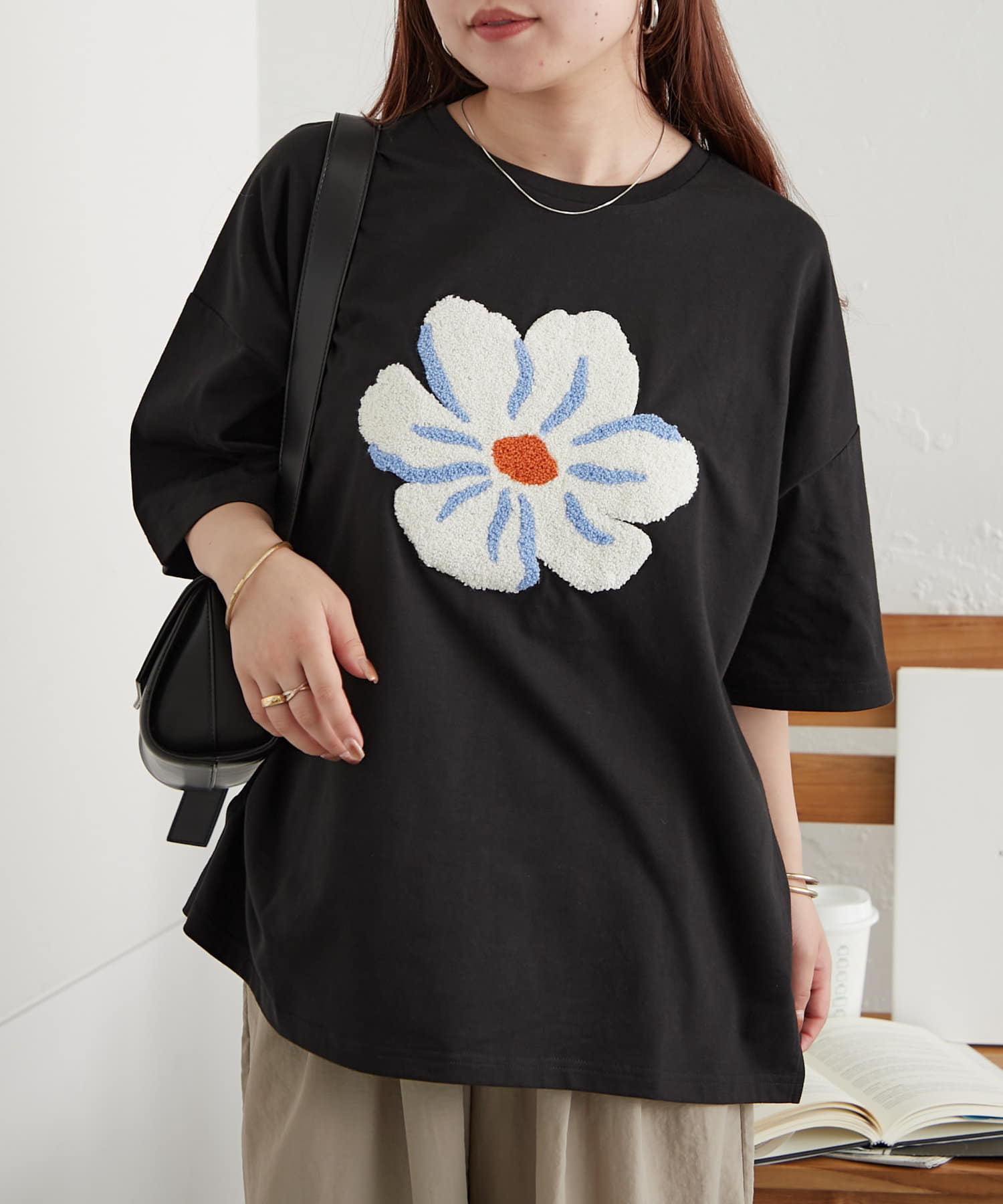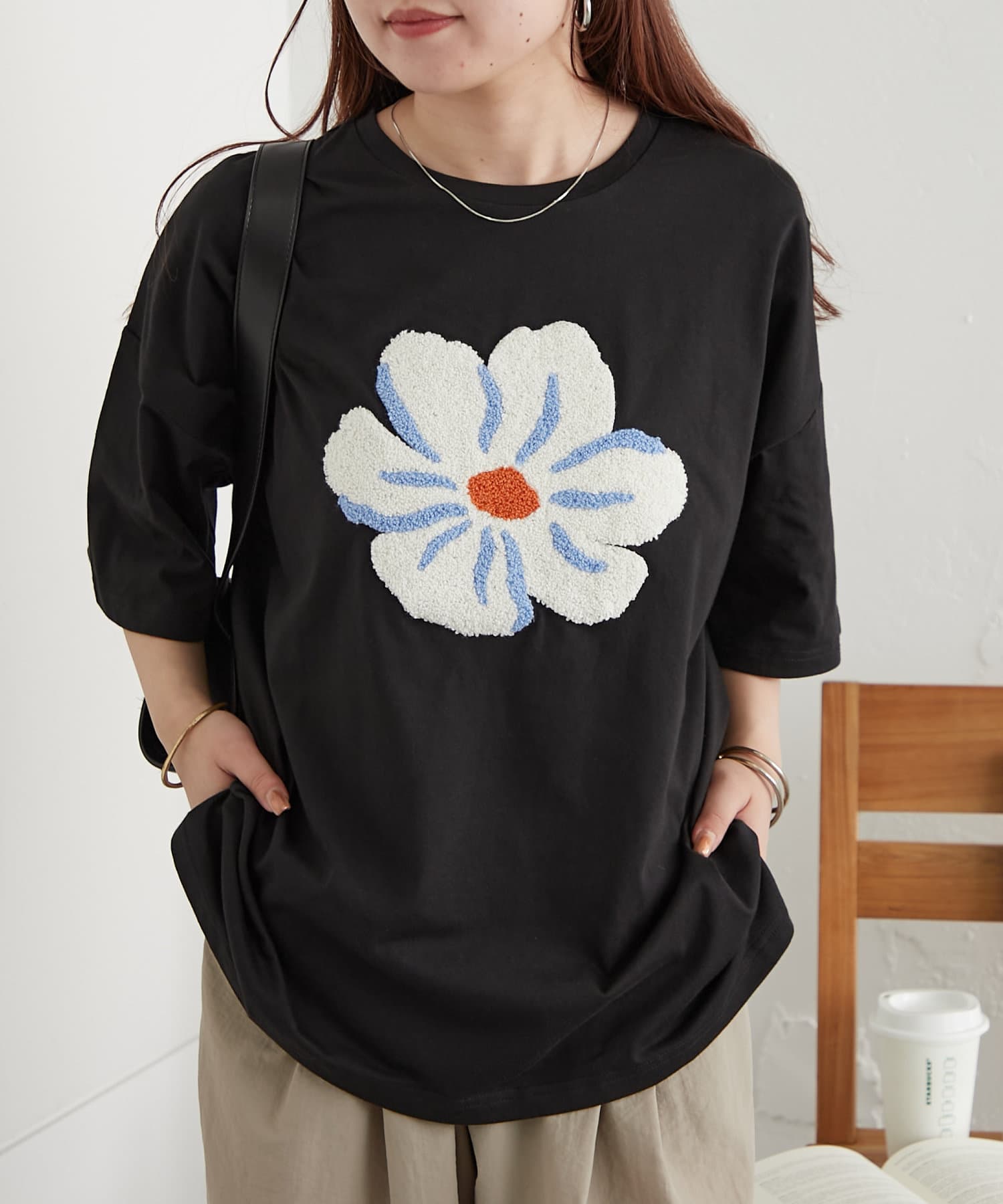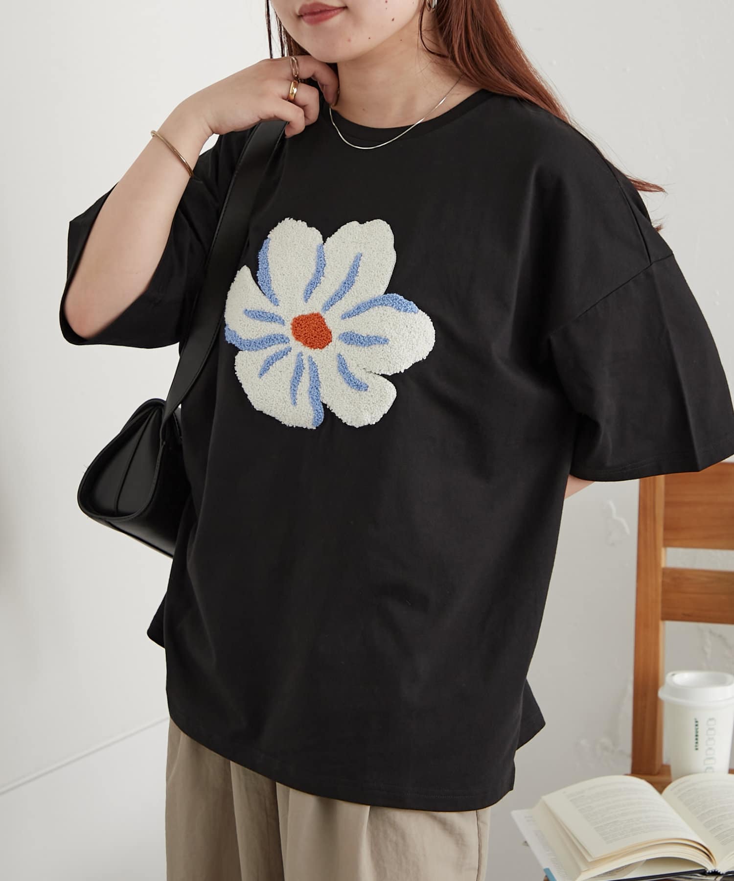 ・フラワーモチーフの立体的なサガラ刺しゅうが目を引くTシャツ。