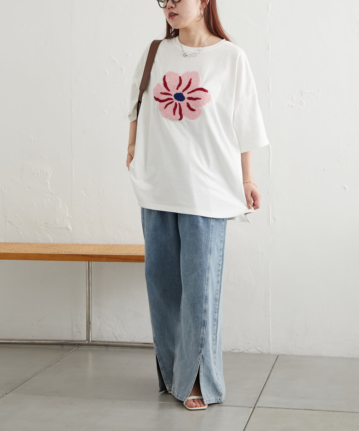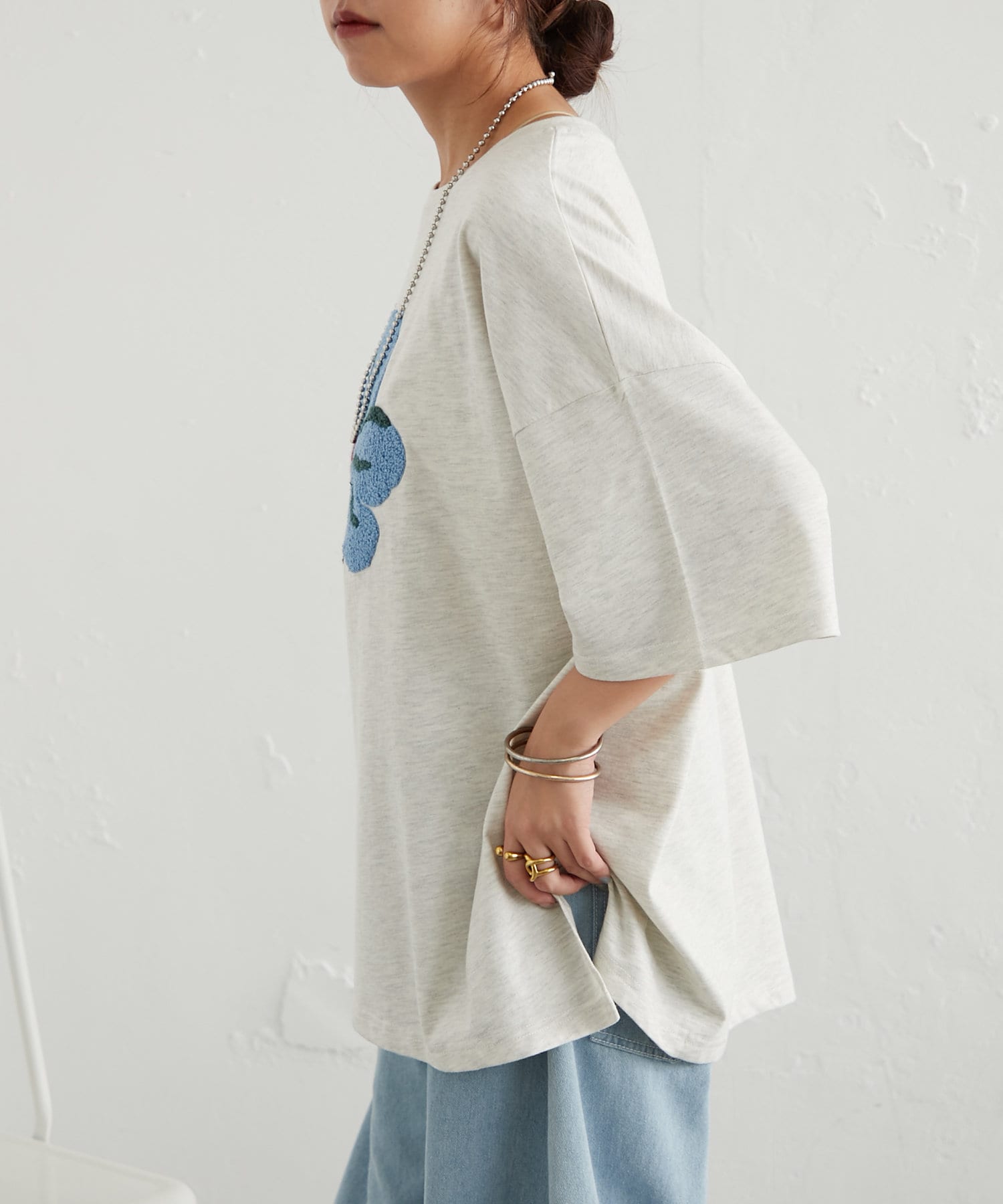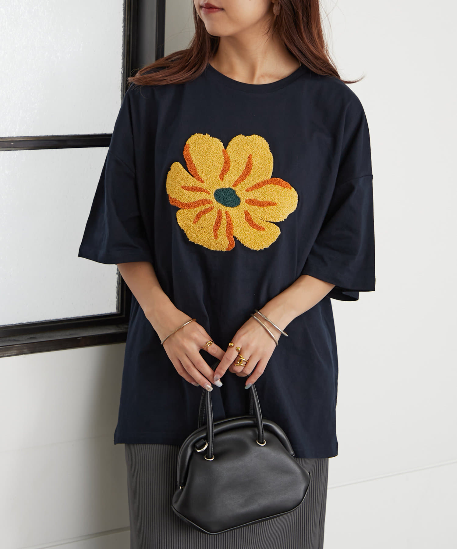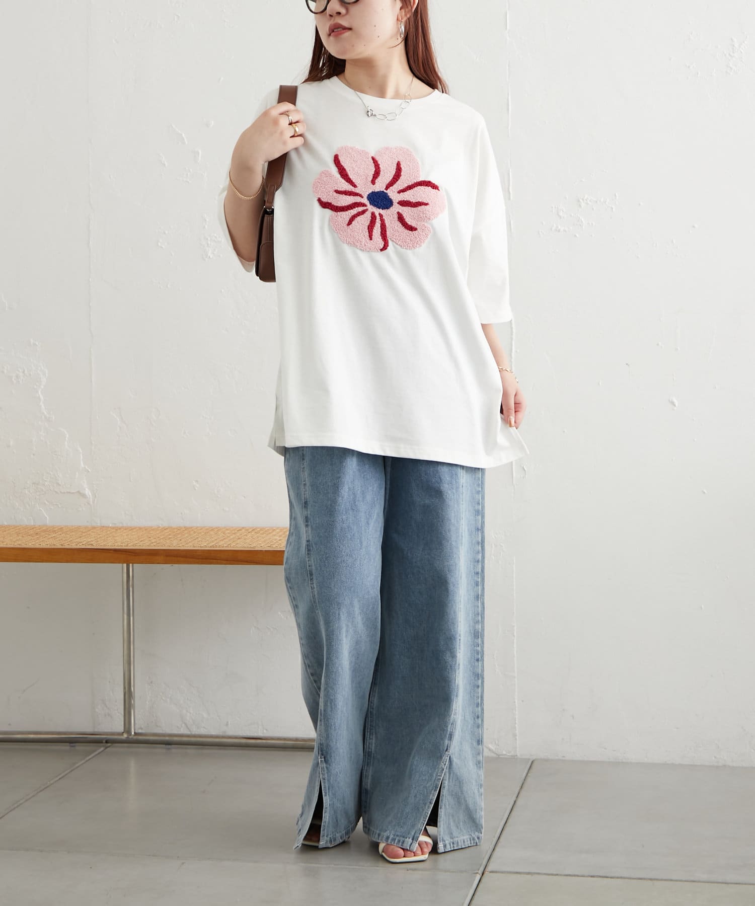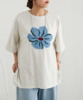 ・フラワーモチーフの立体的なサガラ刺しゅうが目を引くTシャツ。