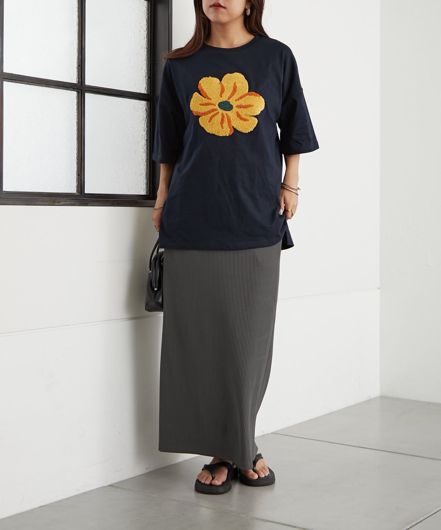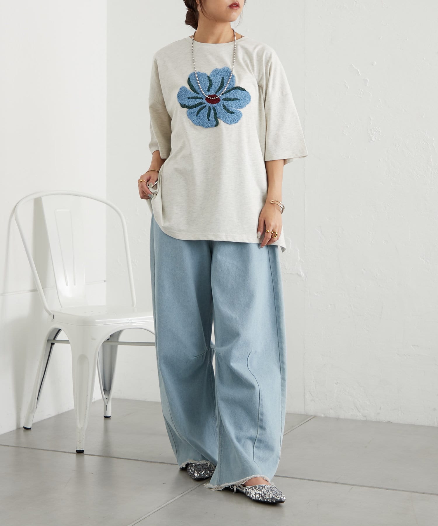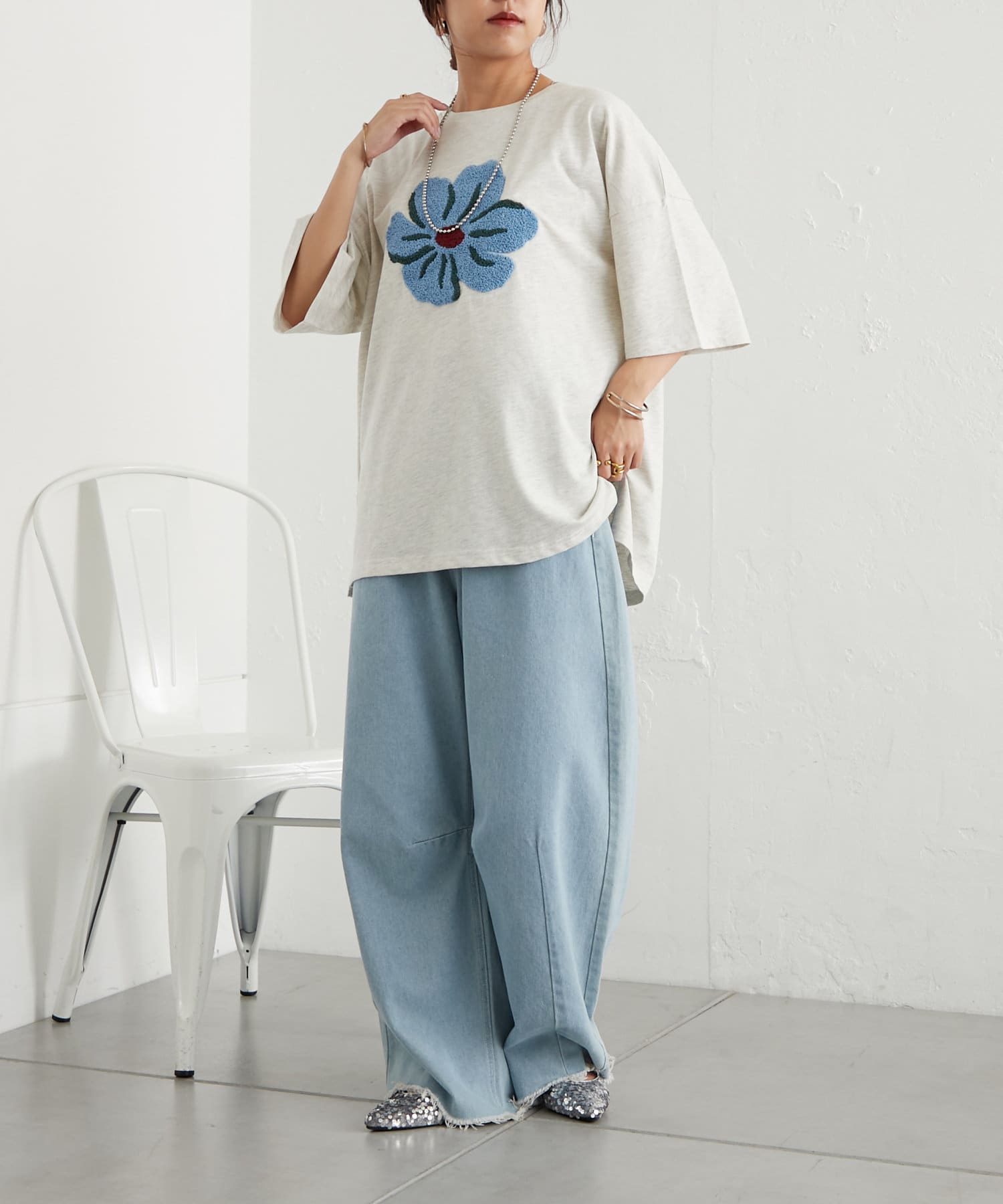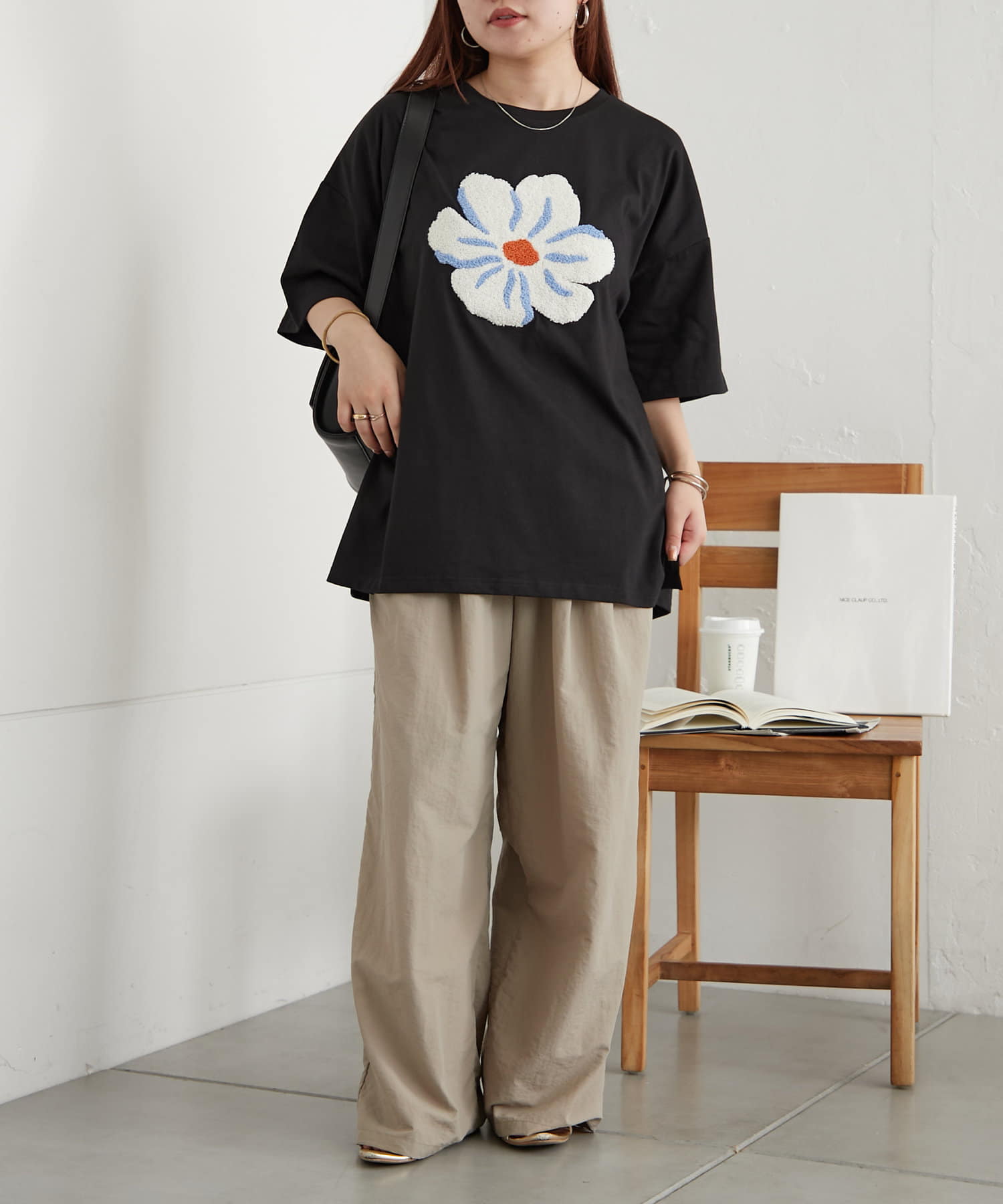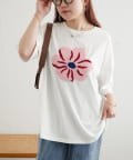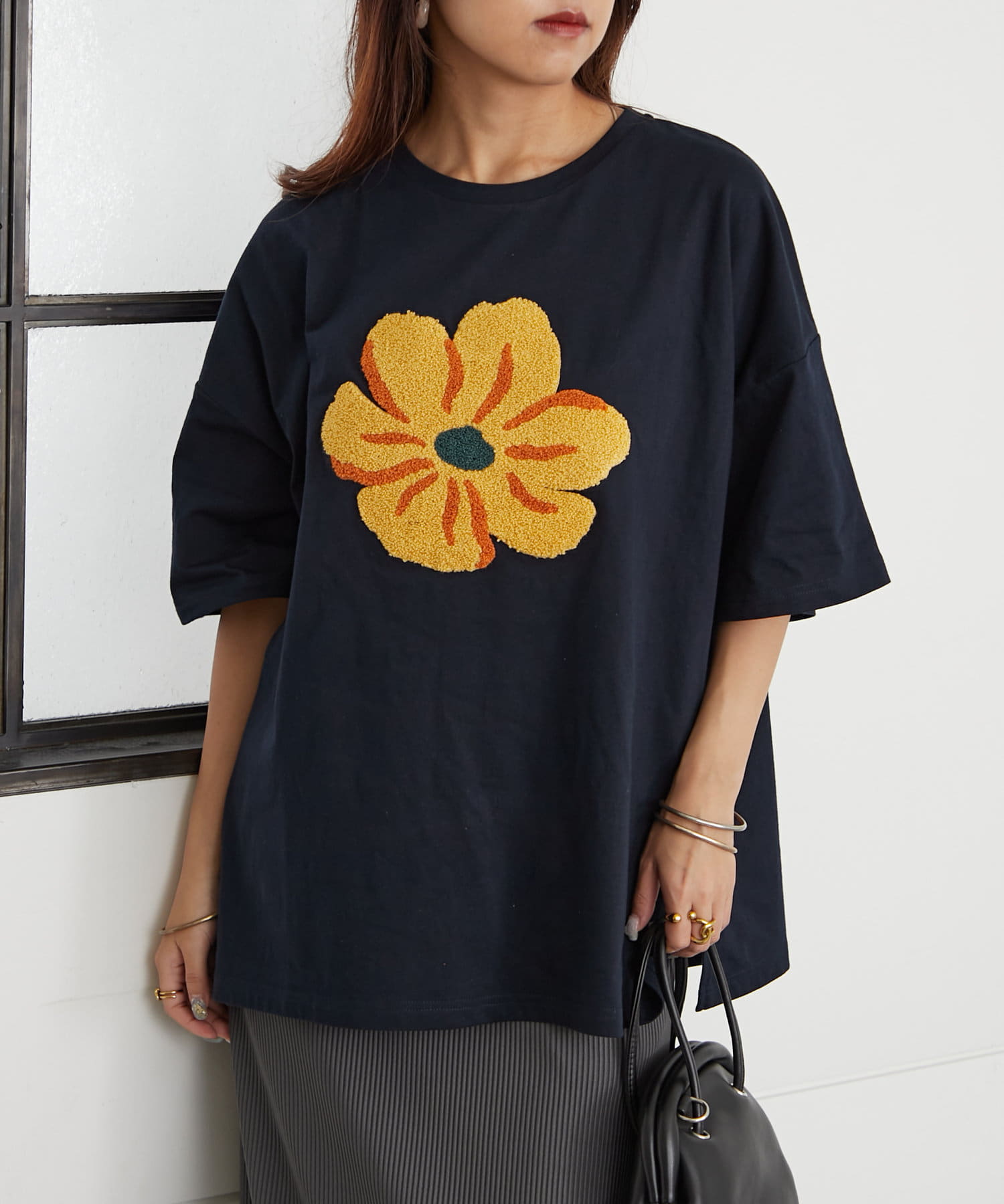 ・フラワーモチーフの立体的なサガラ刺しゅうが目を引くTシャツ。