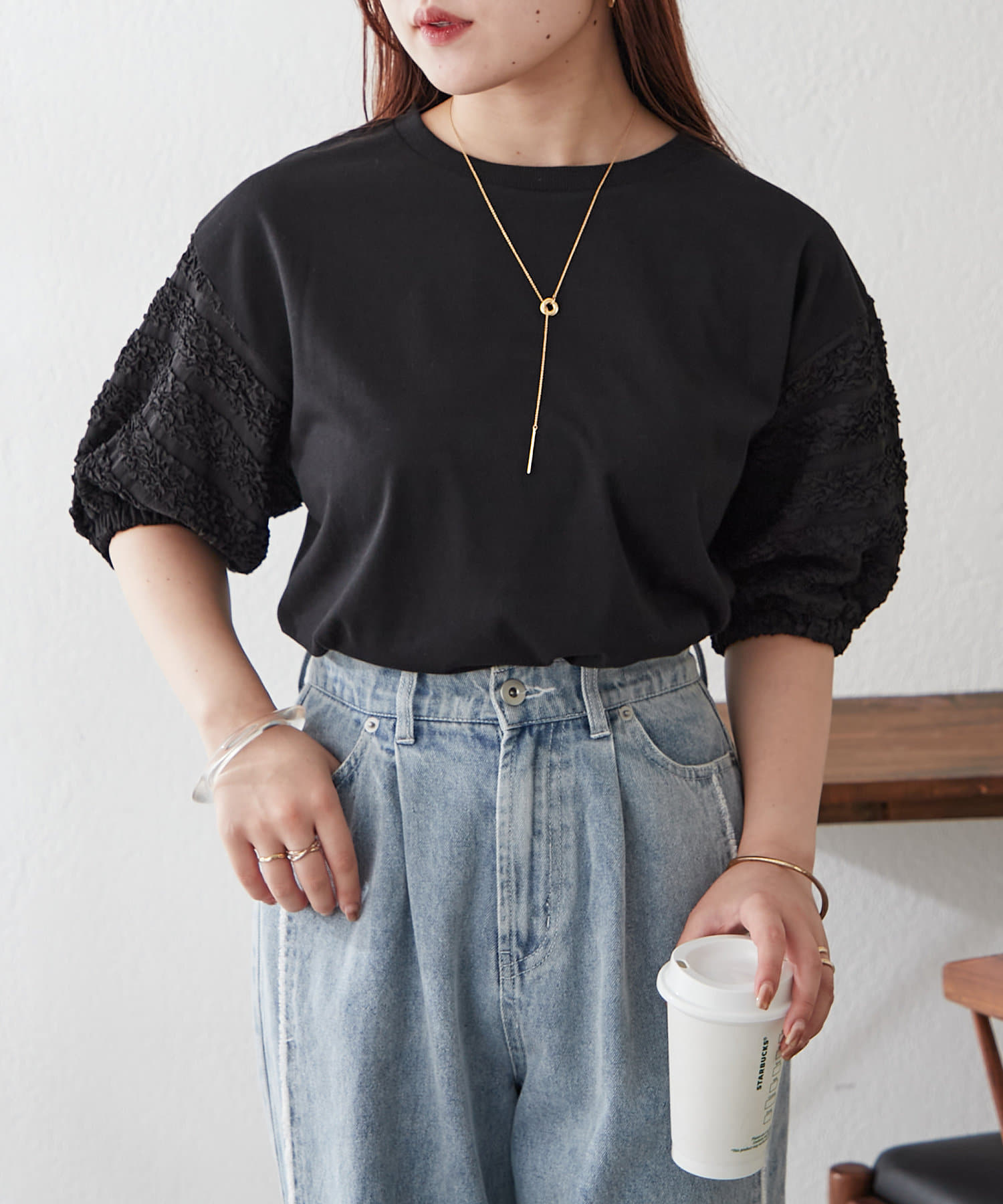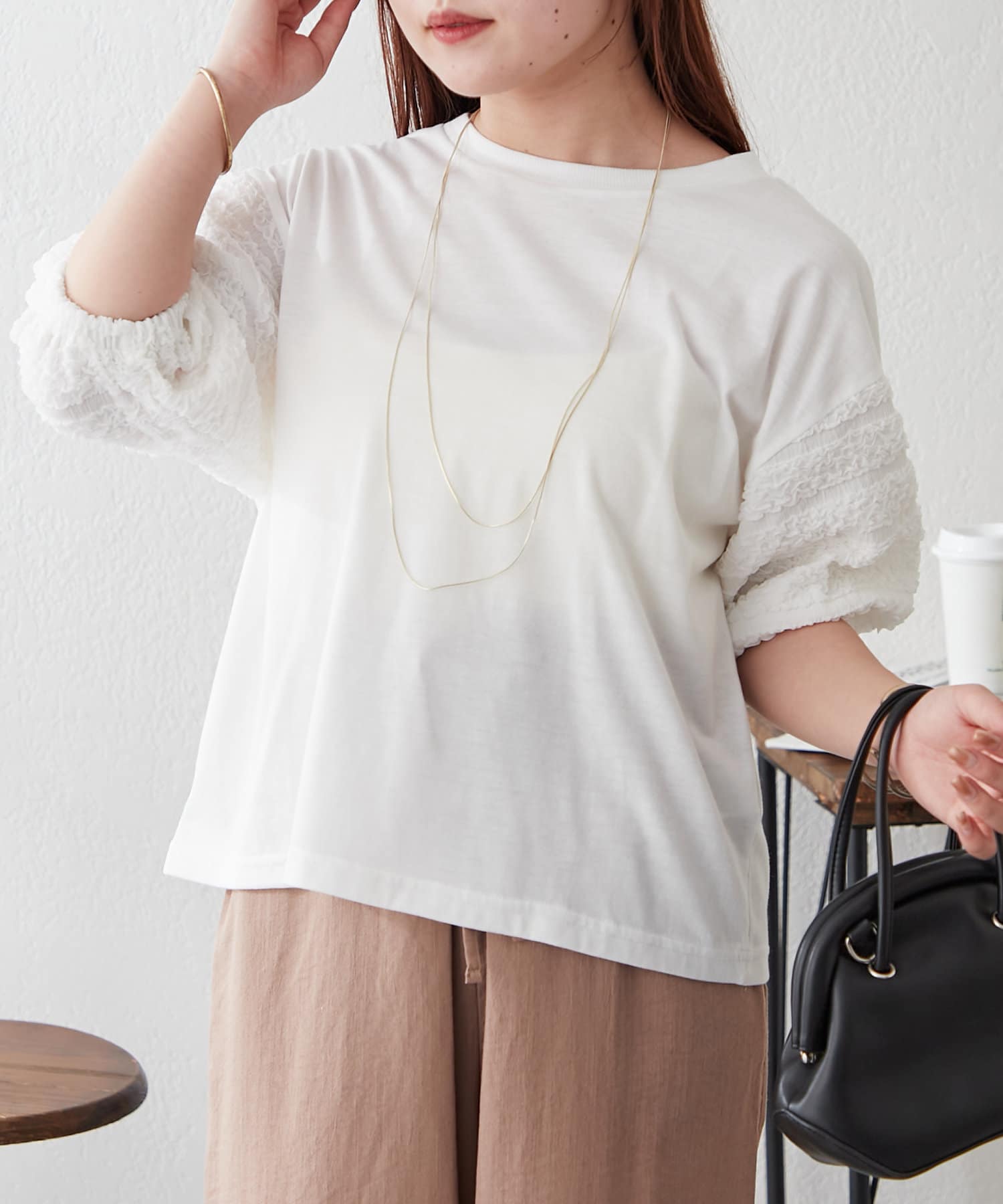 【ふんわり袖で、二の腕カバー◎】異素材袖Tシャツ