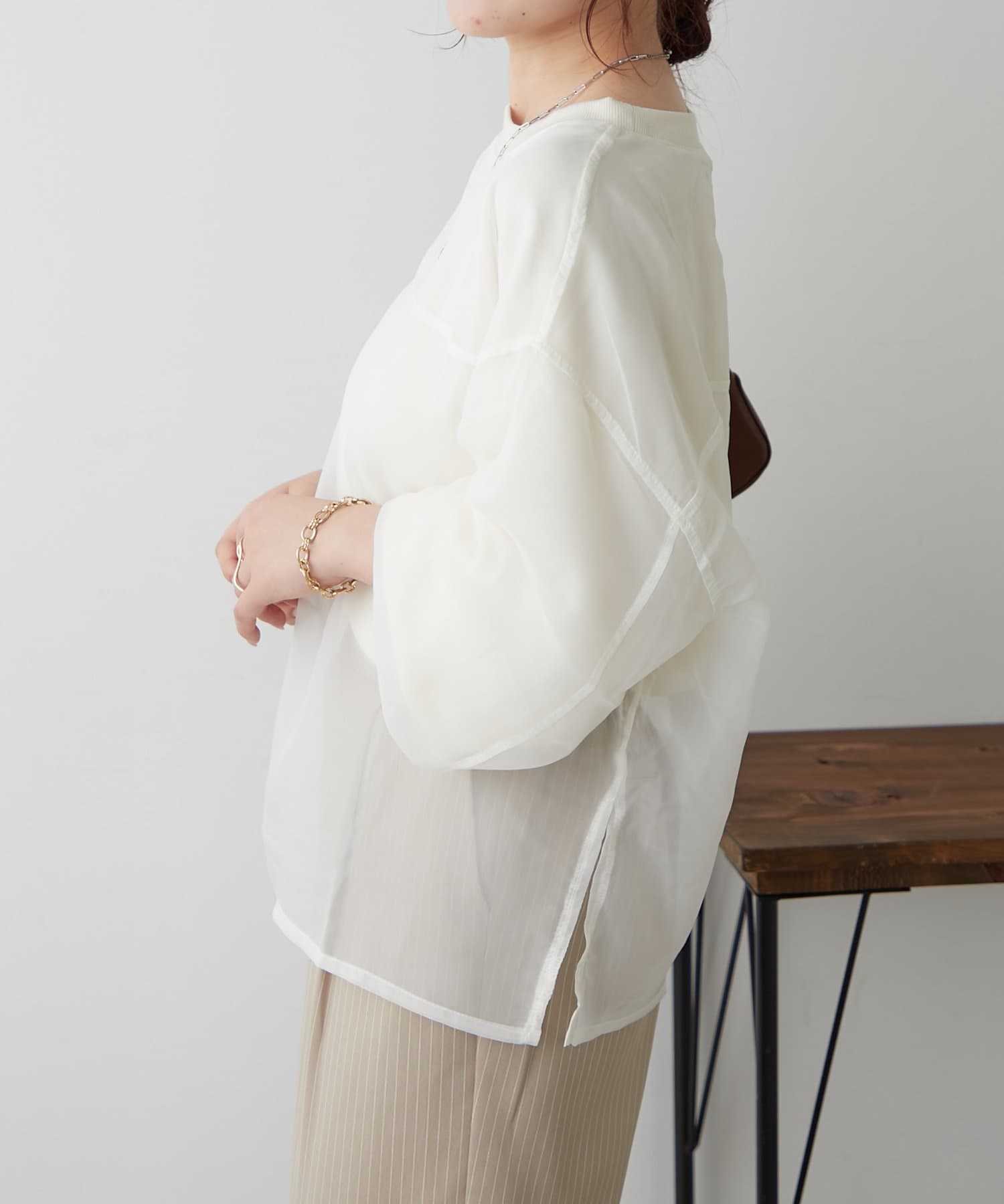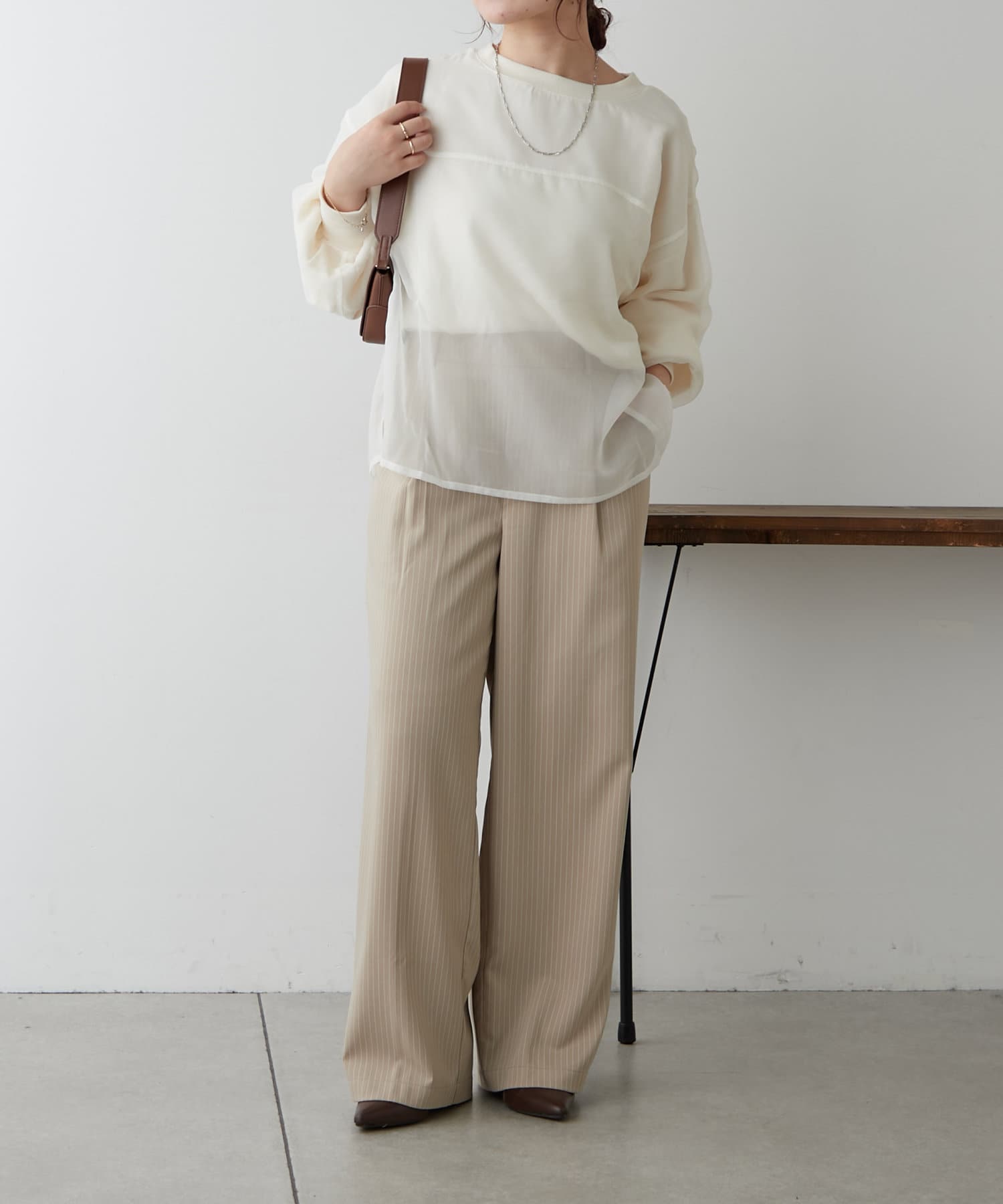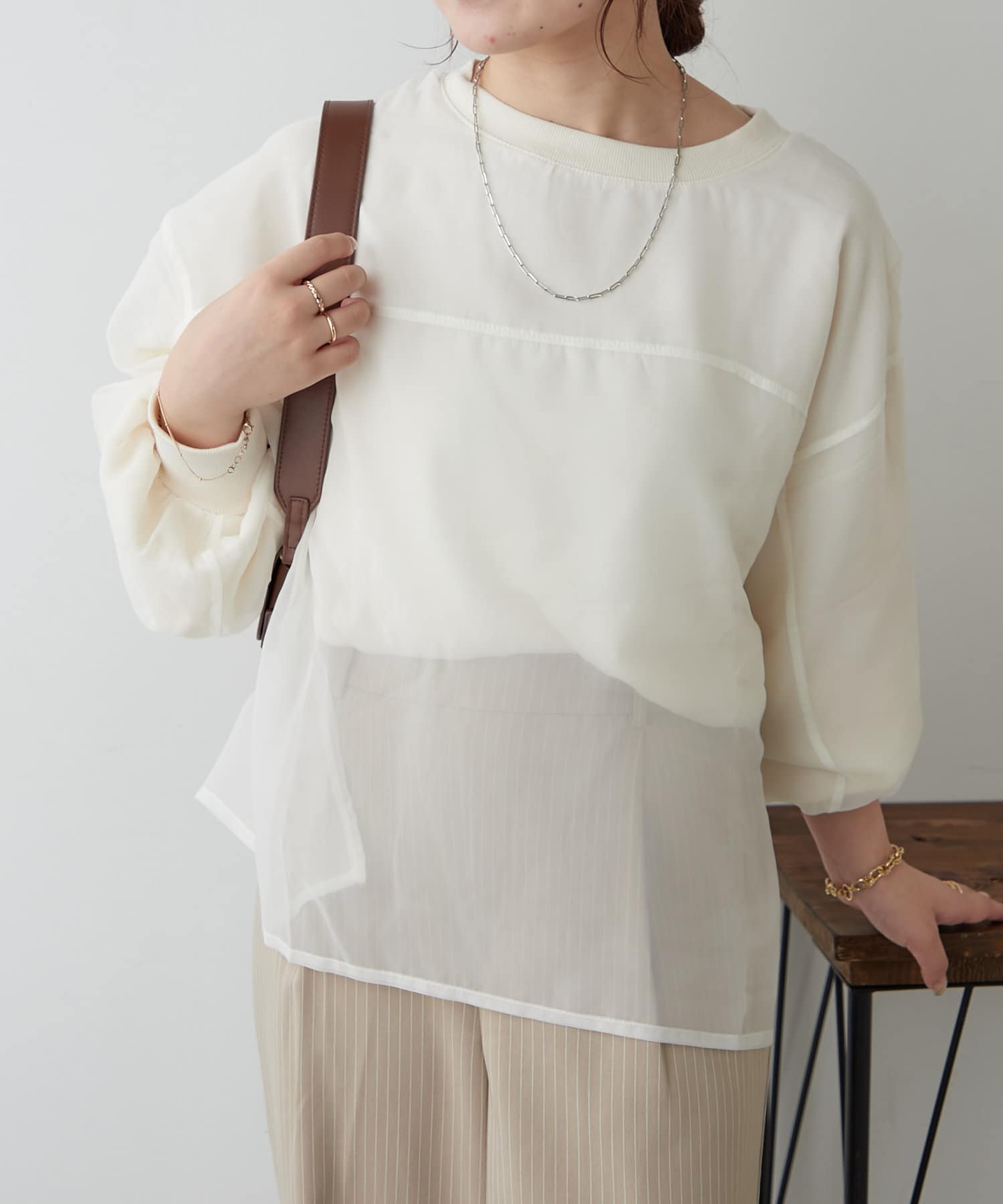 ・中のトップスだけをインしてシアー部分はアウトで着てあげるとこなれた印象に!