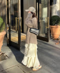 着用感:ウエストで履いても足首まで十分に丈があるので、高見えするスカート!ウエストはゴムがあるので、低身長の方でも綺麗に履いていただけます!