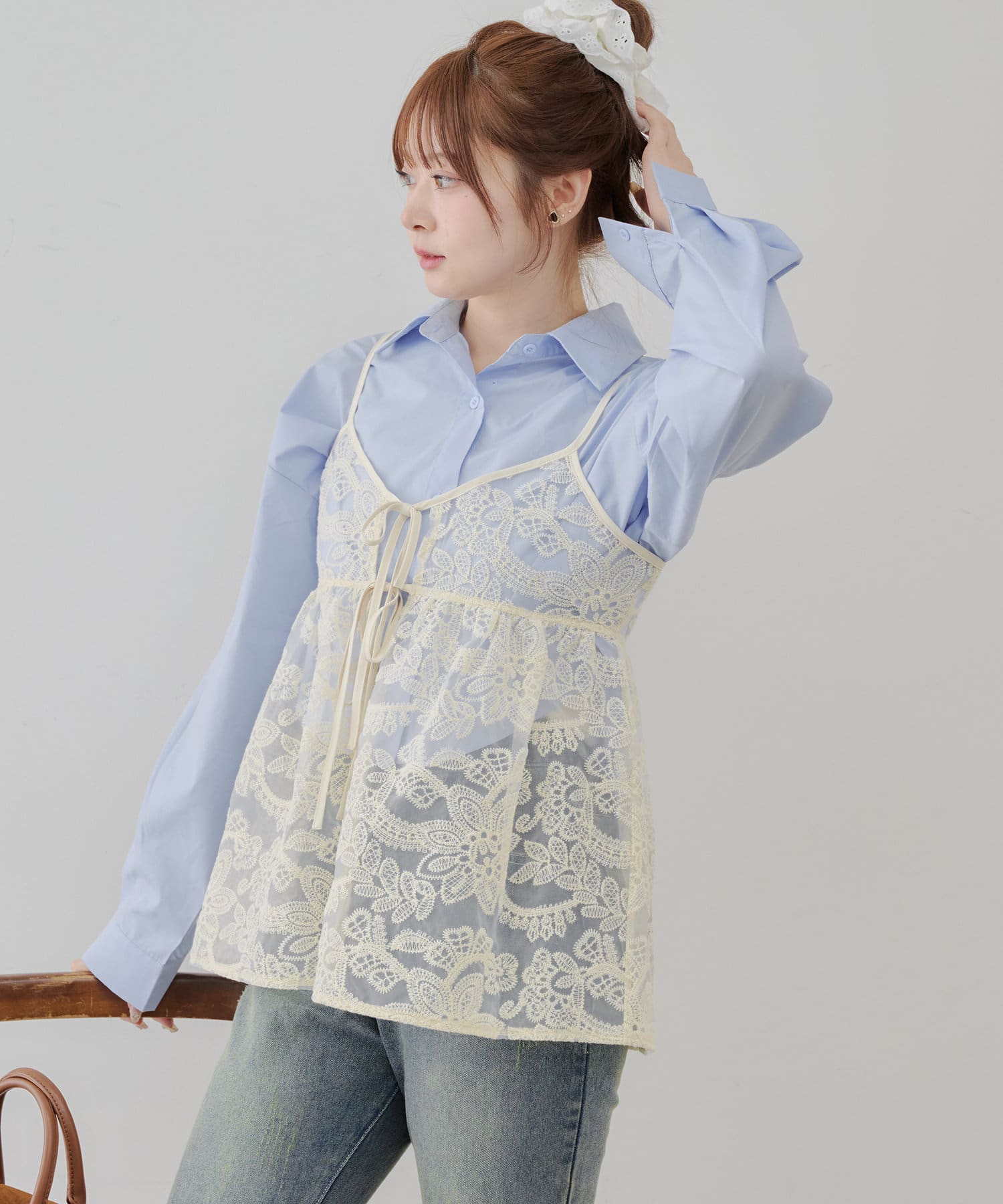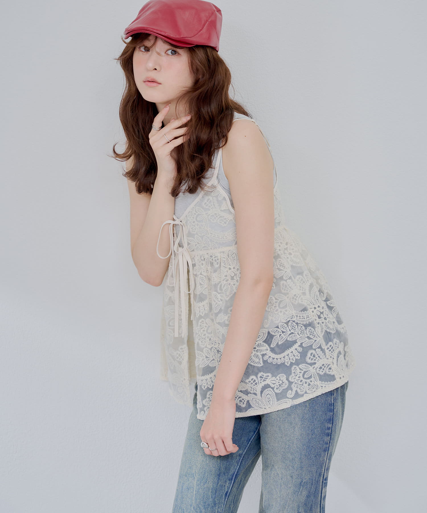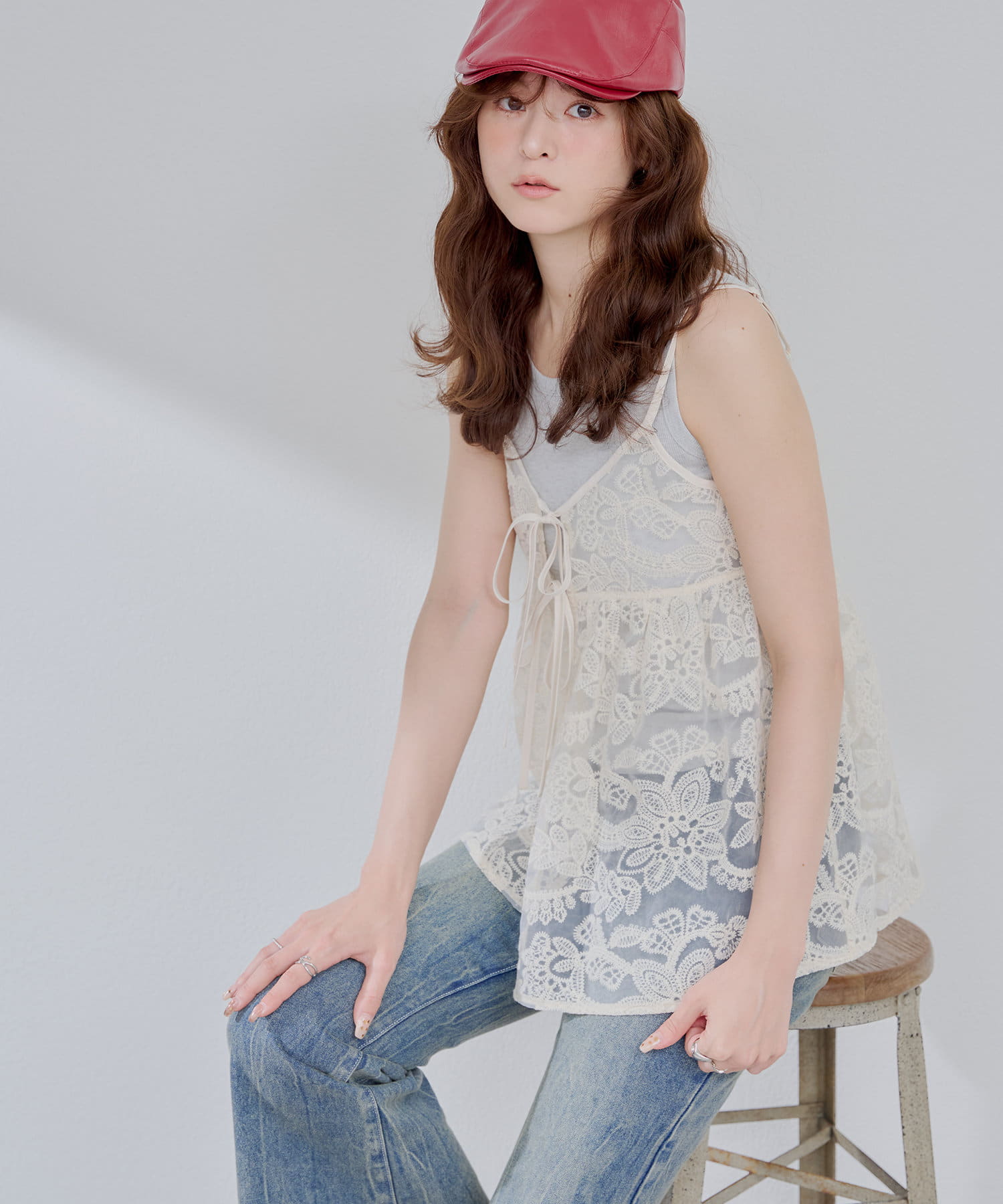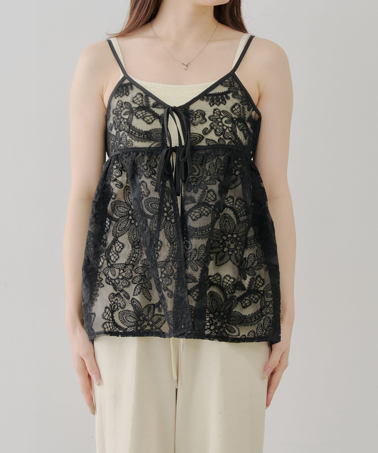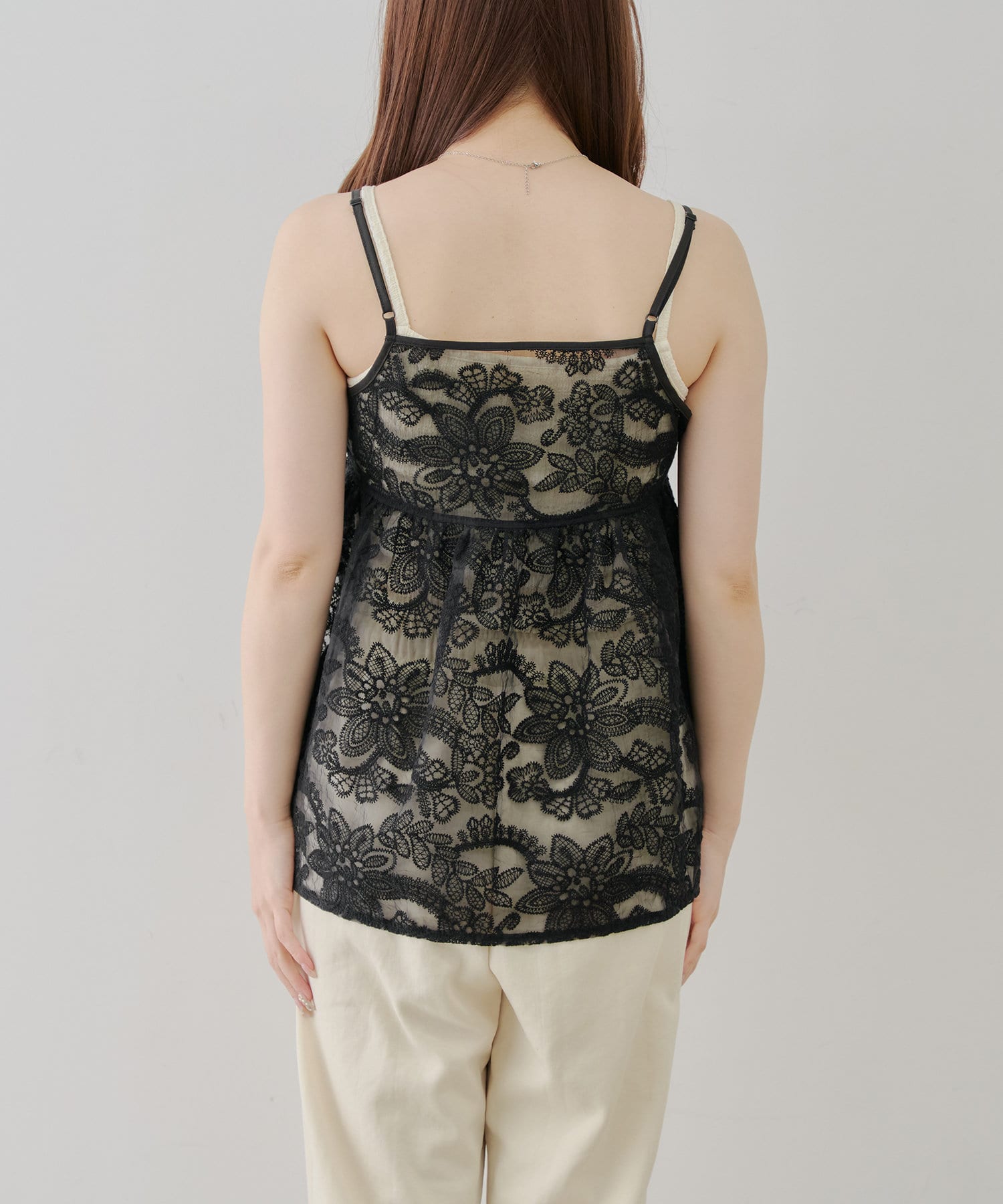 シンプルなコーディネートに足すだけで目を惹くレイヤードスタイルに。透け感のある刺繍デザインが女性らしい雰囲気を演出します。