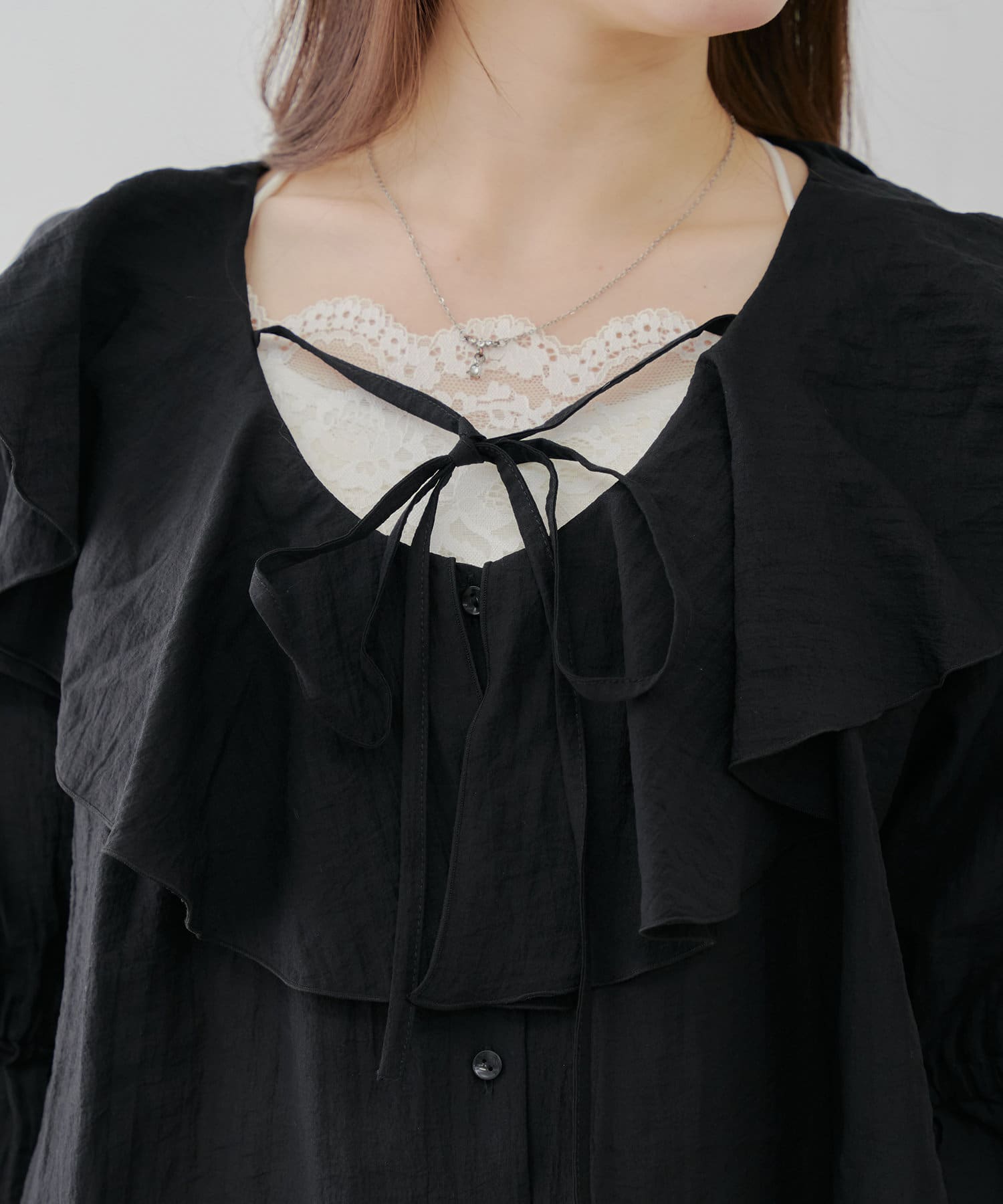 着用感:首元の紐をリボン結びすると華奢見えして