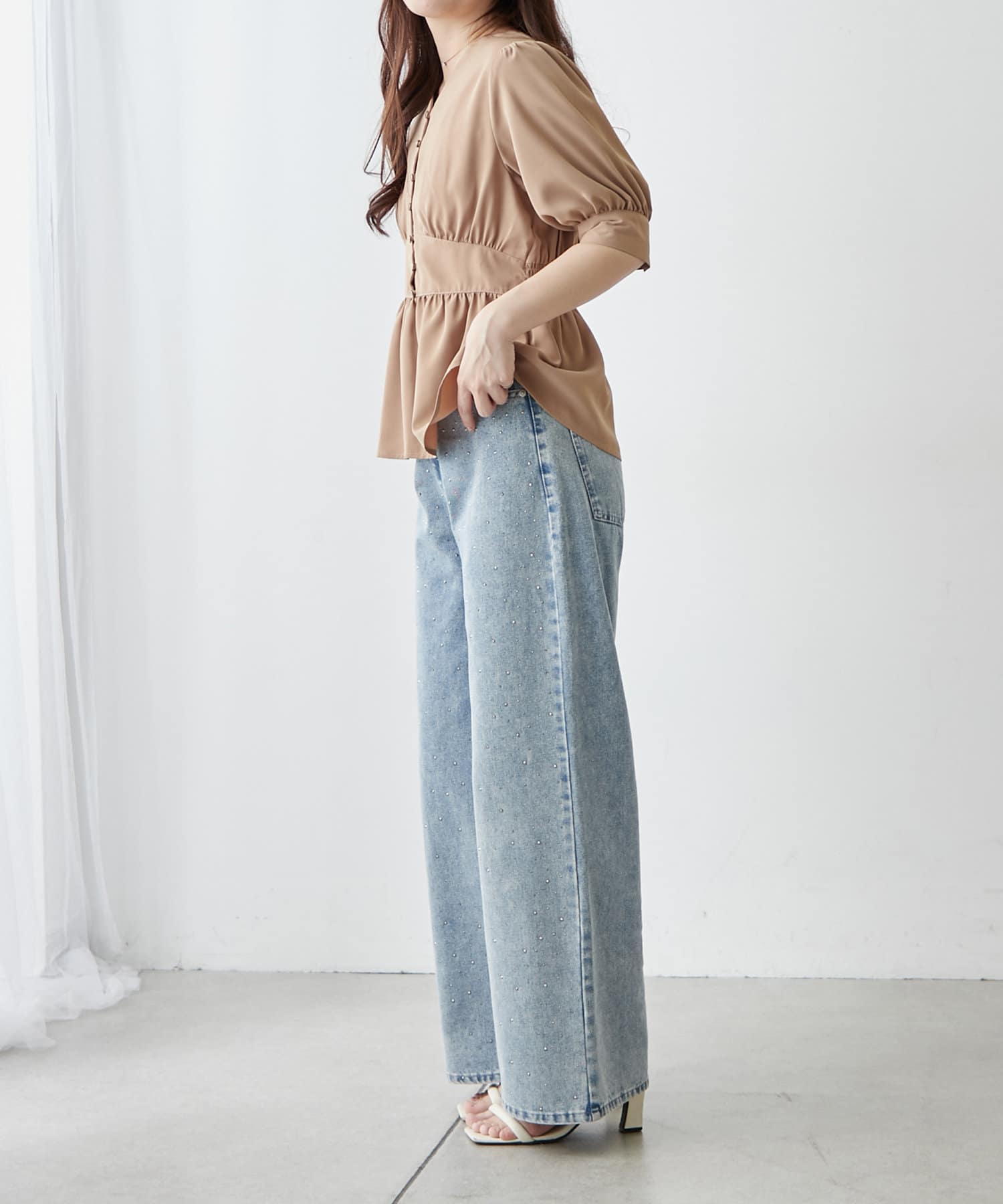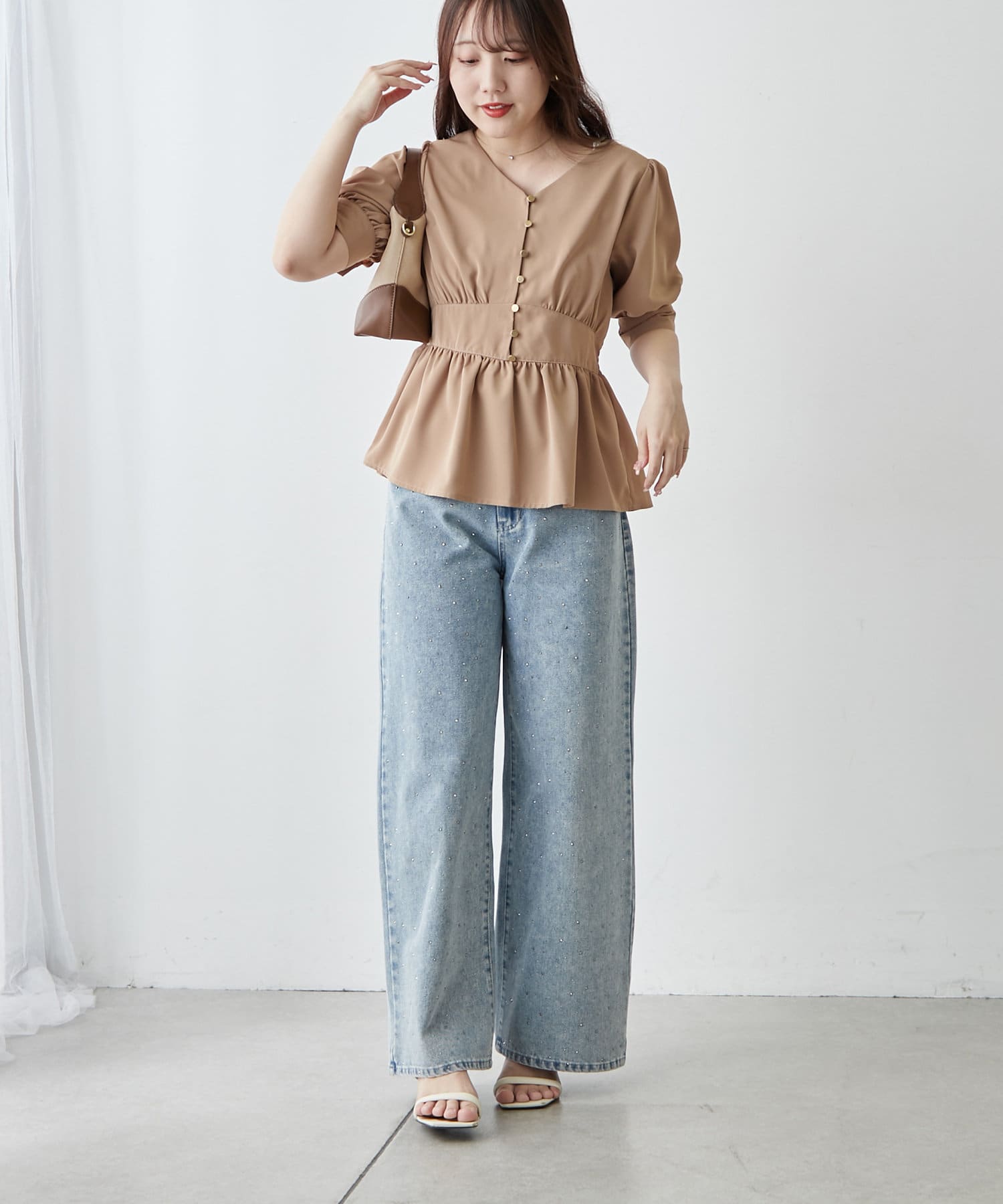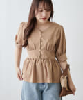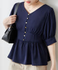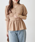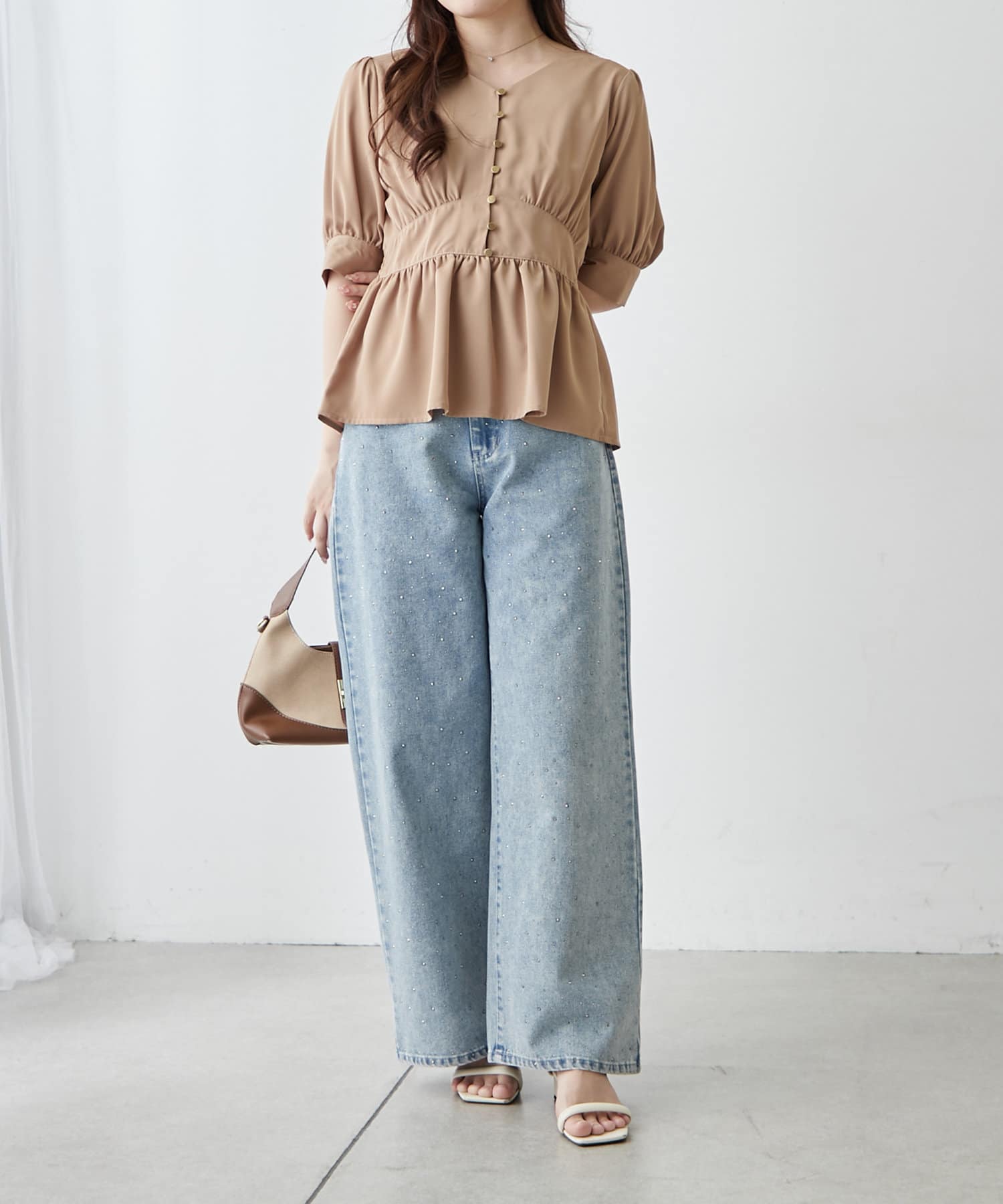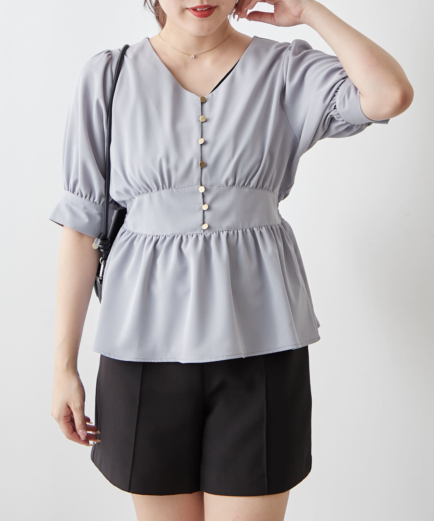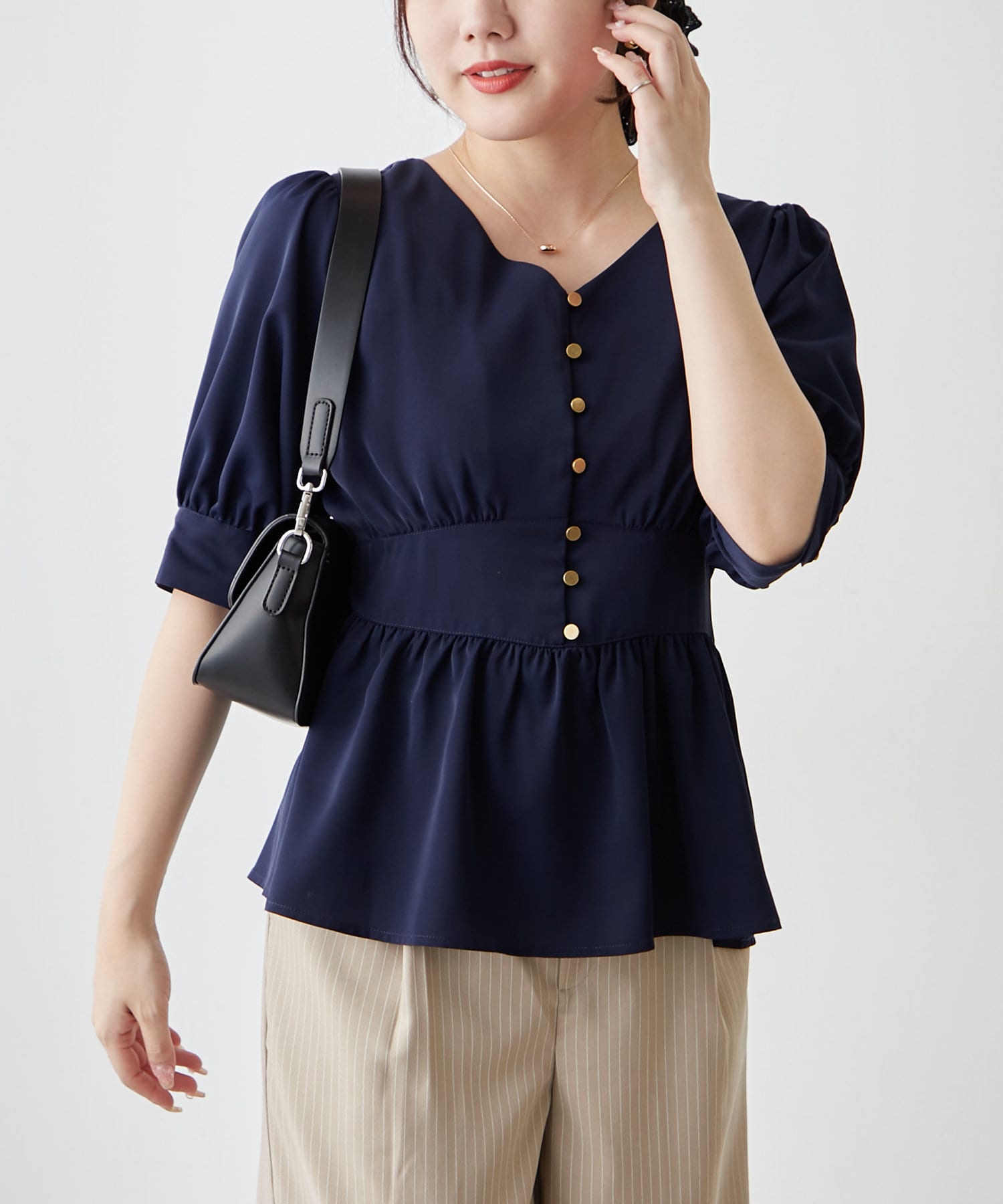 ・ウエスト切替位置を高めに設定し、ペプラムのふわっと感で細見えが叶うシルエットに。