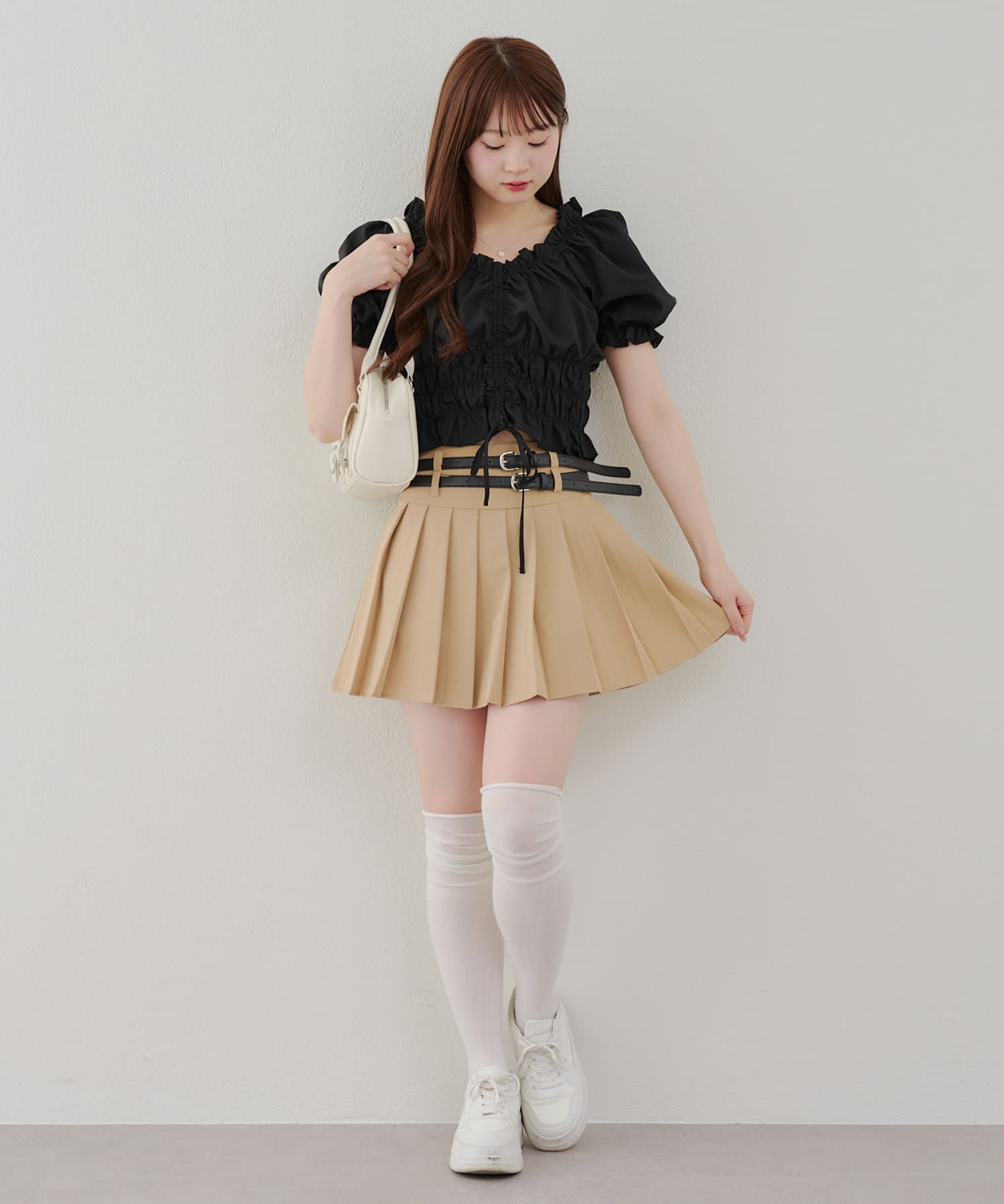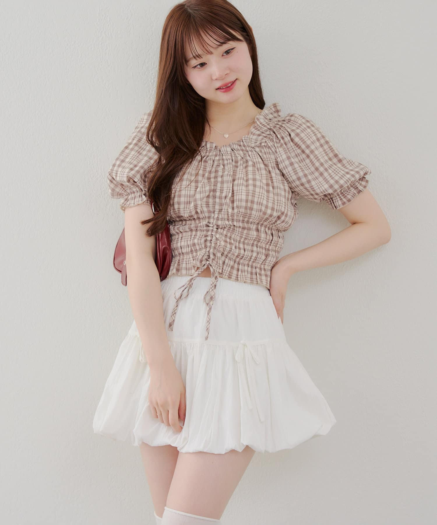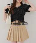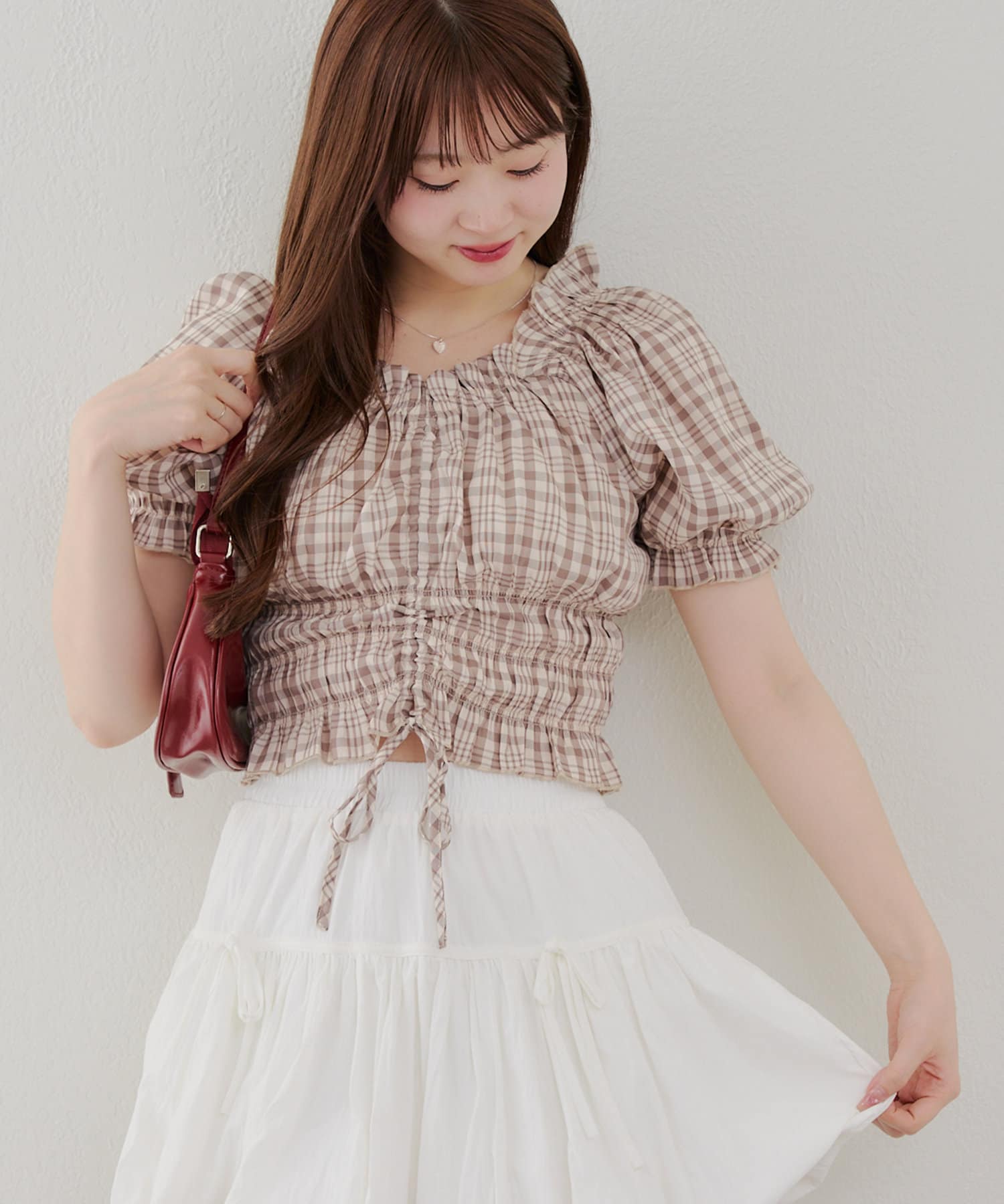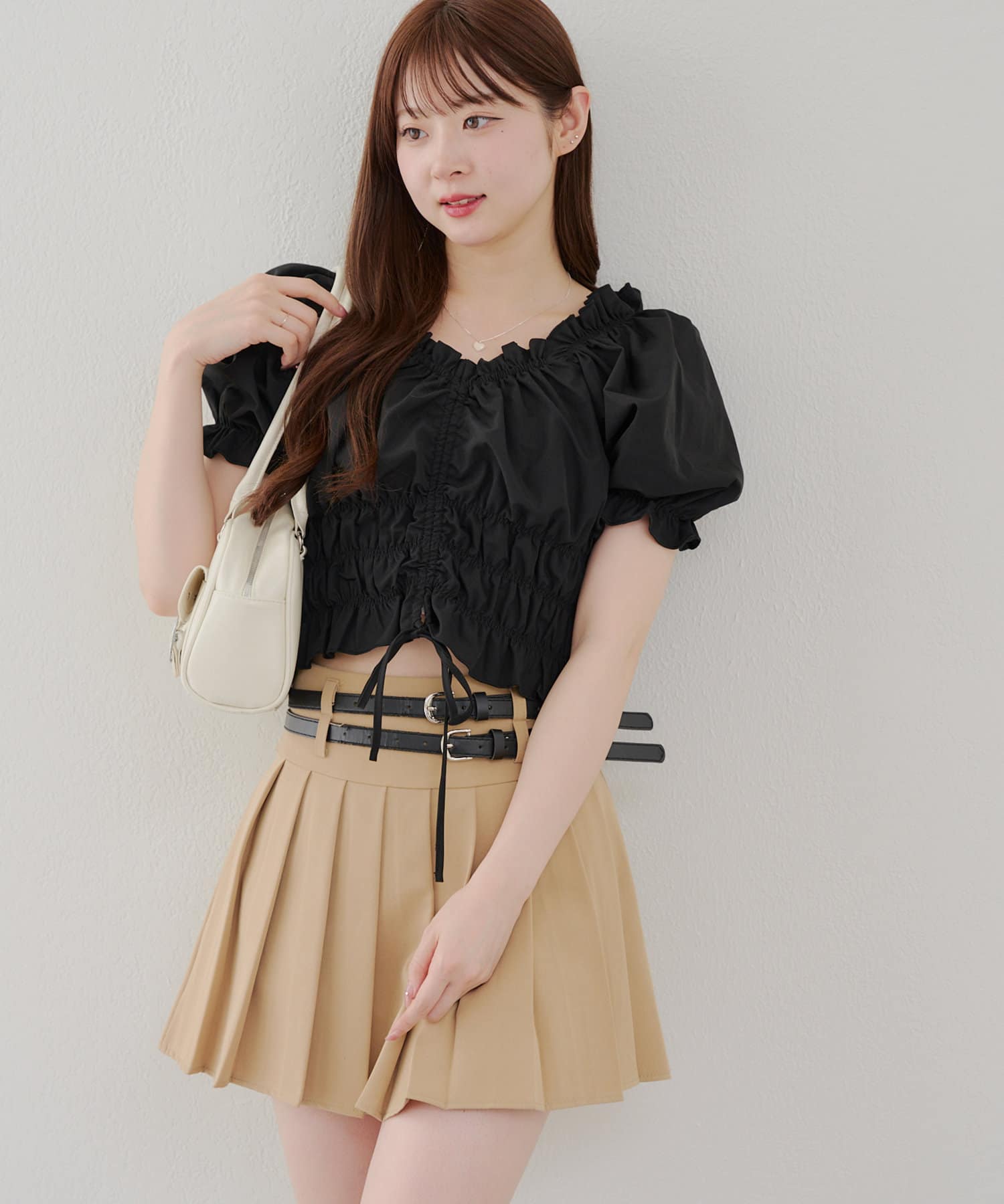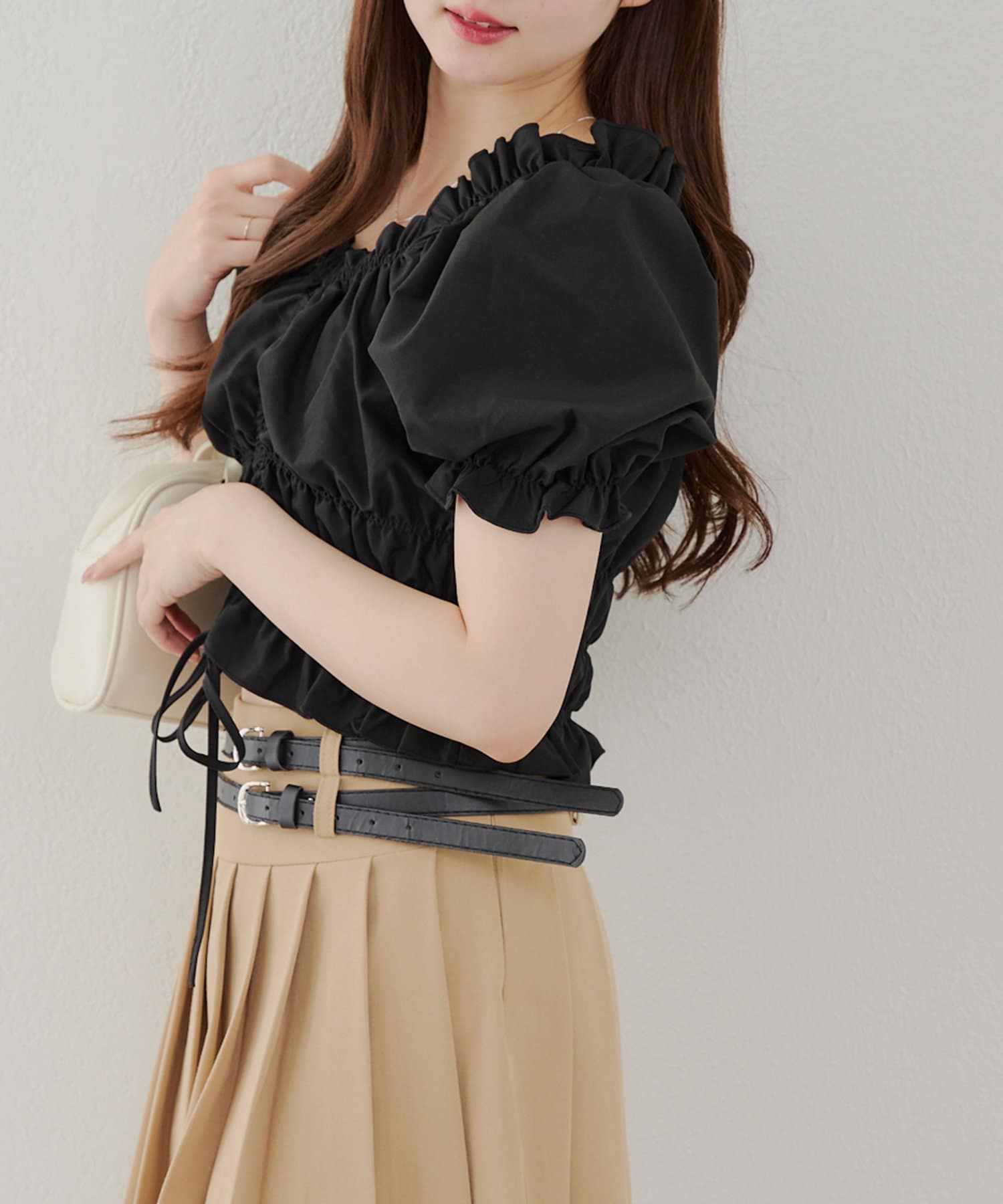 ・ウエスト周りに施されたシャーリングがスタイルアップ効果に。